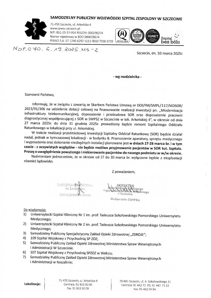 Informacja o planowanym remoncie w SOR w SPWSZ w Szczecinie w lokalizacji przy ul. Arkońskiej 4, oraz wyłączeniu lądowiska z eksploatacji.