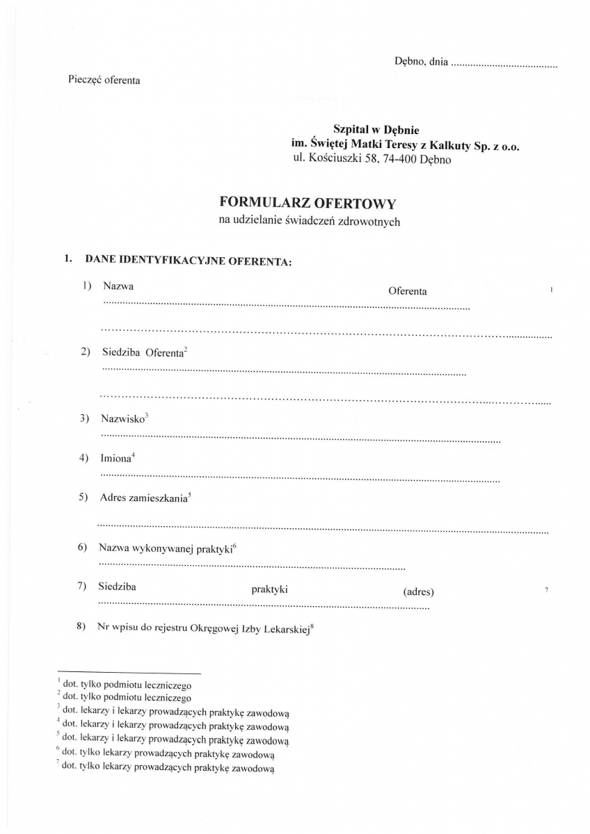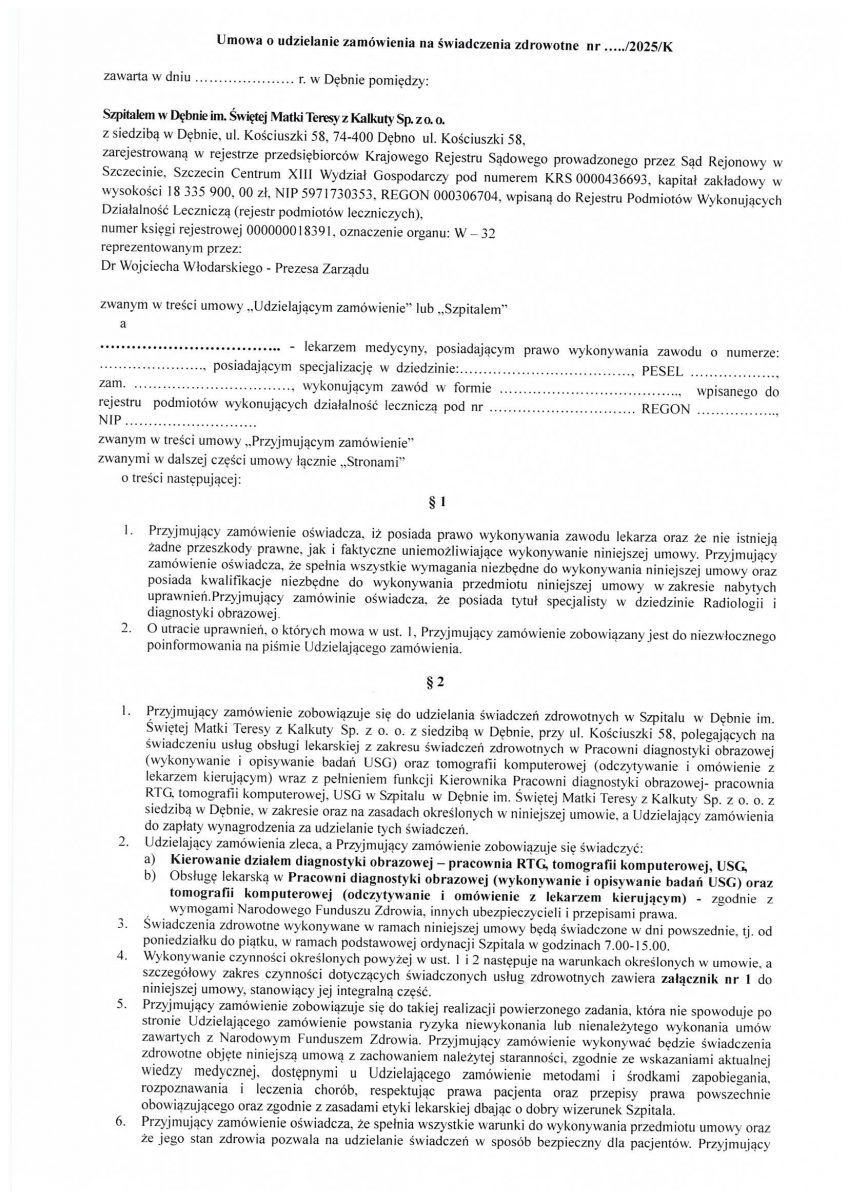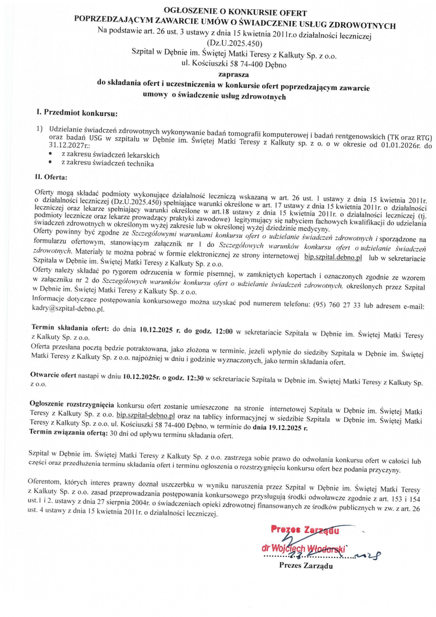 Konkurs ofert na udzielanie świadczeń zdrowotnych - wykonywanie badań tomografii komputerowej i badań rentgenowskich (TK oraz RTG) oraz badań USG w szpitalu w Dębnie - z zakresu świadczeń lekarskich, z zakresu świadczeń technika.