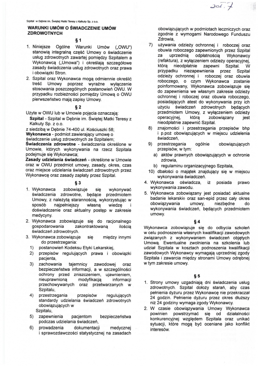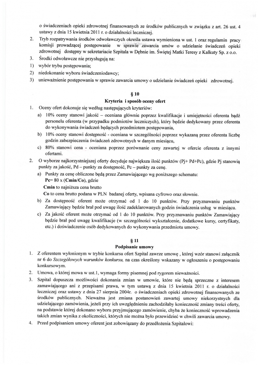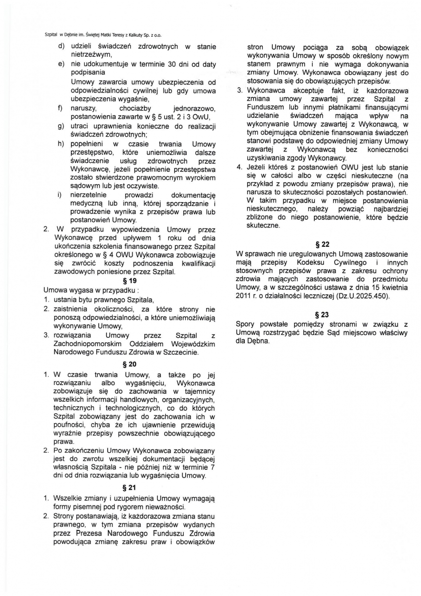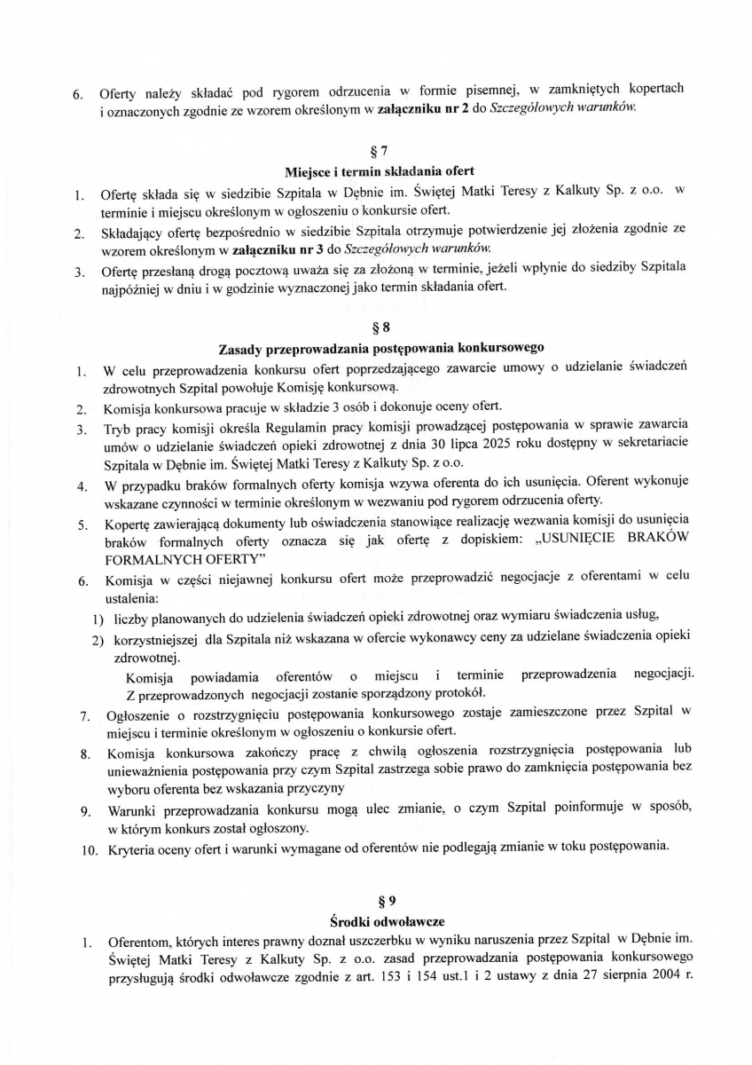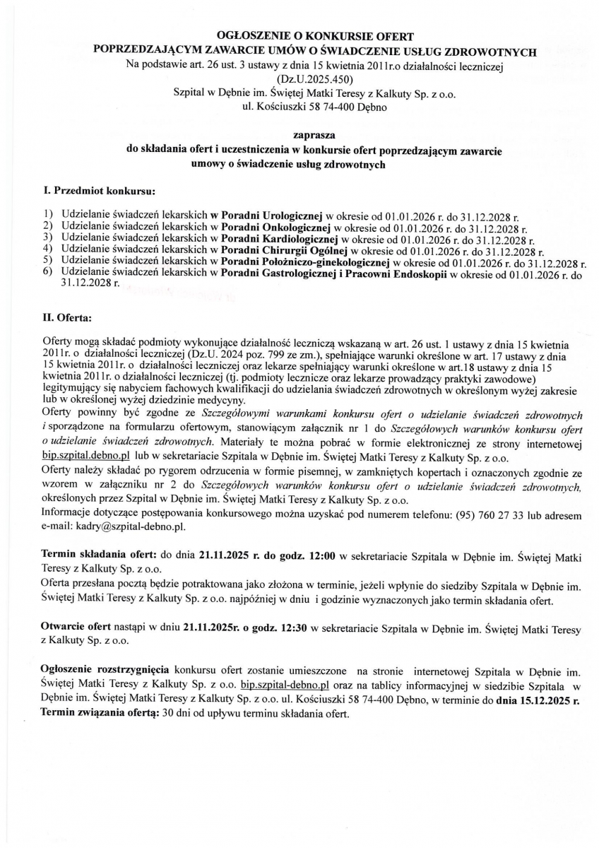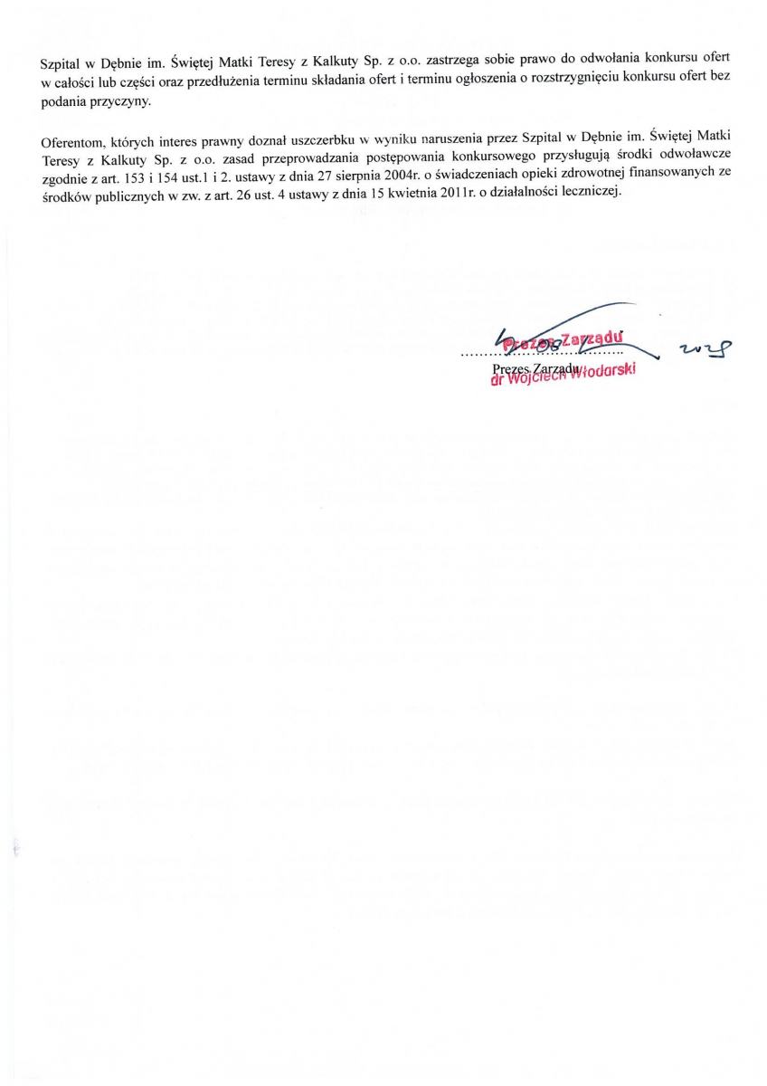 OGŁOSZENIE WYNIKÓW KONKURSU NA STANOWISKO PREZESA ZARZĄDU SPÓŁKI SZPITAL W DĘBNIE IM. ŚWIĘTEJ MATKI TERESY Z KALKUTY SP. Z O.O.
