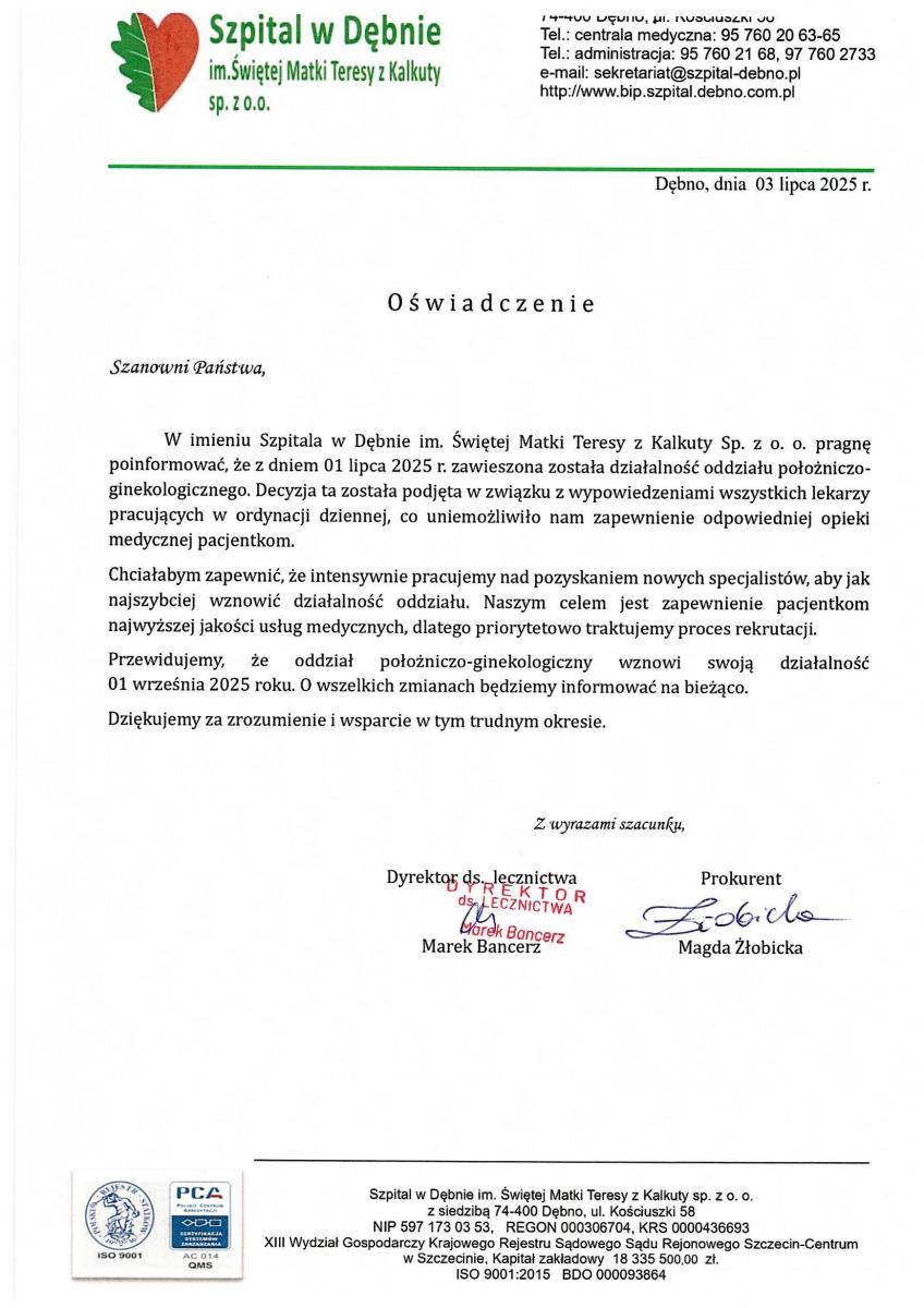 Oświadczenie dotyczące zawieszenia oddziału położniczo-ginekologicznego.