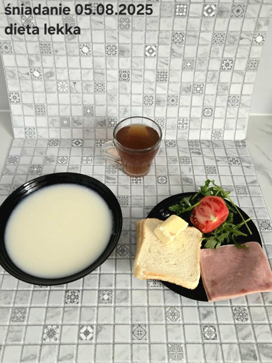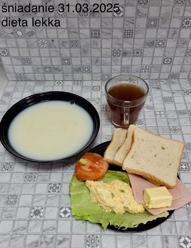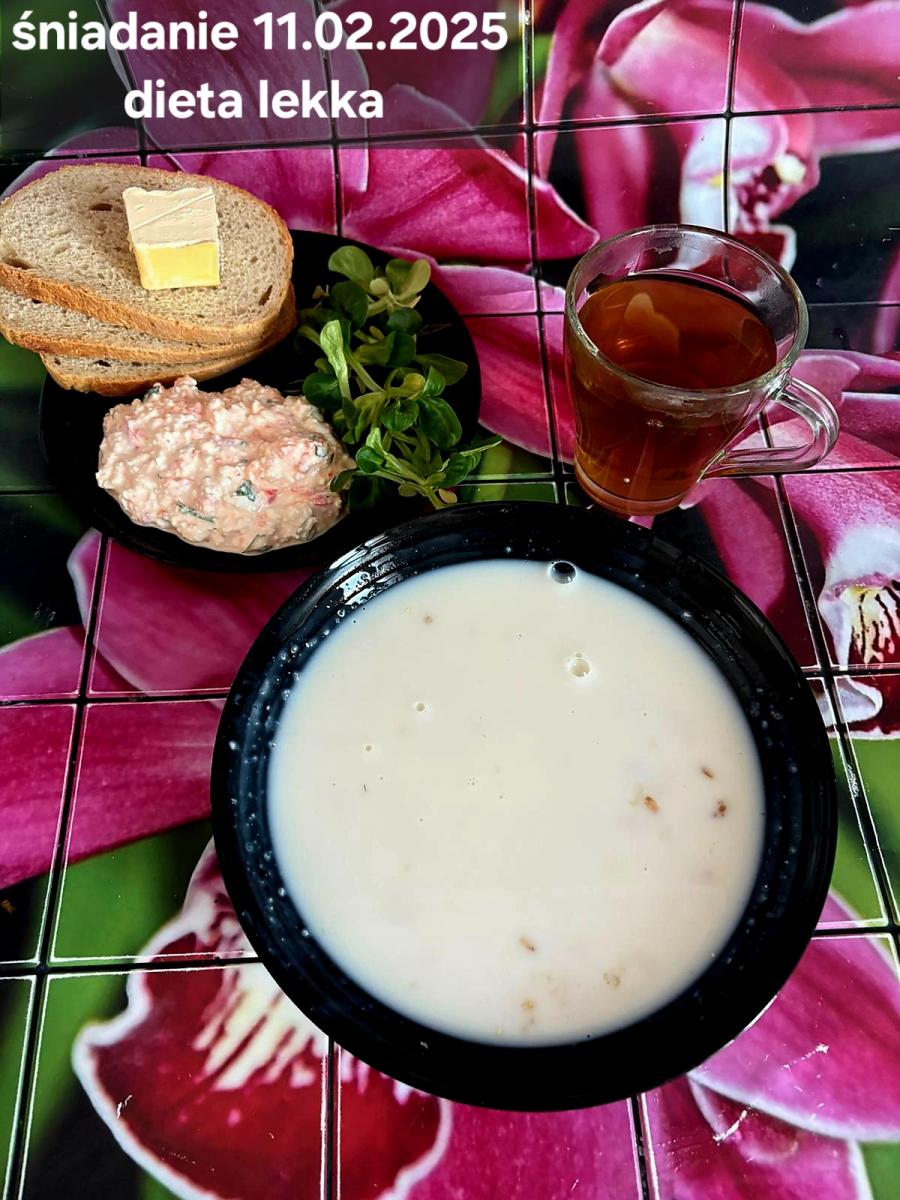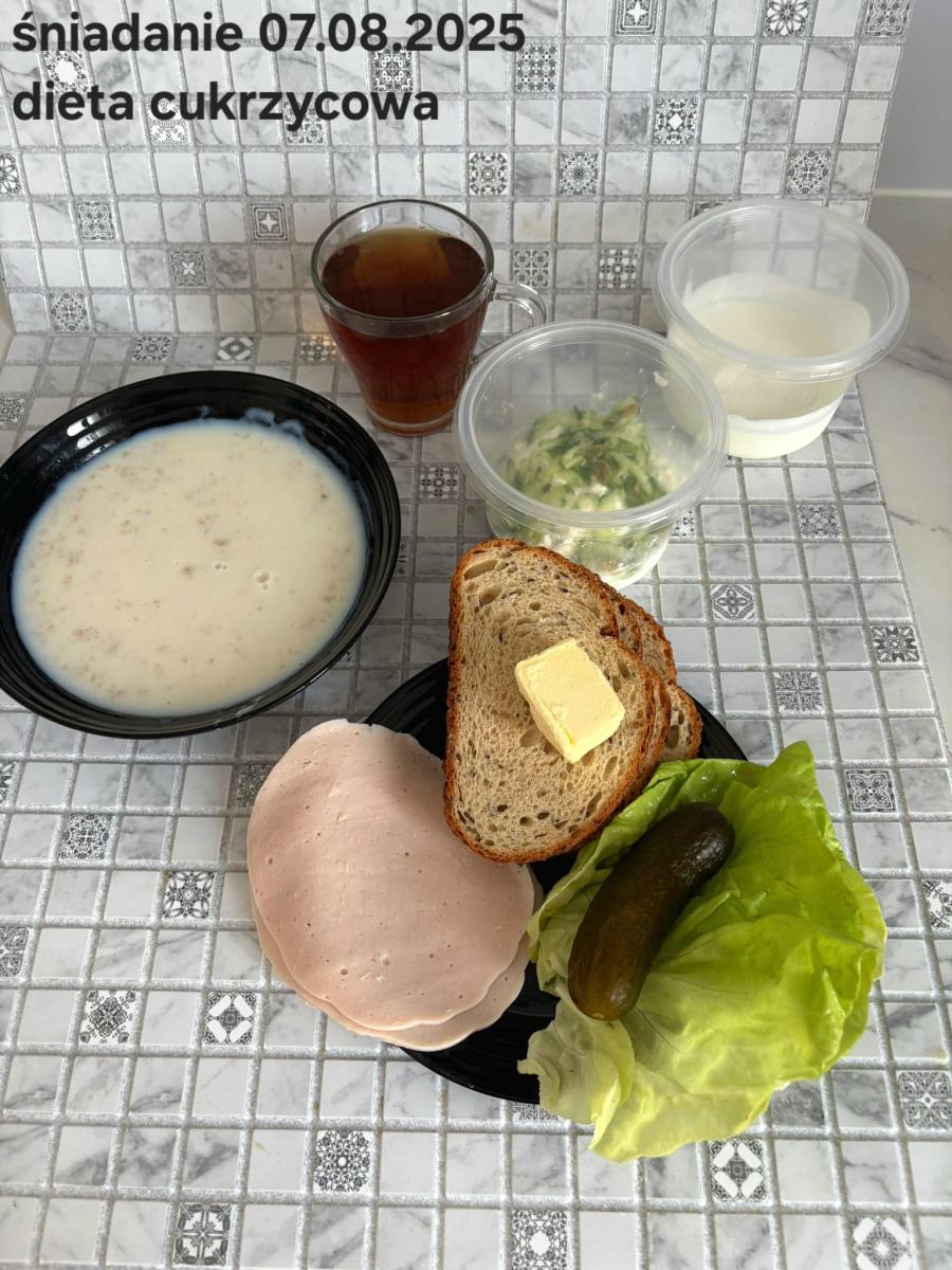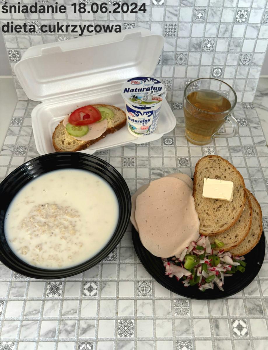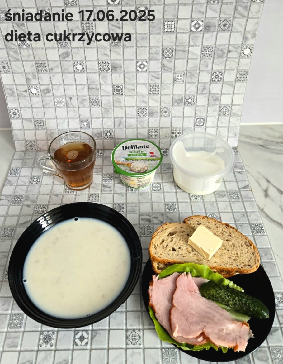 L(W,T): Zamiast masła- MARGARYNA MIĘKKA (15g) C: ZUPA MLECZNA Z PŁATKAMI OWSIANYMI(1) (50g) CHLEB ŻYTNI RAZOWY(1)- 150g Herbata bez cukru W: Dodatkowo SZYNKA DROBIOWA(1,6,9,10)- |