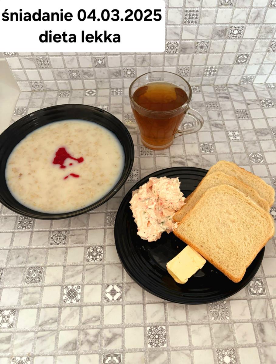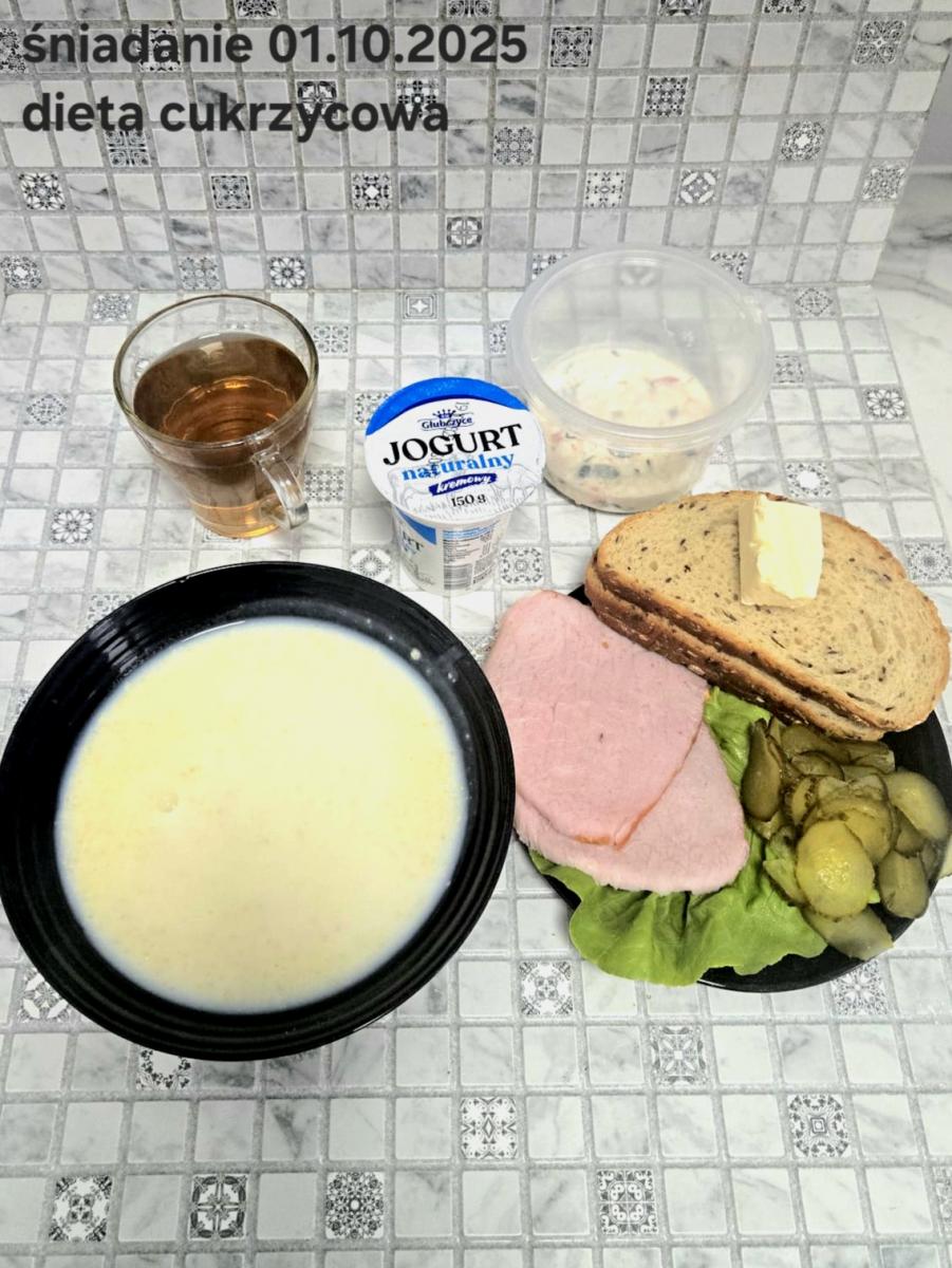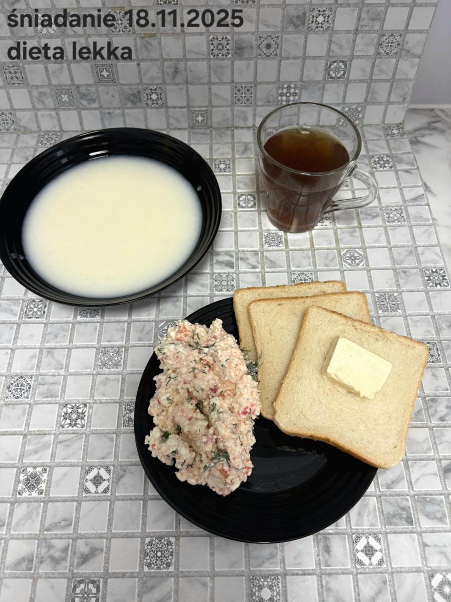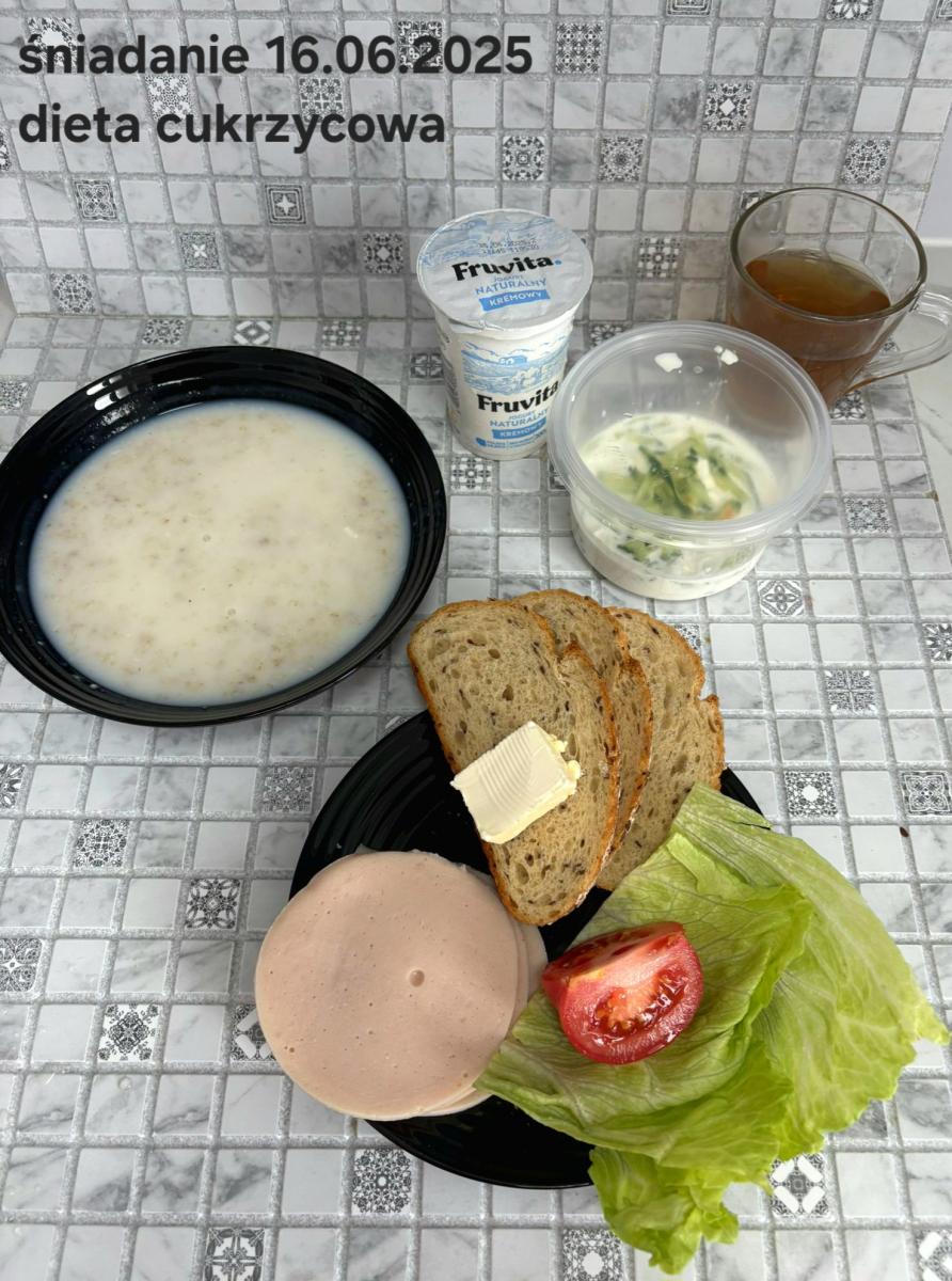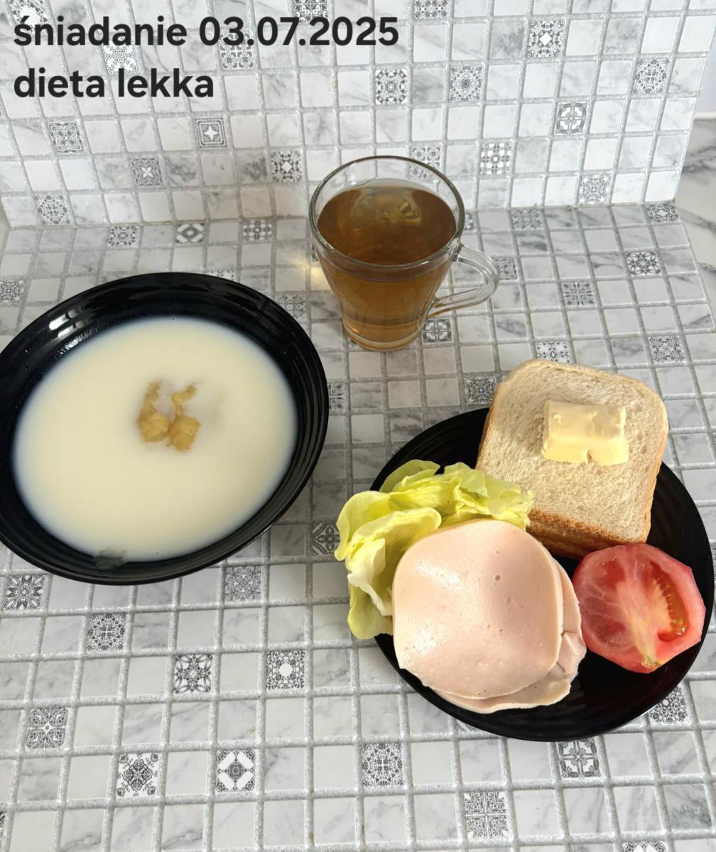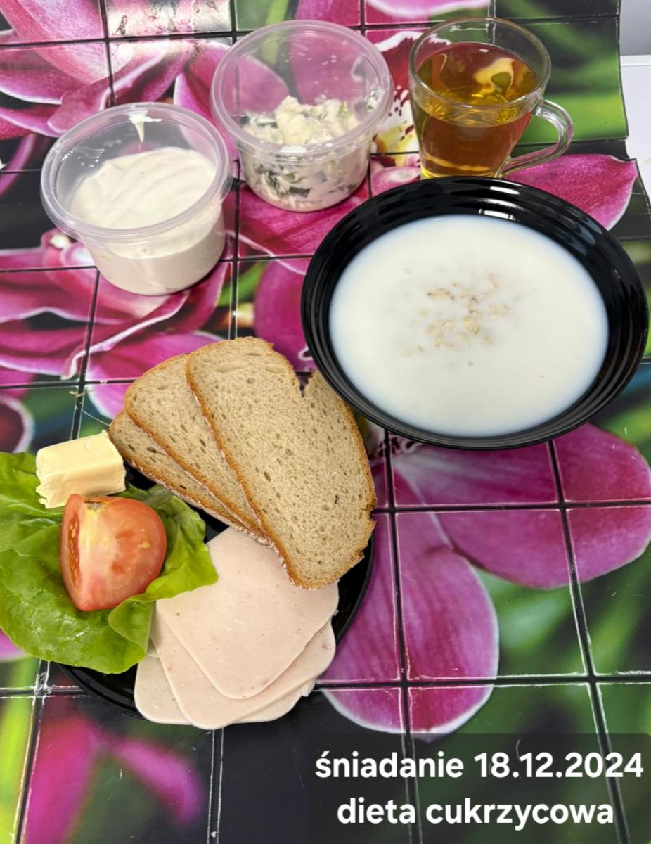 L(W,T): Zamiast masła- MARGARYNA MIĘKKA (15g) C: ZUPA MLECZNA Z PŁATKAMI OWSIANYMI(1) (50g) CHLEB ŻYTNI RAZOWY(1)- 150g Herbata bez cukru W: Dodatkowo SZYNKA DROBIOWA(1,6,9,10)- |