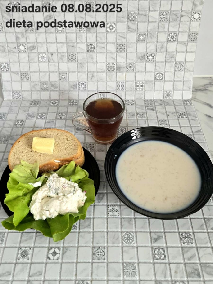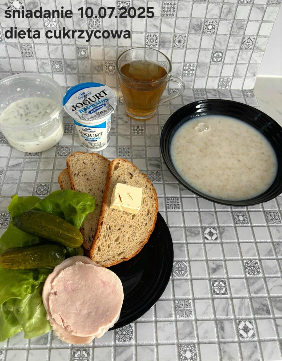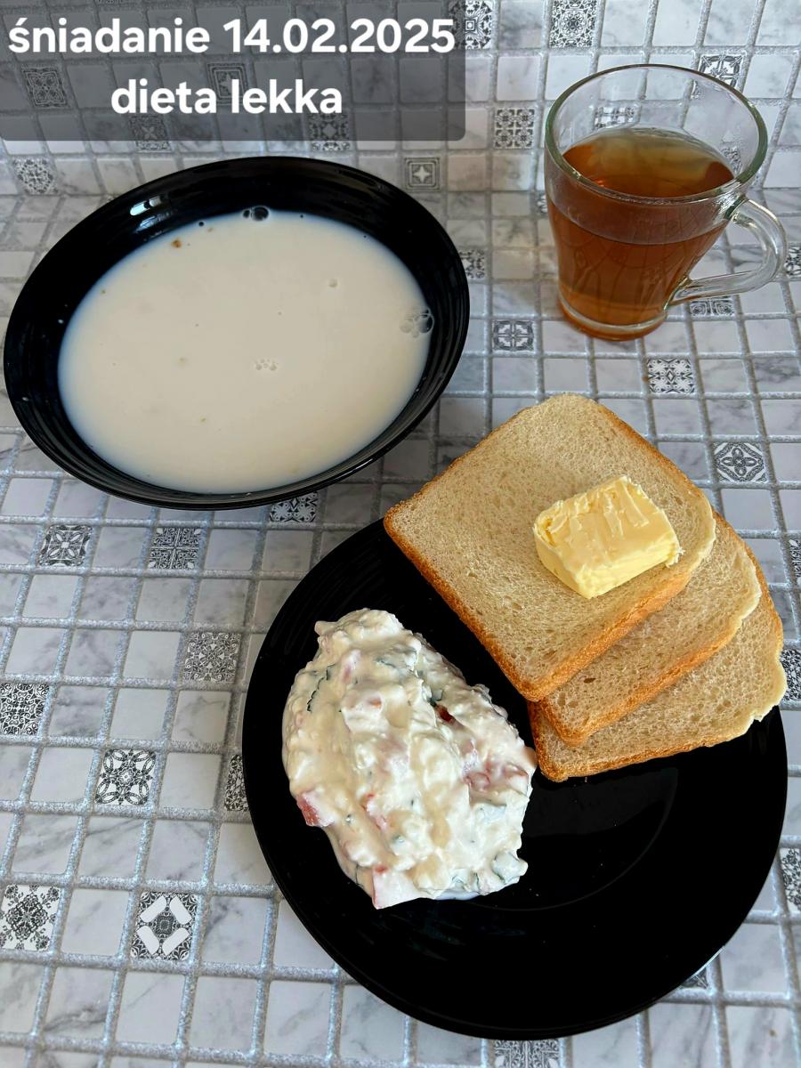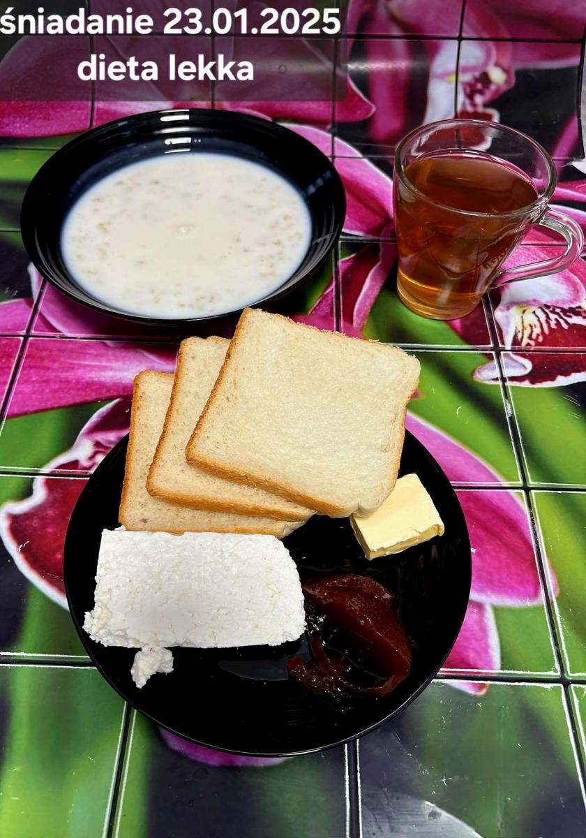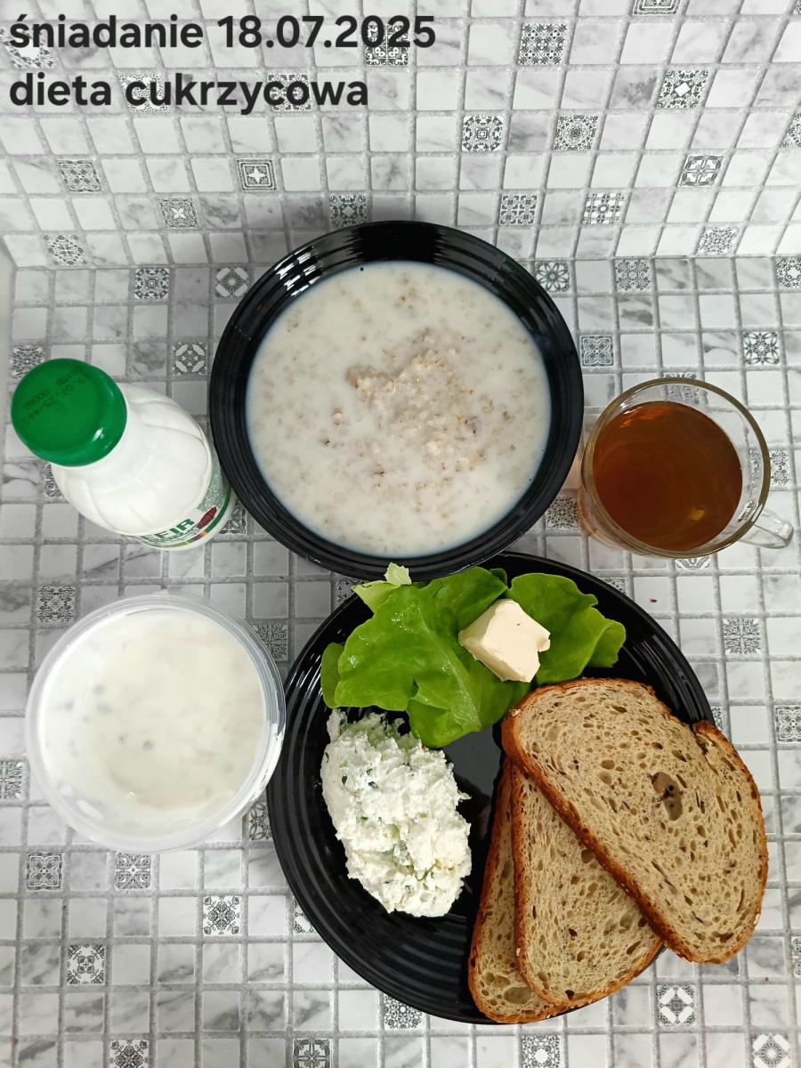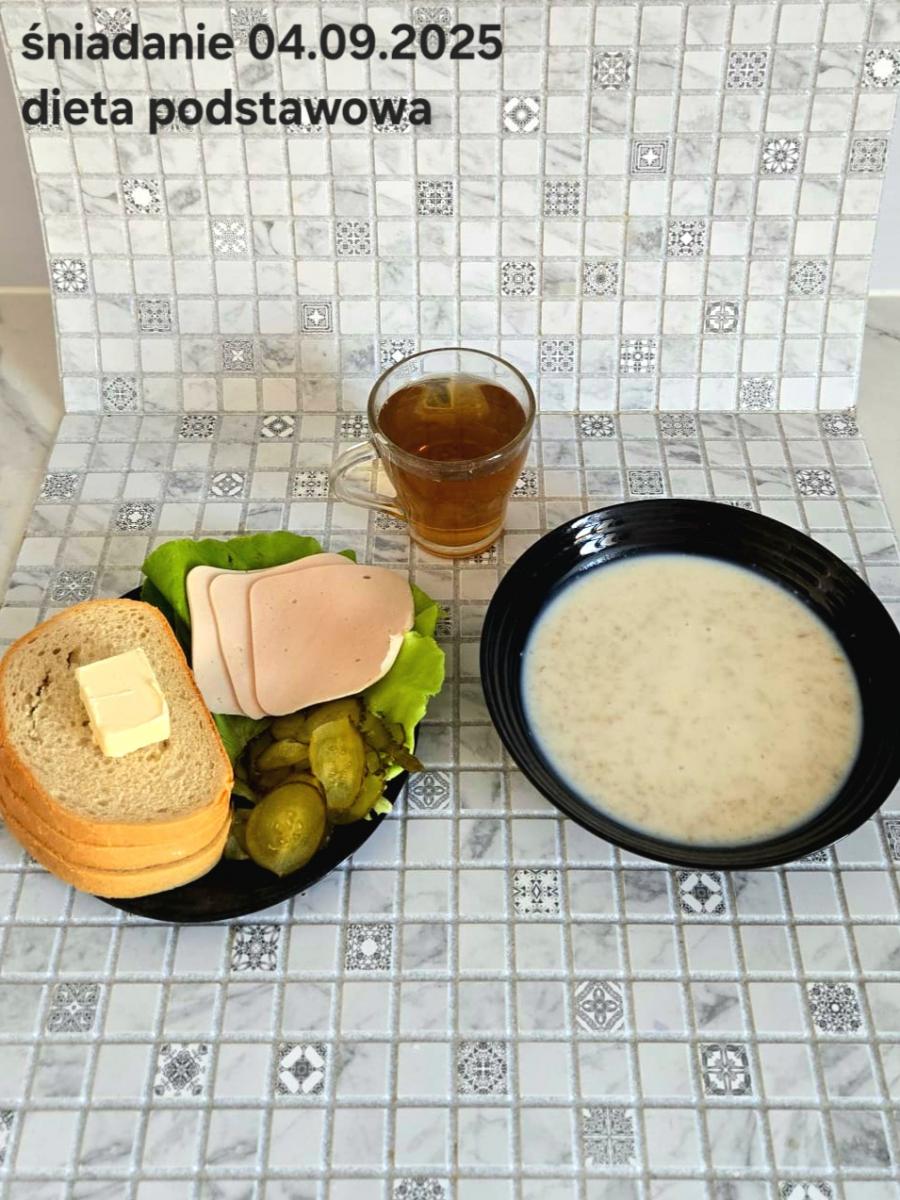 L(W,T): Zamiast masła- MARGARYNA MIĘKKA (15g) C: ZUPA MLECZNA Z PŁATKAMI OWSIANYMI(1) (50g) CHLEB ŻYTNI RAZOWY(1)- 150g Herbata bez cukru W: Dodatkowo SZYNKA DROBIOWA(1,6,9,10)- |