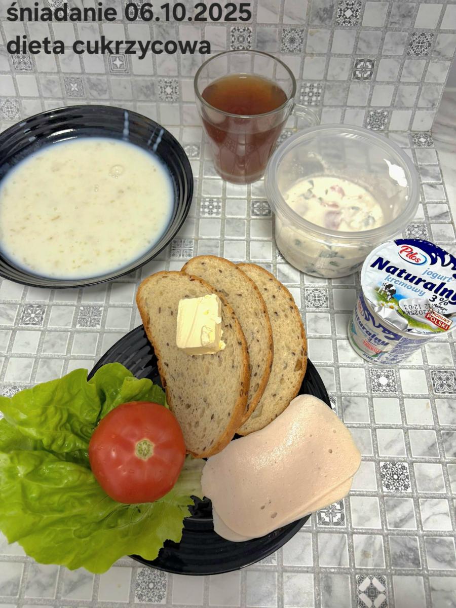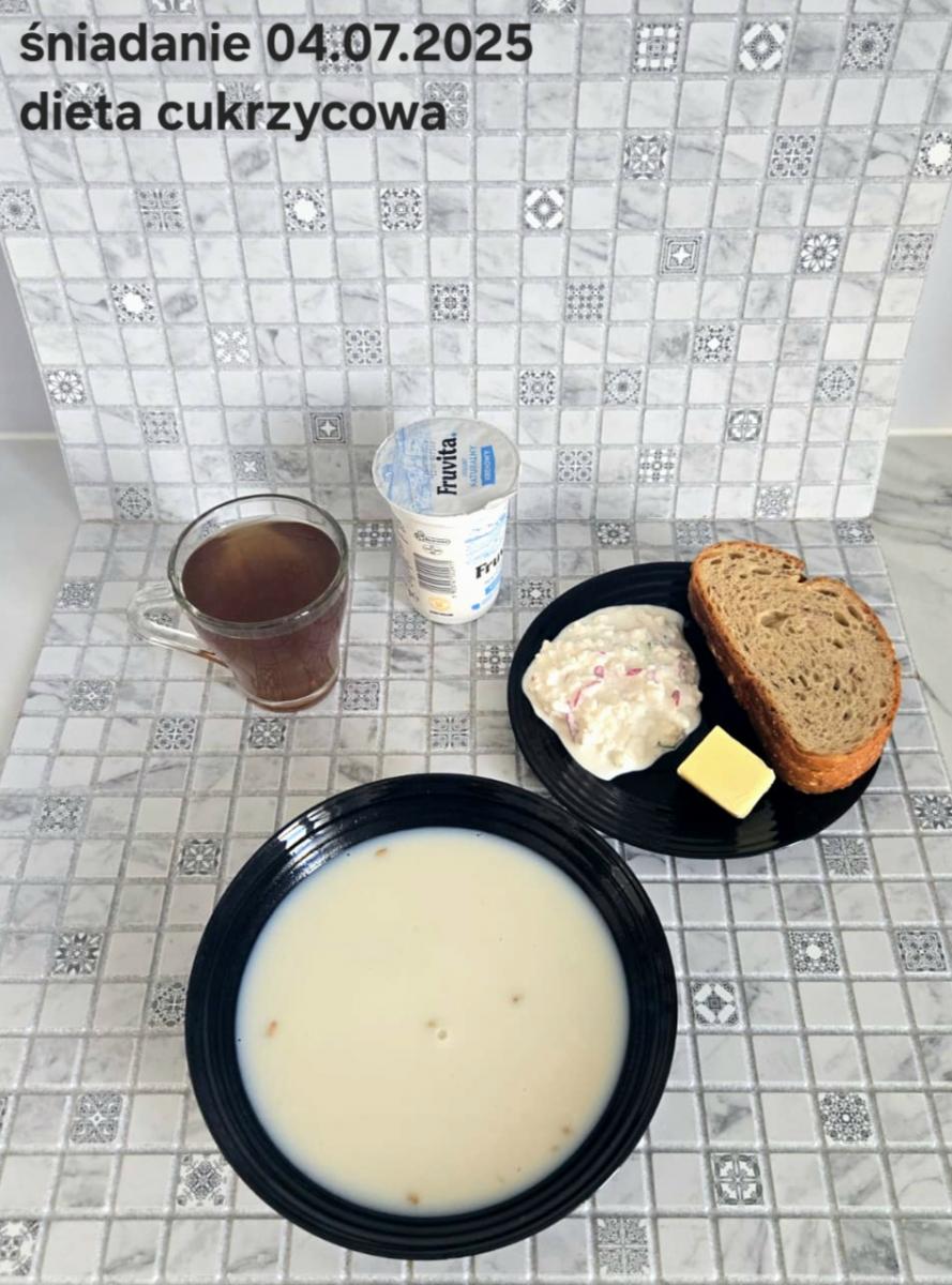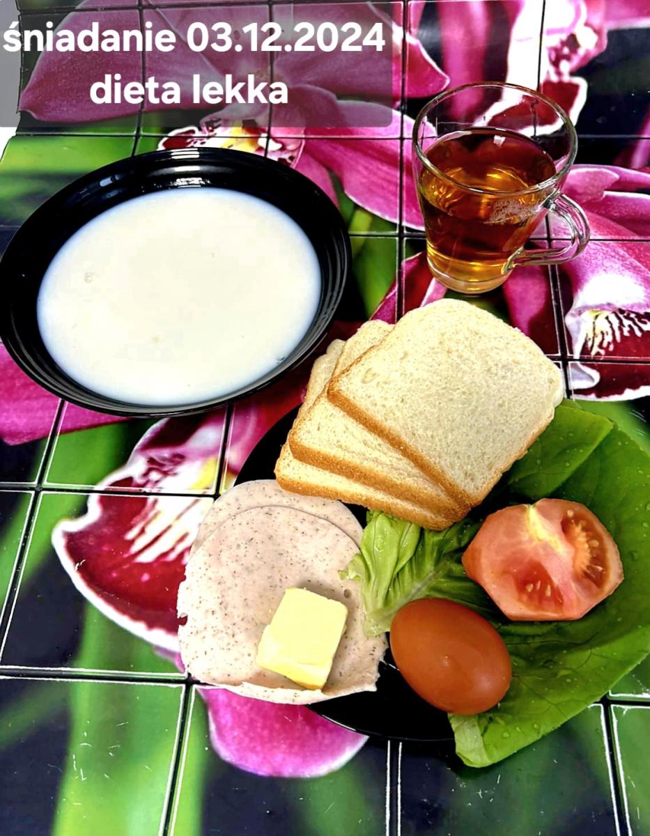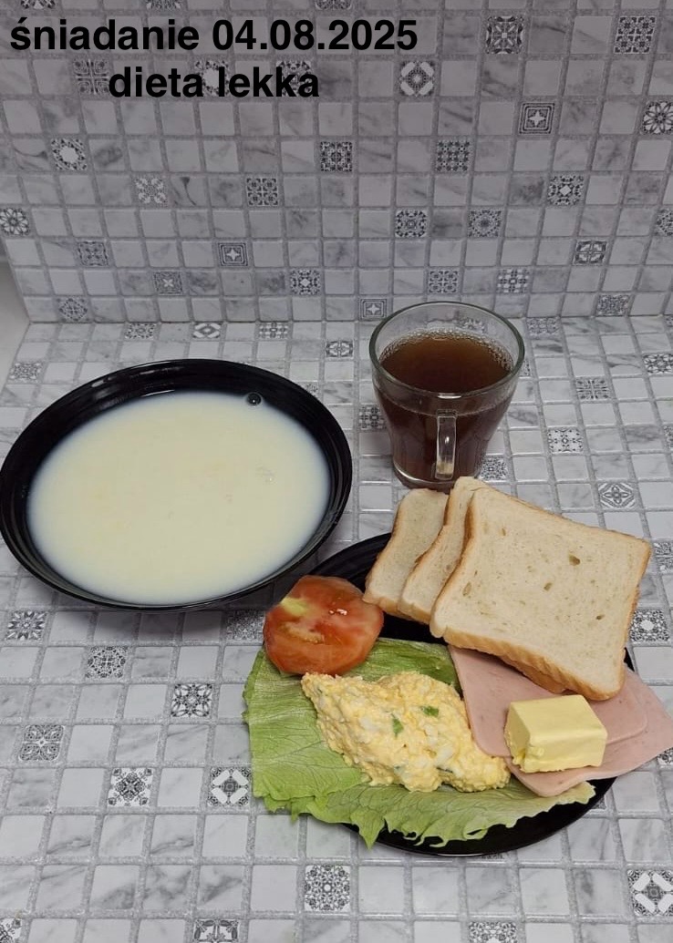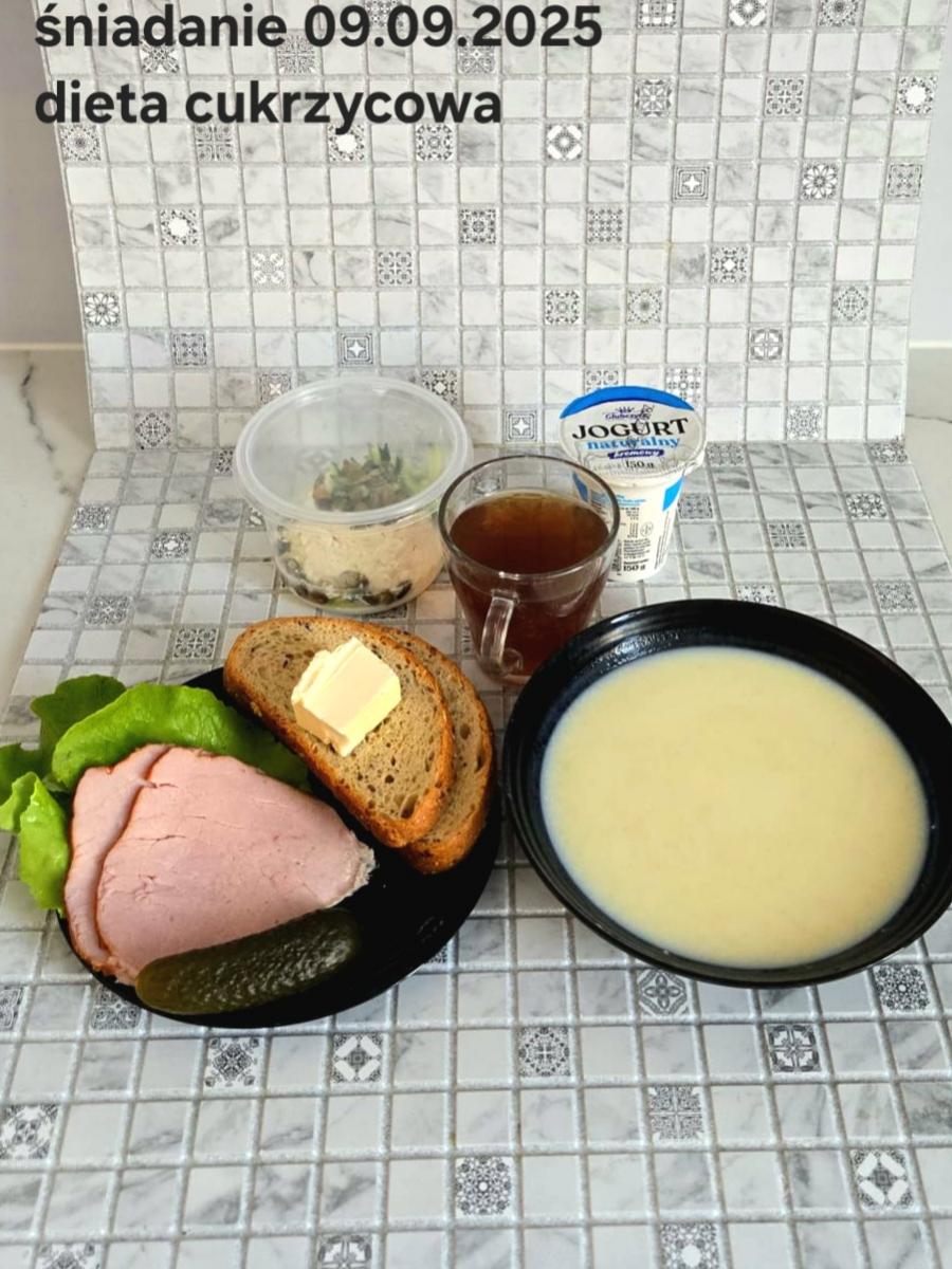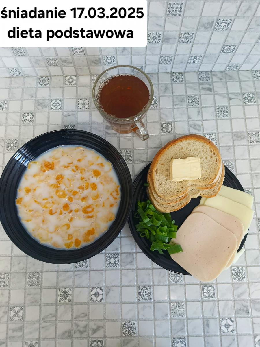 L(W,T): Zamiast masła- MARGARYNA MIĘKKA (15g) C: ZUPA MLECZNA Z PŁATKAMI OWSIANYMI(1) (50g) CHLEB ŻYTNI RAZOWY(1)- 150g Herbata bez cukru W: Dodatkowo SZYNKA DROBIOWA(1,6,9,10)- |
