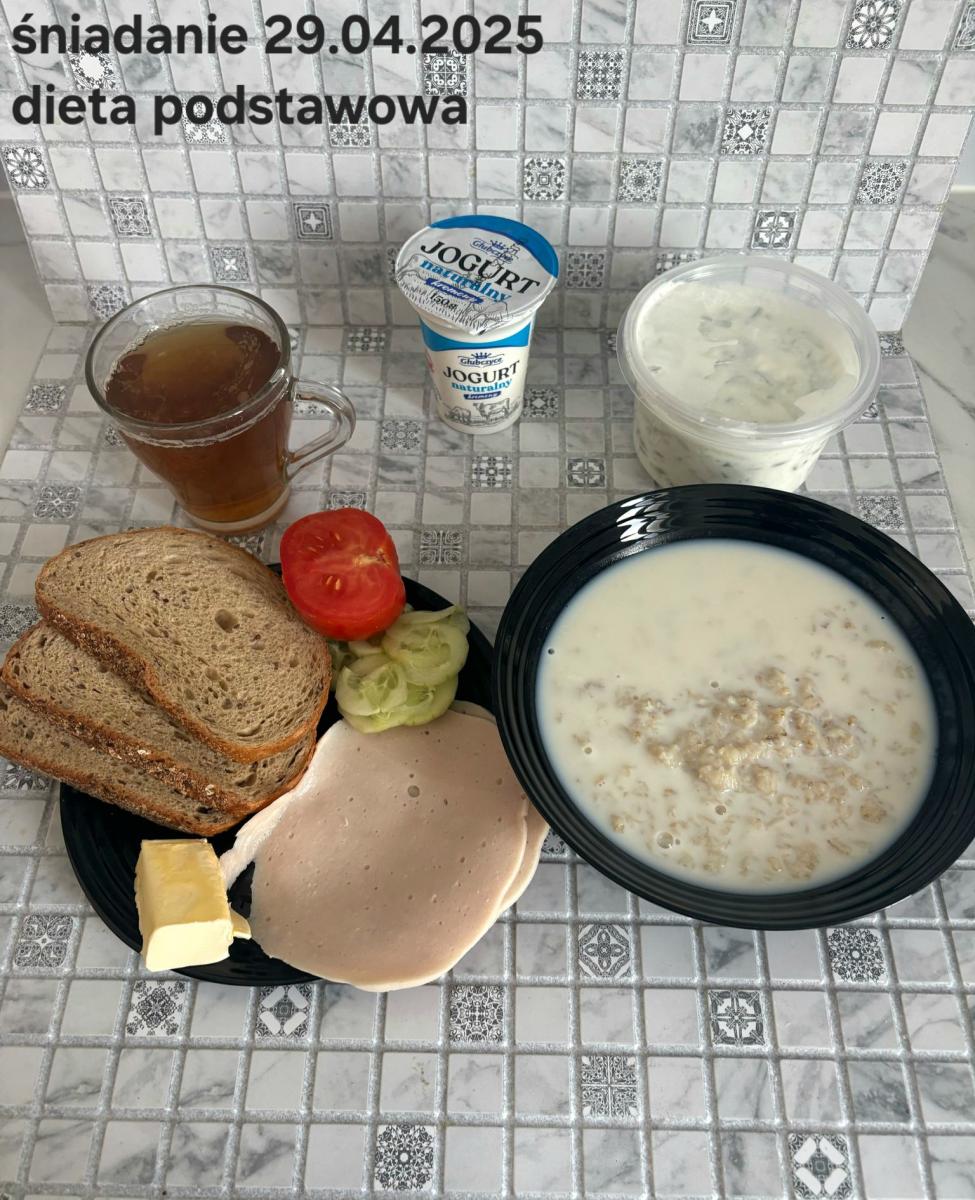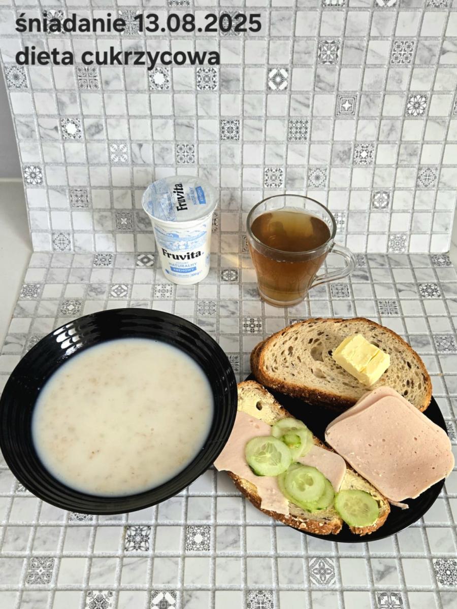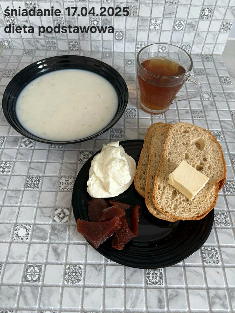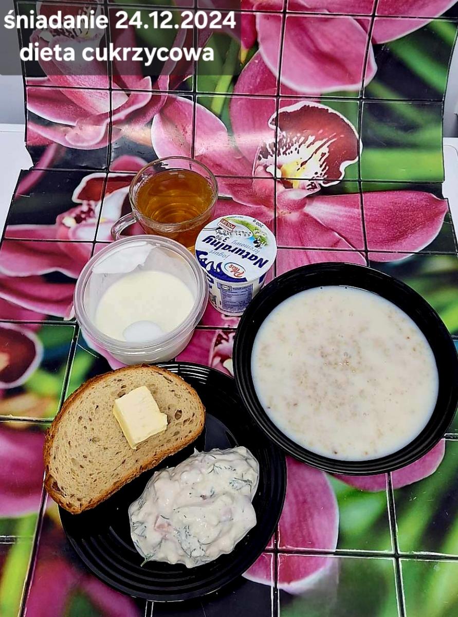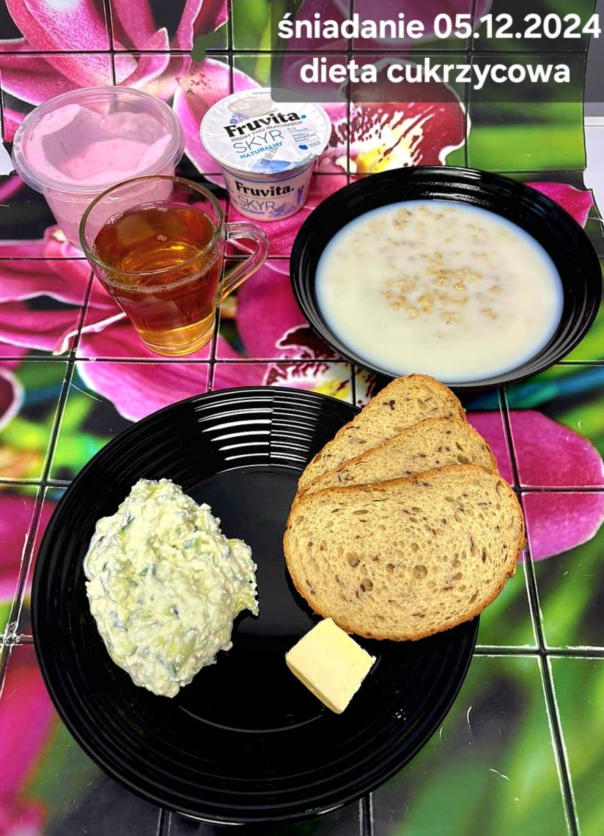 L(W,T): Zamiast masła- MARGARYNA MIĘKKA (15g) C: ZUPA MLECZNA Z PŁATKAMI OWSIANYMI(1) (50g) CHLEB ŻYTNI RAZOWY(1)- 150g Herbata bez cukru W: Dodatkowo SZYNKA DROBIOWA(1,6,9,10)- |