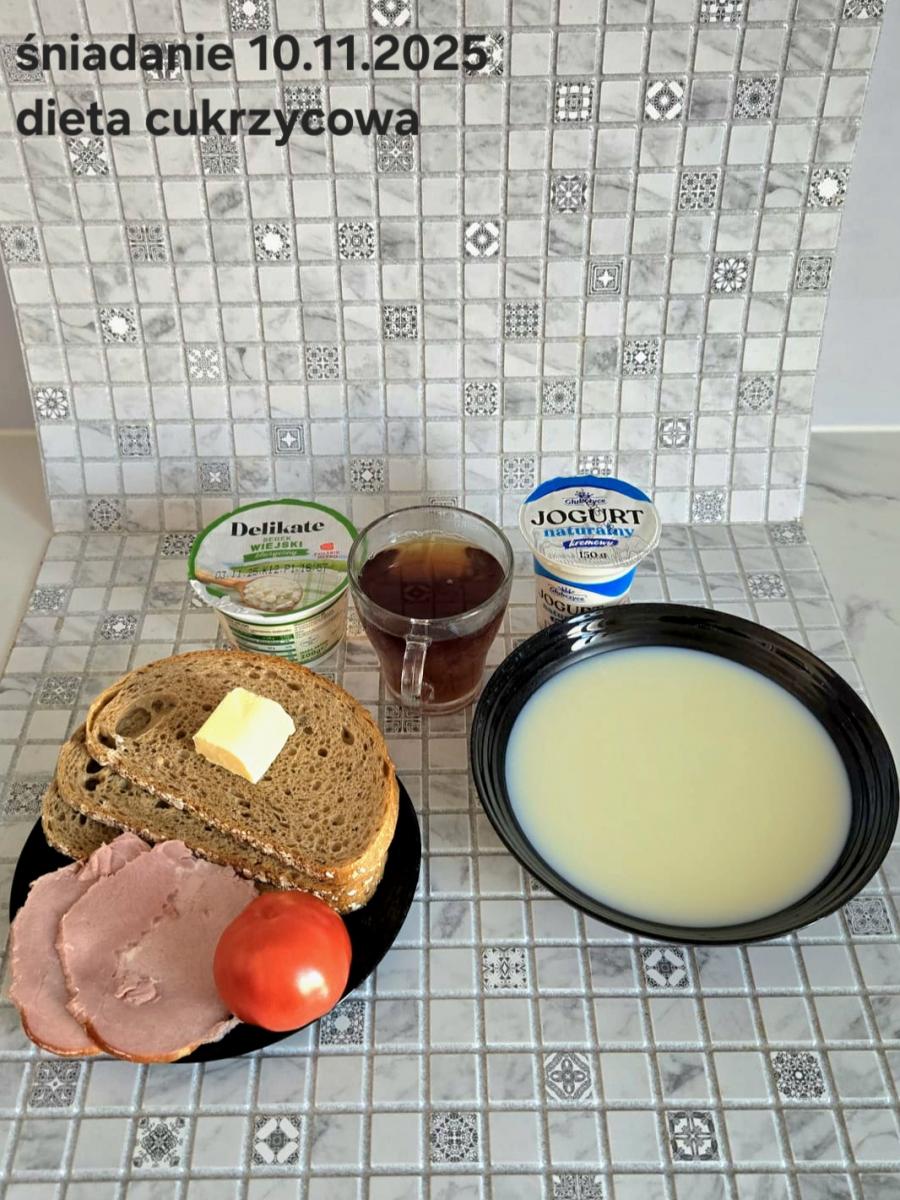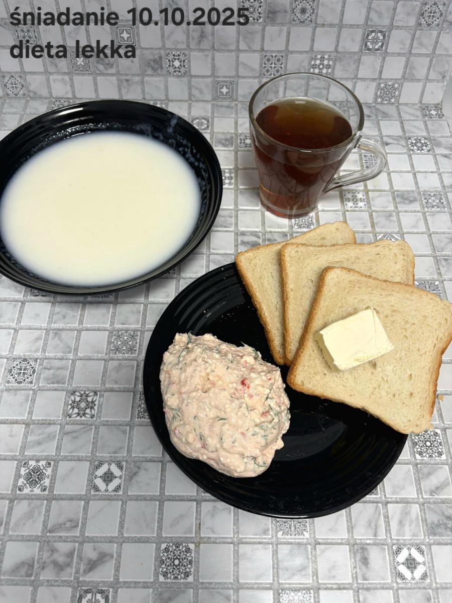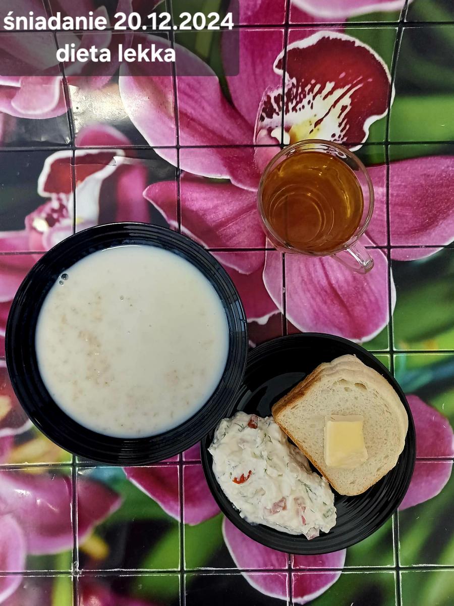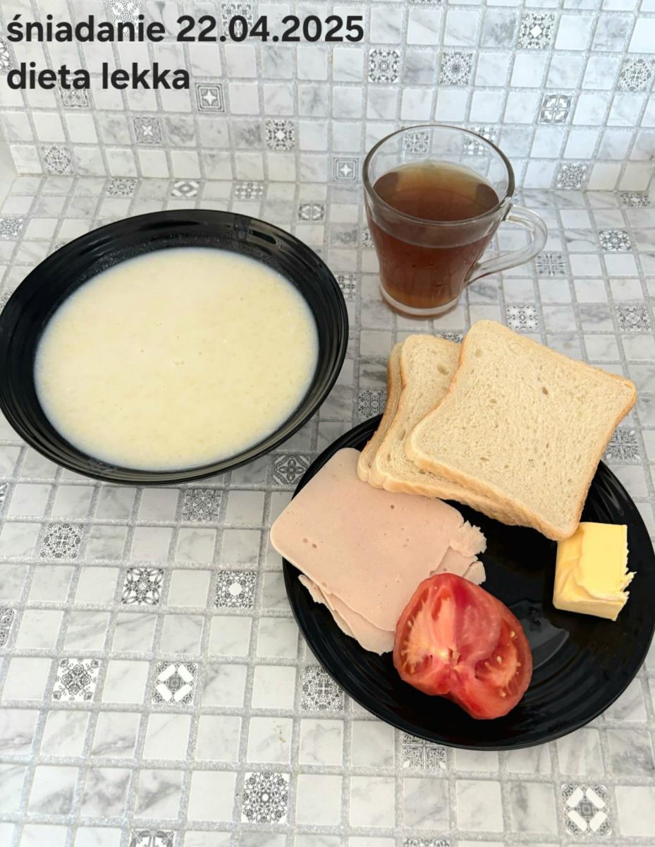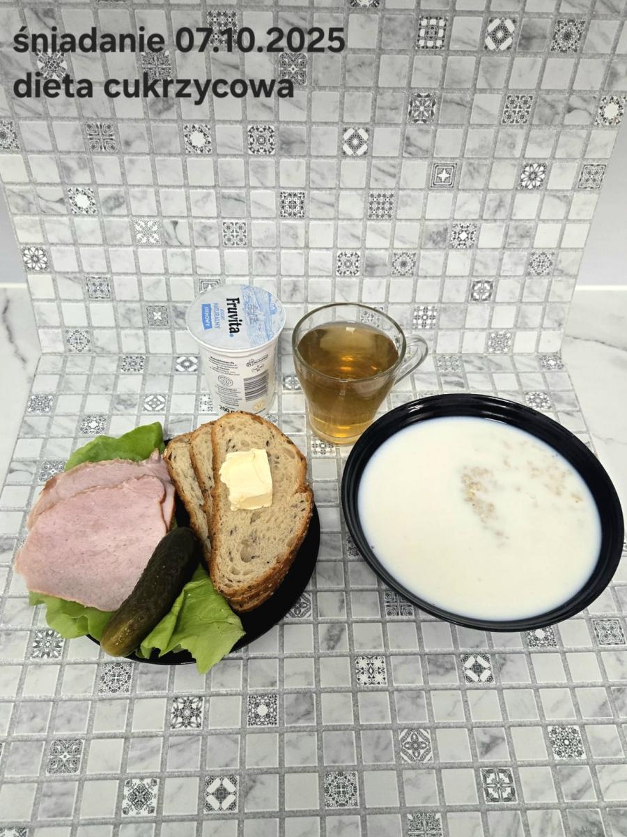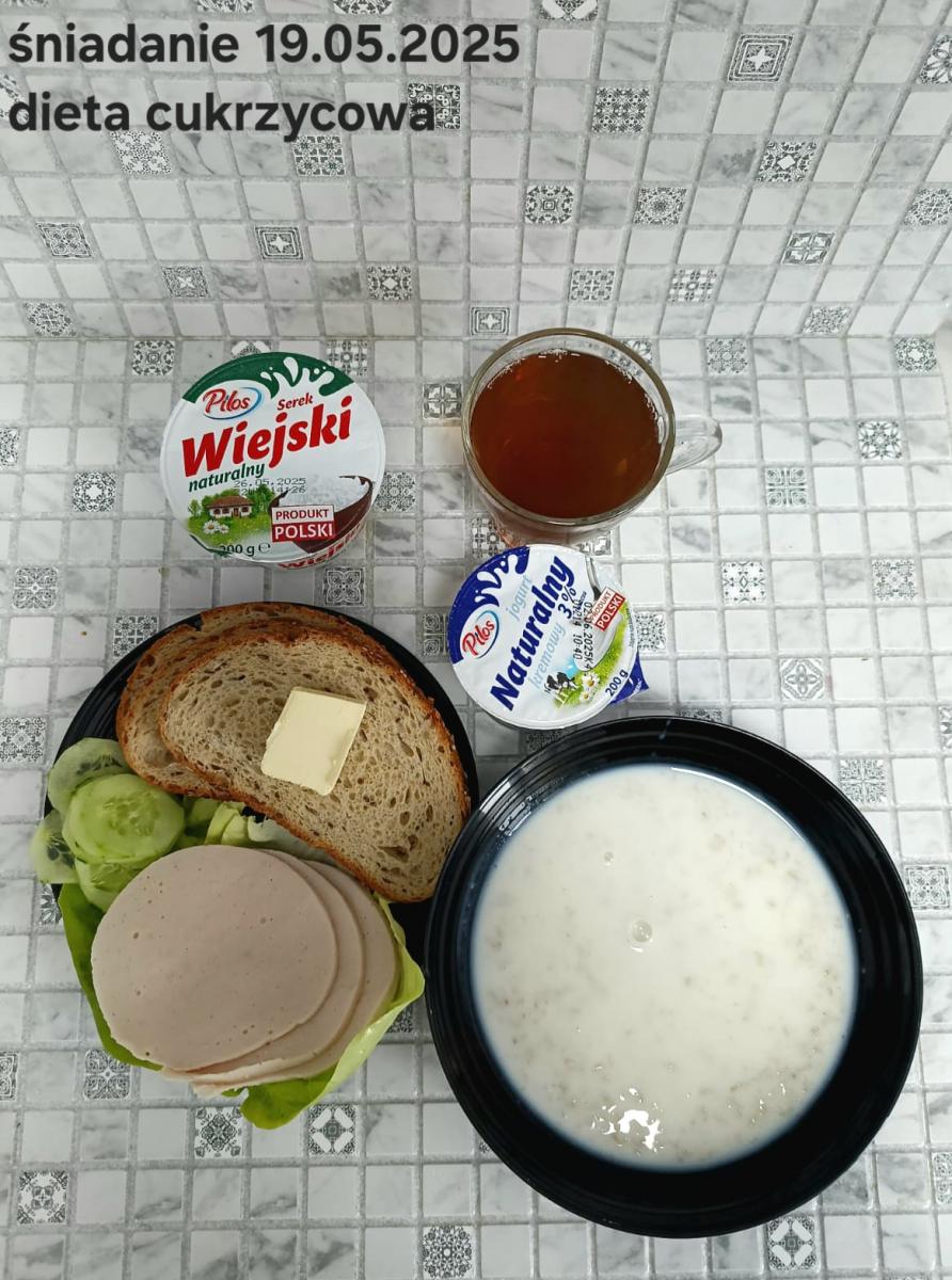 L(W,T): Zamiast masła- MARGARYNA MIĘKKA (15g) C: ZUPA MLECZNA Z PŁATKAMI OWSIANYMI(1) (50g) CHLEB ŻYTNI RAZOWY(1)- 150g Herbata bez cukru W: Dodatkowo SZYNKA DROBIOWA(1,6,9,10)- |
