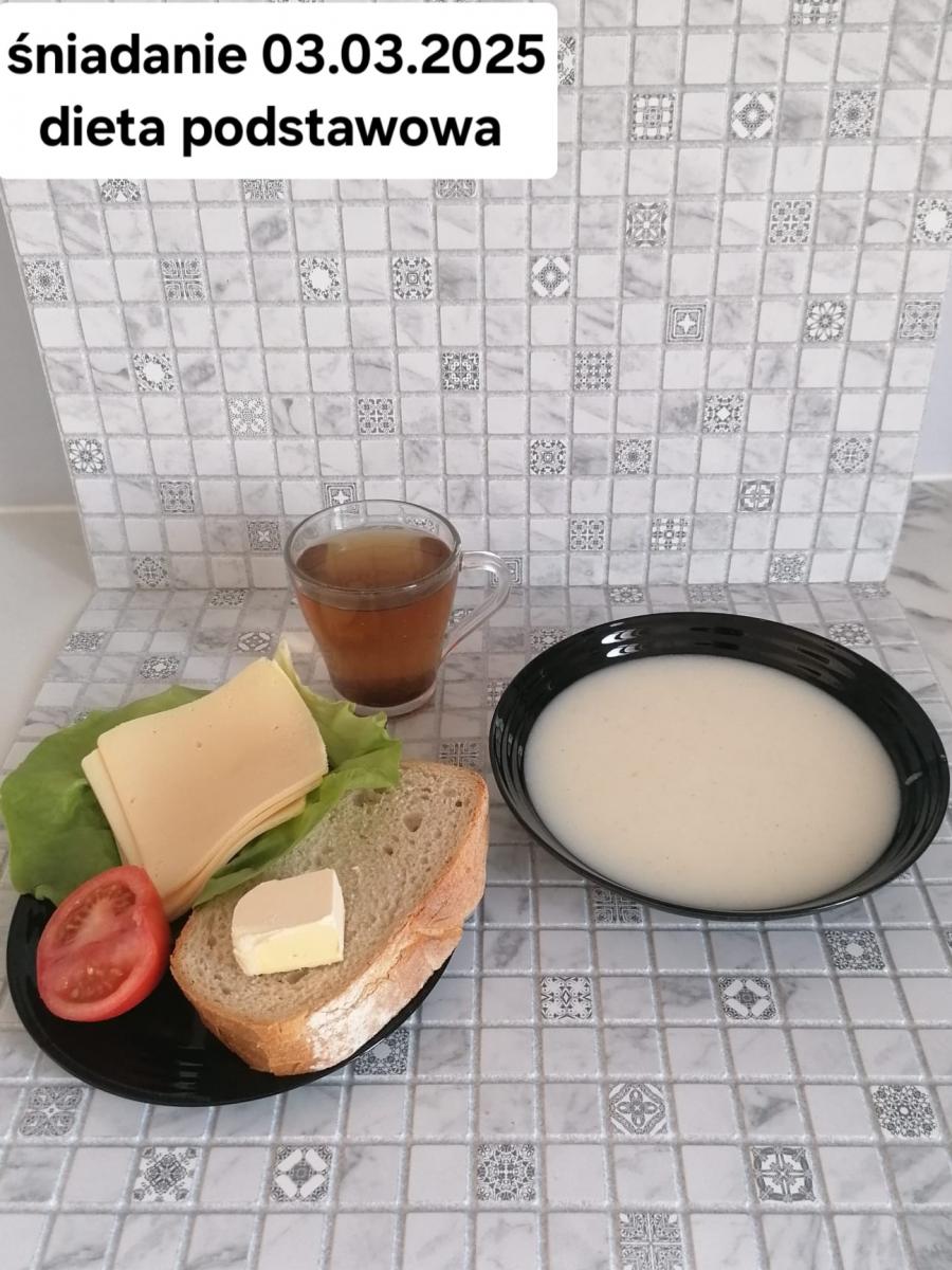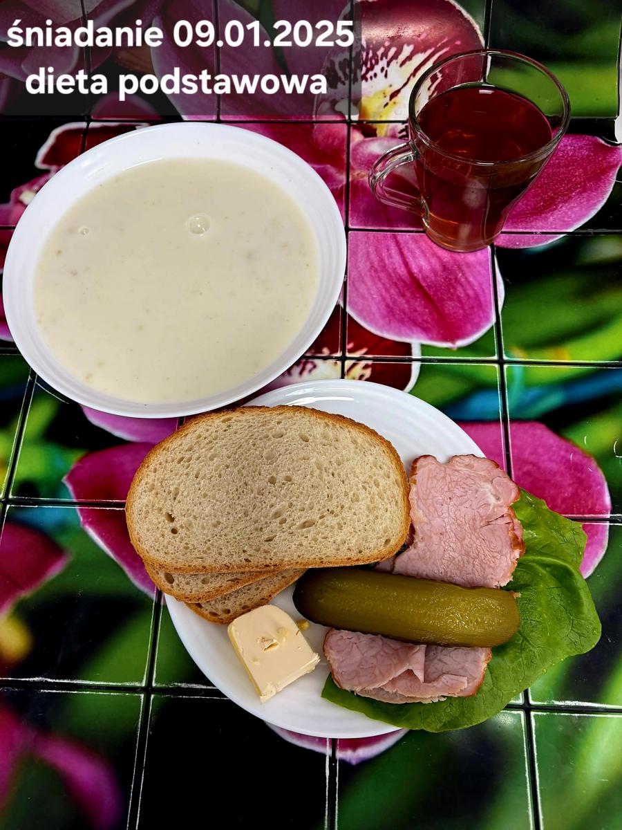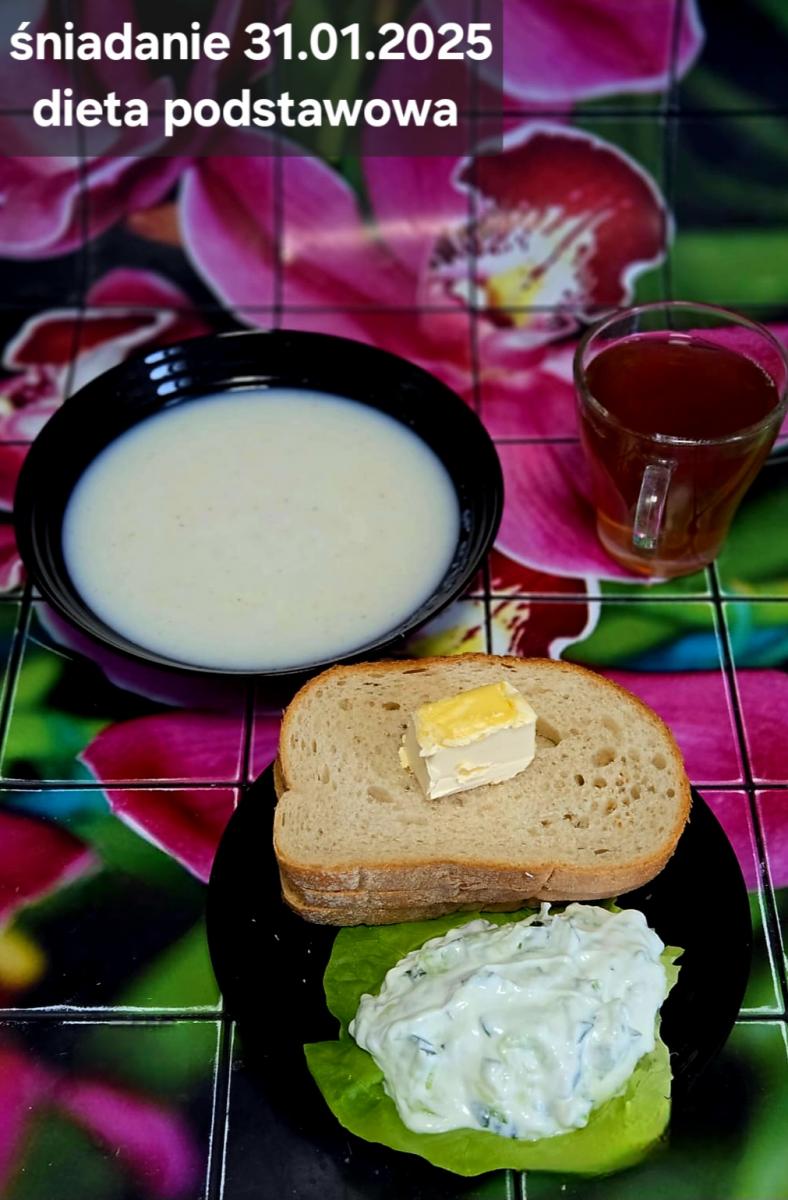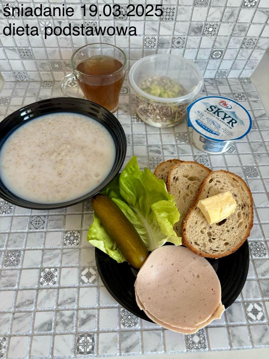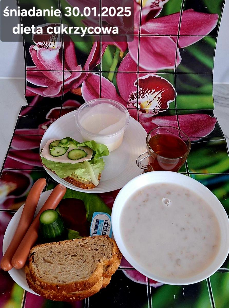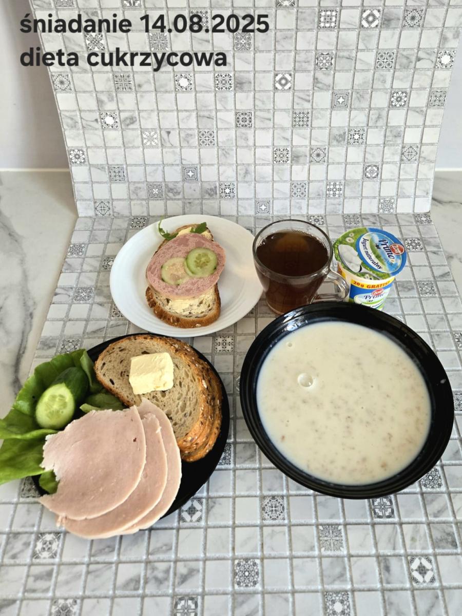 L(W,T): Zamiast masła- MARGARYNA MIĘKKA (15g) C: ZUPA MLECZNA Z PŁATKAMI OWSIANYMI(1) (50g) CHLEB ŻYTNI RAZOWY(1)- 150g Herbata bez cukru W: Dodatkowo SZYNKA DROBIOWA(1,6,9,10)- |