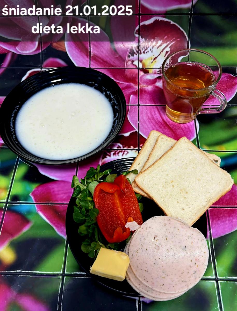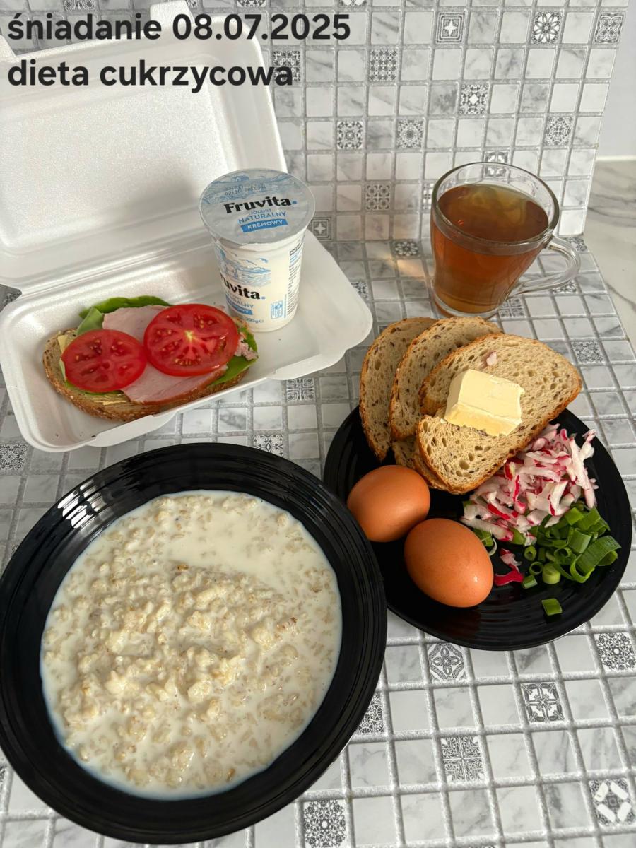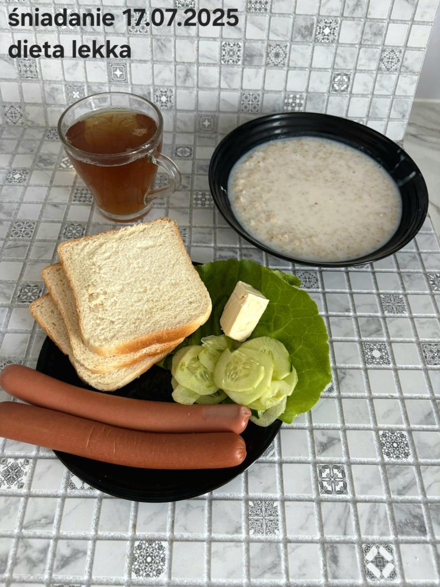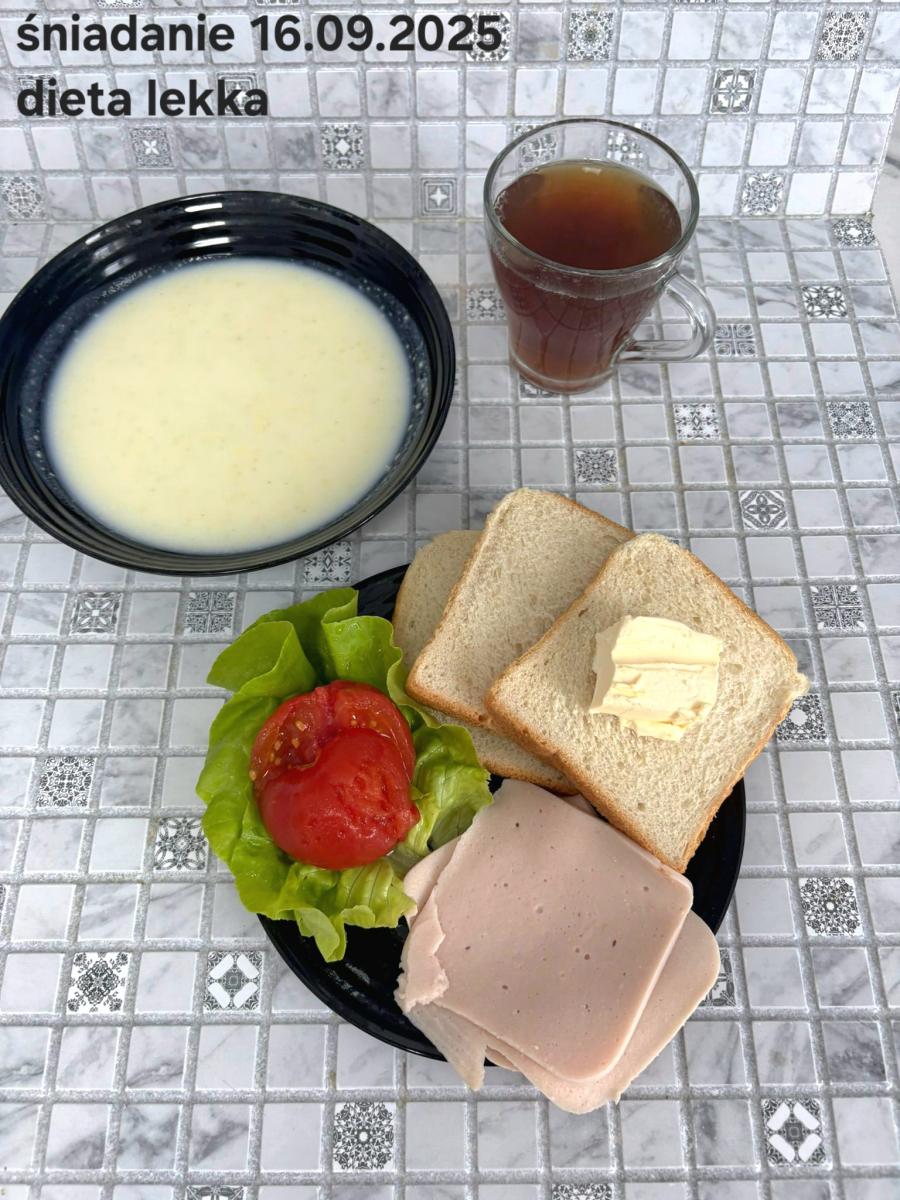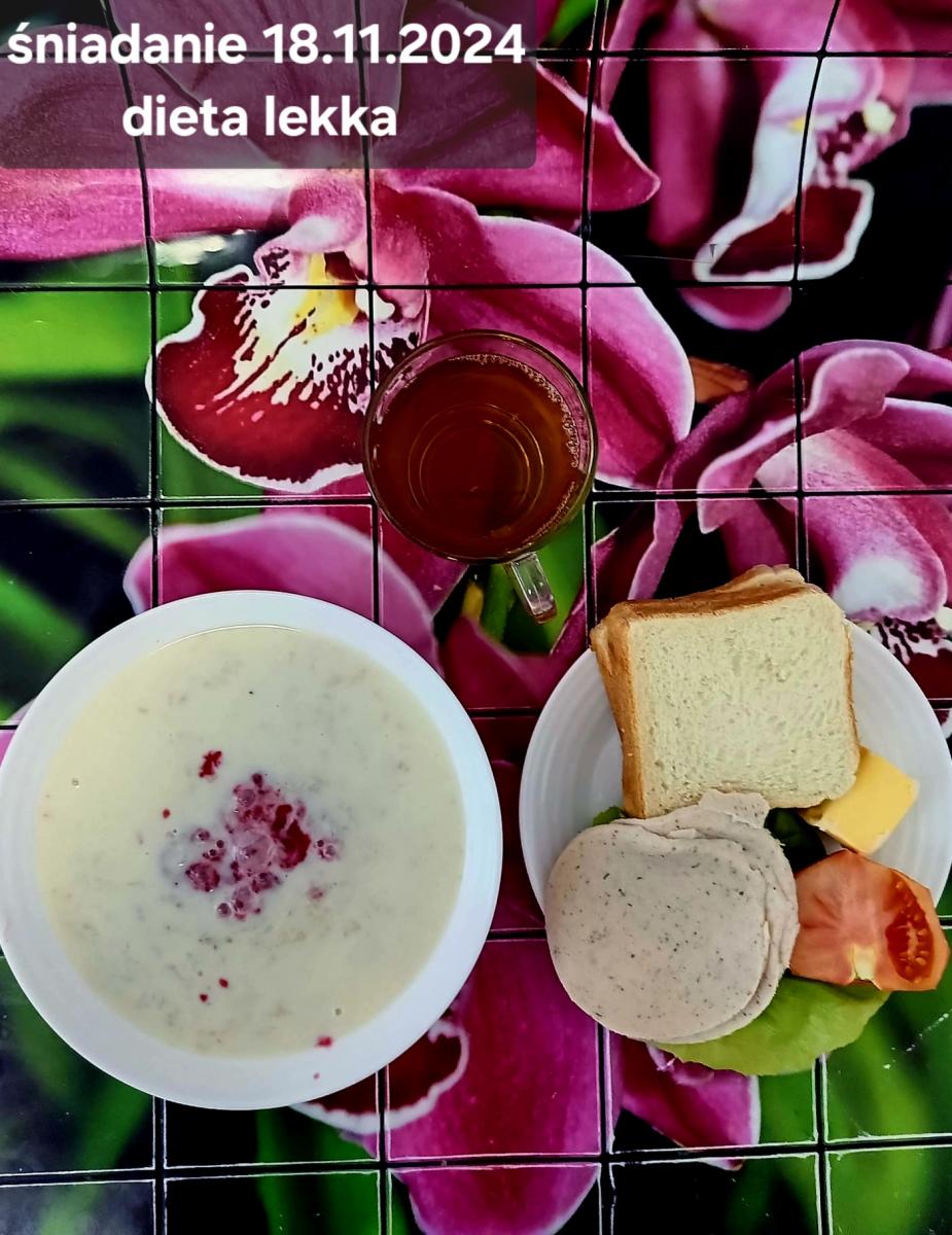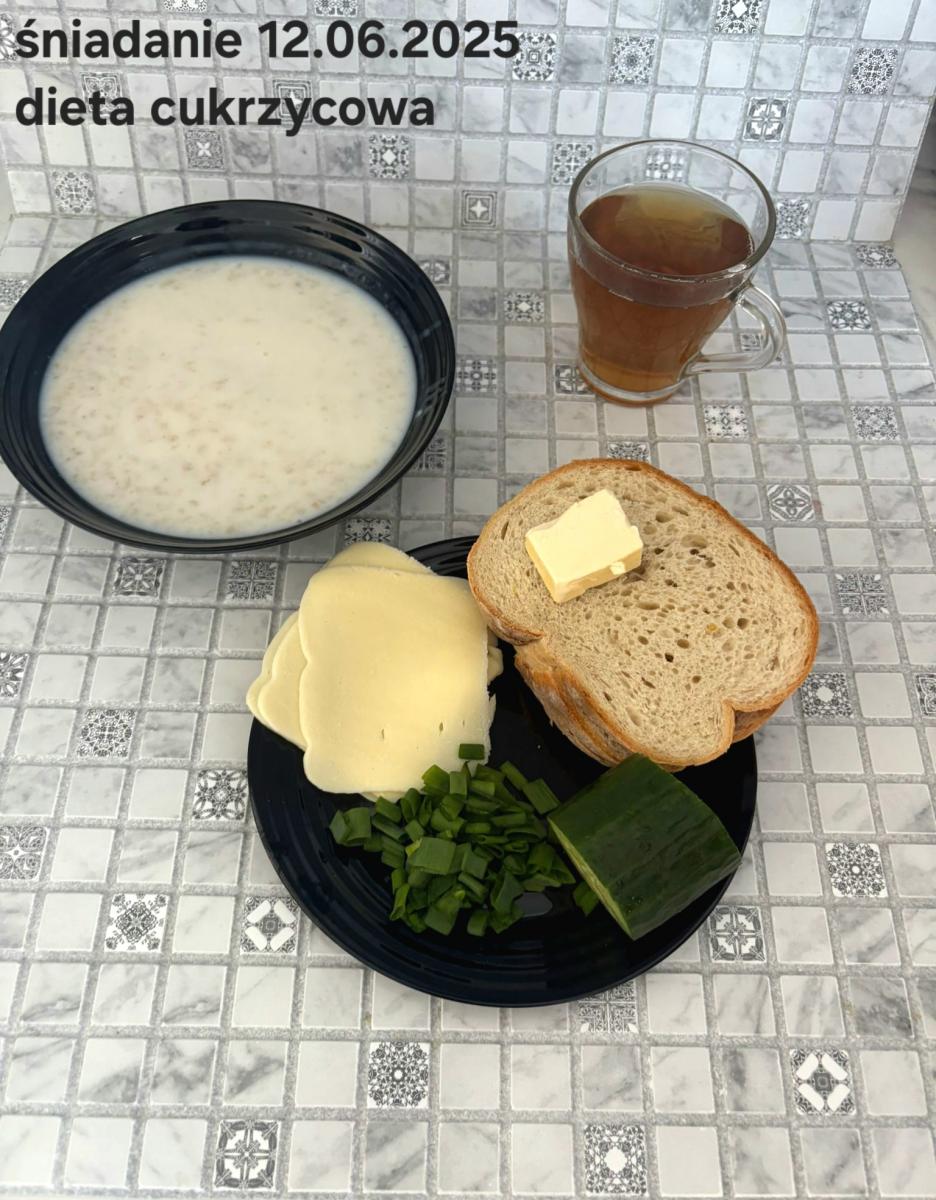 L(W,T): Zamiast masła- MARGARYNA MIĘKKA (15g) C: ZUPA MLECZNA Z PŁATKAMI OWSIANYMI(1) (50g) CHLEB ŻYTNI RAZOWY(1)- 150g Herbata bez cukru W: Dodatkowo SZYNKA DROBIOWA(1,6,9,10)- |