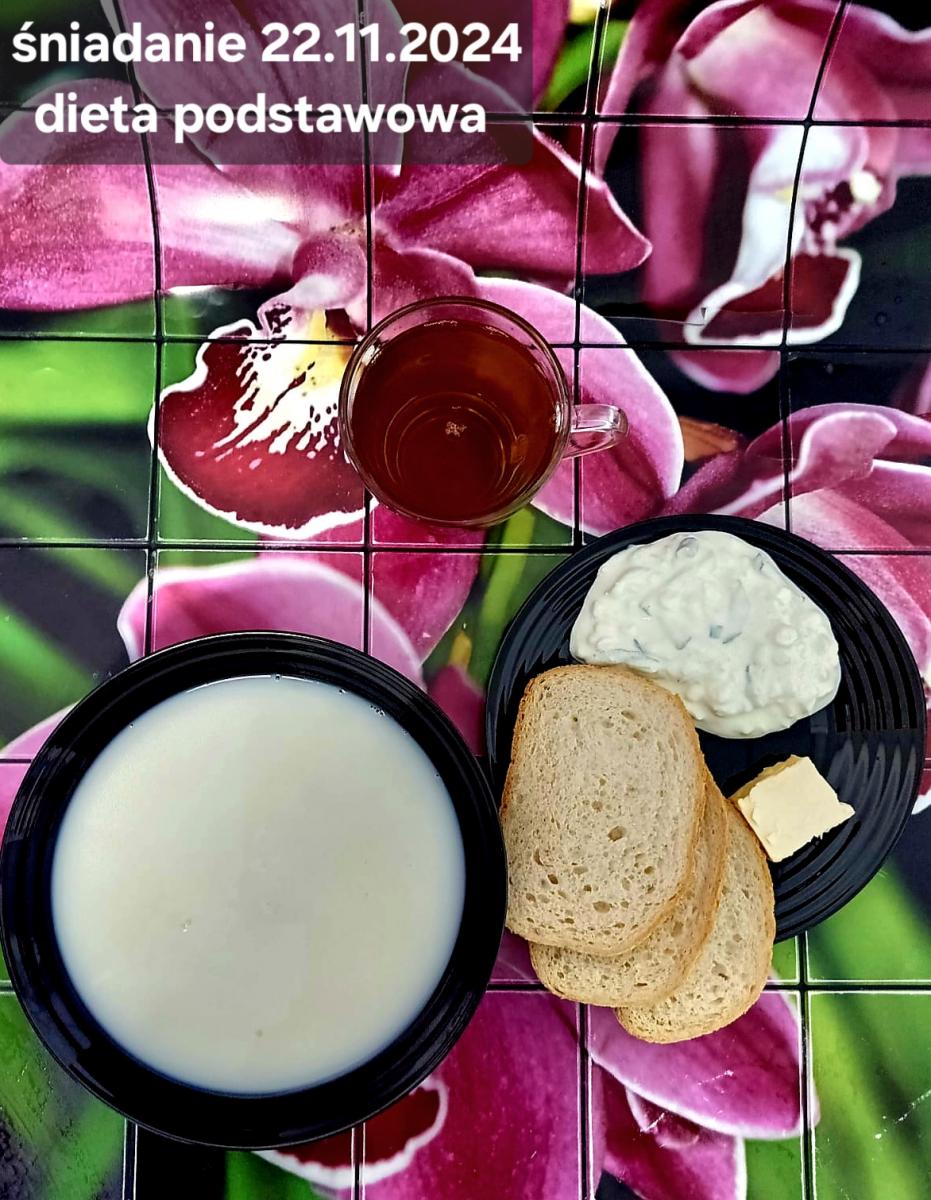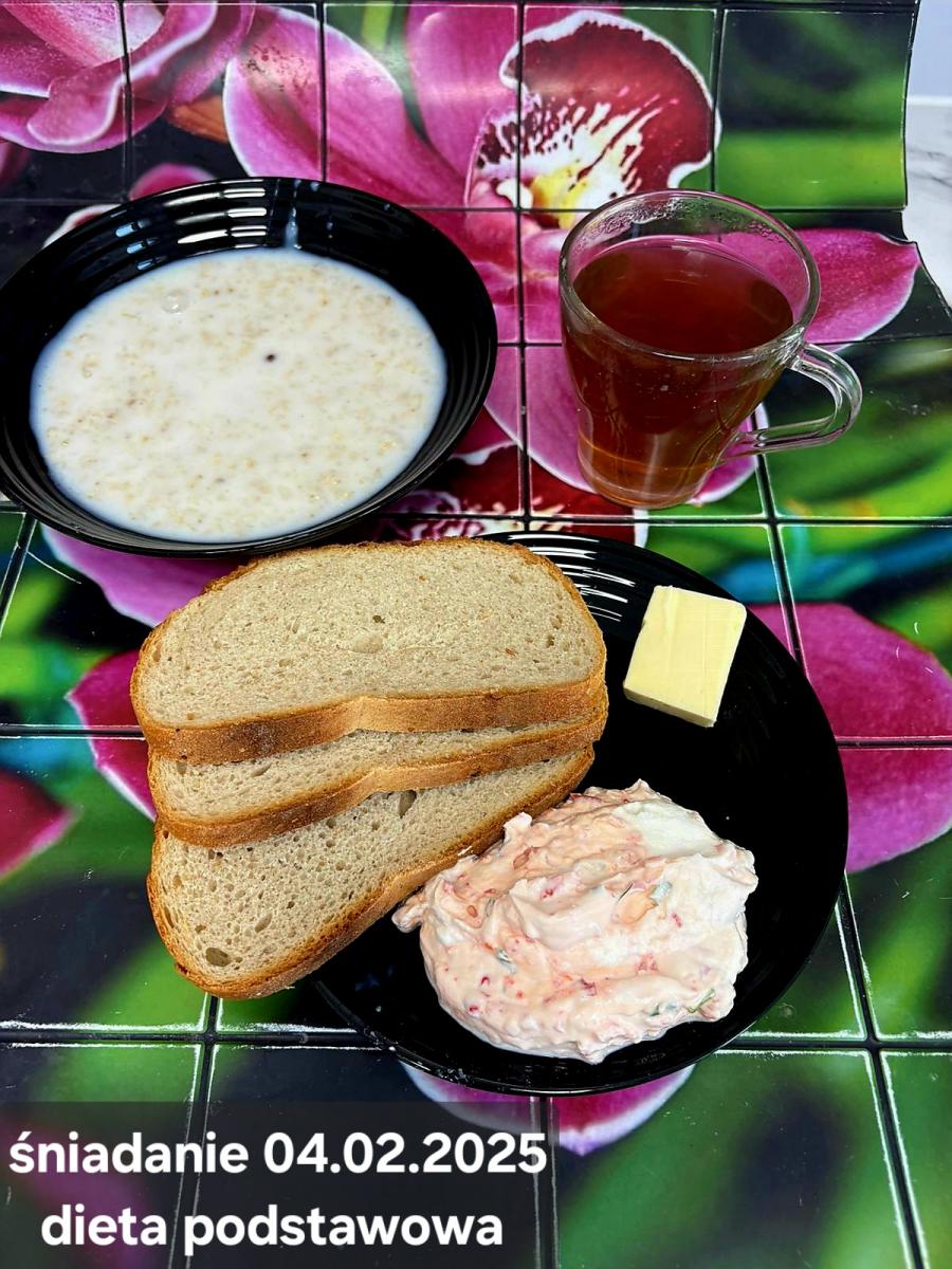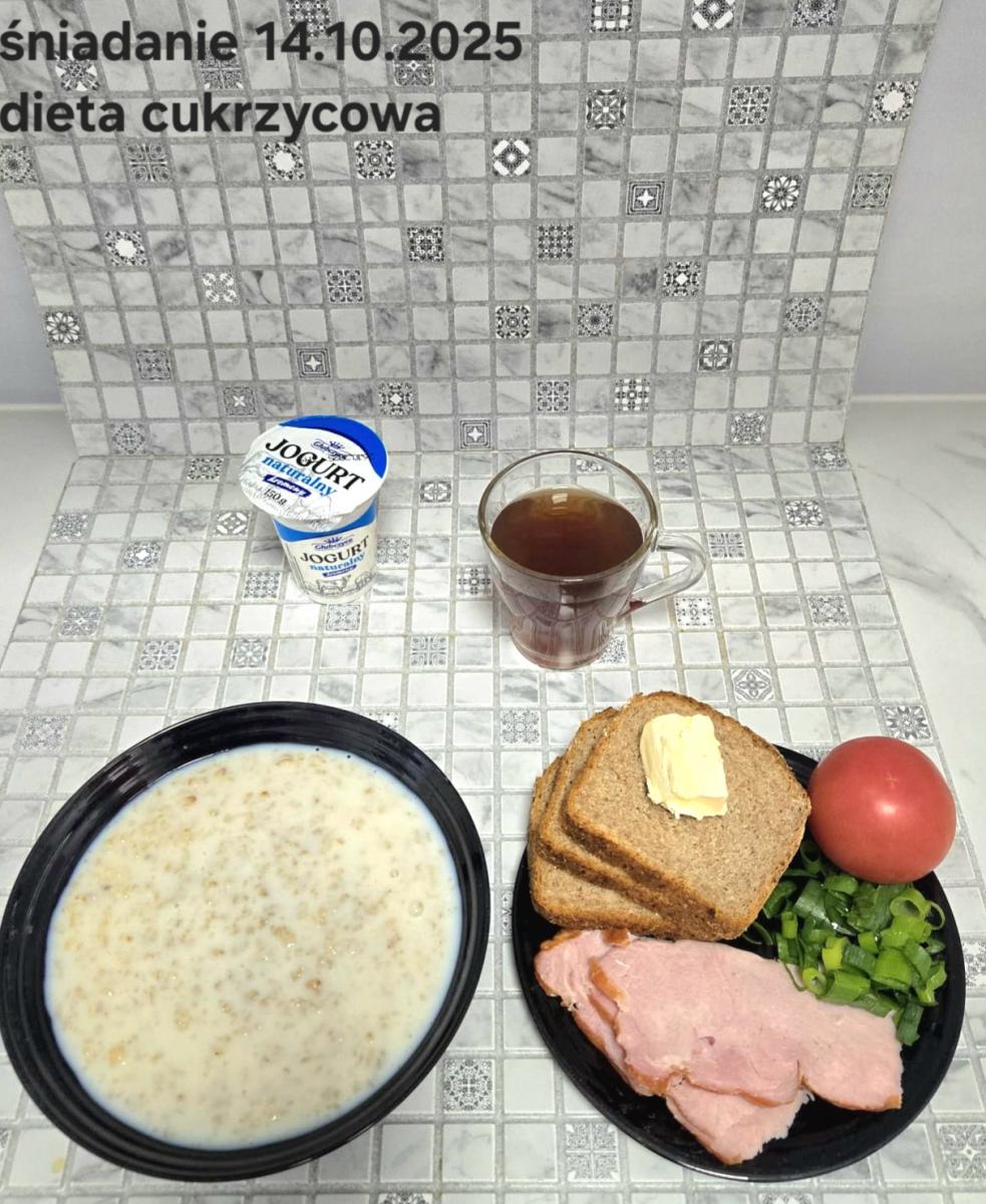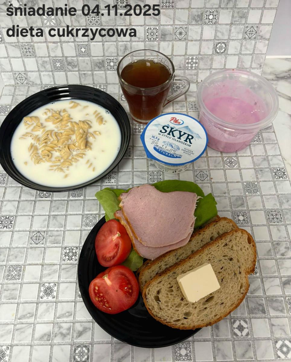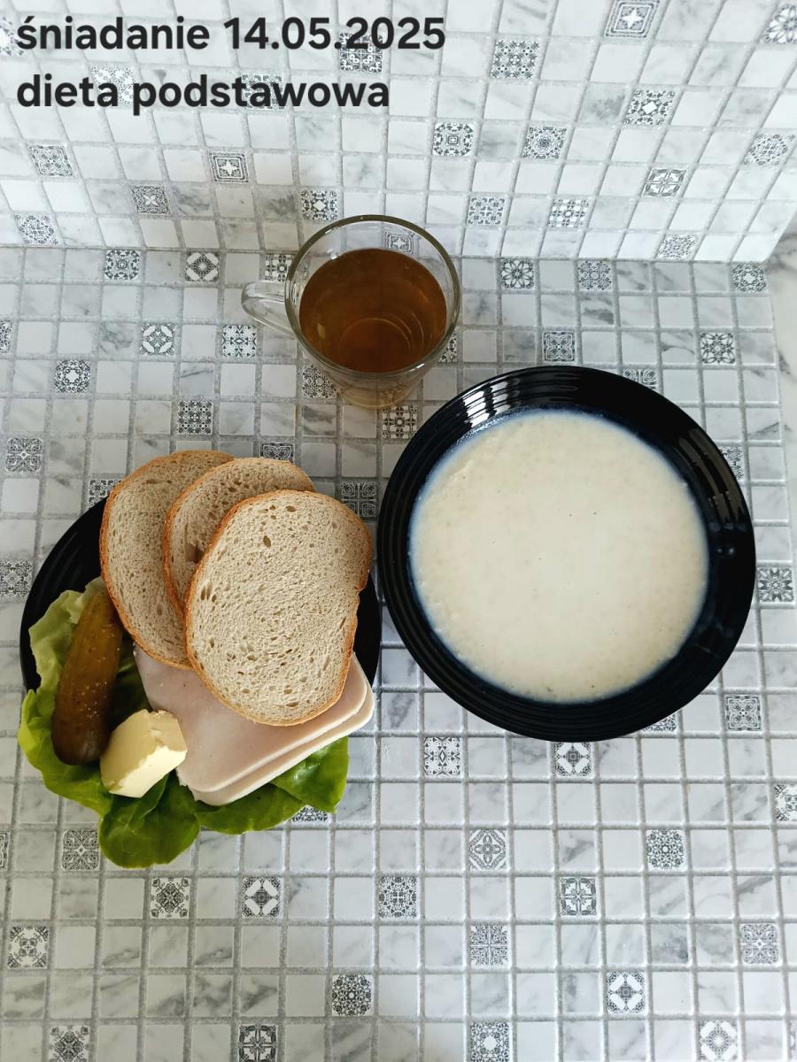 L(W,T): Zamiast masła- MARGARYNA MIĘKKA (15g) C: ZUPA MLECZNA Z PŁATKAMI OWSIANYMI(1) (50g) CHLEB ŻYTNI RAZOWY(1)- 150g Herbata bez cukru W: Dodatkowo SZYNKA DROBIOWA(1,6,9,10)- |