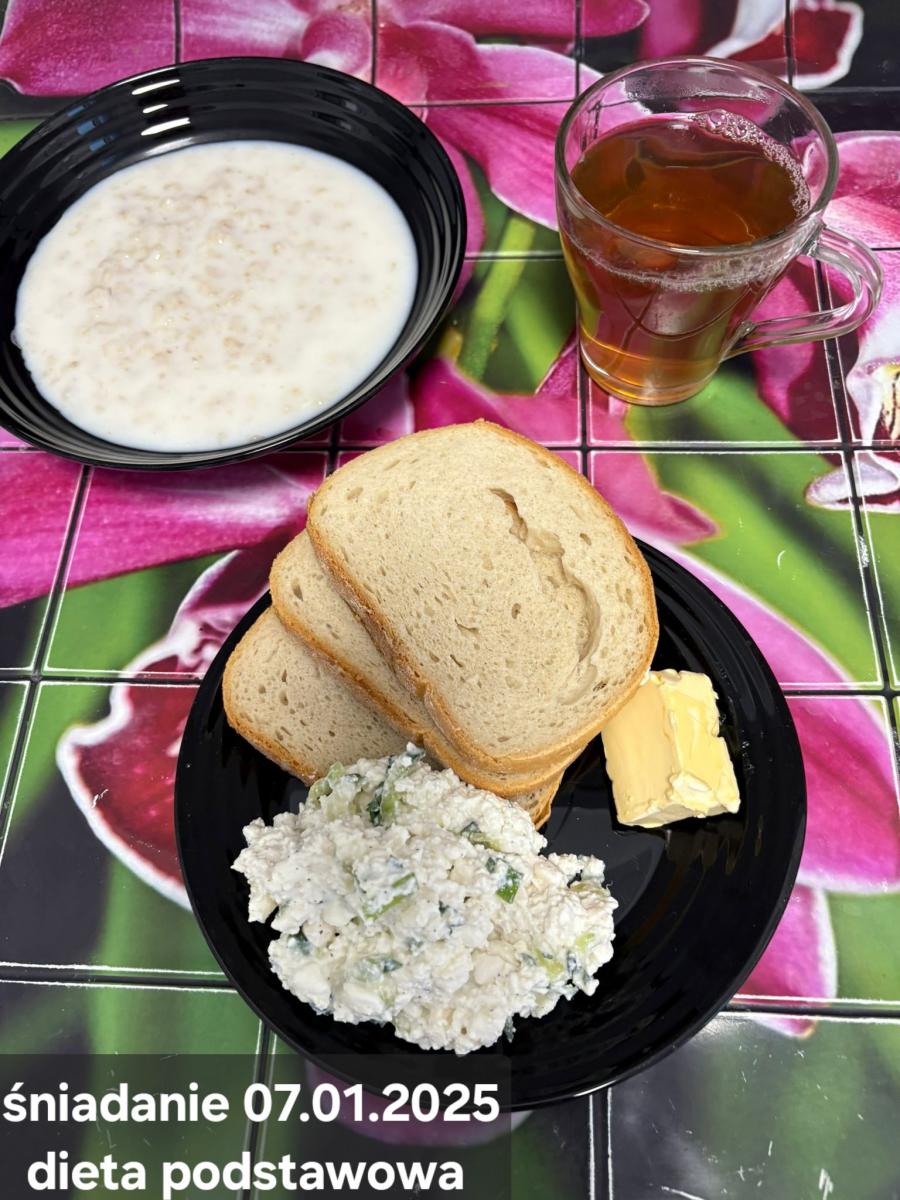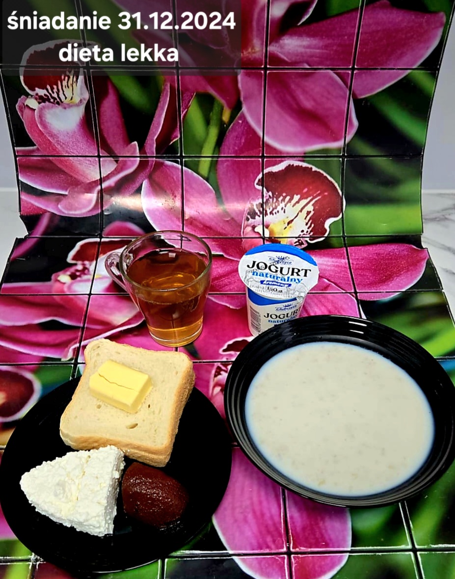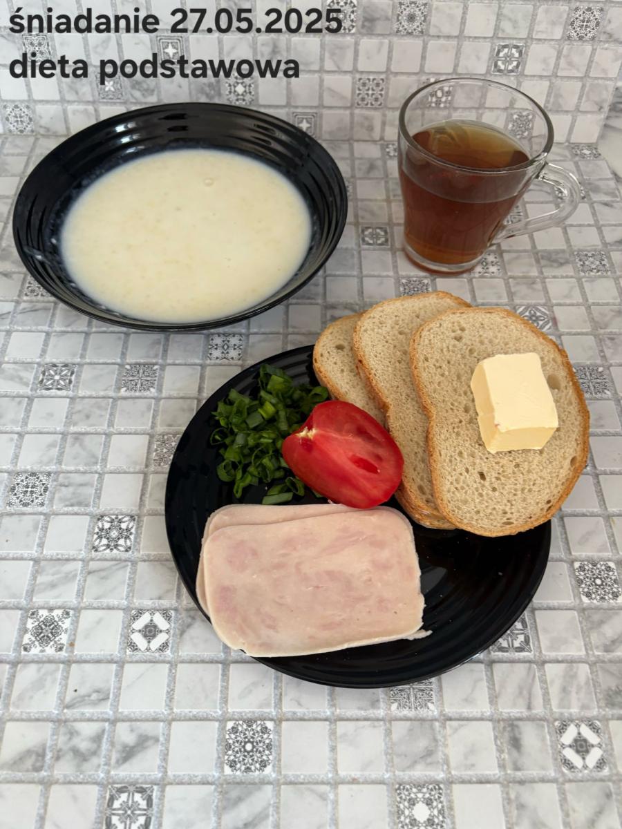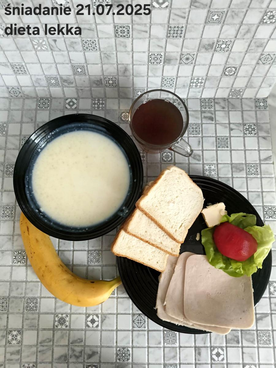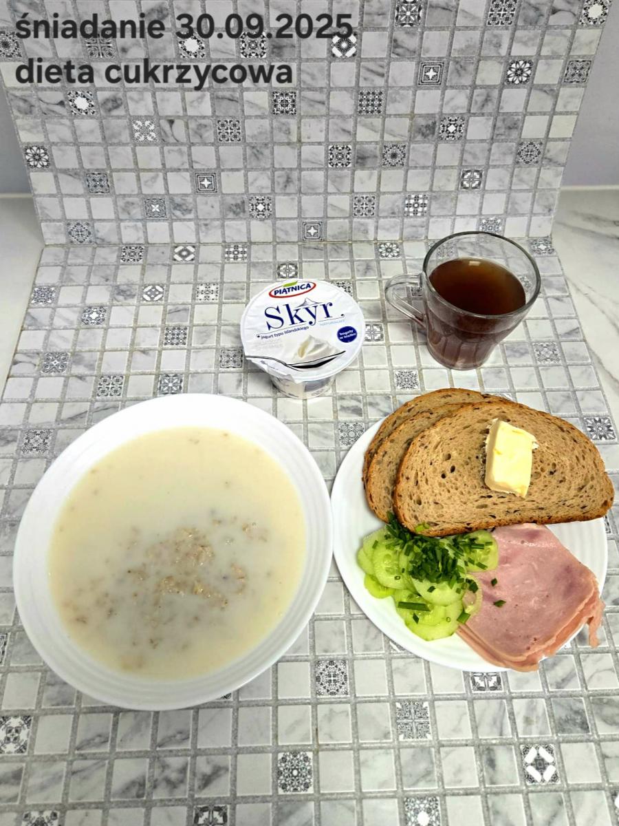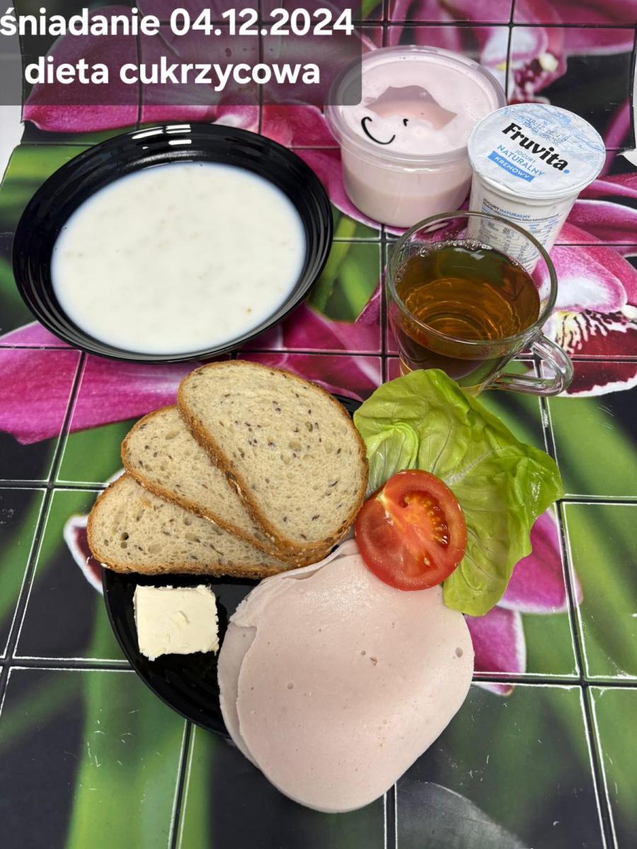 L(W,T): Zamiast masła- MARGARYNA MIĘKKA (15g) C: ZUPA MLECZNA Z PŁATKAMI OWSIANYMI(1) (50g) CHLEB ŻYTNI RAZOWY(1)- 150g Herbata bez cukru W: Dodatkowo SZYNKA DROBIOWA(1,6,9,10)- |