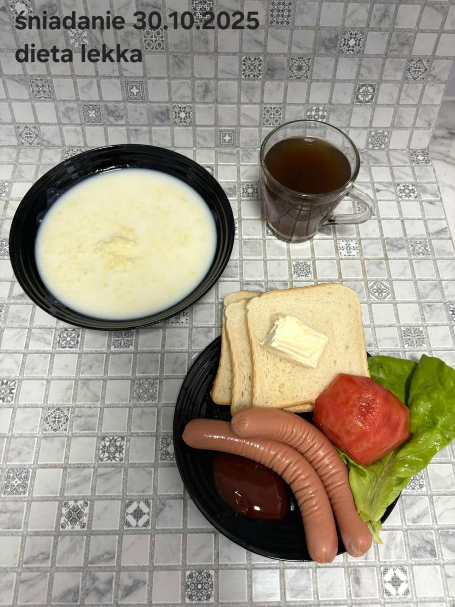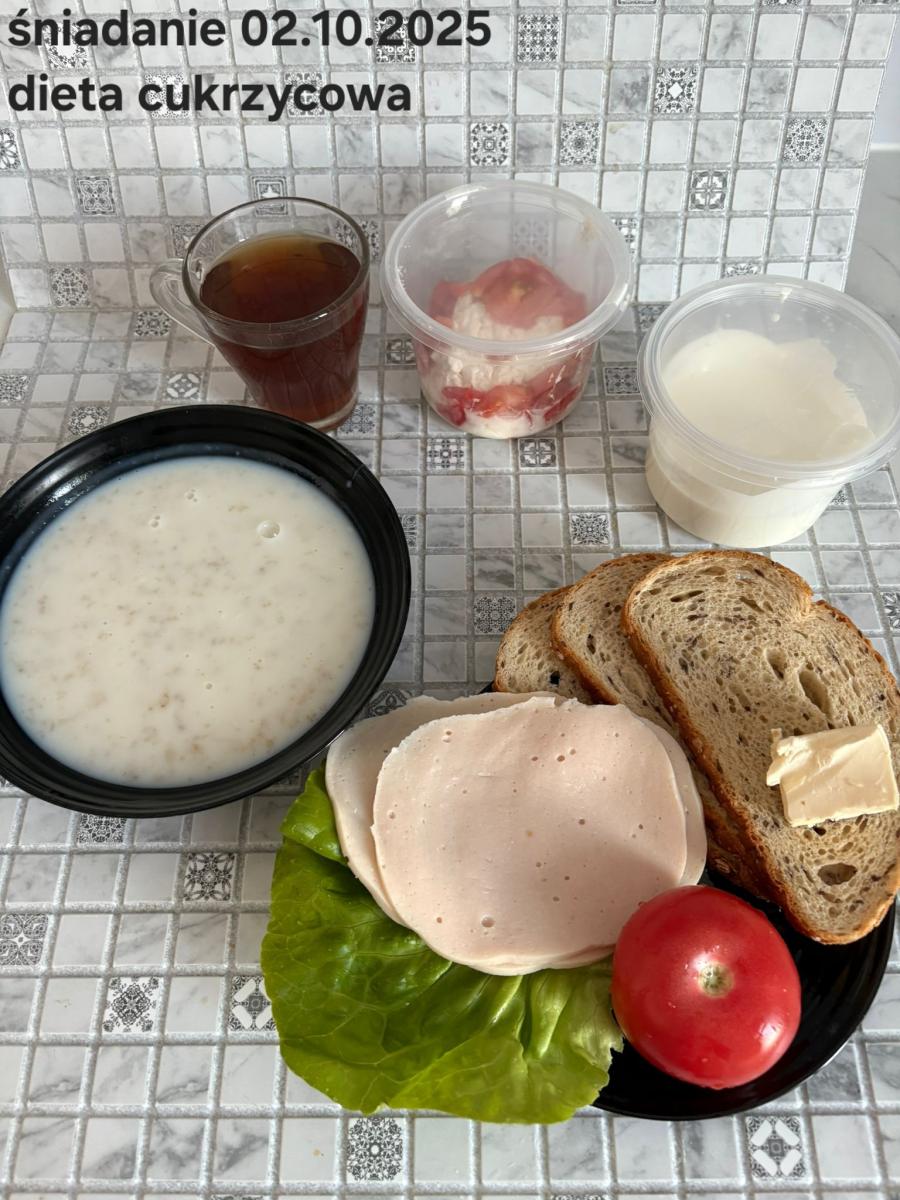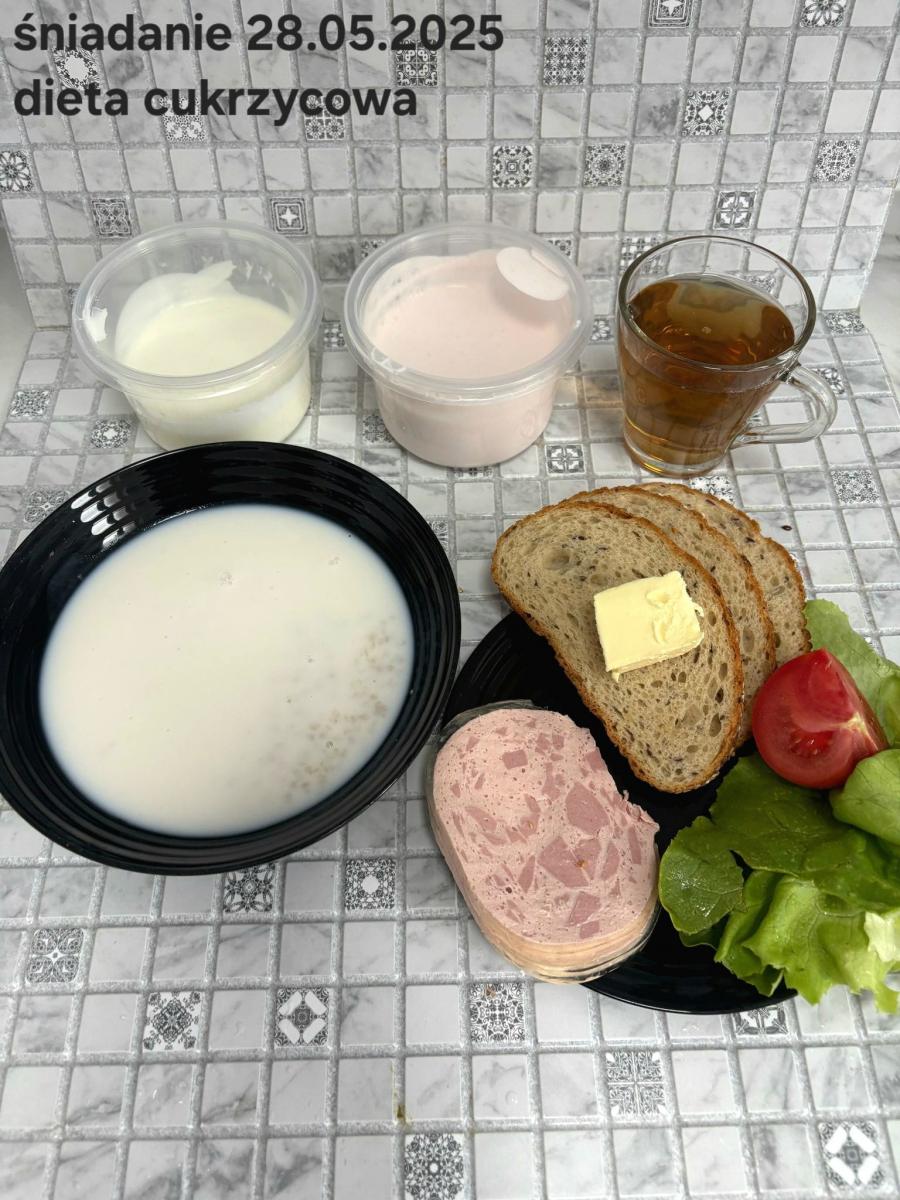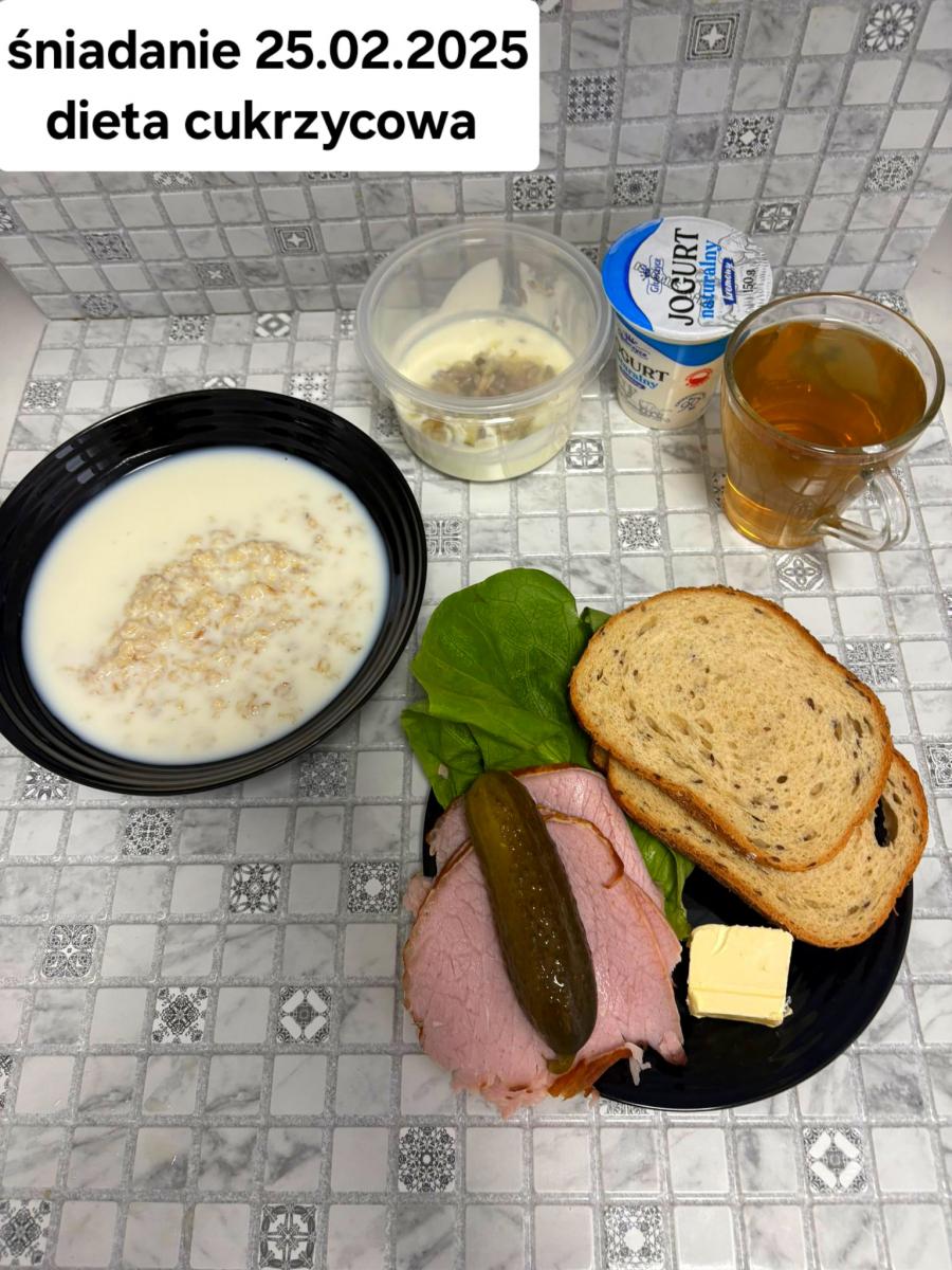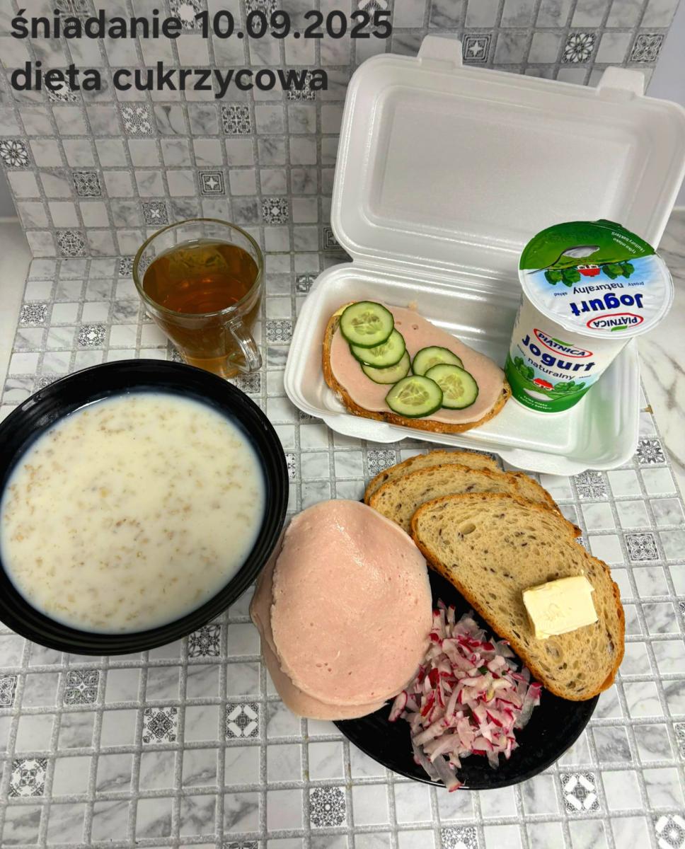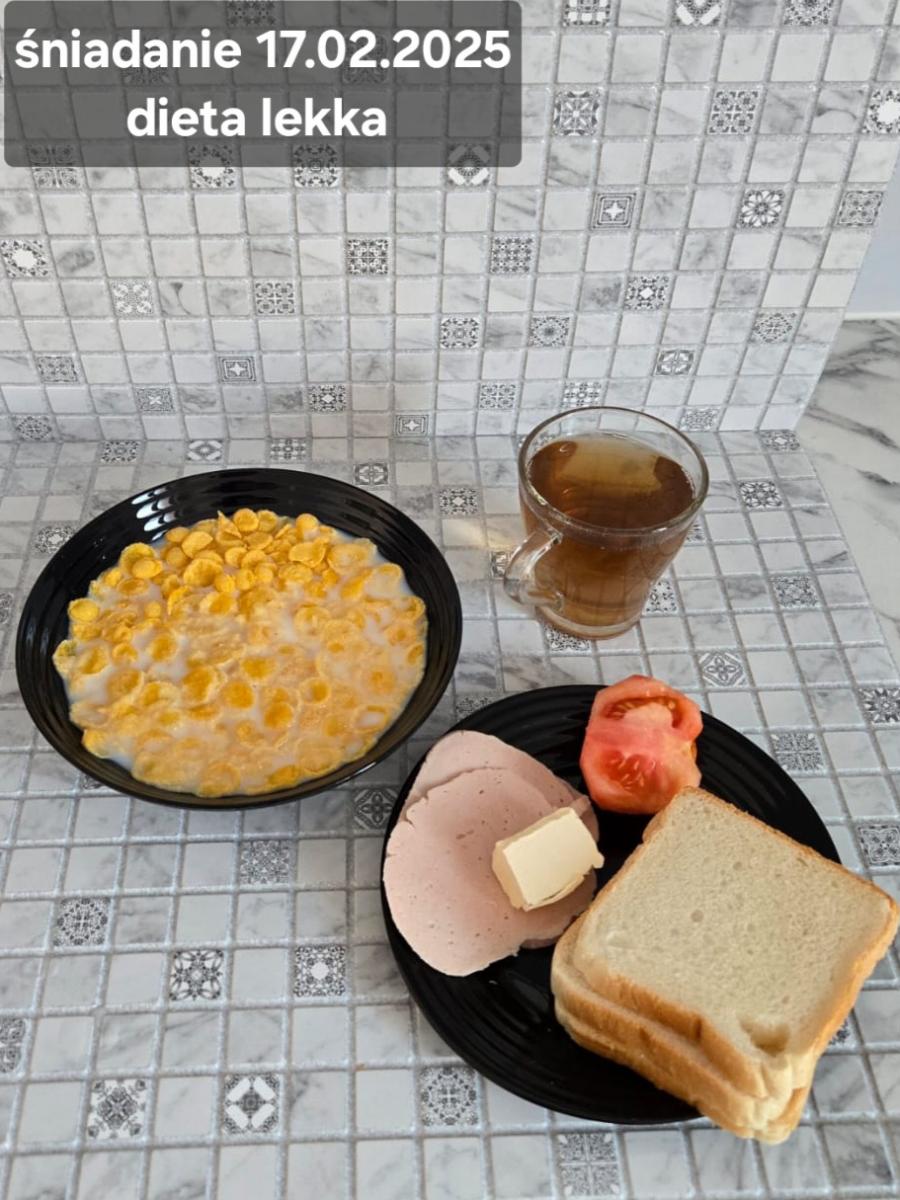 L(W,T): Zamiast masła- MARGARYNA MIĘKKA (15g) C: ZUPA MLECZNA Z PŁATKAMI OWSIANYMI(1) (50g) CHLEB ŻYTNI RAZOWY(1)- 150g Herbata bez cukru W: Dodatkowo SZYNKA DROBIOWA(1,6,9,10)- |