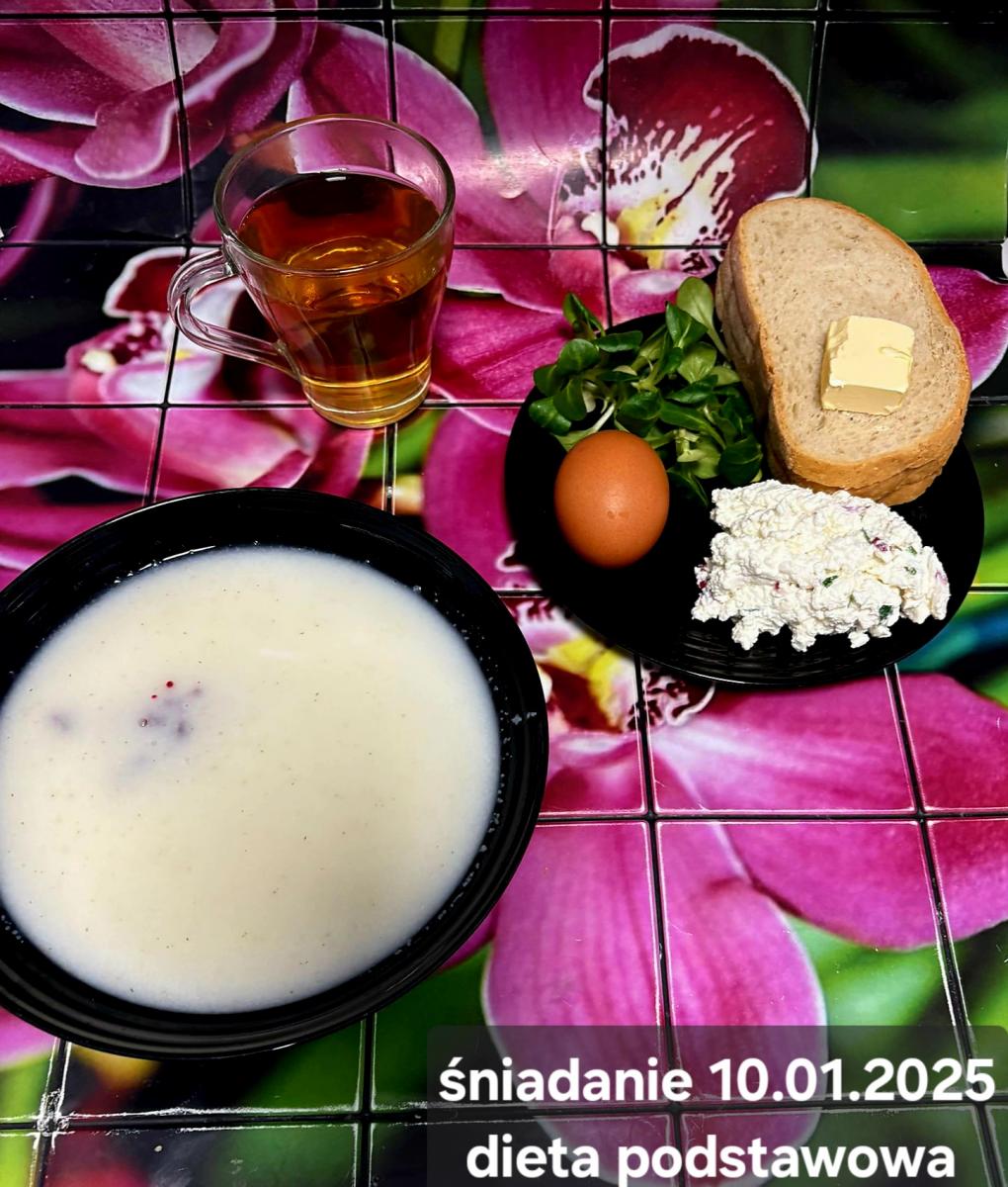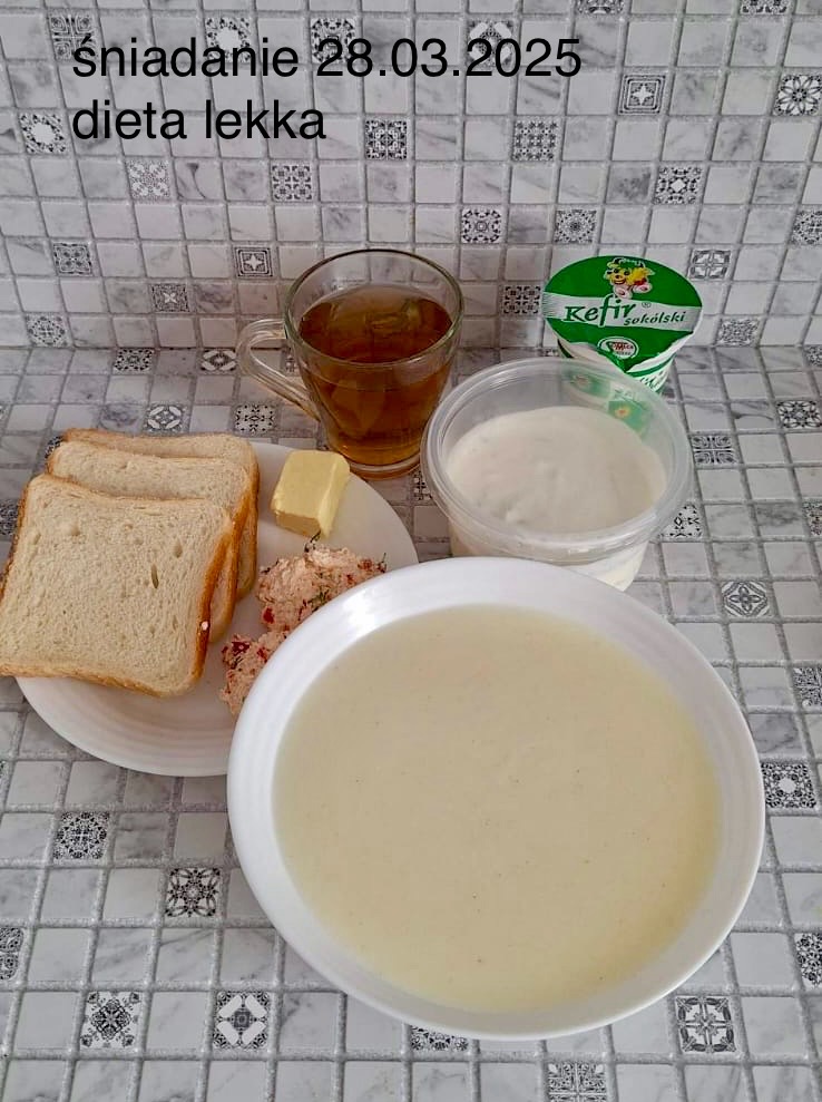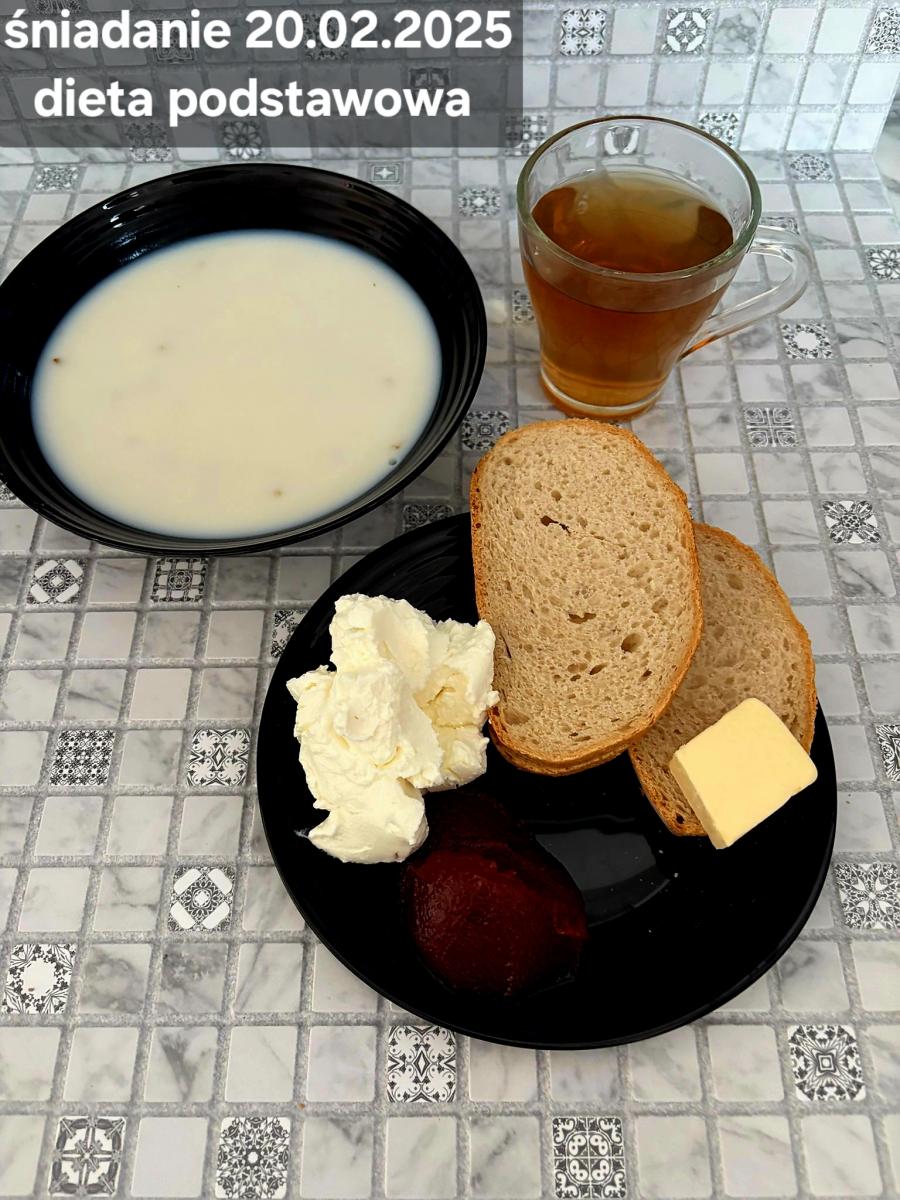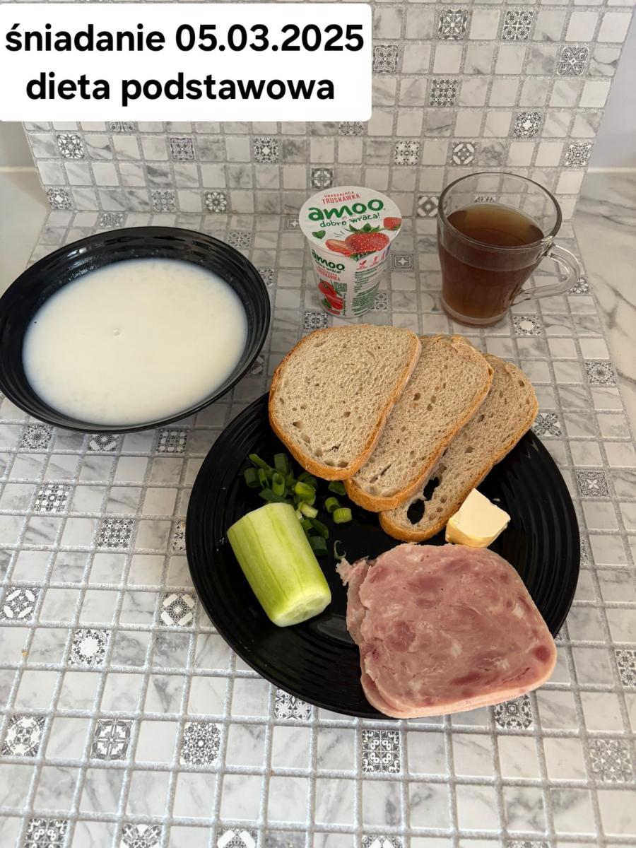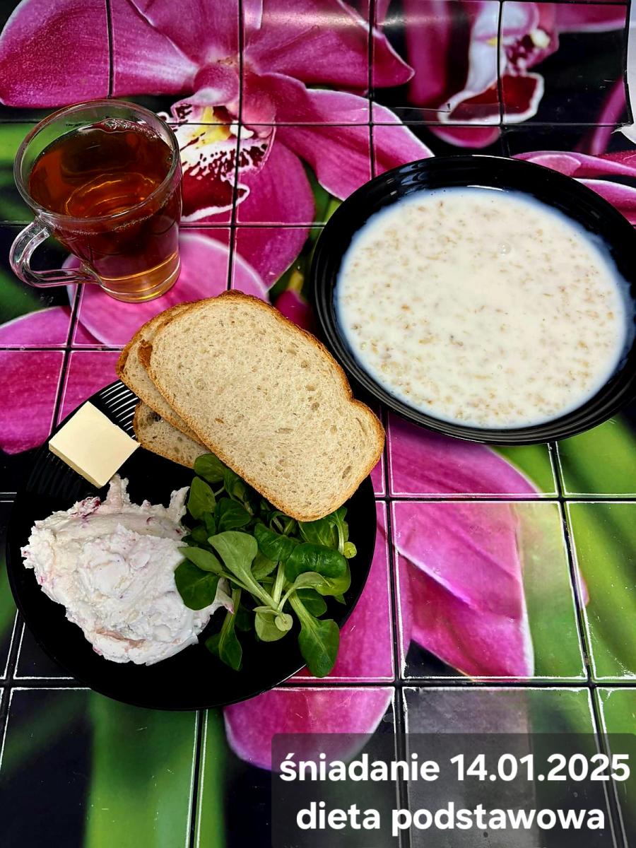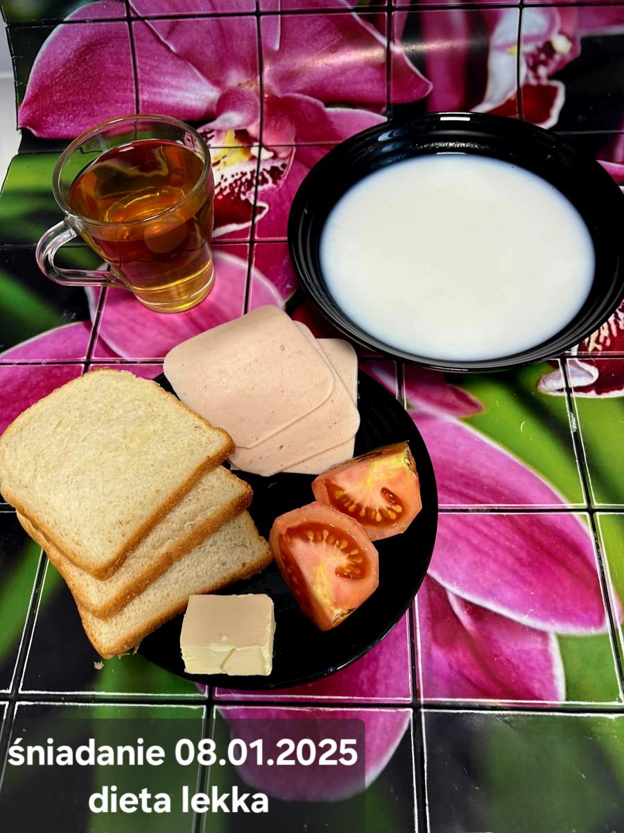 L(W,T): Zamiast masła- MARGARYNA MIĘKKA (15g) C: ZUPA MLECZNA Z PŁATKAMI OWSIANYMI(1) (50g) CHLEB ŻYTNI RAZOWY(1)- 150g Herbata bez cukru W: Dodatkowo SZYNKA DROBIOWA(1,6,9,10)- |