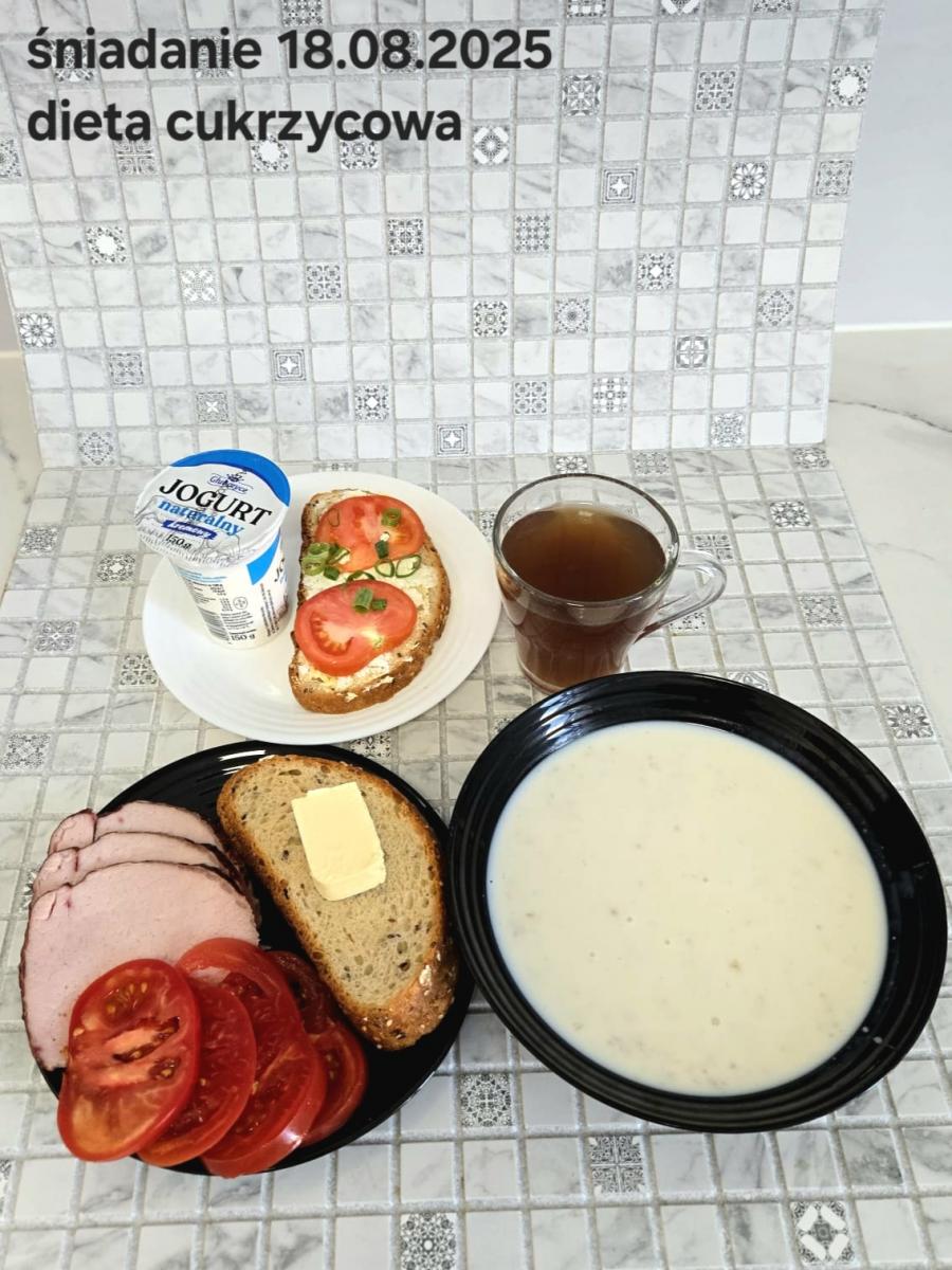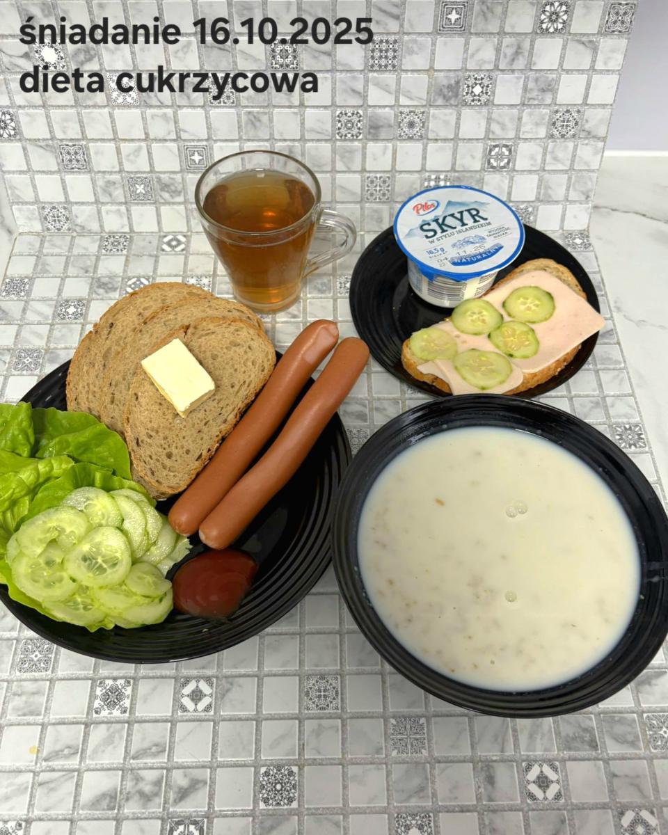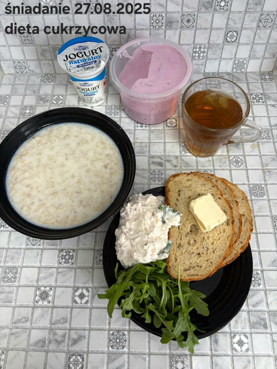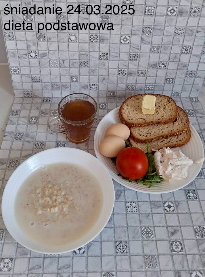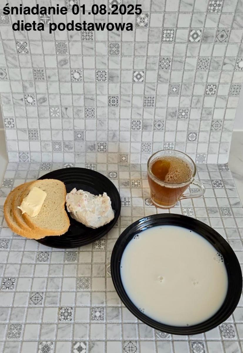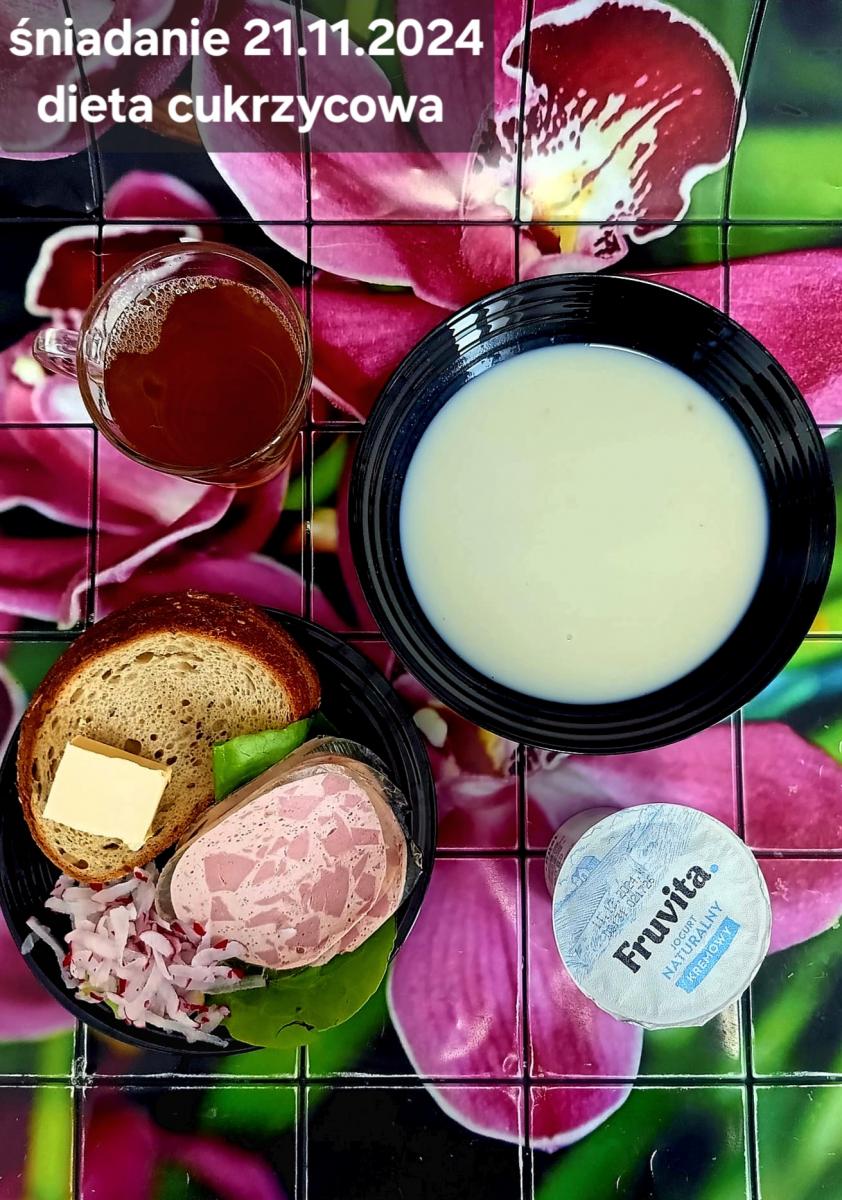 L(W,T): Zamiast masła- MARGARYNA MIĘKKA (15g) C: ZUPA MLECZNA Z PŁATKAMI OWSIANYMI(1) (50g) CHLEB ŻYTNI RAZOWY(1)- 150g Herbata bez cukru W: Dodatkowo SZYNKA DROBIOWA(1,6,9,10)- |