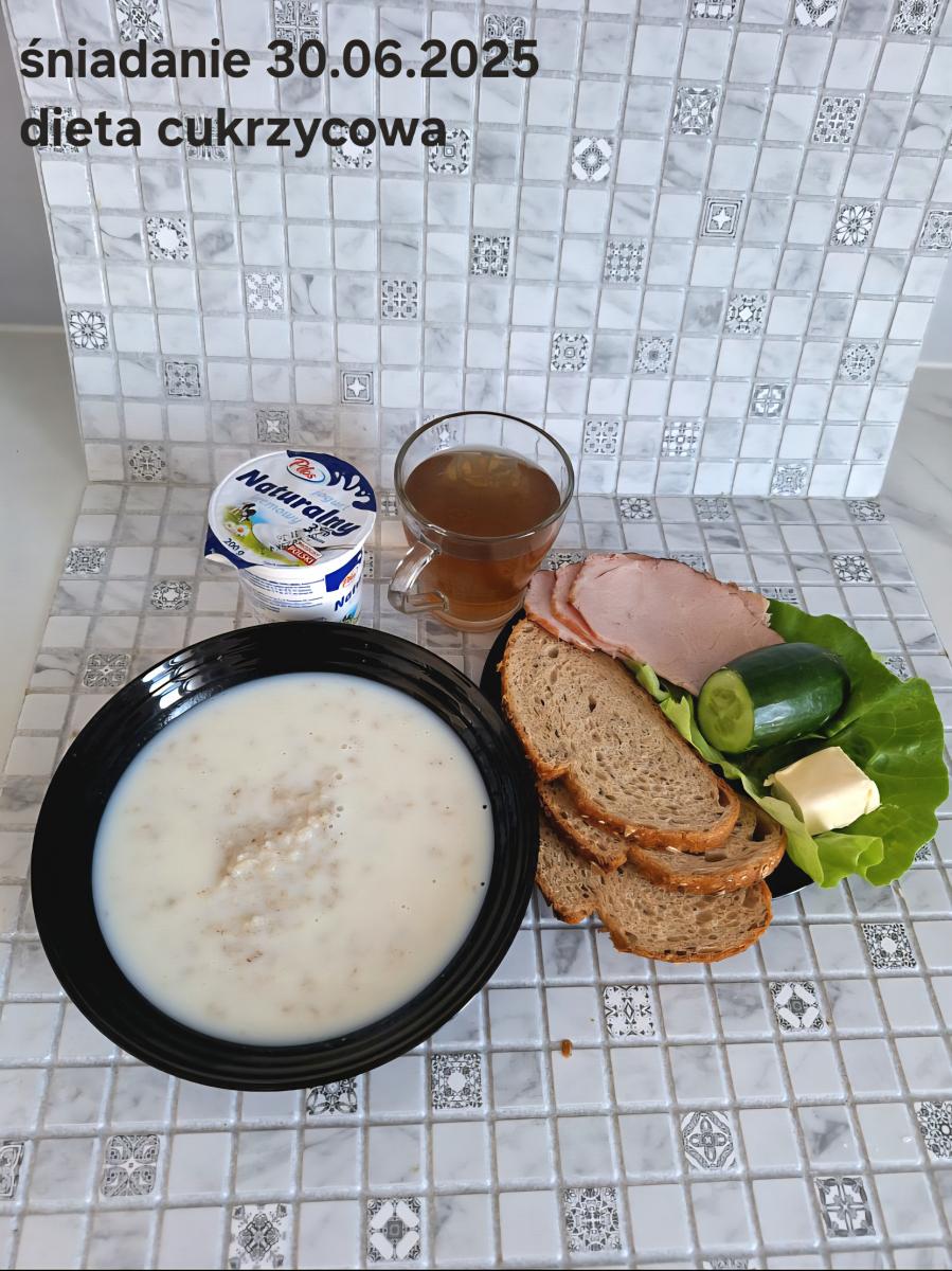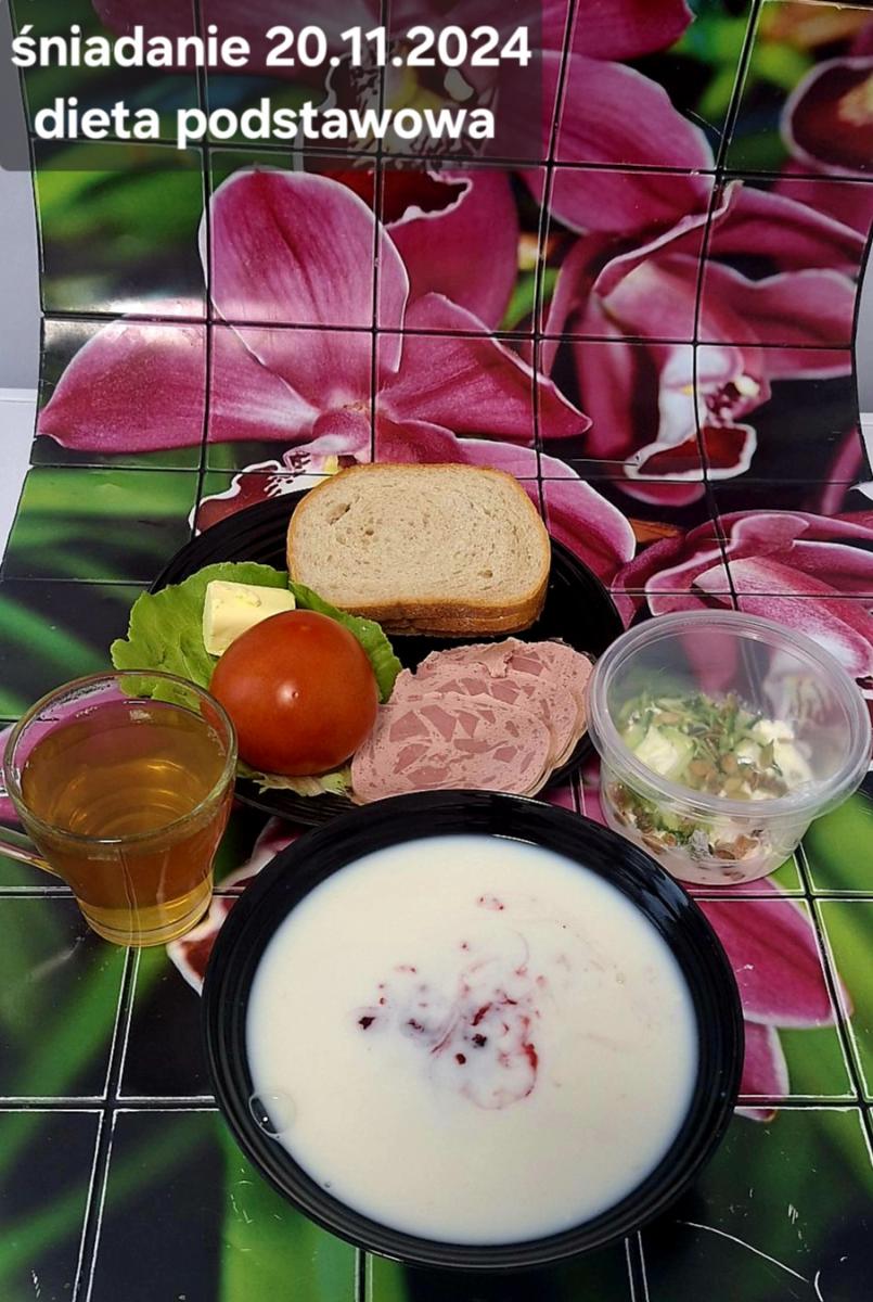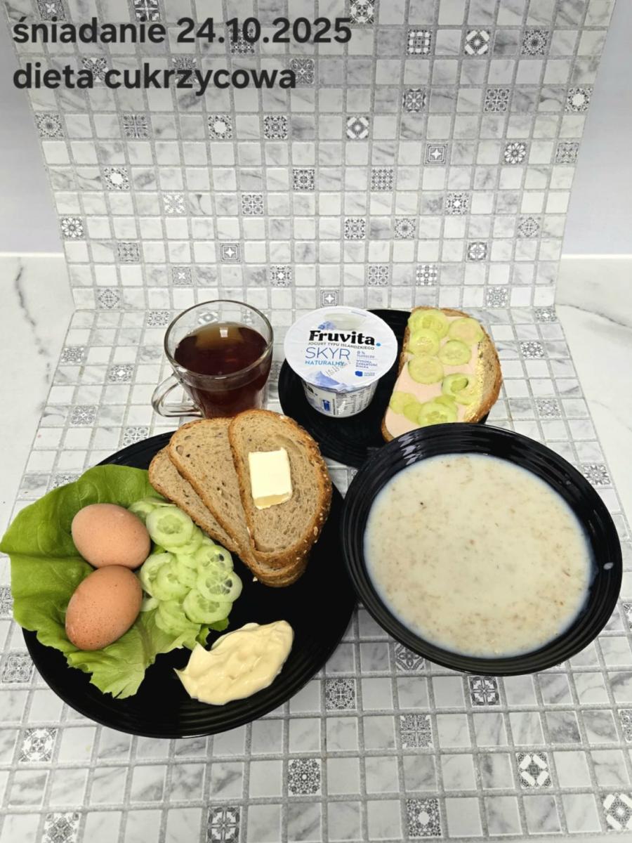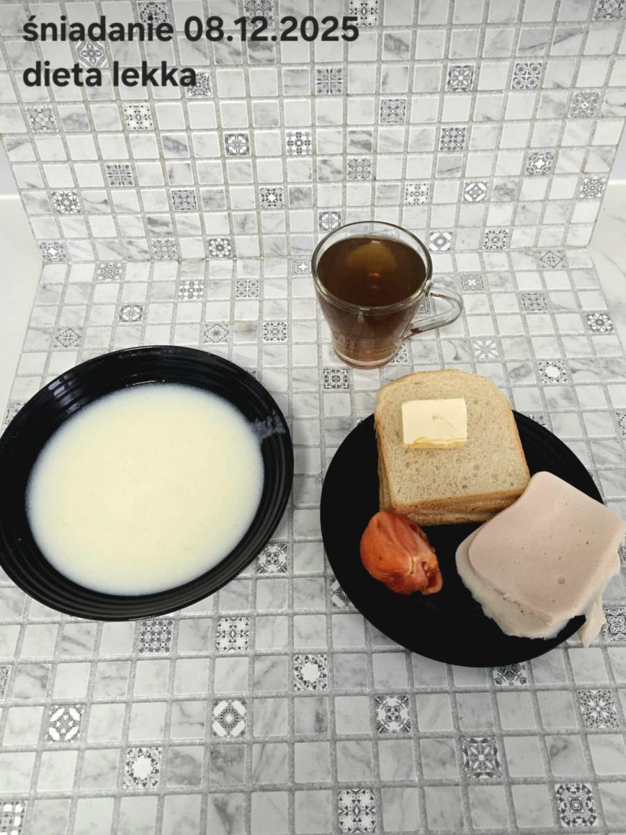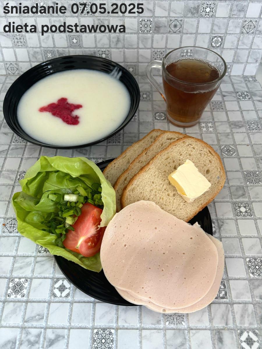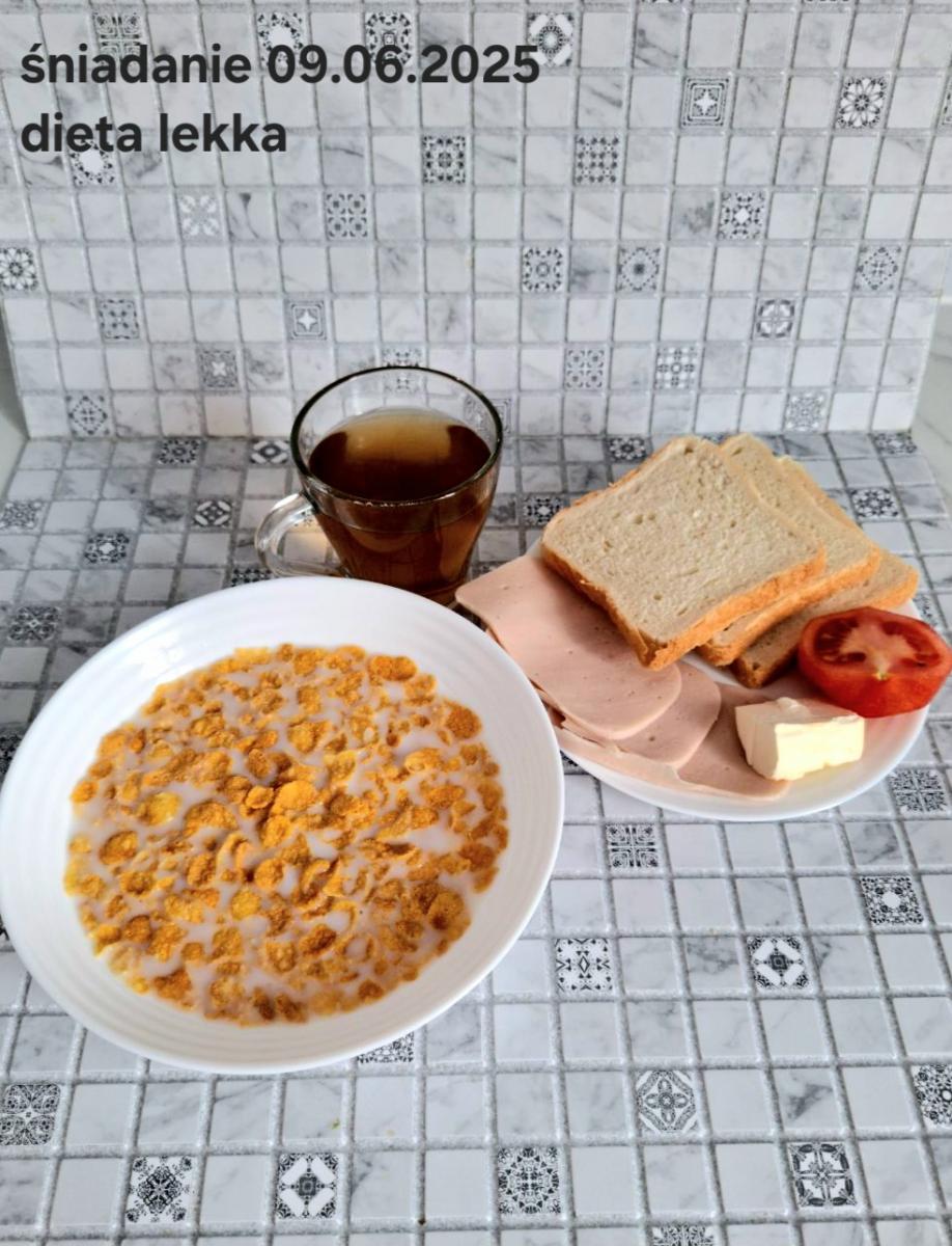 L(W,T): Zamiast masła- MARGARYNA MIĘKKA (15g) C: ZUPA MLECZNA Z PŁATKAMI OWSIANYMI(1) (50g) CHLEB ŻYTNI RAZOWY(1)- 150g Herbata bez cukru W: Dodatkowo SZYNKA DROBIOWA(1,6,9,10)- |