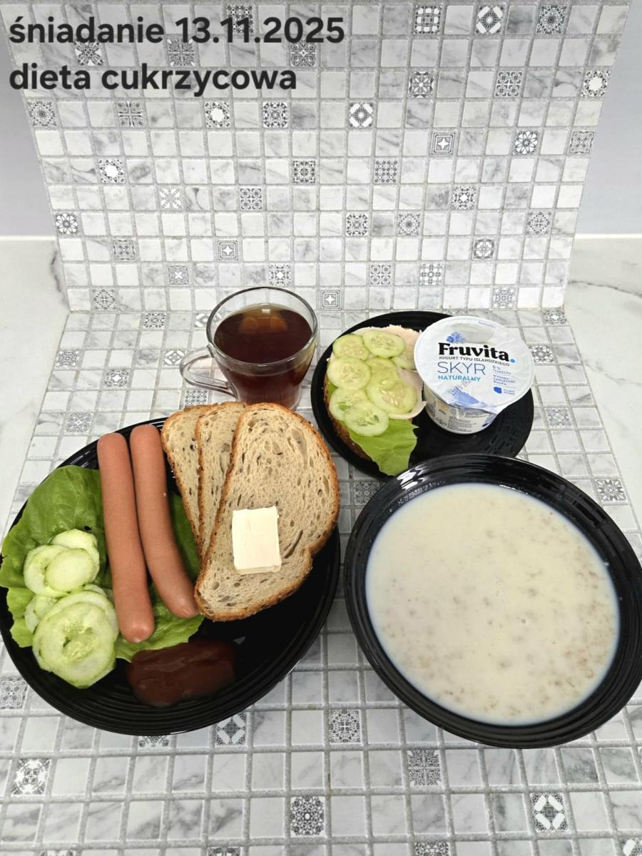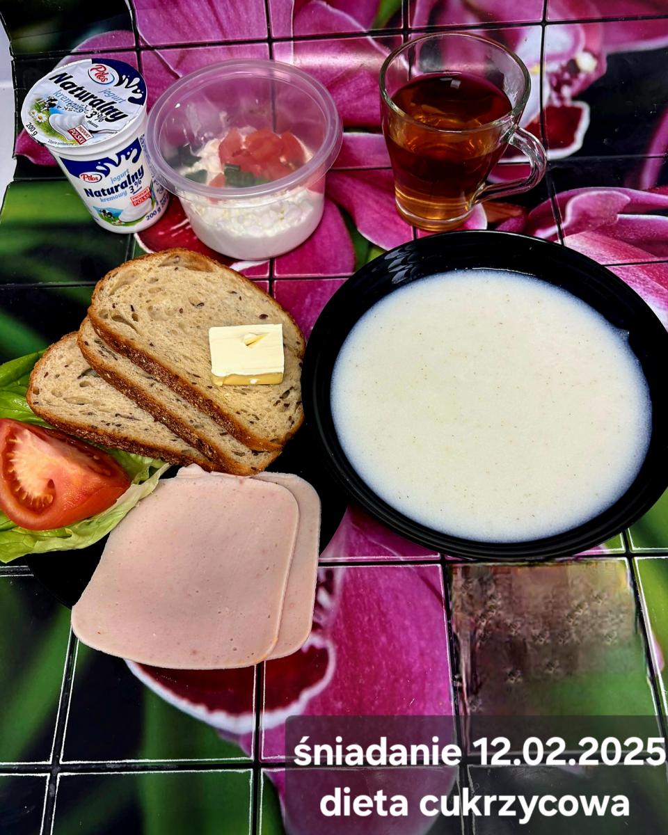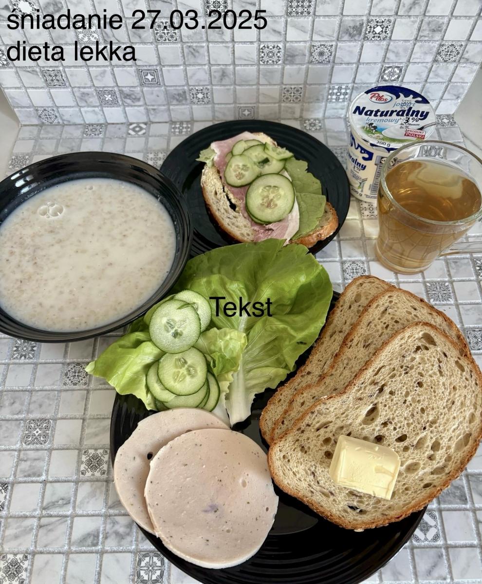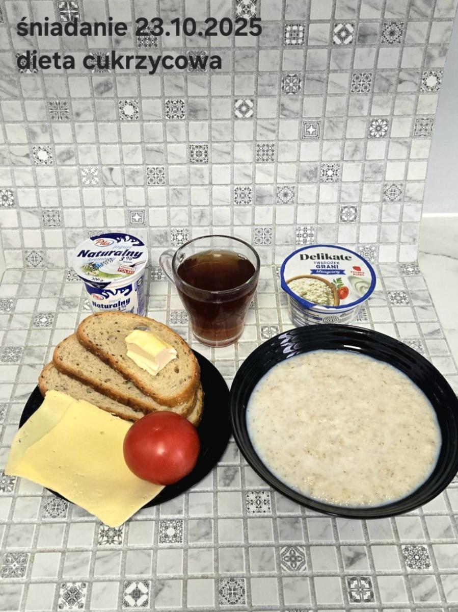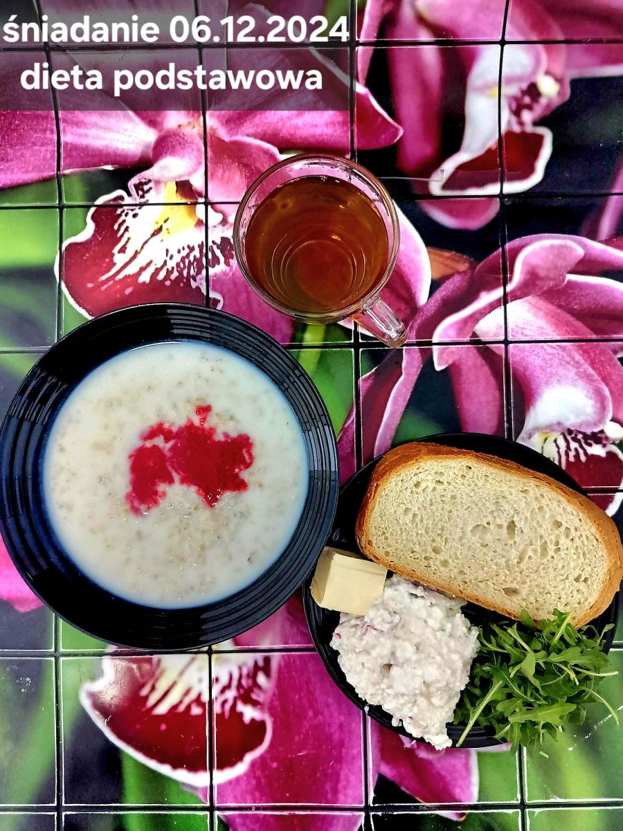 L(W,T): Zamiast masła- MARGARYNA MIĘKKA (15g) C: ZUPA MLECZNA Z PŁATKAMI OWSIANYMI(1) (50g) CHLEB ŻYTNI RAZOWY(1)- 150g Herbata bez cukru W: Dodatkowo SZYNKA DROBIOWA(1,6,9,10)- |