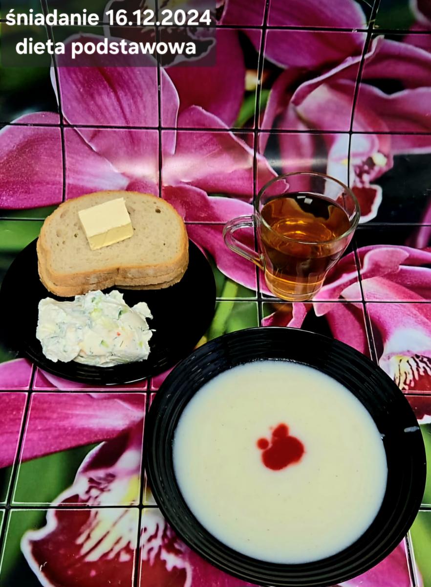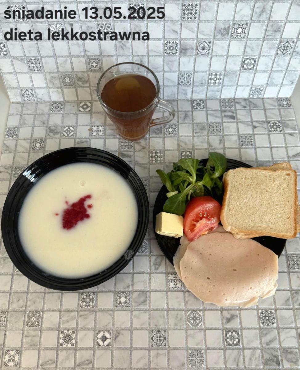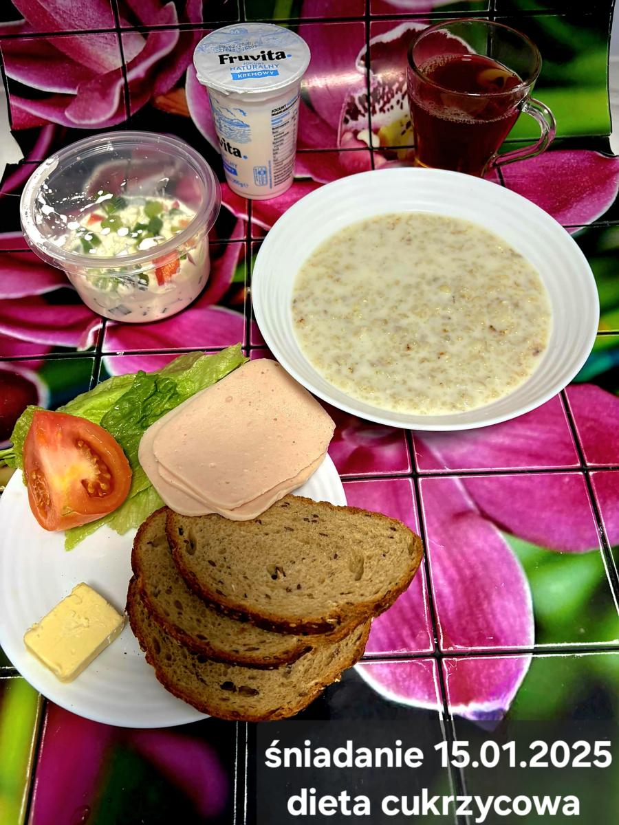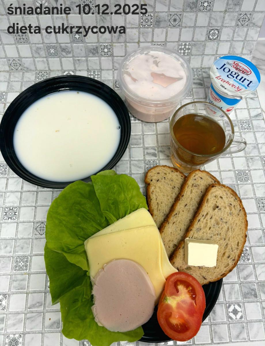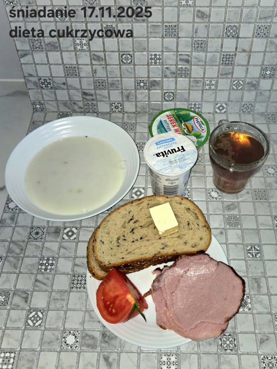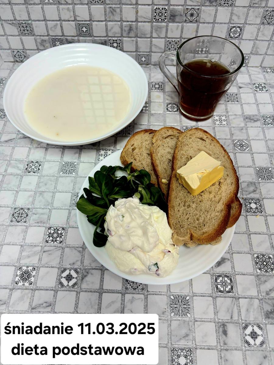 L(W,T): Zamiast masła- MARGARYNA MIĘKKA (15g) C: ZUPA MLECZNA Z PŁATKAMI OWSIANYMI(1) (50g) CHLEB ŻYTNI RAZOWY(1)- 150g Herbata bez cukru W: Dodatkowo SZYNKA DROBIOWA(1,6,9,10)- |