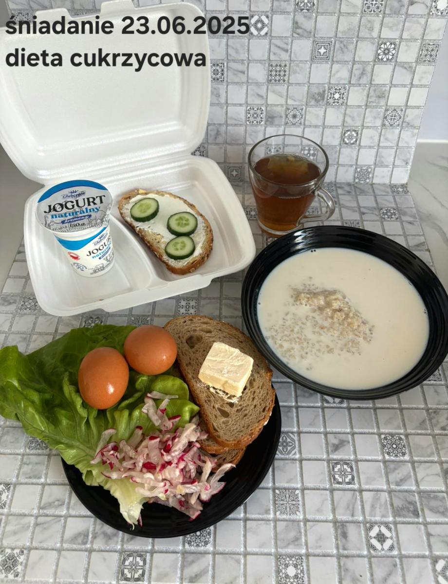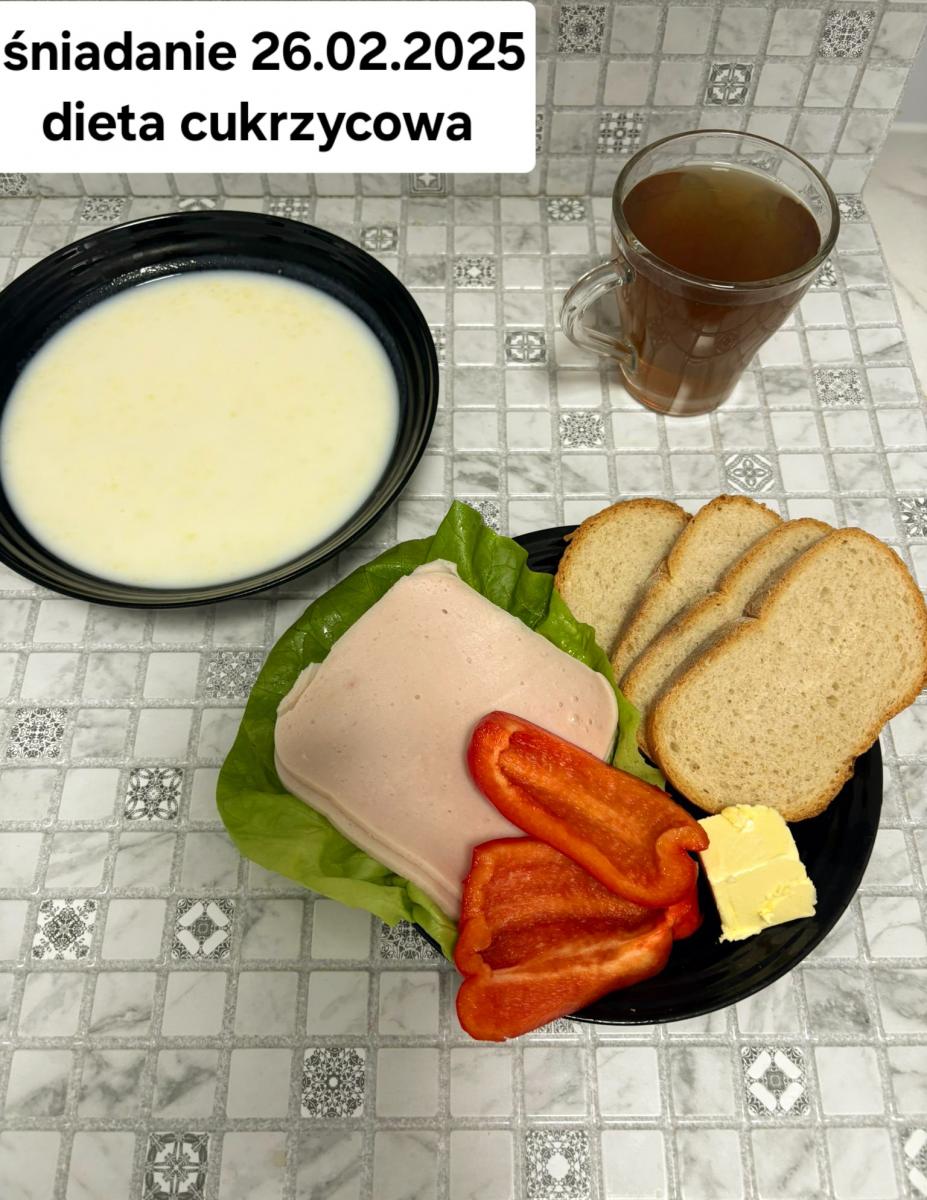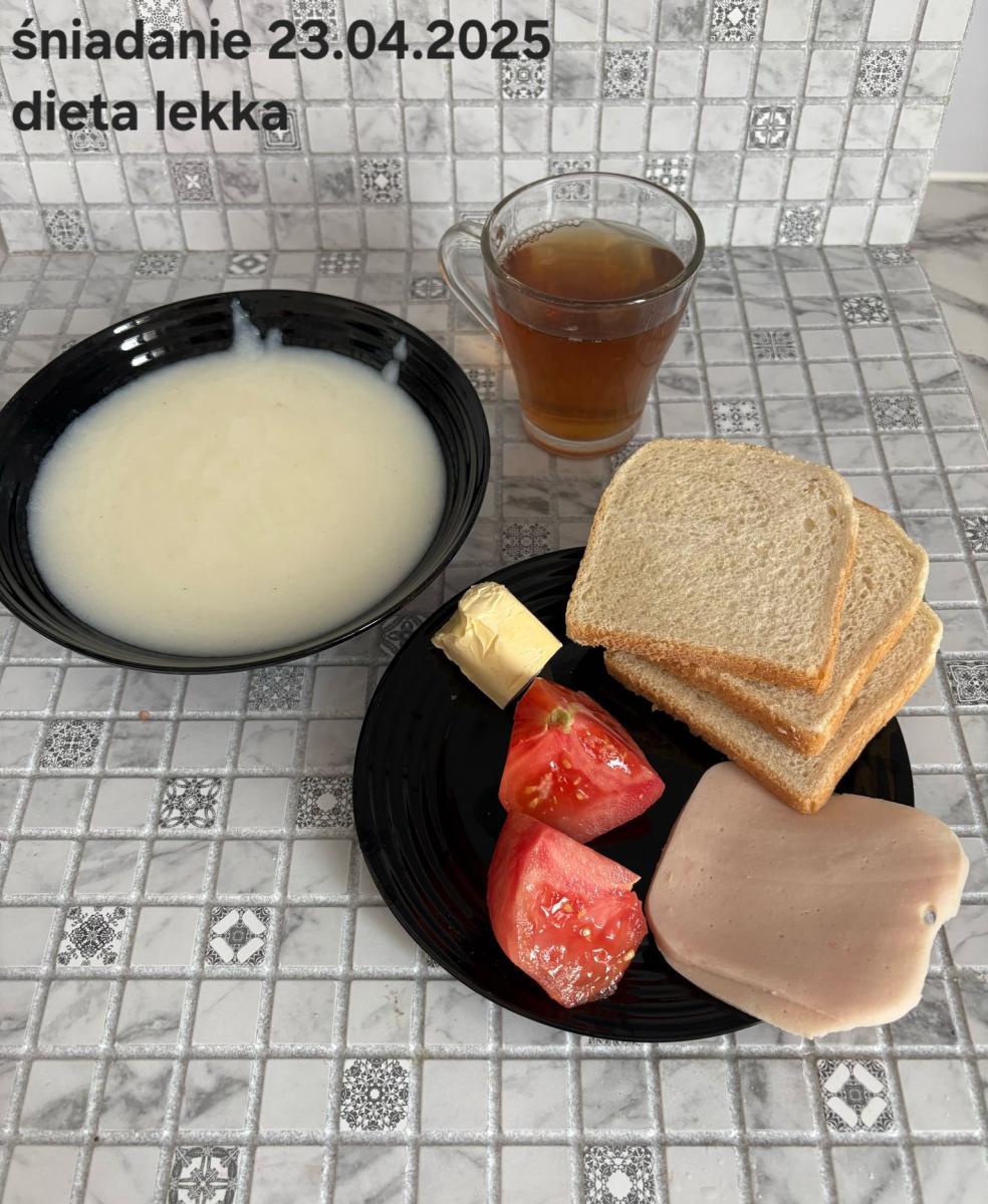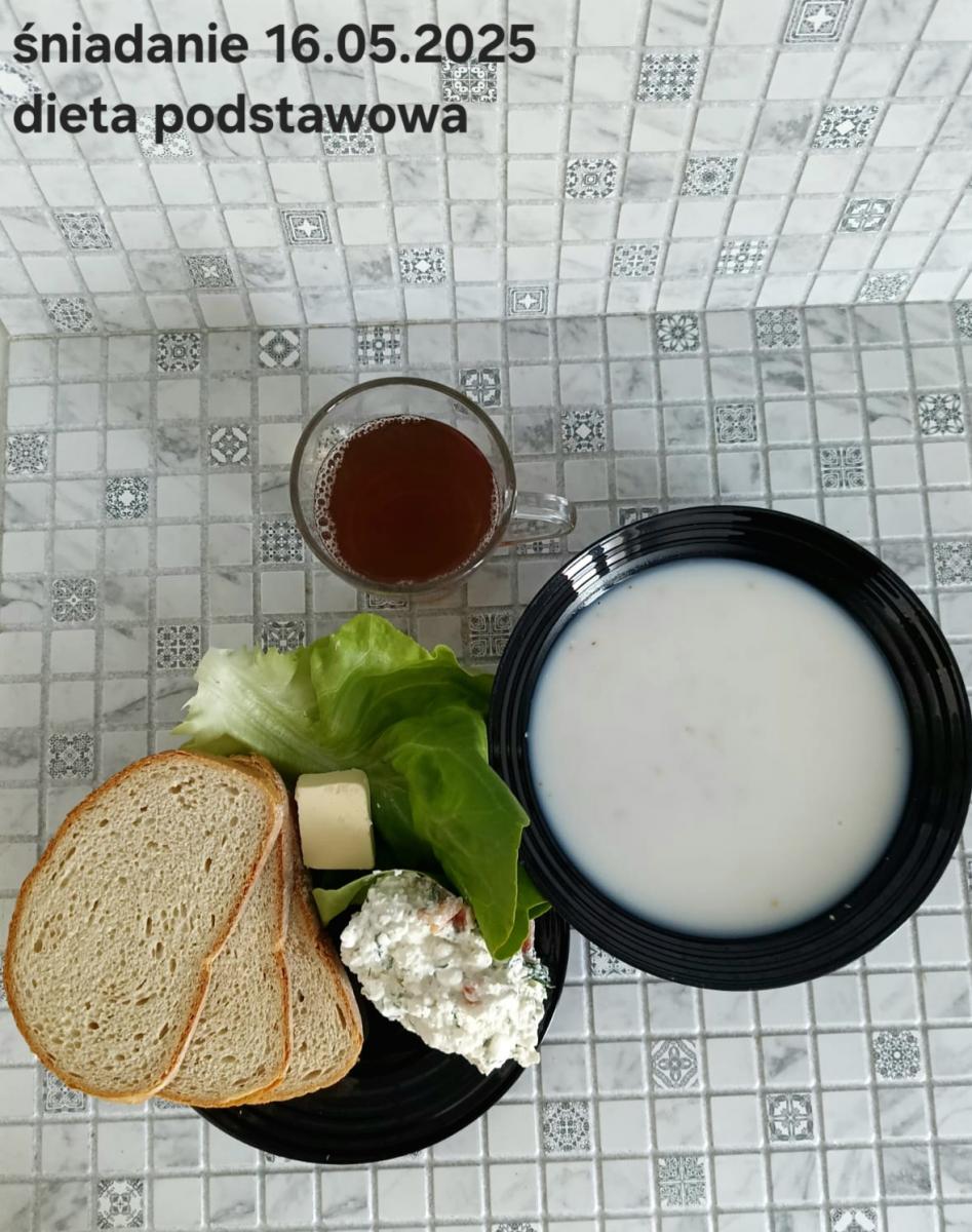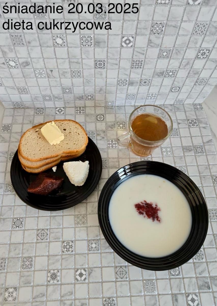 L(W,T): Zamiast masła- MARGARYNA MIĘKKA (15g) C: ZUPA MLECZNA Z PŁATKAMI OWSIANYMI(1) (50g) CHLEB ŻYTNI RAZOWY(1)- 150g Herbata bez cukru W: Dodatkowo SZYNKA DROBIOWA(1,6,9,10)- |