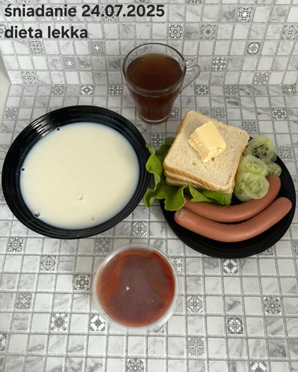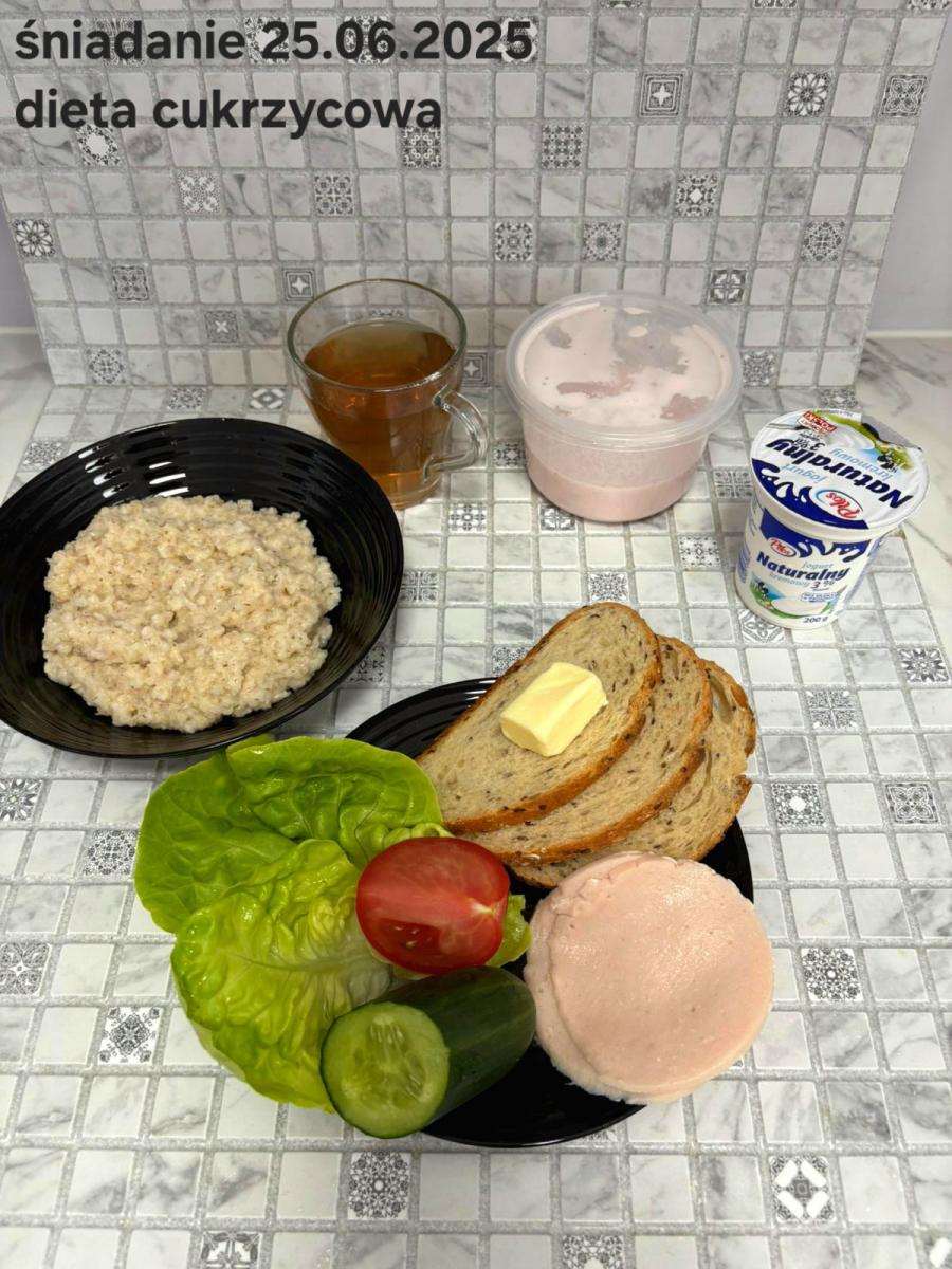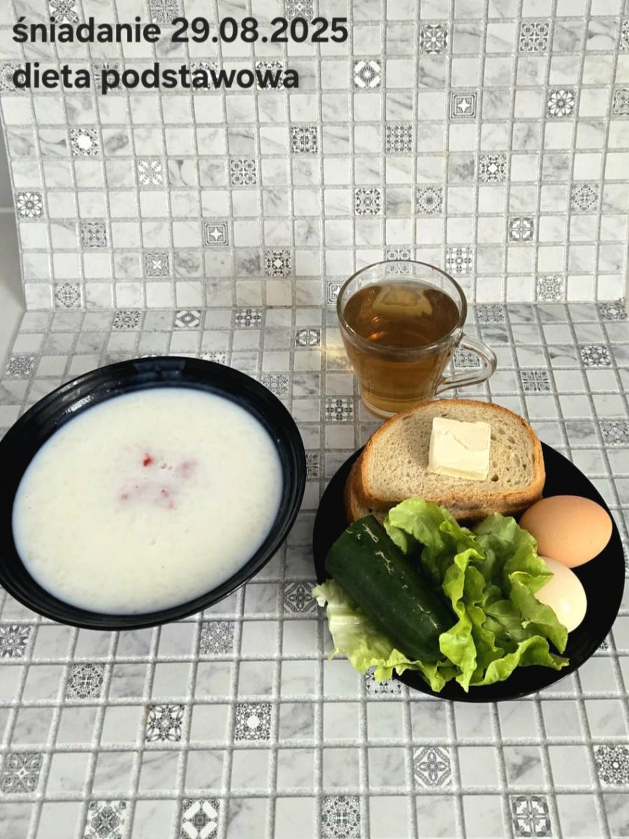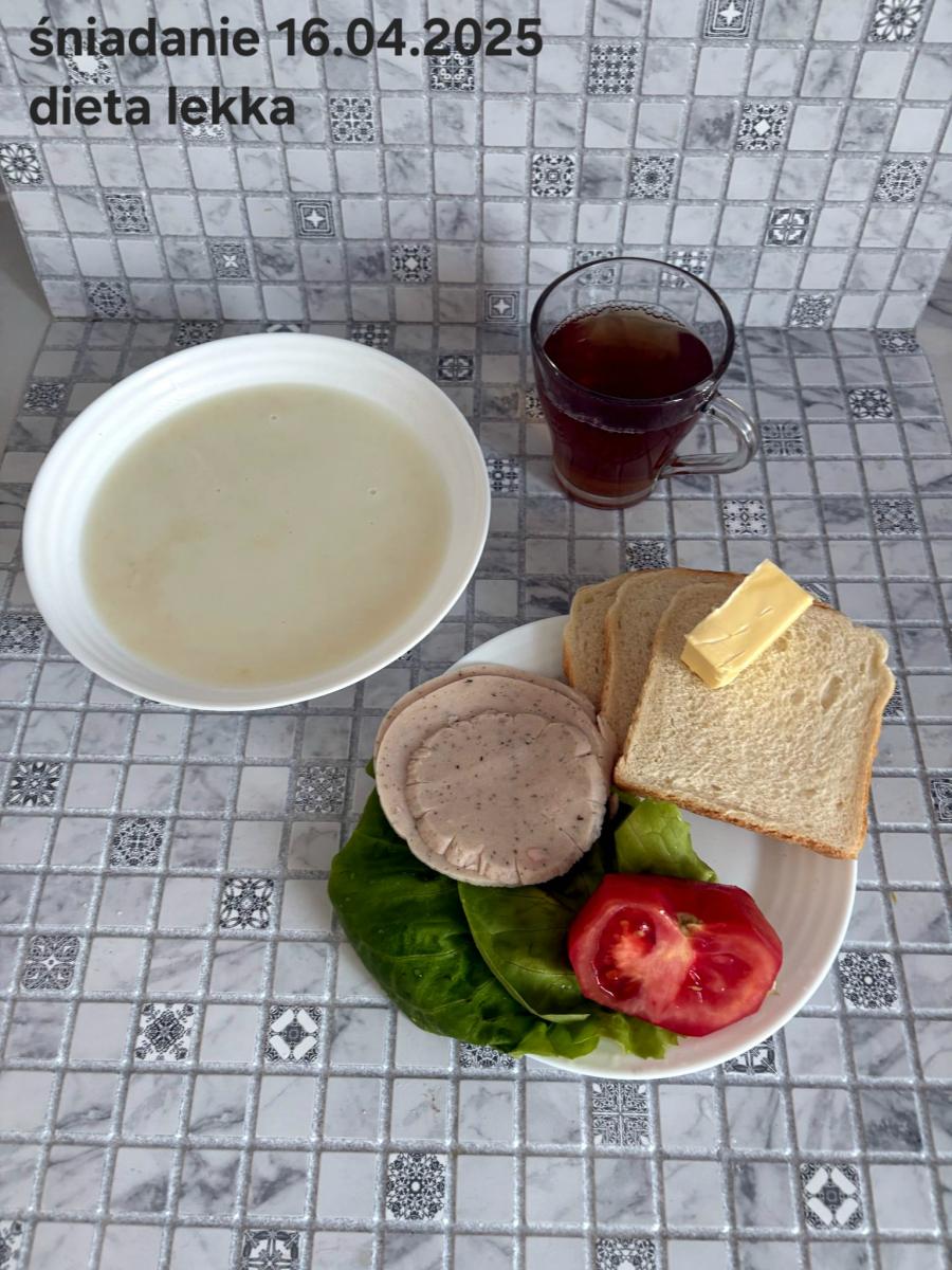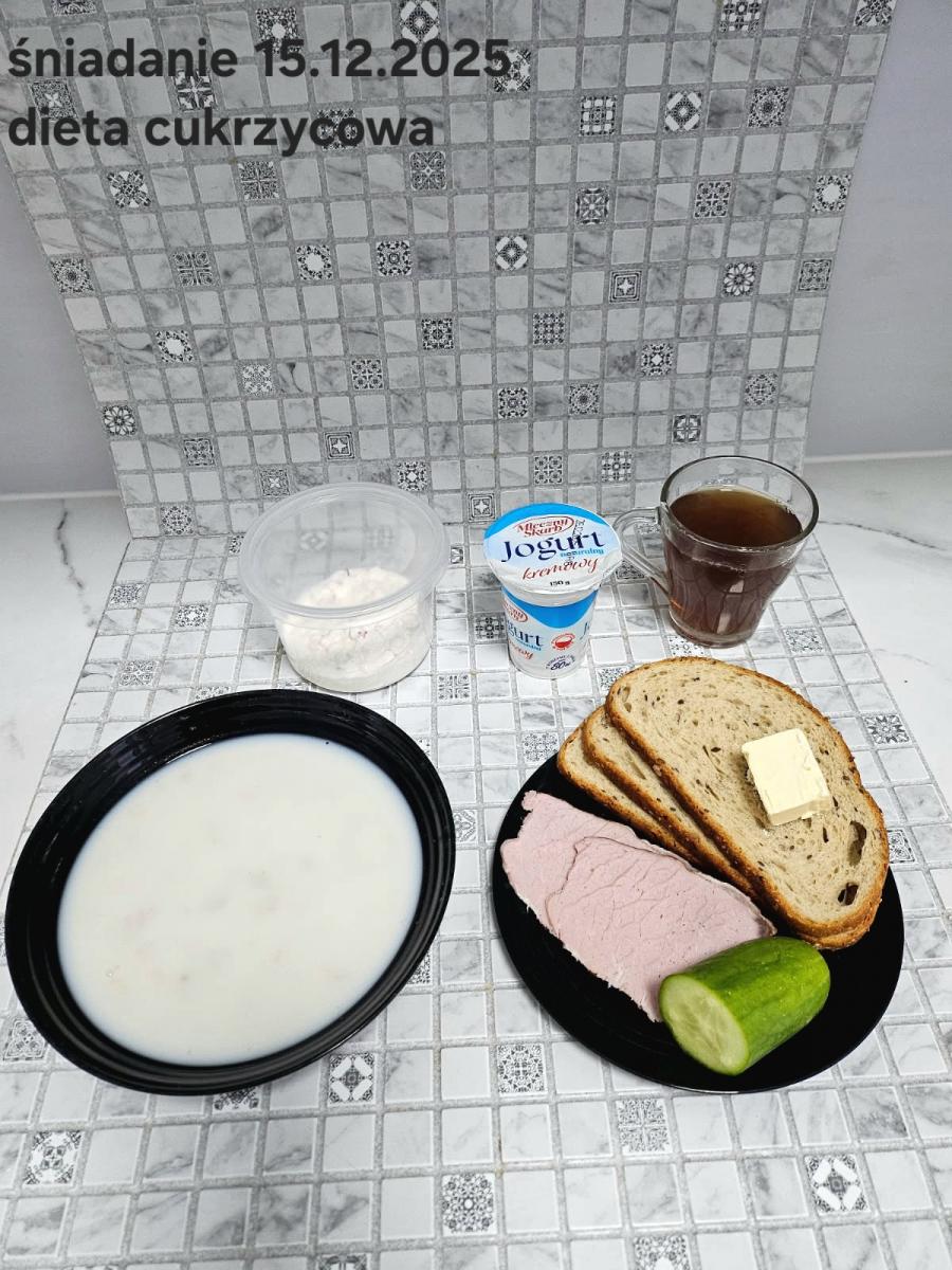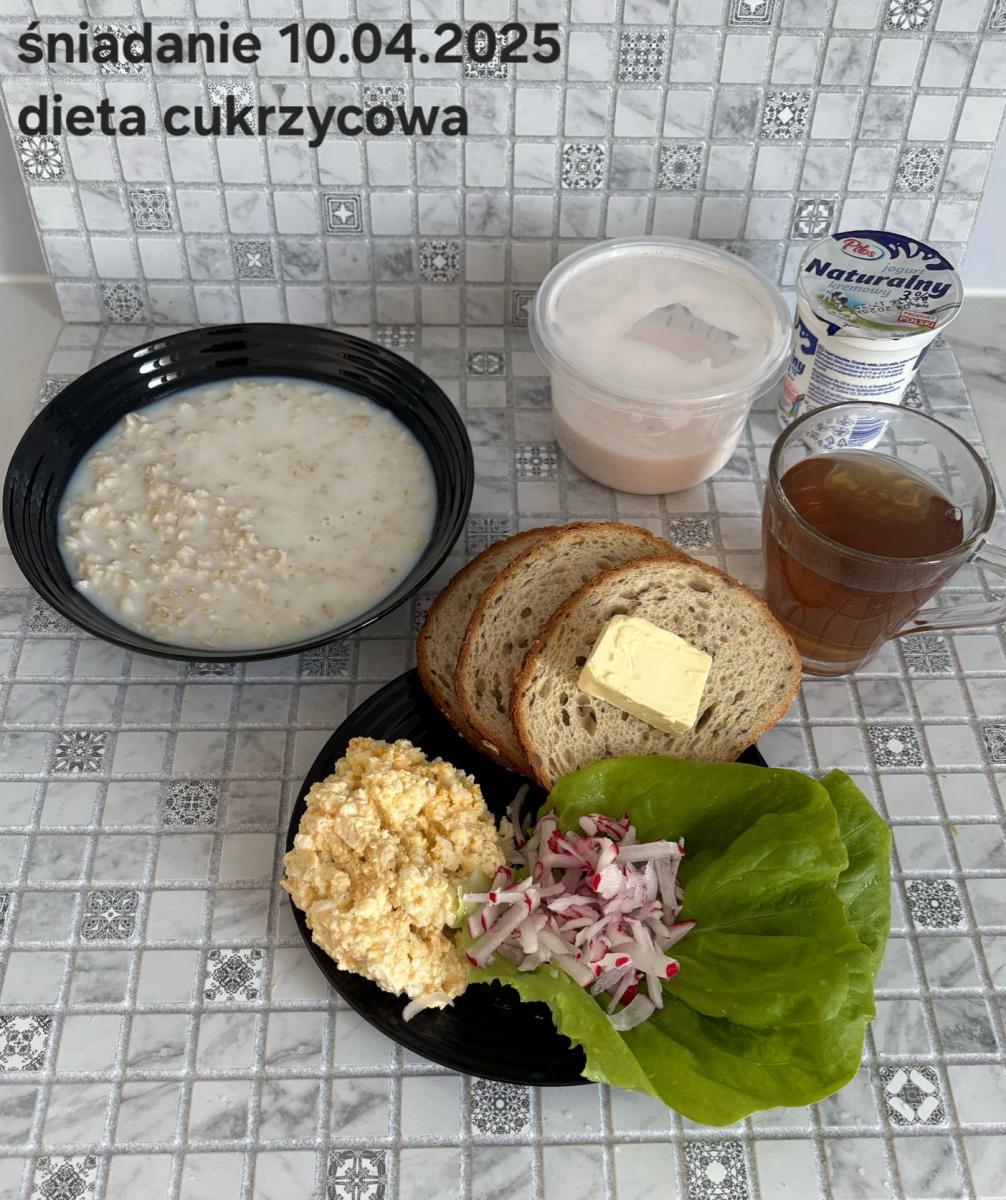 L(W,T): Zamiast masła- MARGARYNA MIĘKKA (15g) C: ZUPA MLECZNA Z PŁATKAMI OWSIANYMI(1) (50g) CHLEB ŻYTNI RAZOWY(1)- 150g Herbata bez cukru W: Dodatkowo SZYNKA DROBIOWA(1,6,9,10)- |