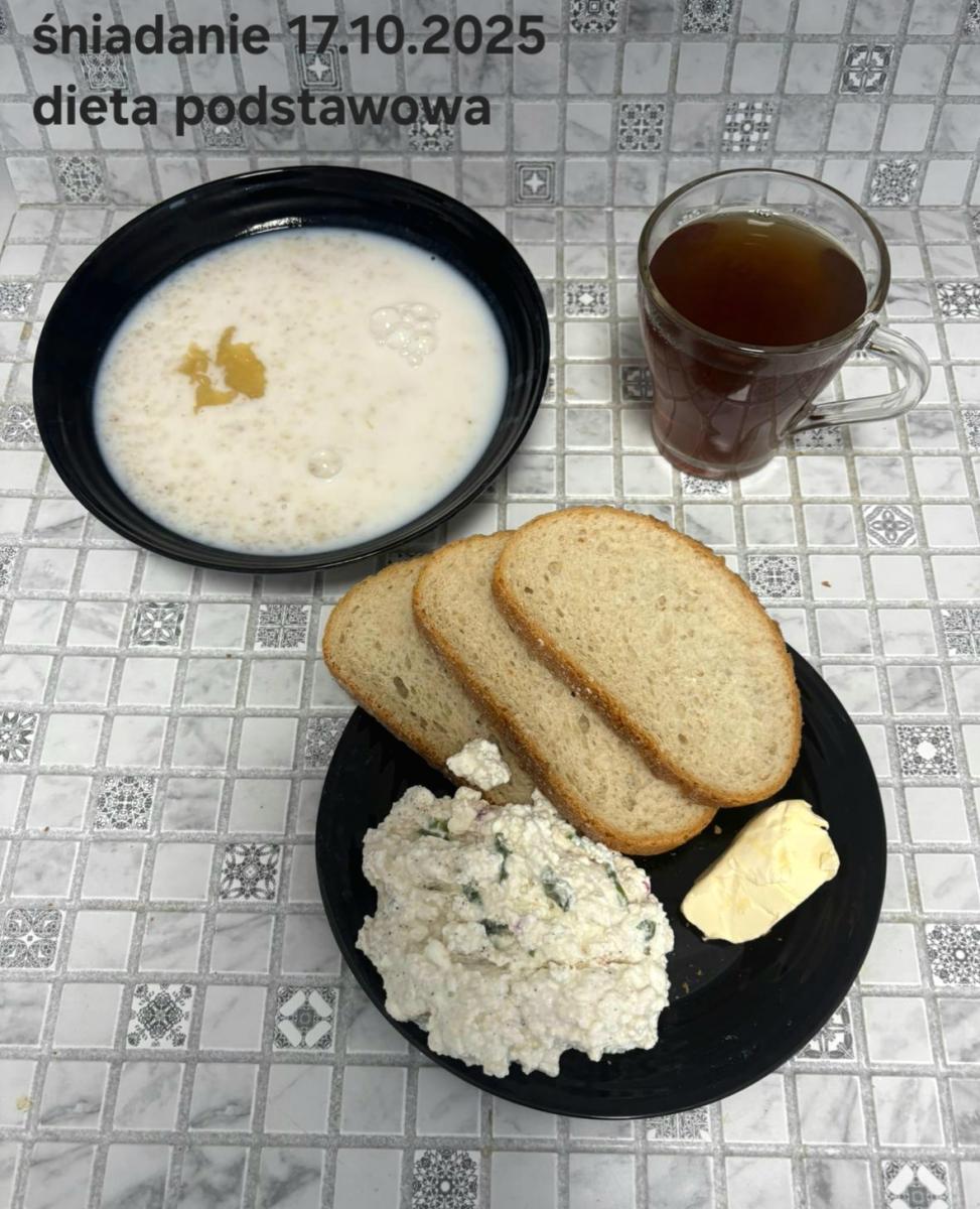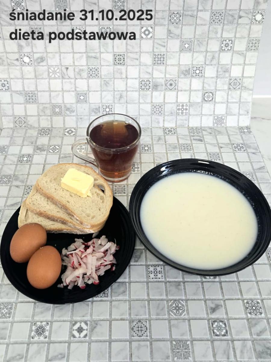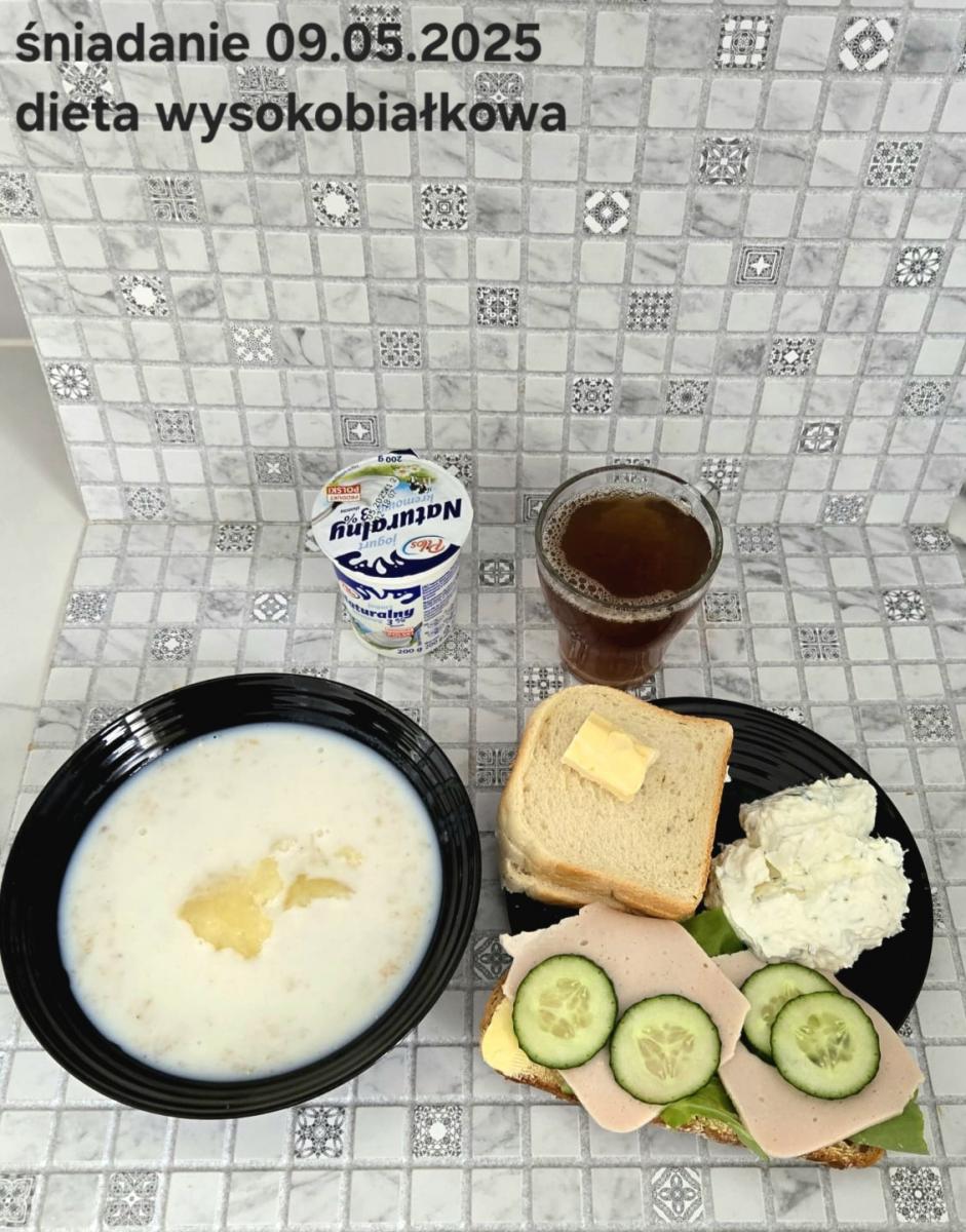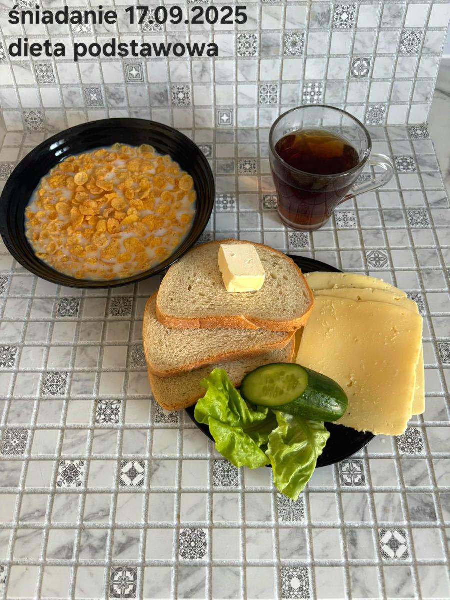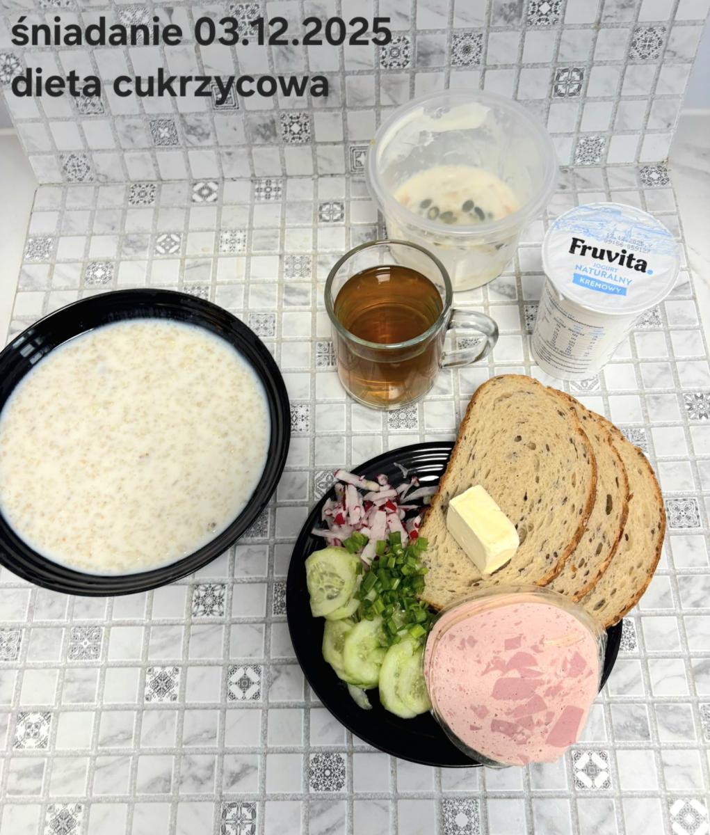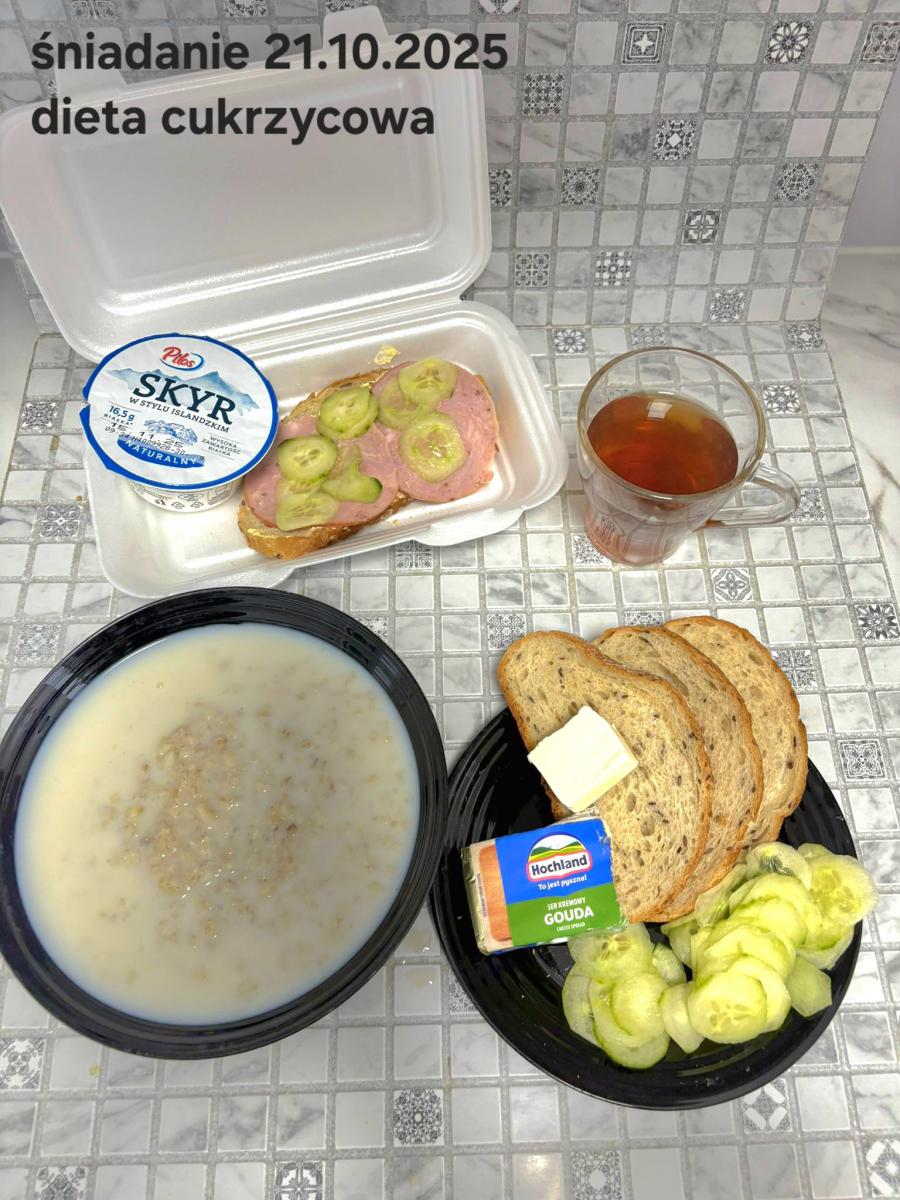 L(W,T): Zamiast masła- MARGARYNA MIĘKKA (15g) C: ZUPA MLECZNA Z PŁATKAMI OWSIANYMI(1) (50g) CHLEB ŻYTNI RAZOWY(1)- 150g Herbata bez cukru W: Dodatkowo SZYNKA DROBIOWA(1,6,9,10)- |