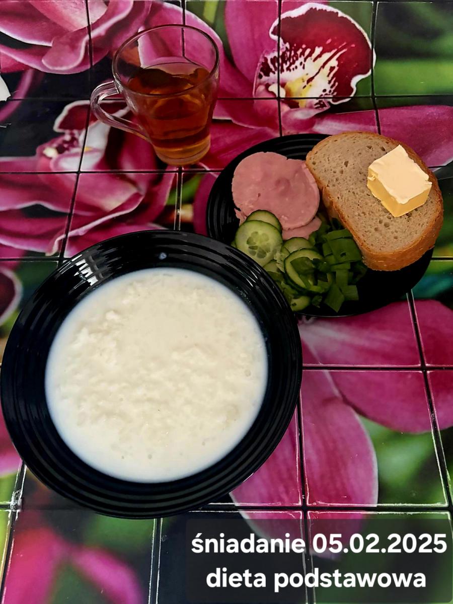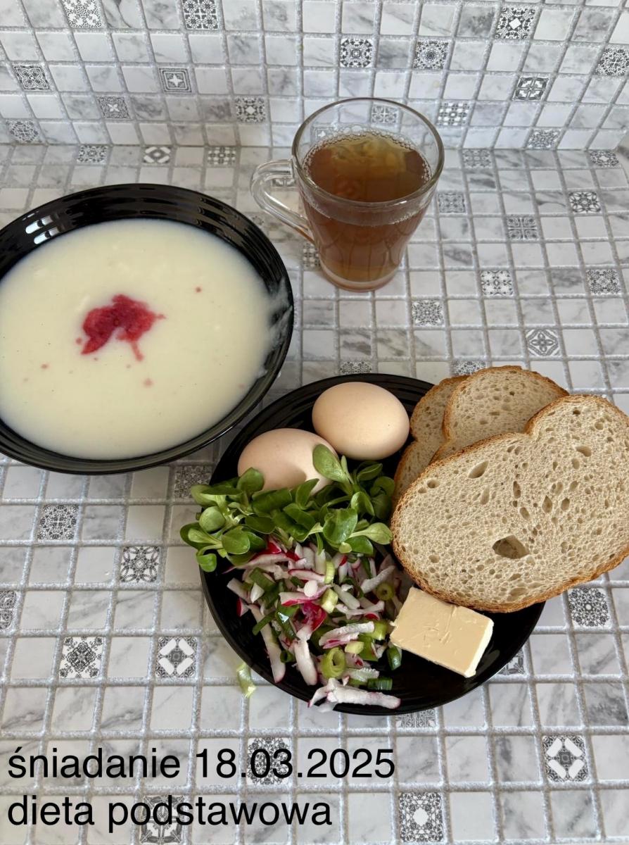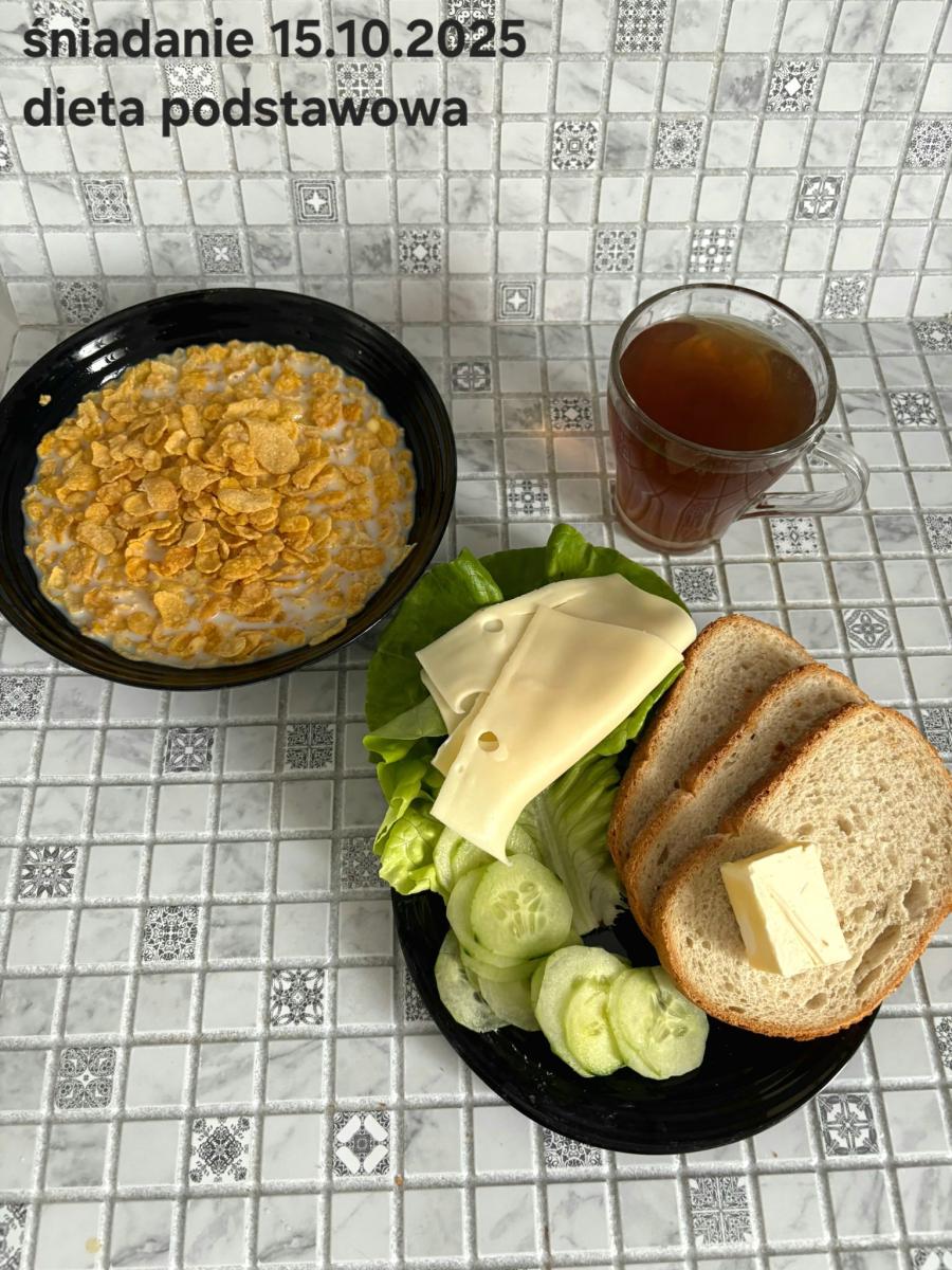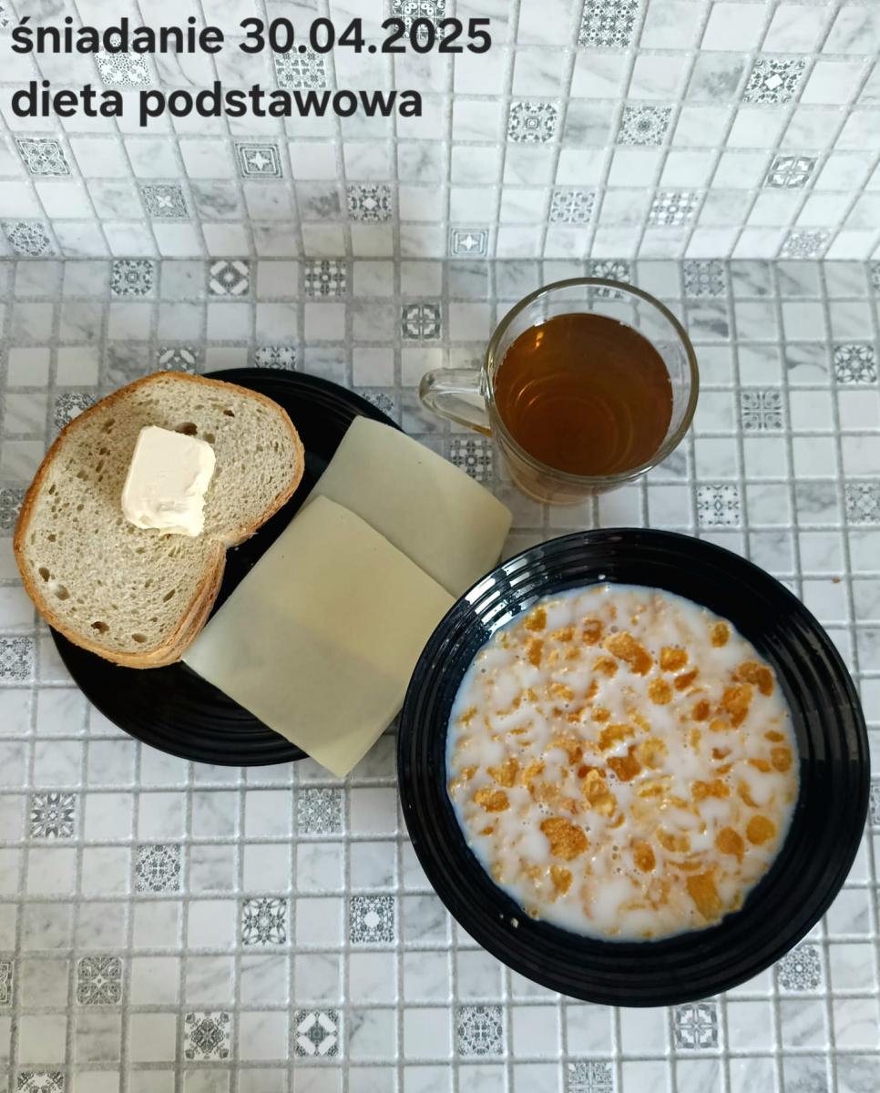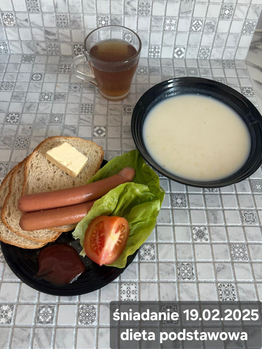L(W,T): Zamiast masła- MARGARYNA MIĘKKA (15g) C: ZUPA MLECZNA Z PŁATKAMI OWSIANYMI(1) (50g) CHLEB ŻYTNI RAZOWY(1)- 150g Herbata bez cukru W: Dodatkowo SZYNKA DROBIOWA(1,6,9,10)- |