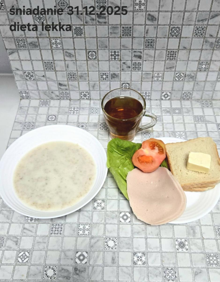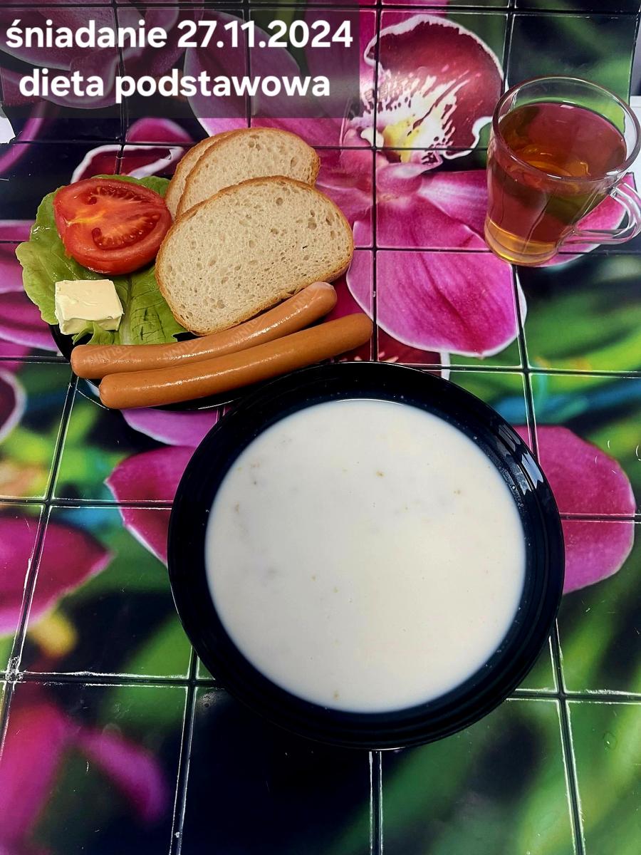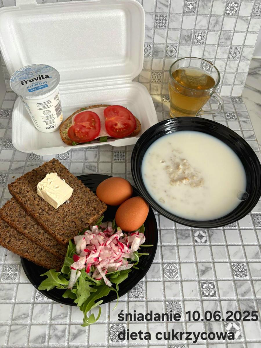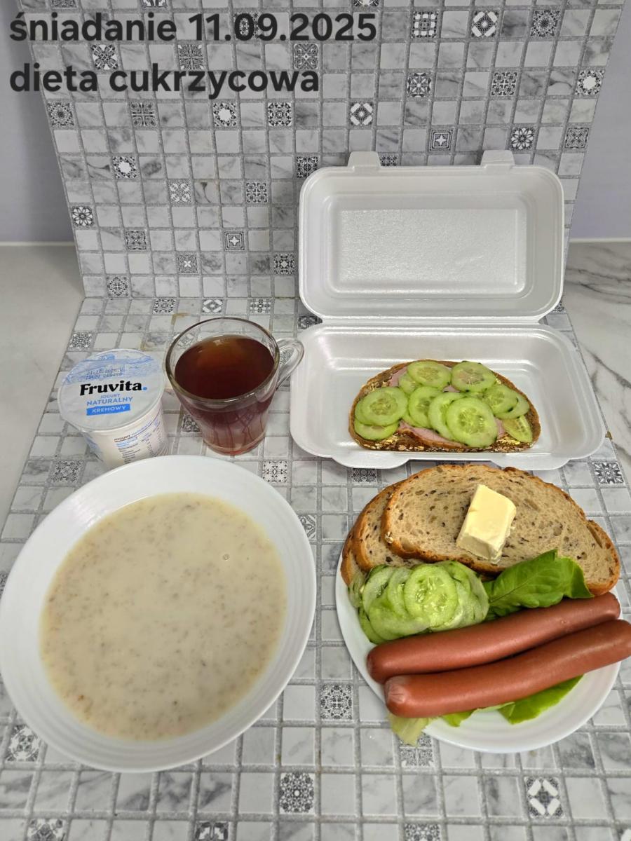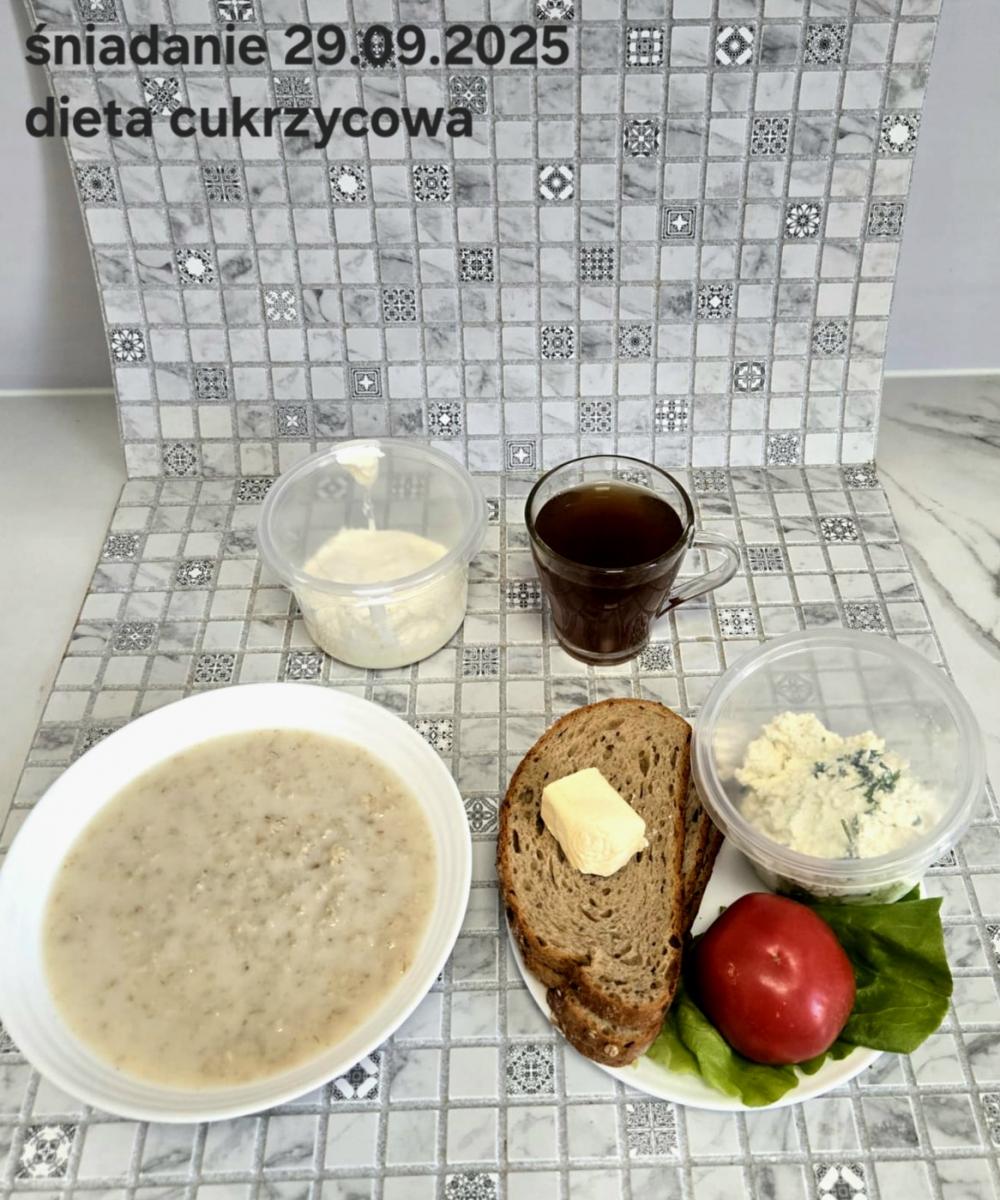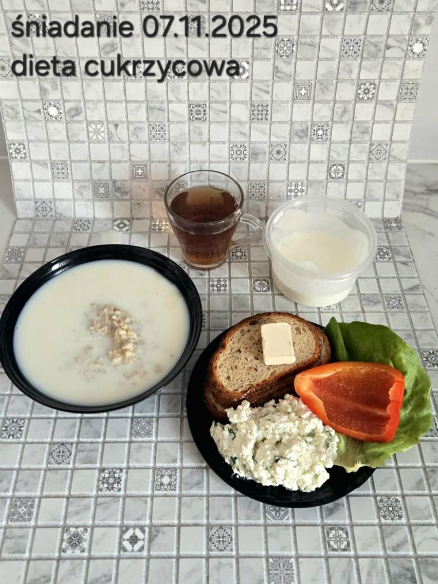 L(W,T): Zamiast masła- MARGARYNA MIĘKKA (15g) C: ZUPA MLECZNA Z PŁATKAMI OWSIANYMI(1) (50g) CHLEB ŻYTNI RAZOWY(1)- 150g Herbata bez cukru W: Dodatkowo SZYNKA DROBIOWA(1,6,9,10)- |