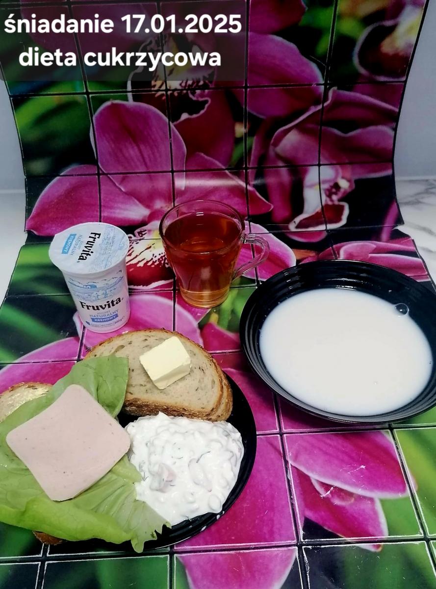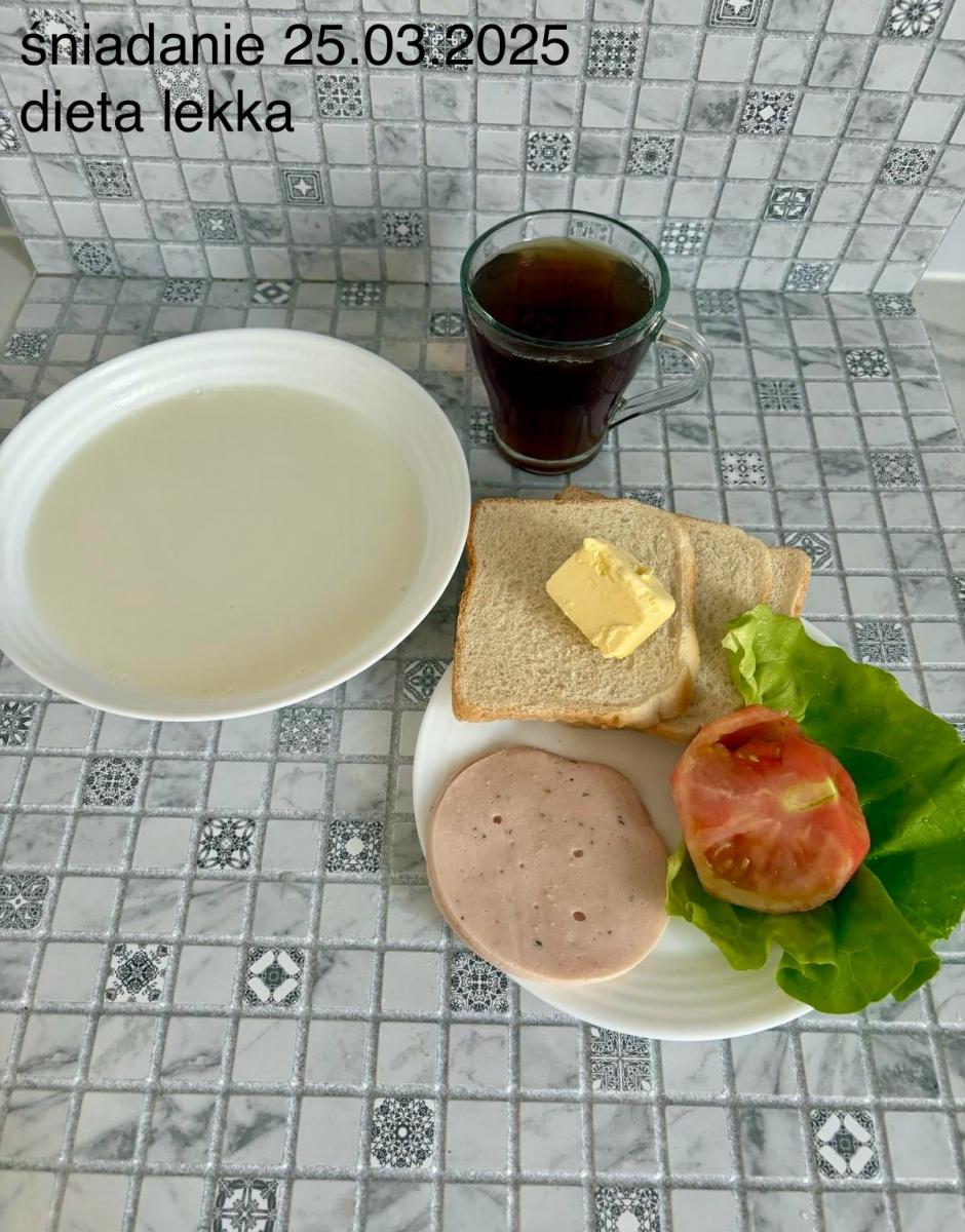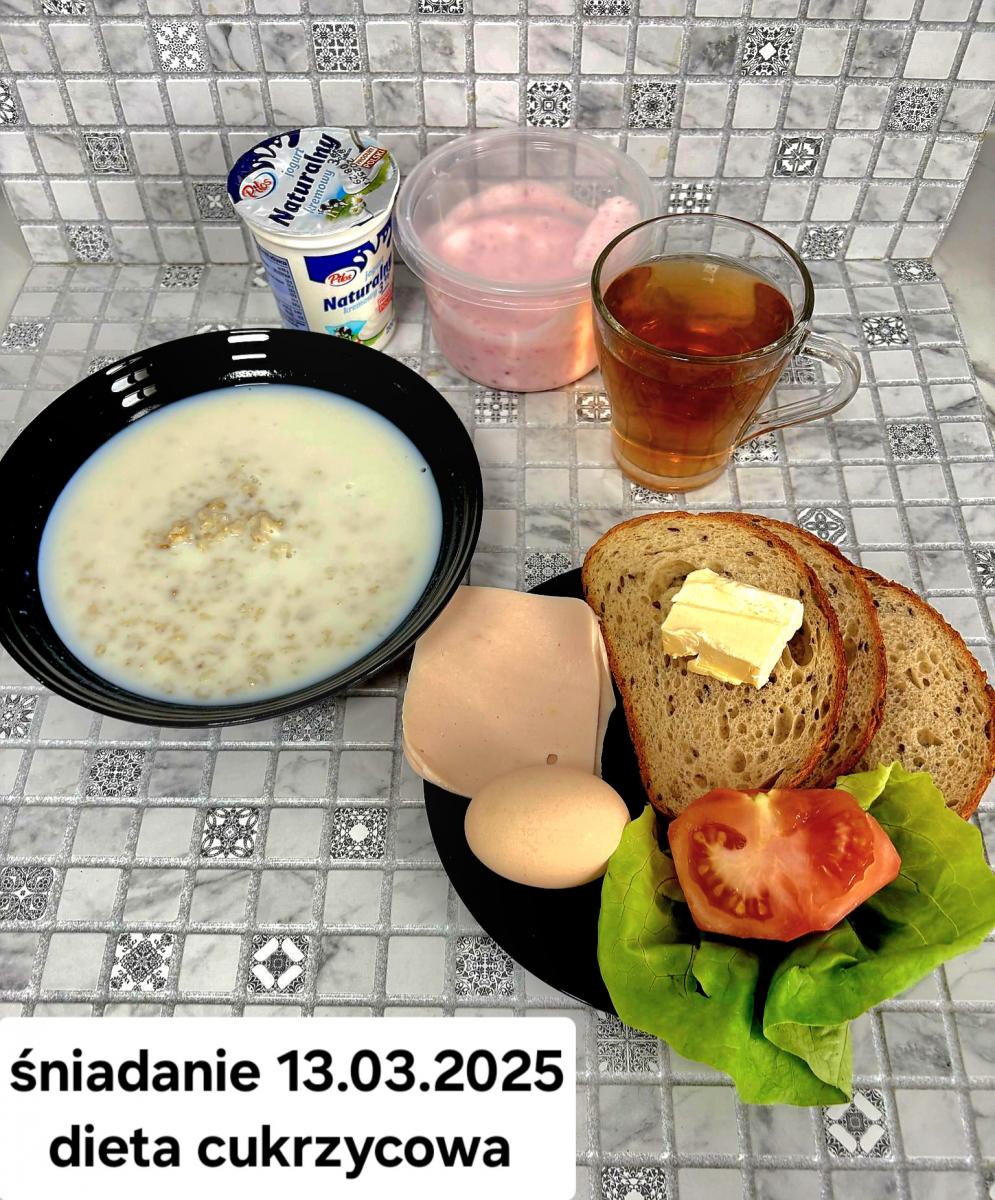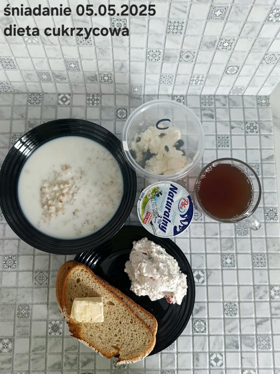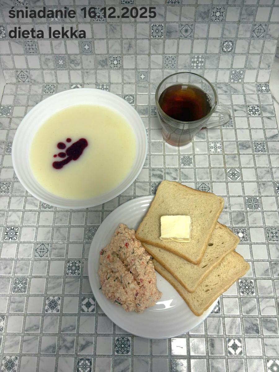 L(W,T): Zamiast masła- MARGARYNA MIĘKKA (15g) C: ZUPA MLECZNA Z PŁATKAMI OWSIANYMI(1) (50g) CHLEB ŻYTNI RAZOWY(1)- 150g Herbata bez cukru W: Dodatkowo SZYNKA DROBIOWA(1,6,9,10)- |