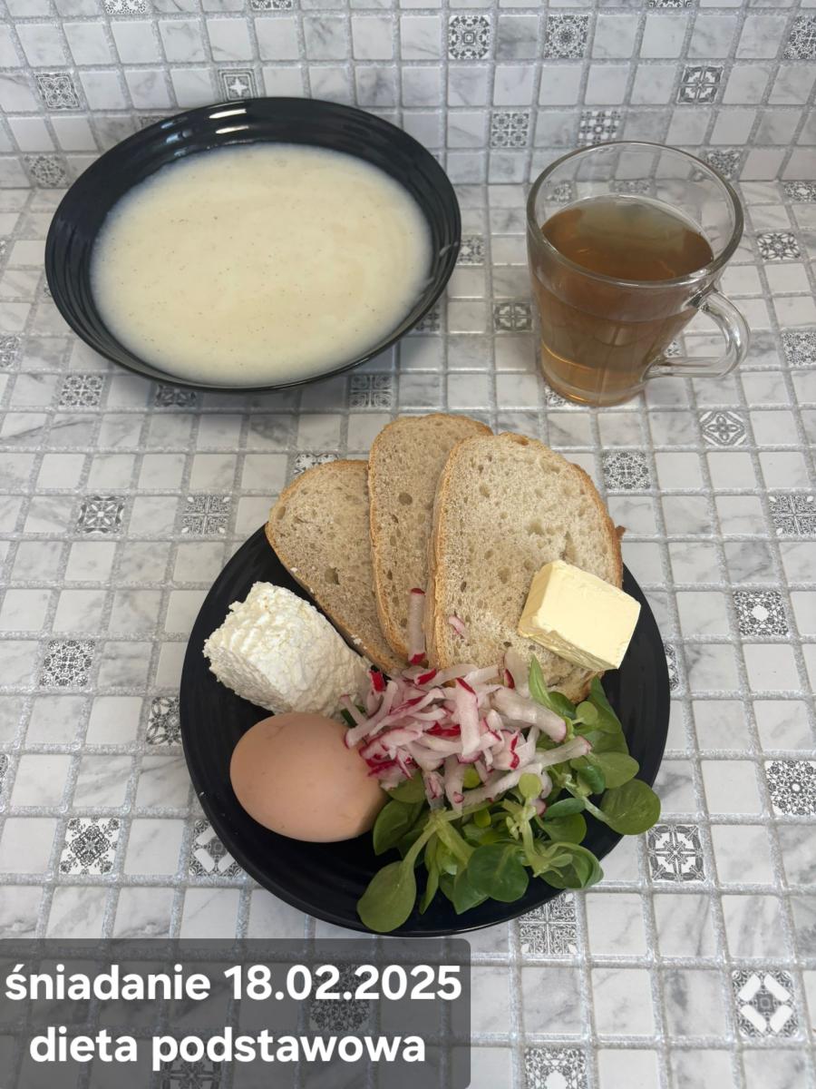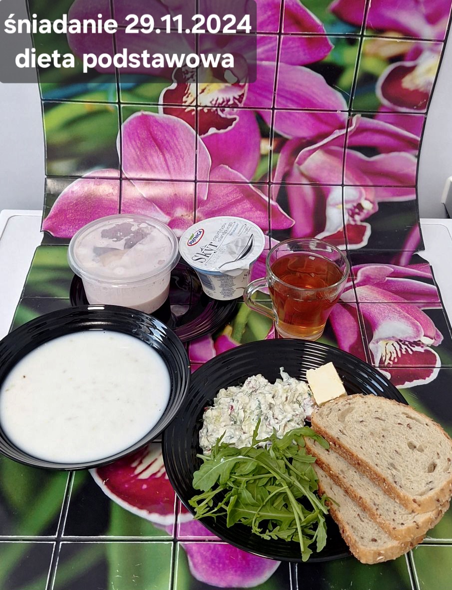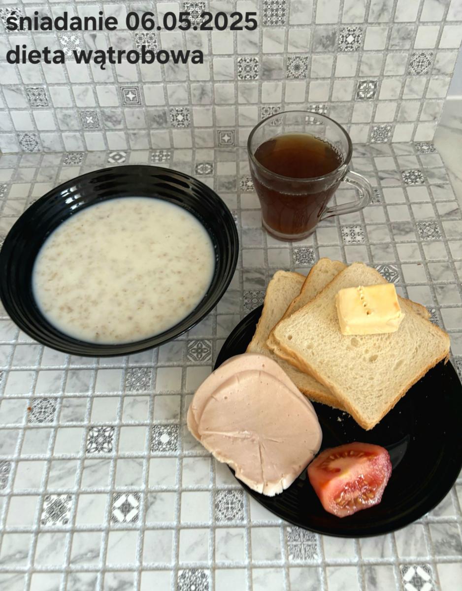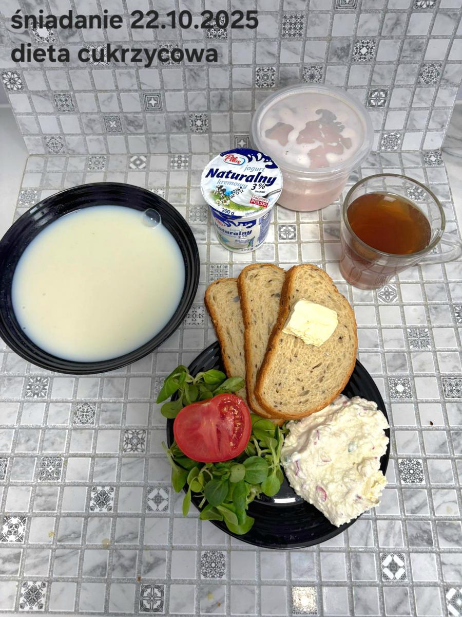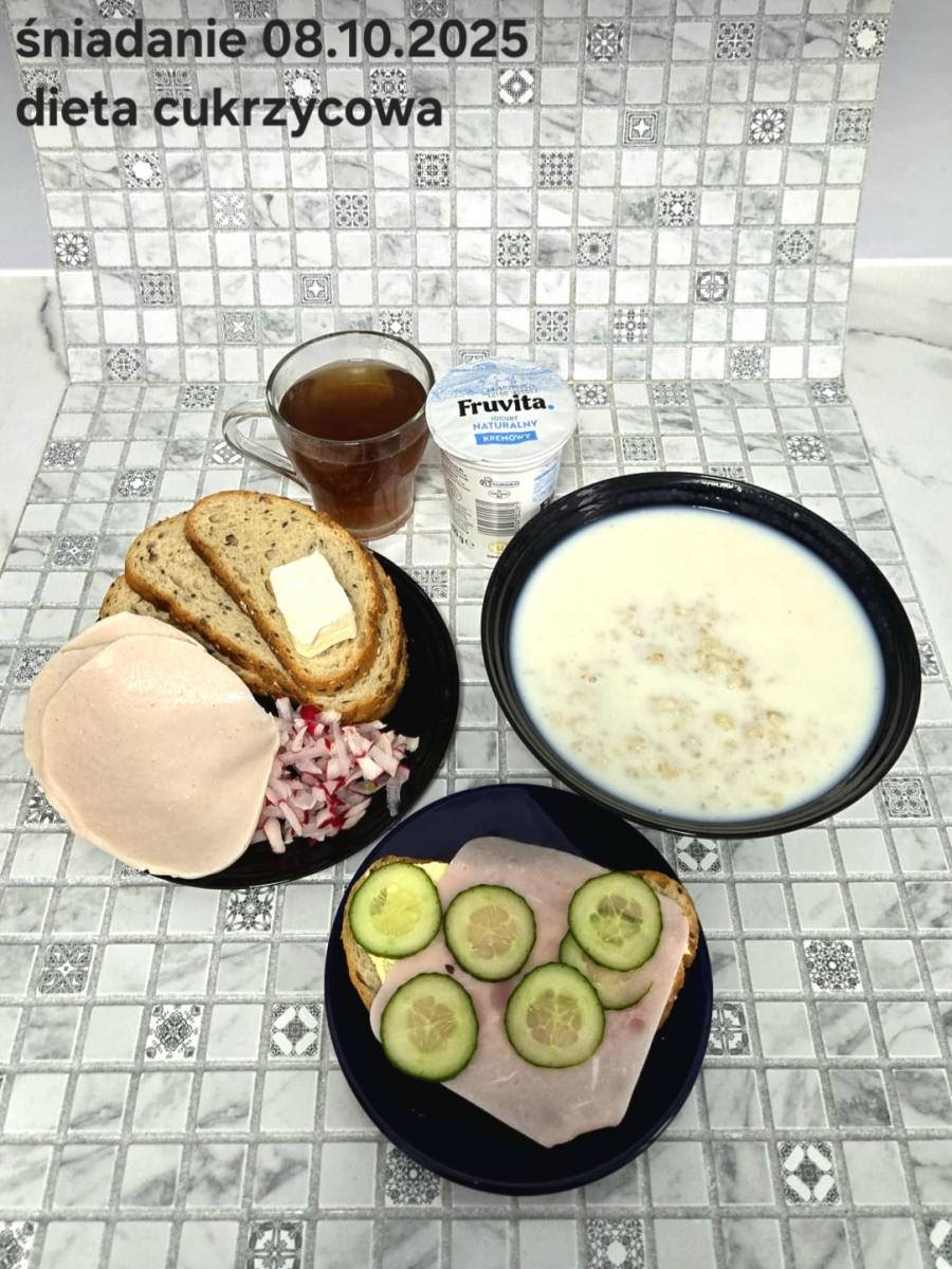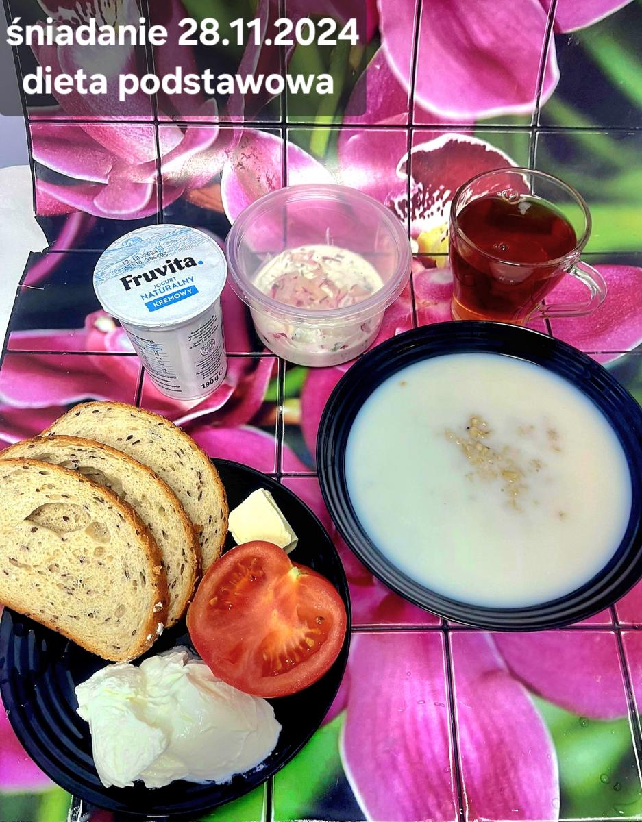 L(W,T): Zamiast masła- MARGARYNA MIĘKKA (15g) C: ZUPA MLECZNA Z PŁATKAMI OWSIANYMI(1) (50g) CHLEB ŻYTNI RAZOWY(1)- 150g Herbata bez cukru W: Dodatkowo SZYNKA DROBIOWA(1,6,9,10)- |