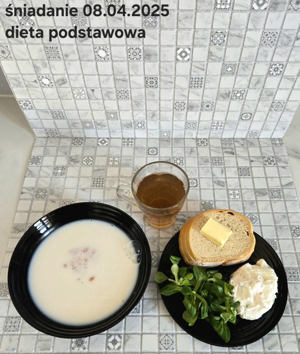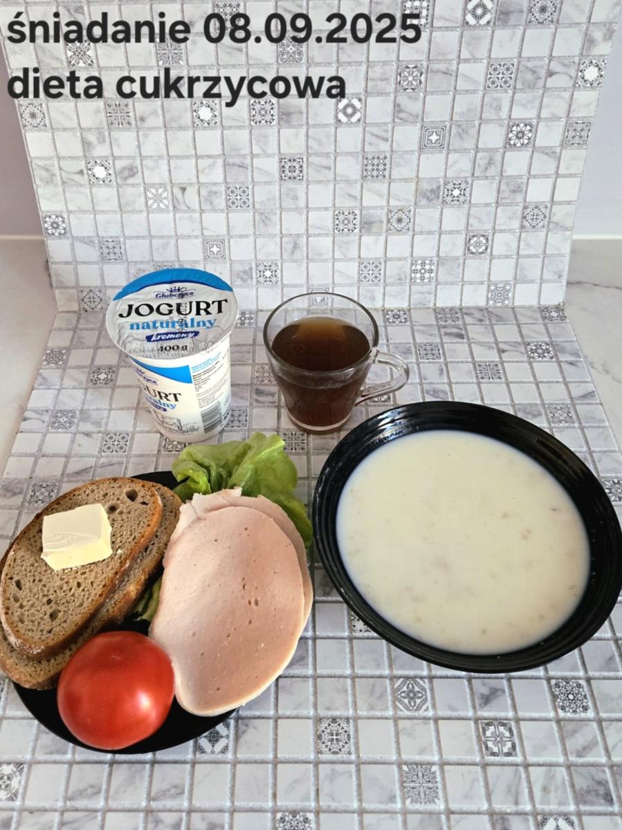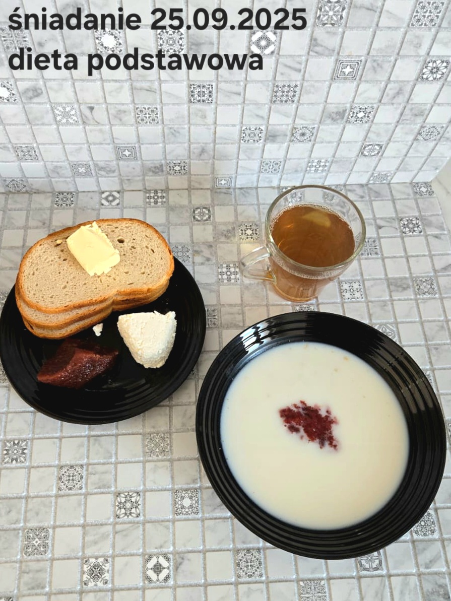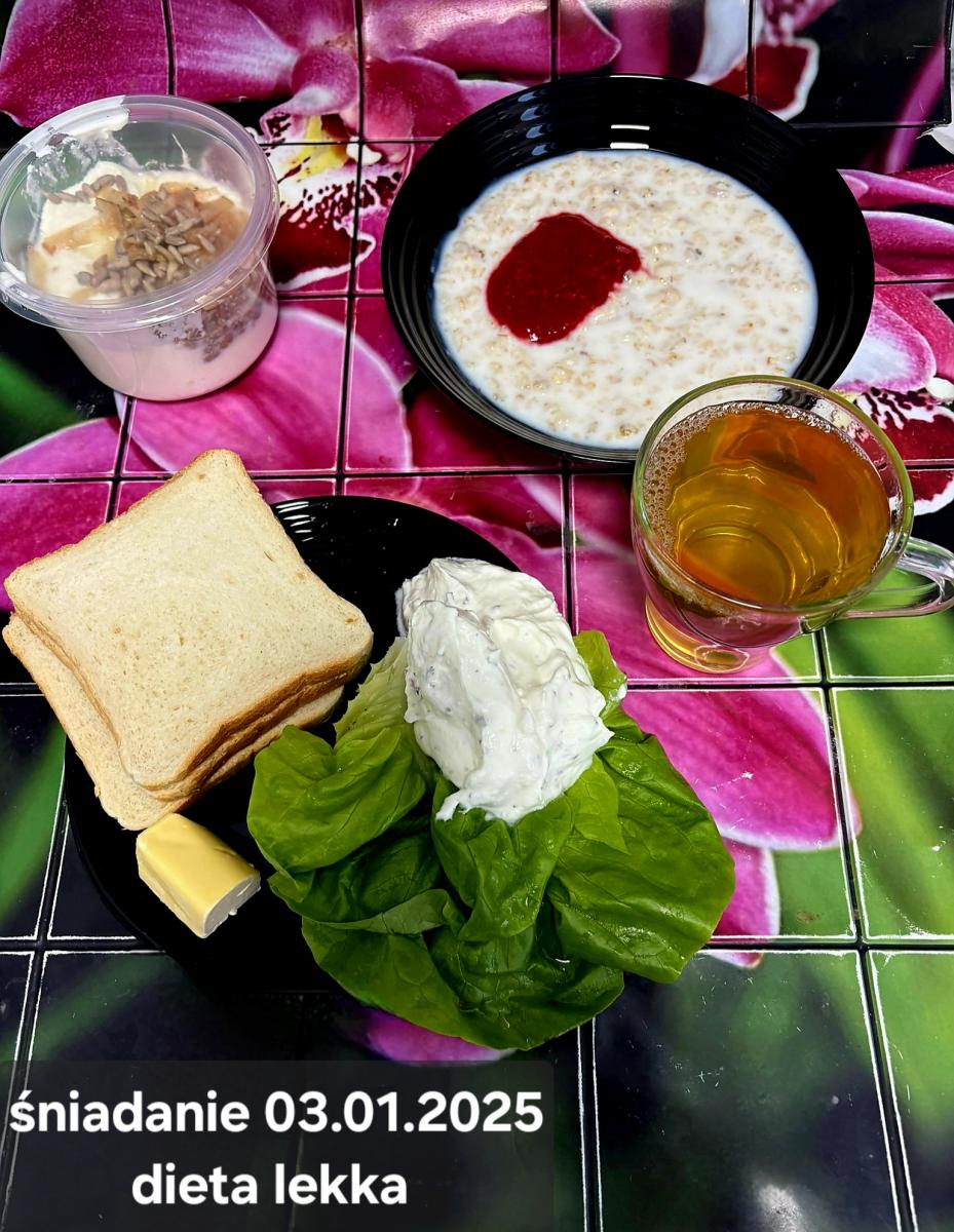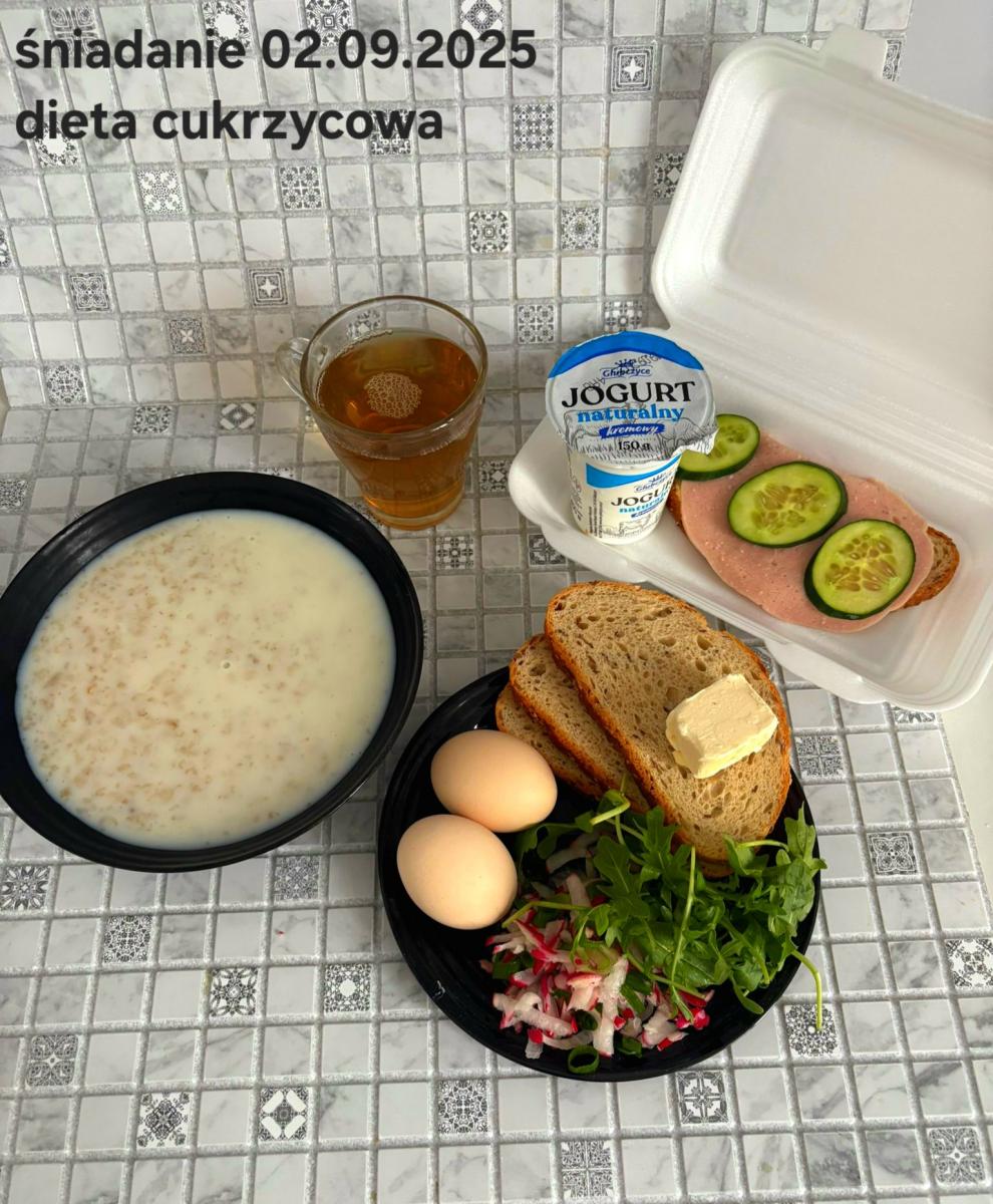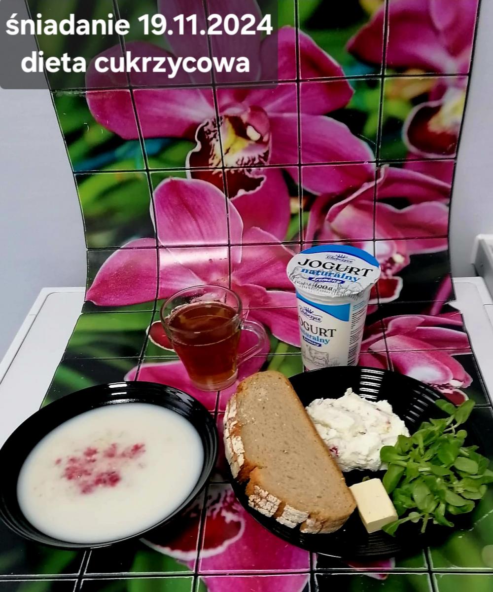 L(W,T): Zamiast masła- MARGARYNA MIĘKKA (15g) C: ZUPA MLECZNA Z PŁATKAMI OWSIANYMI(1) (50g) CHLEB ŻYTNI RAZOWY(1)- 150g Herbata bez cukru W: Dodatkowo SZYNKA DROBIOWA(1,6,9,10)- |