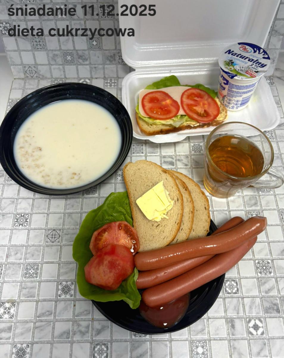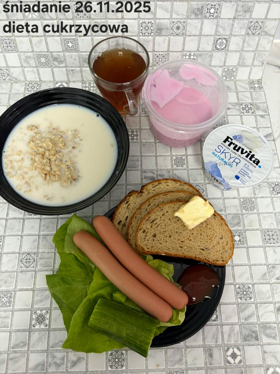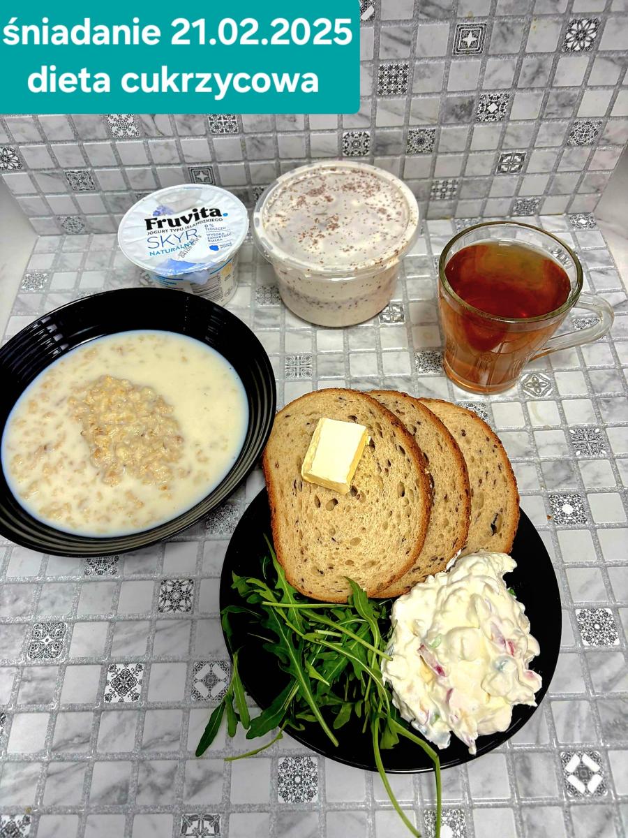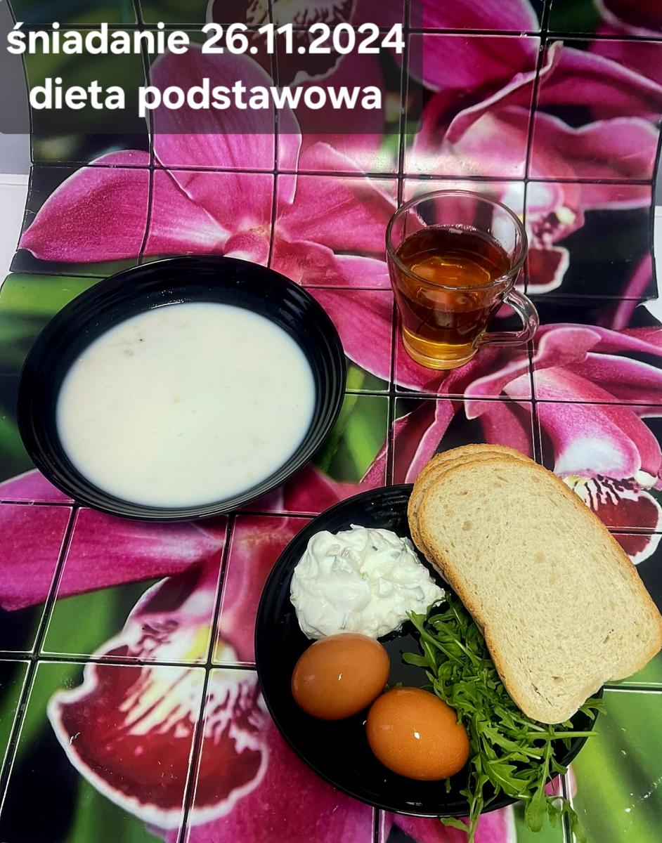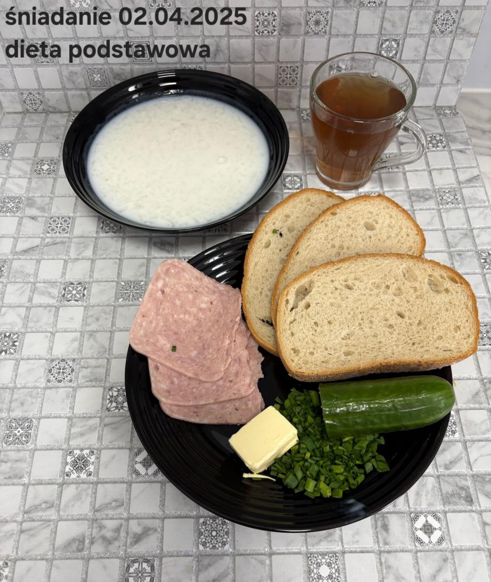 L(W,T): Zamiast masła- MARGARYNA MIĘKKA (15g) C: ZUPA MLECZNA Z PŁATKAMI OWSIANYMI(1) (50g) CHLEB ŻYTNI RAZOWY(1)- 150g Herbata bez cukru W: Dodatkowo SZYNKA DROBIOWA(1,6,9,10)- |