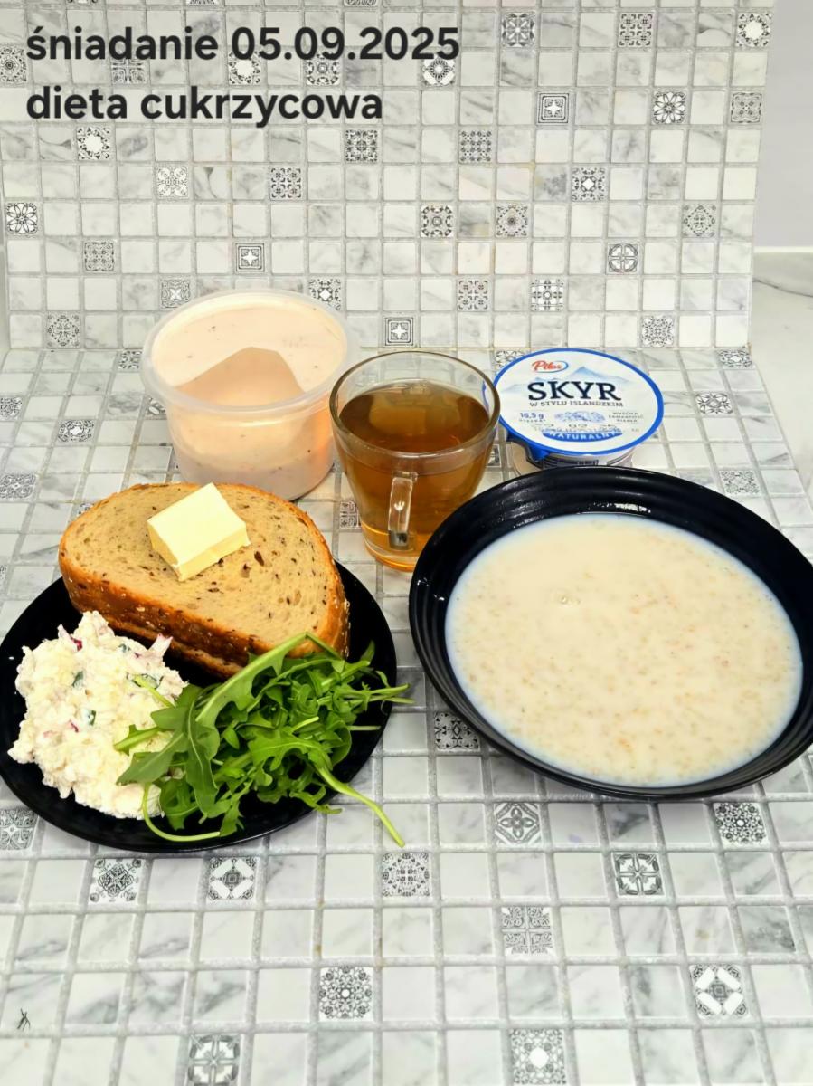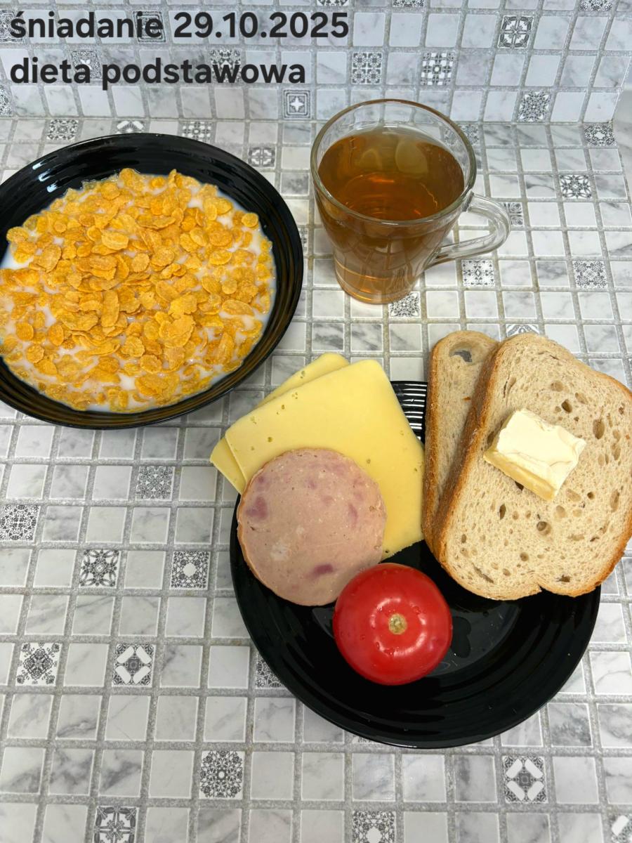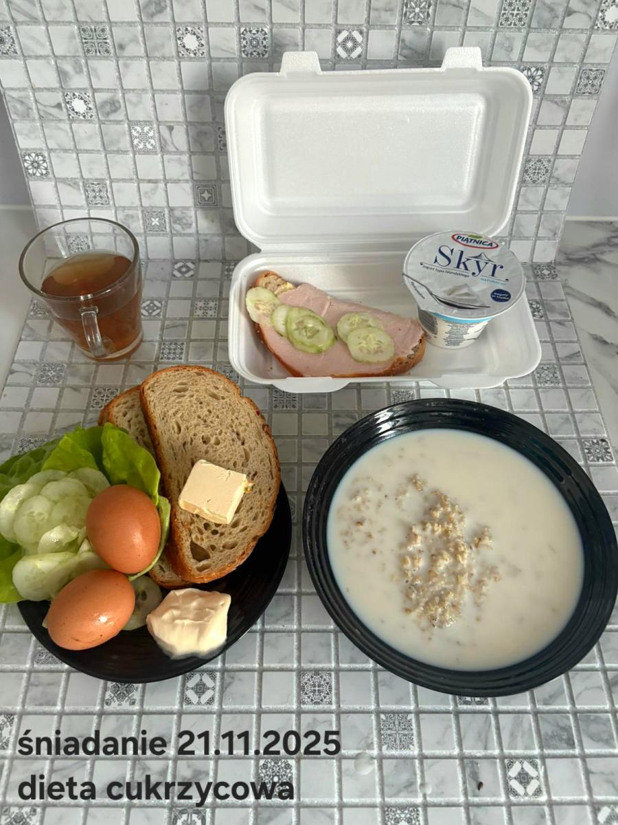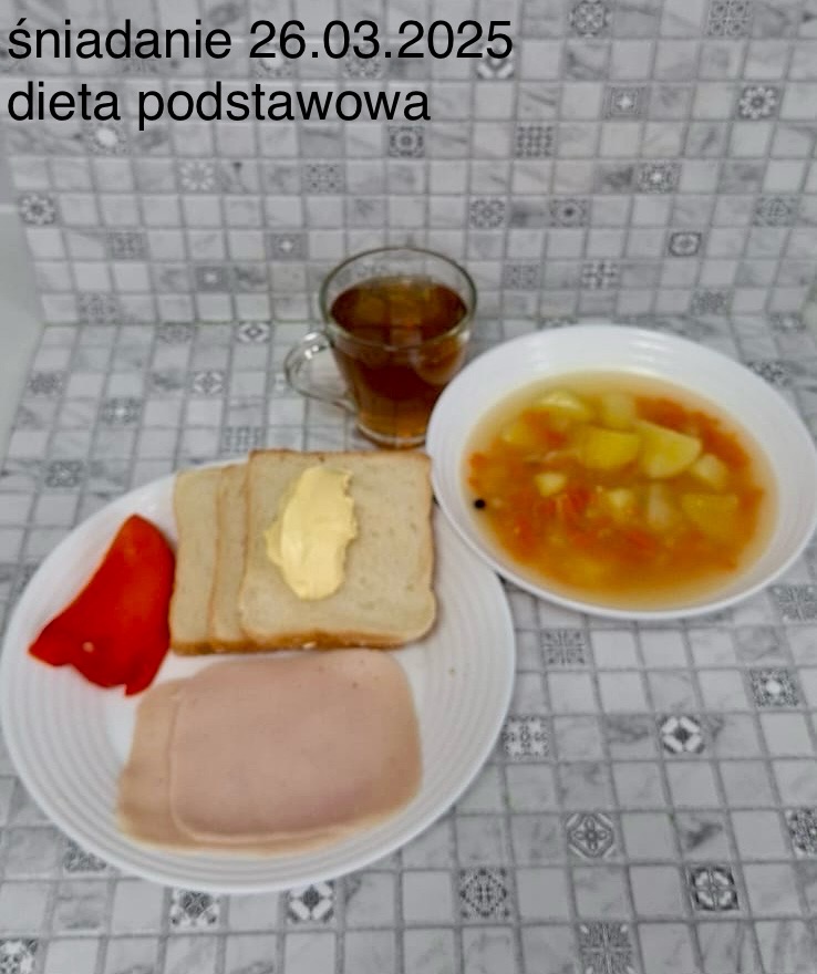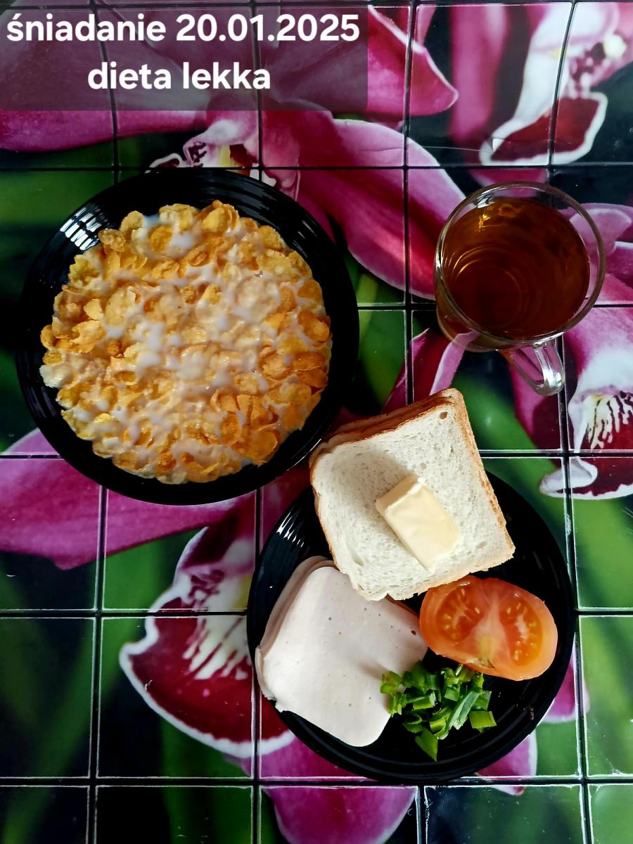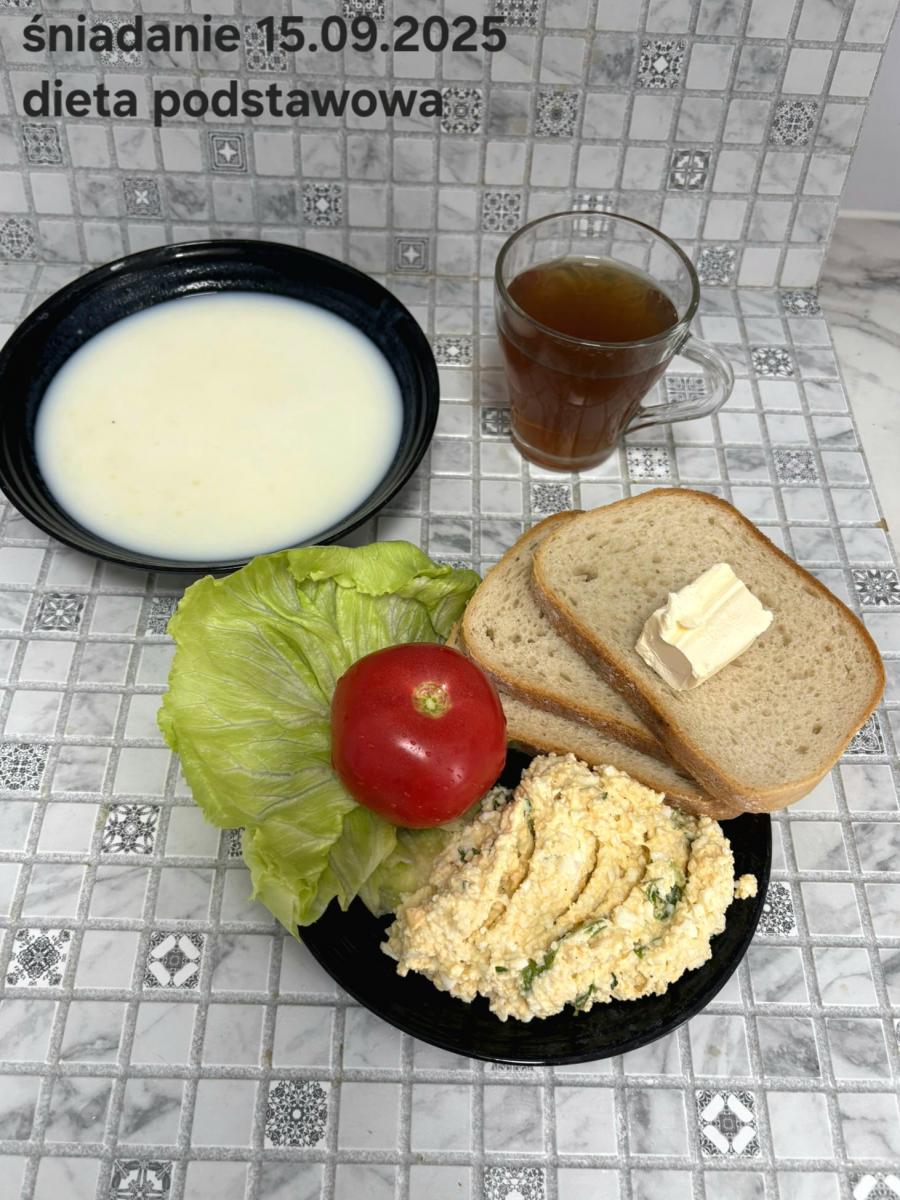 L(W,T): Zamiast masła- MARGARYNA MIĘKKA (15g) C: ZUPA MLECZNA Z PŁATKAMI OWSIANYMI(1) (50g) CHLEB ŻYTNI RAZOWY(1)- 150g Herbata bez cukru W: Dodatkowo SZYNKA DROBIOWA(1,6,9,10)- |