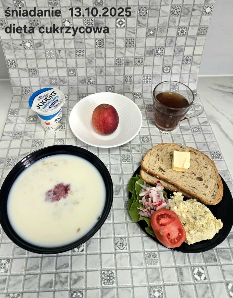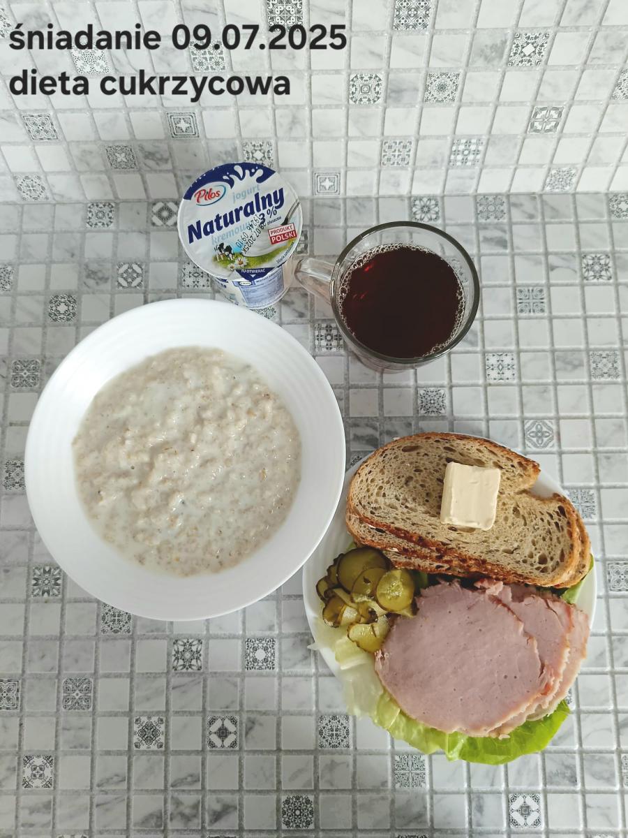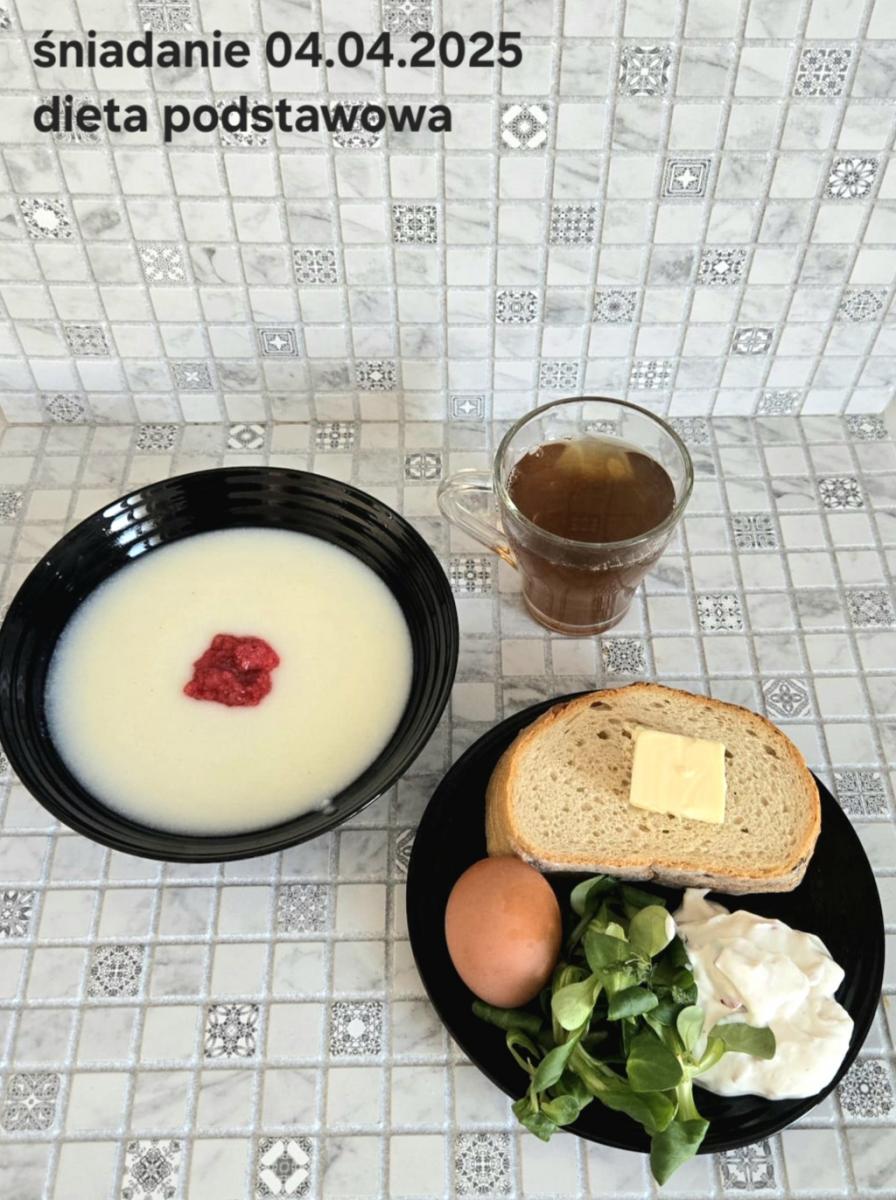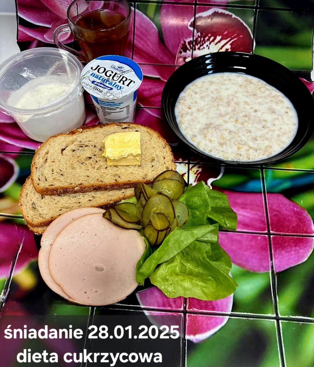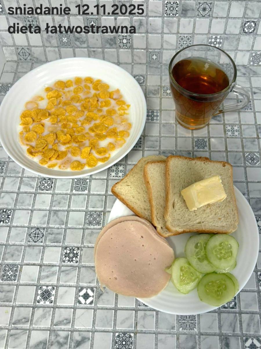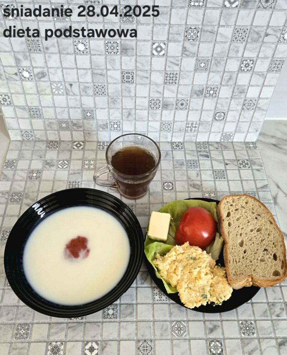 L(W,T): Zamiast masła- MARGARYNA MIĘKKA (15g) C: ZUPA MLECZNA Z PŁATKAMI OWSIANYMI(1) (50g) CHLEB ŻYTNI RAZOWY(1)- 150g Herbata bez cukru W: Dodatkowo SZYNKA DROBIOWA(1,6,9,10)- |