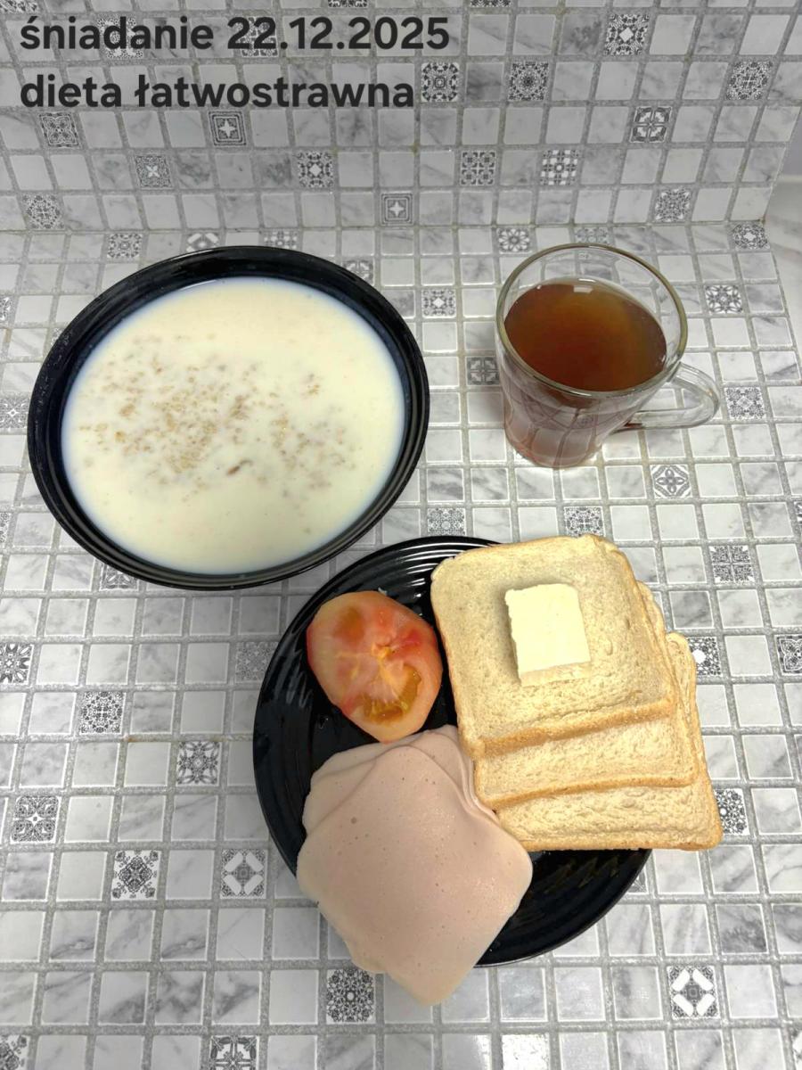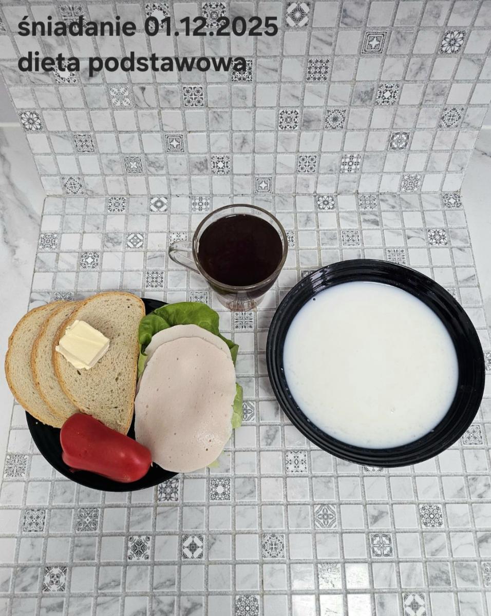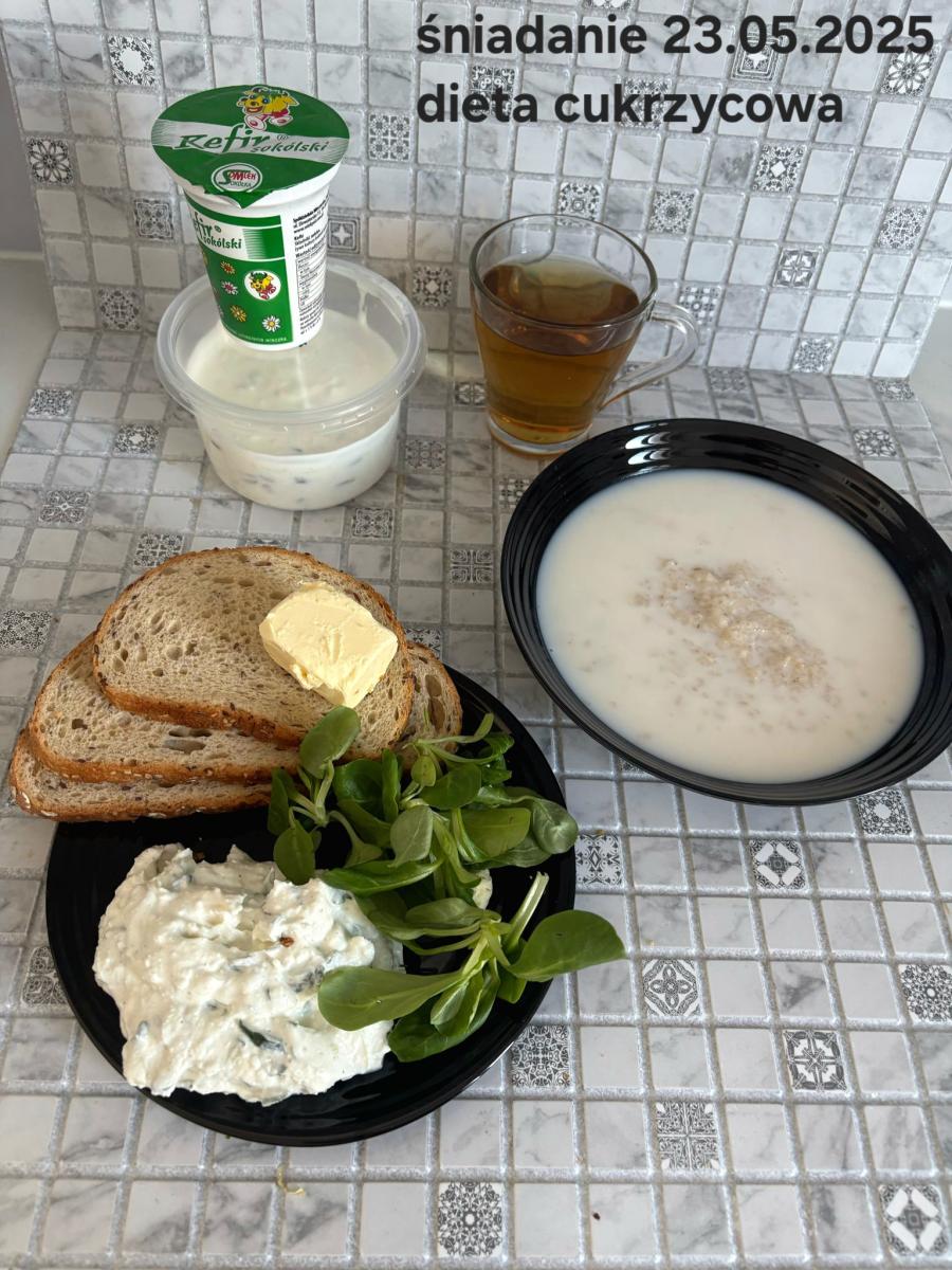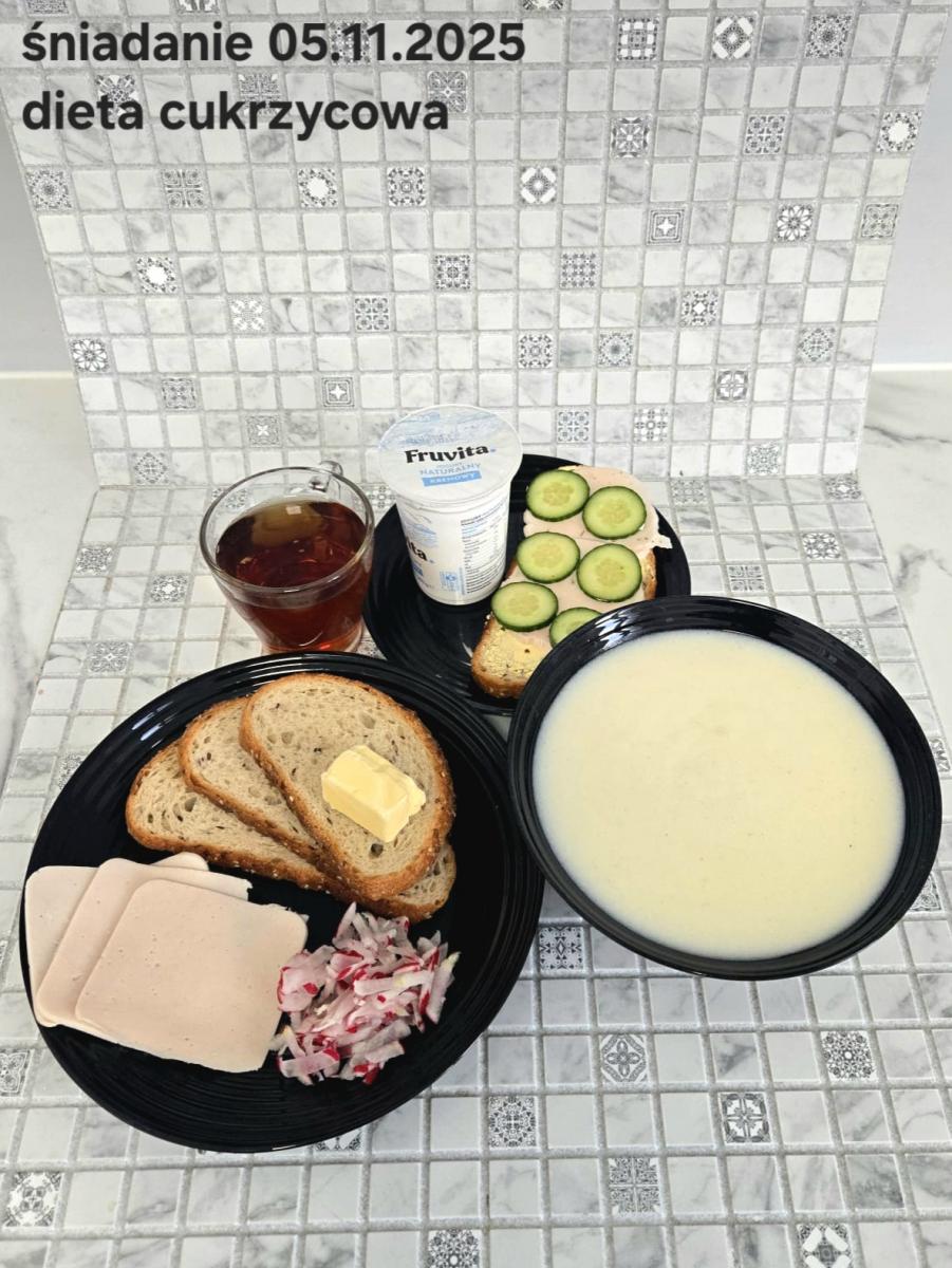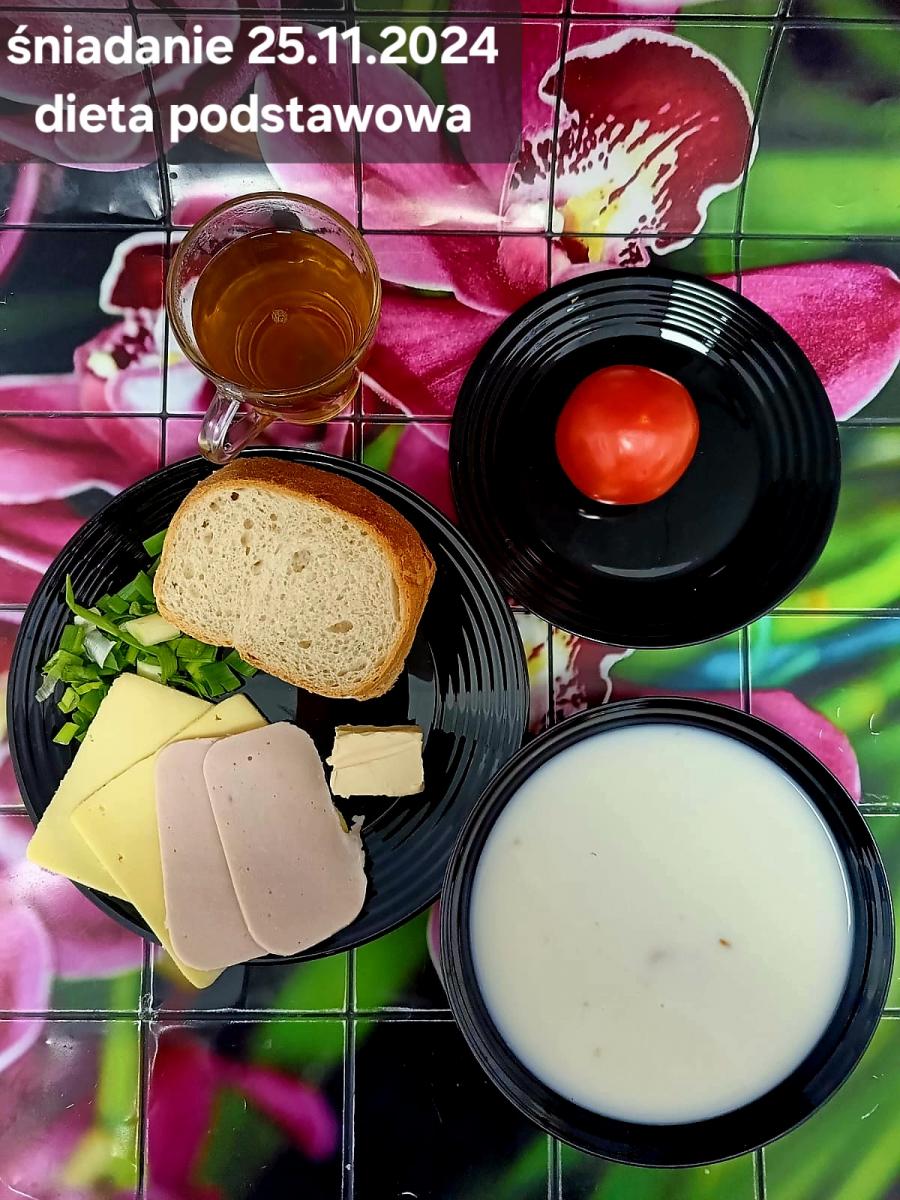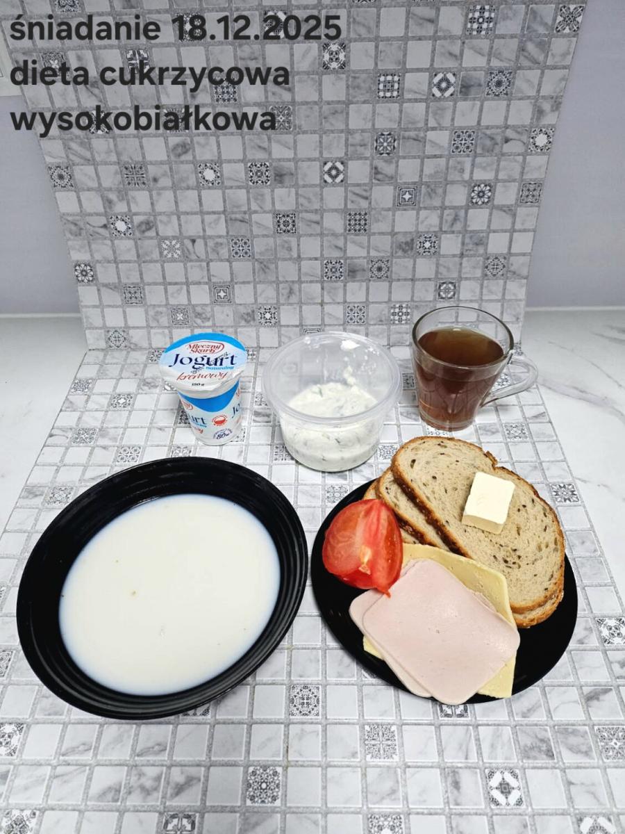 L(W,T): Zamiast masła- MARGARYNA MIĘKKA (15g) C: ZUPA MLECZNA Z PŁATKAMI OWSIANYMI(1) (50g) CHLEB ŻYTNI RAZOWY(1)- 150g Herbata bez cukru W: Dodatkowo SZYNKA DROBIOWA(1,6,9,10)- |