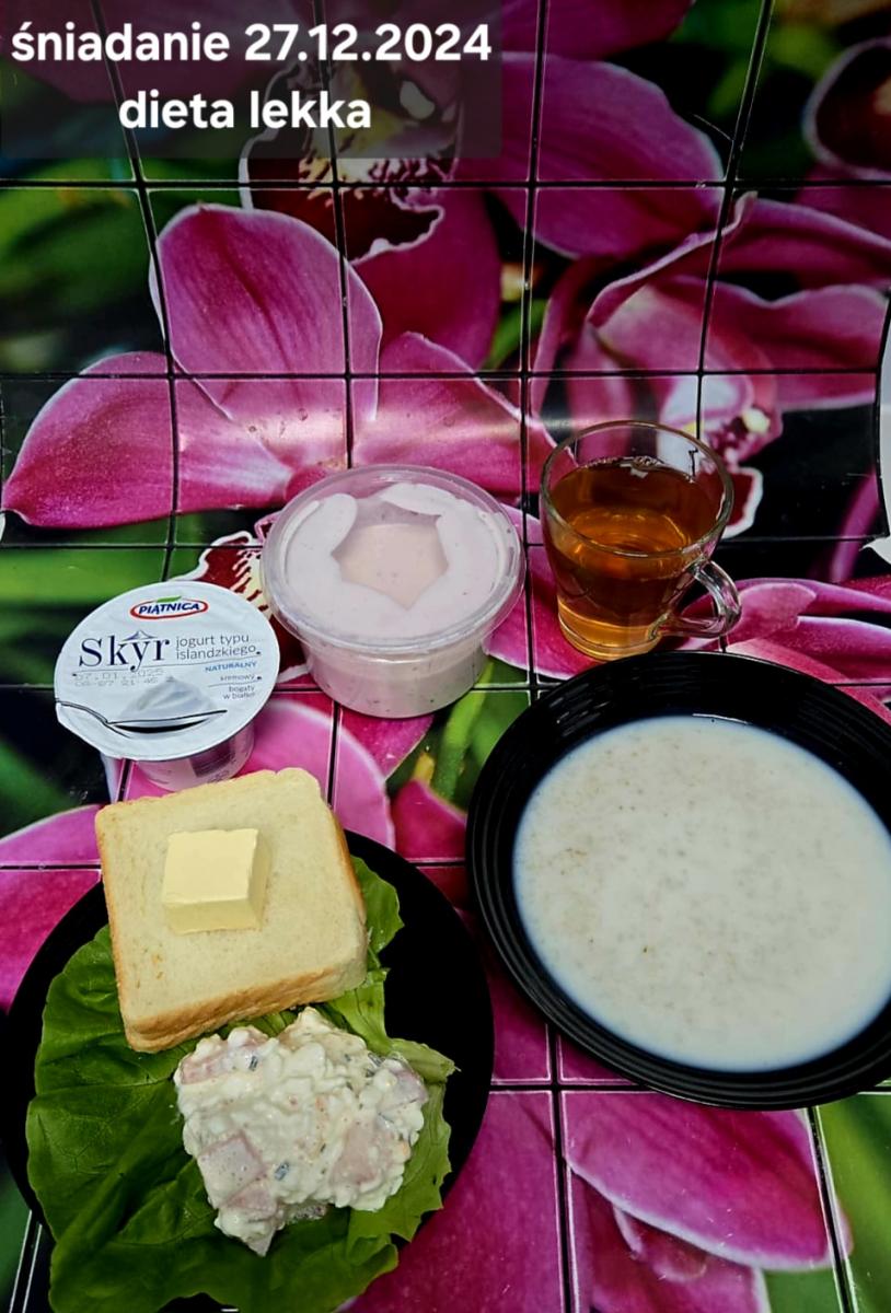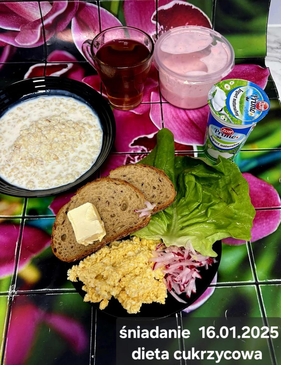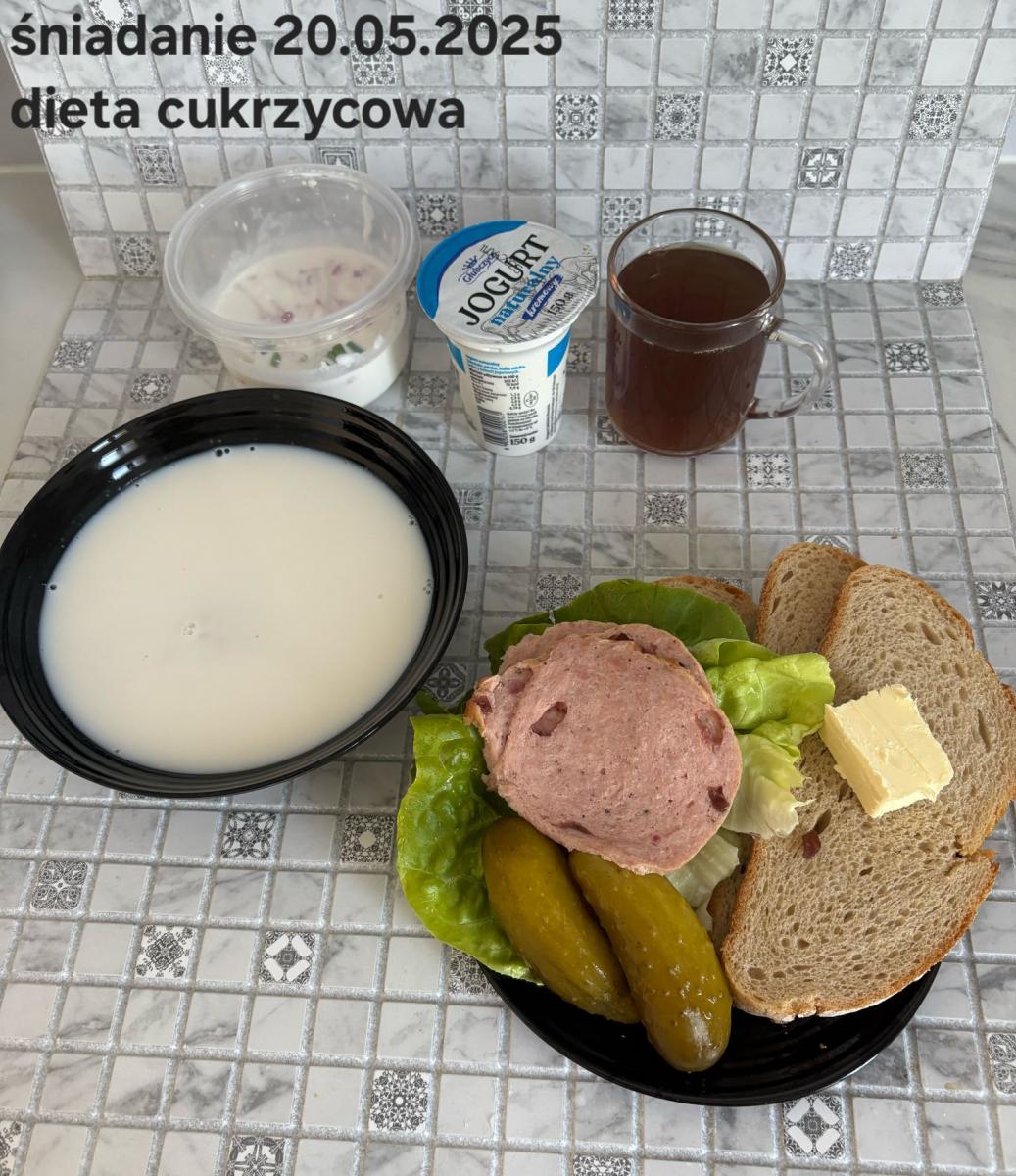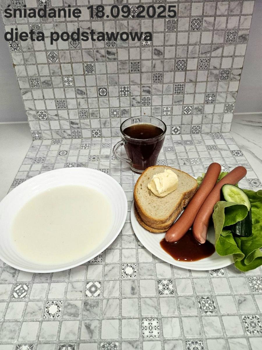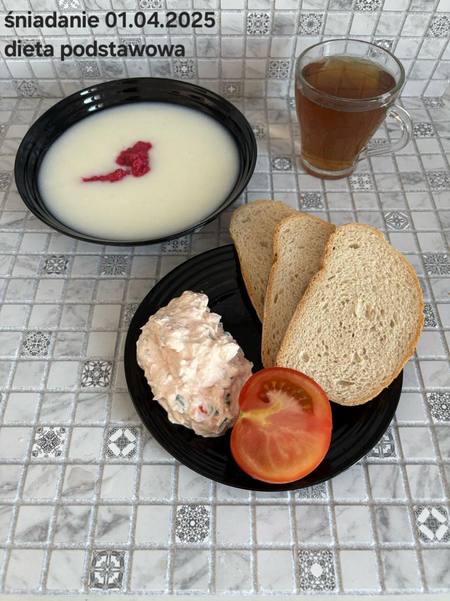 L(W,T): Zamiast masła- MARGARYNA MIĘKKA (15g) C: ZUPA MLECZNA Z PŁATKAMI OWSIANYMI(1) (50g) CHLEB ŻYTNI RAZOWY(1)- 150g Herbata bez cukru W: Dodatkowo SZYNKA DROBIOWA(1,6,9,10)- |