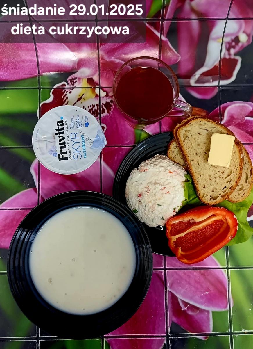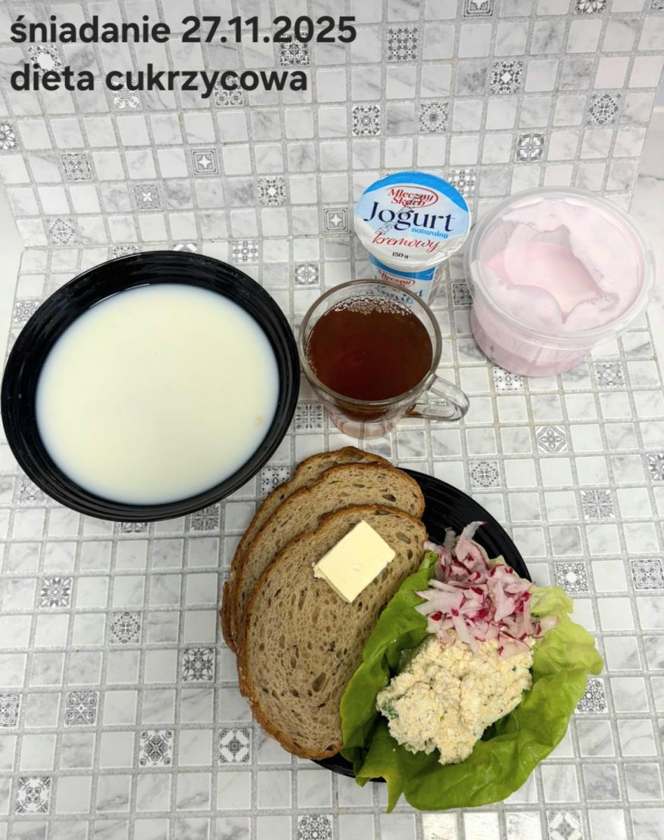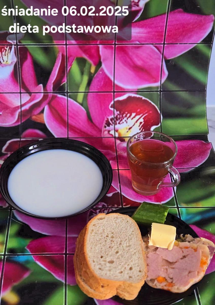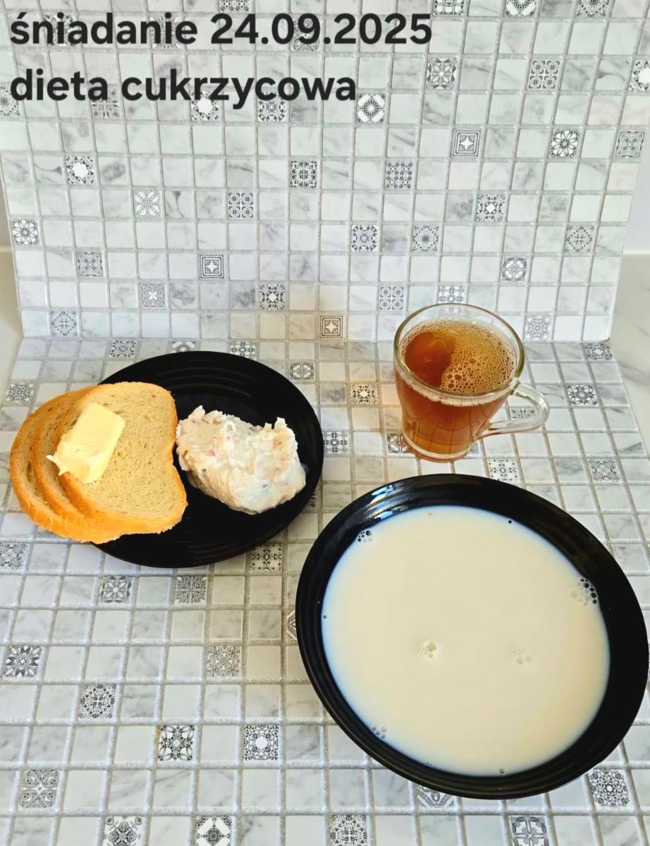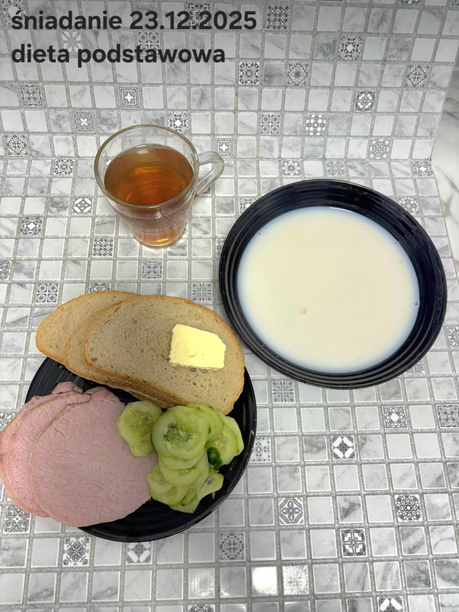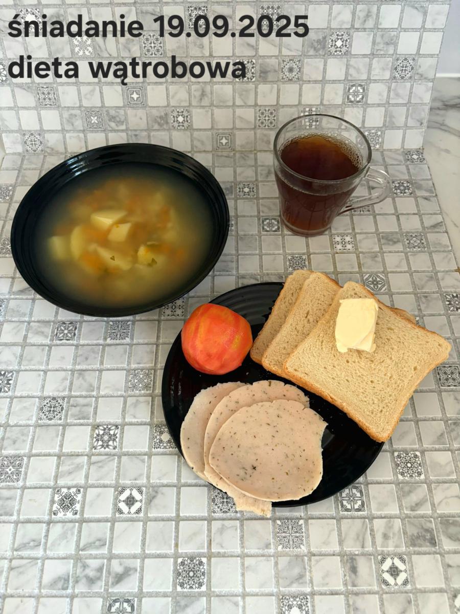 L(W,T): Zamiast masła- MARGARYNA MIĘKKA (15g) C: ZUPA MLECZNA Z PŁATKAMI OWSIANYMI(1) (50g) CHLEB ŻYTNI RAZOWY(1)- 150g Herbata bez cukru W: Dodatkowo SZYNKA DROBIOWA(1,6,9,10)- |