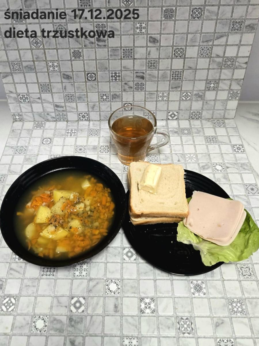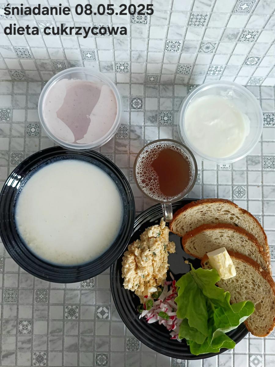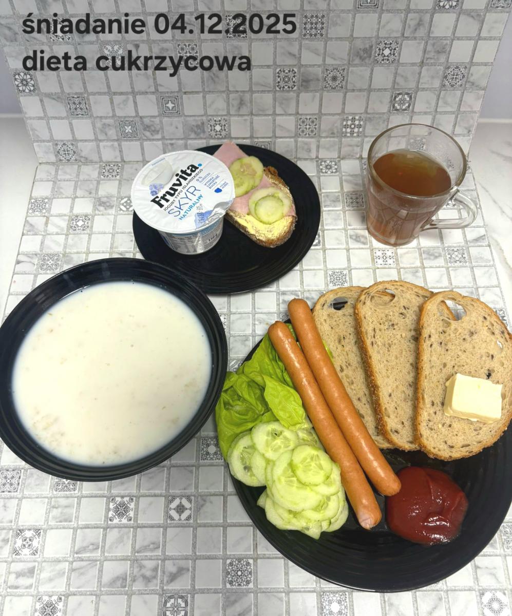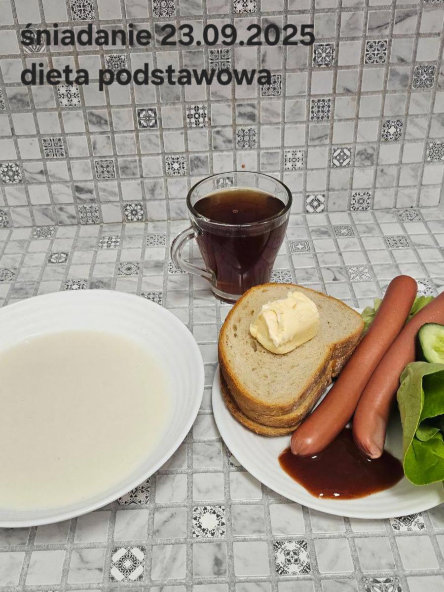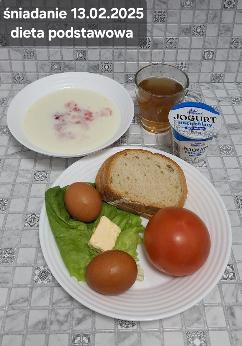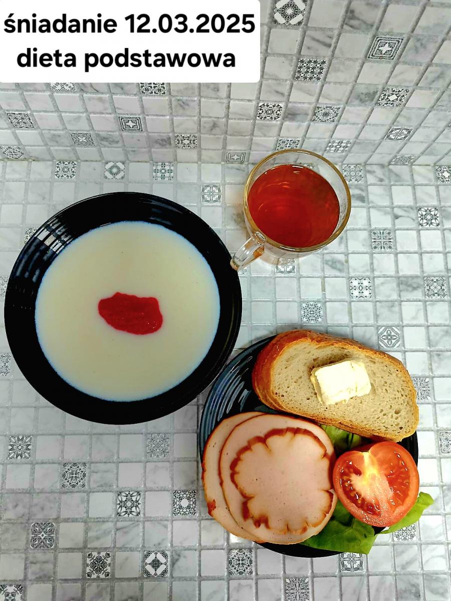 L(W,T): Zamiast masła- MARGARYNA MIĘKKA (15g) C: ZUPA MLECZNA Z PŁATKAMI OWSIANYMI(1) (50g) CHLEB ŻYTNI RAZOWY(1)- 150g Herbata bez cukru W: Dodatkowo SZYNKA DROBIOWA(1,6,9,10)- |