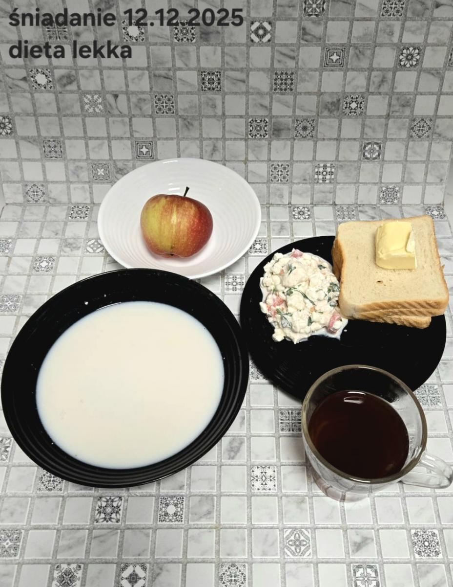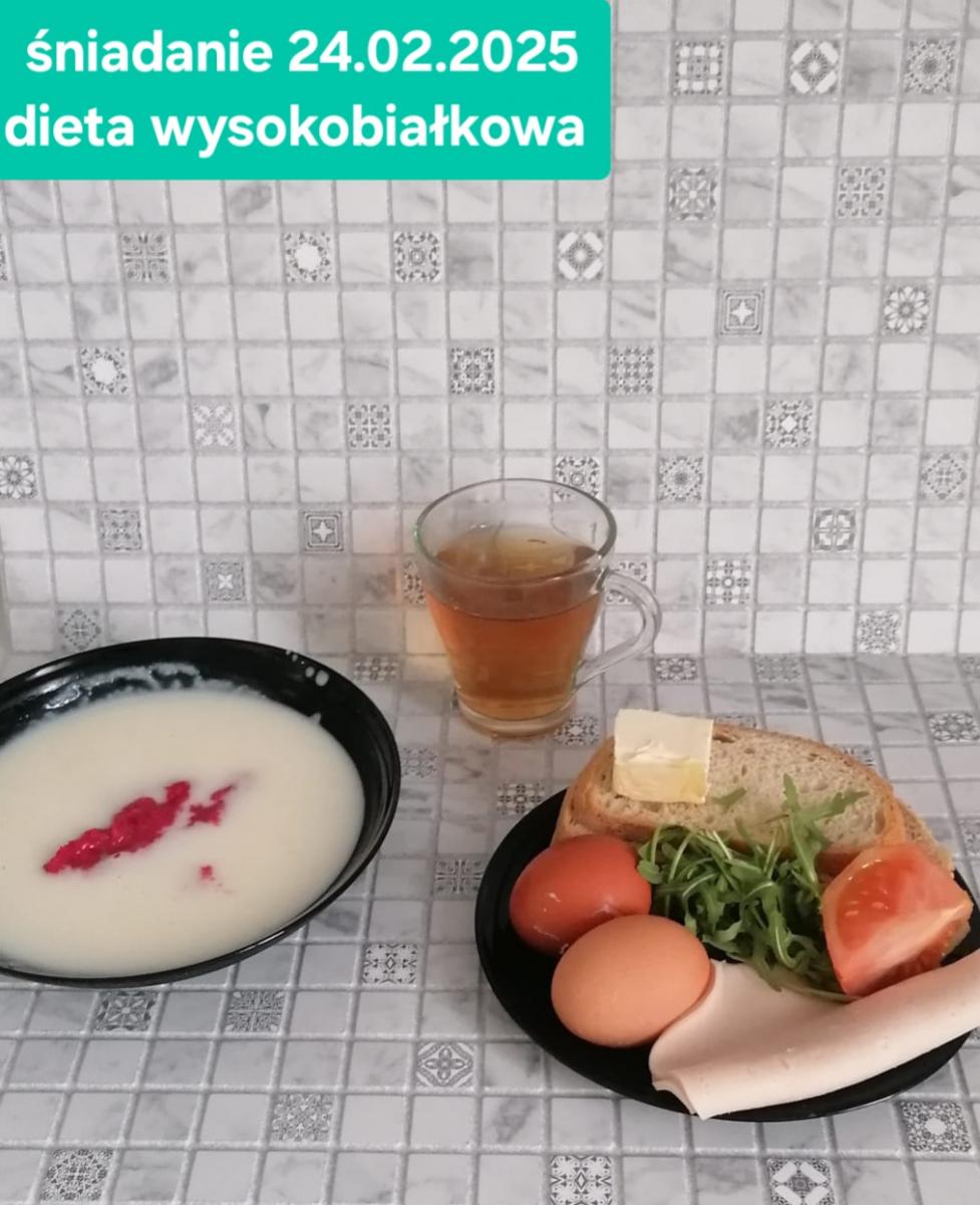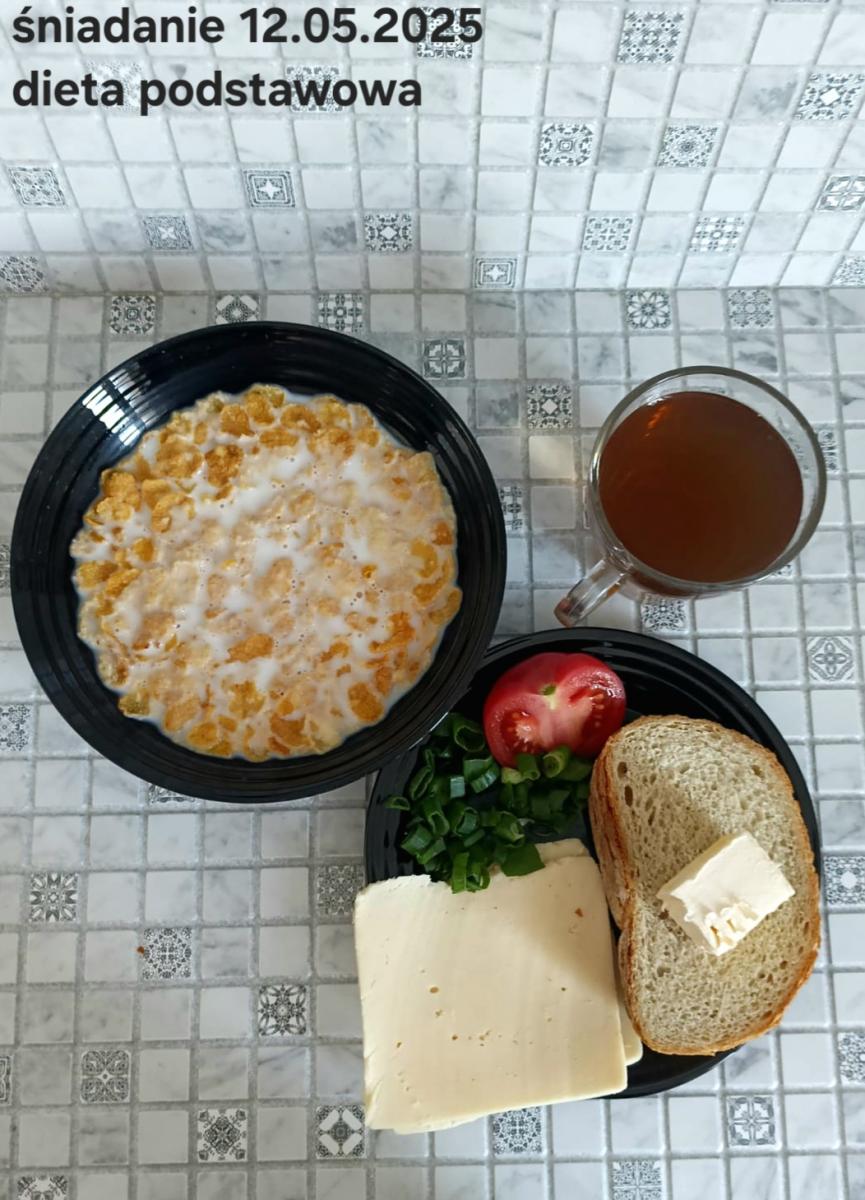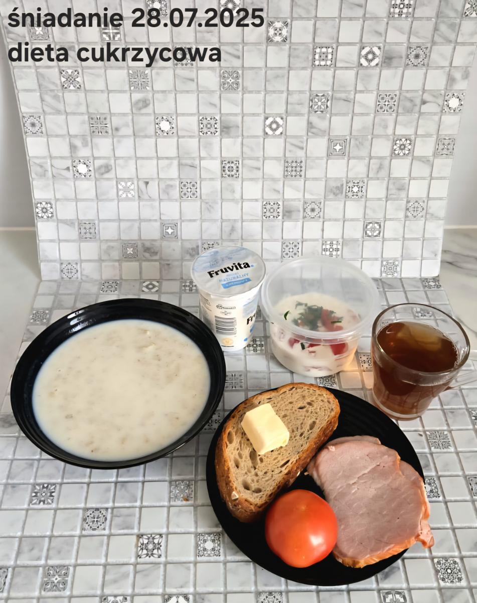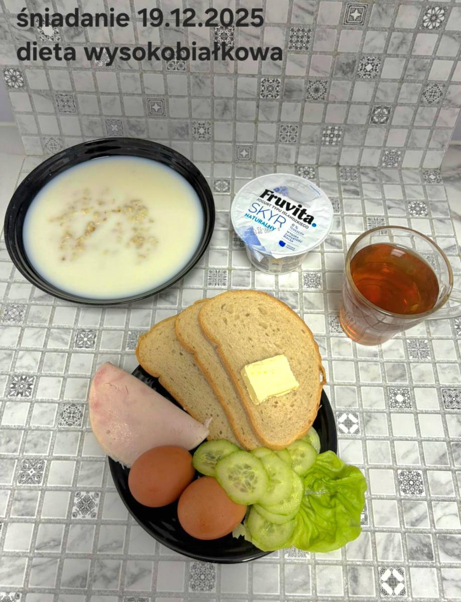 L(W,T): Zamiast masła- MARGARYNA MIĘKKA (15g) C: ZUPA MLECZNA Z PŁATKAMI OWSIANYMI(1) (50g) CHLEB ŻYTNI RAZOWY(1)- 150g Herbata bez cukru W: Dodatkowo SZYNKA DROBIOWA(1,6,9,10)- |