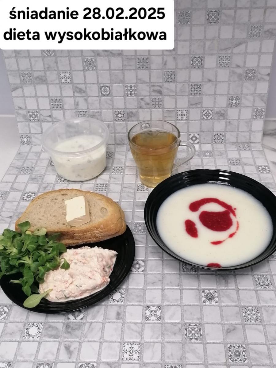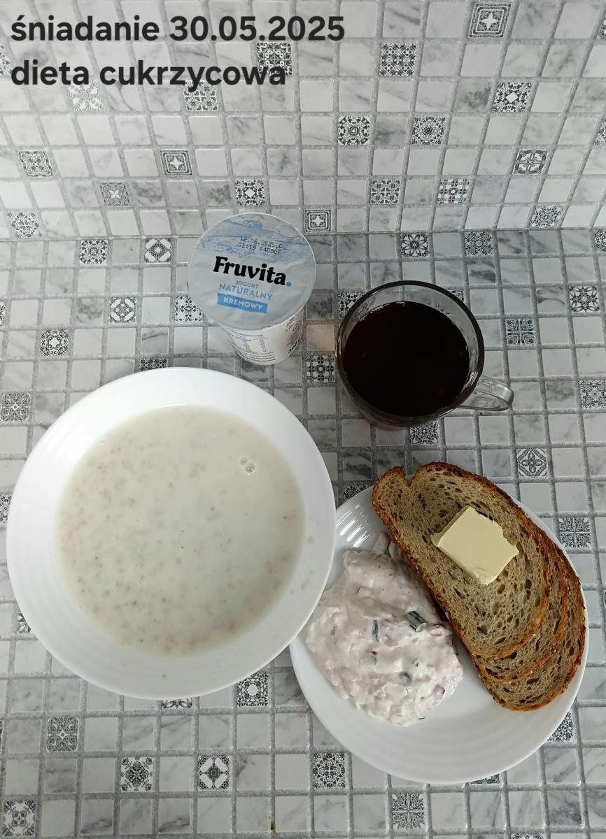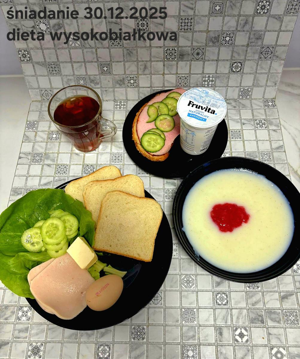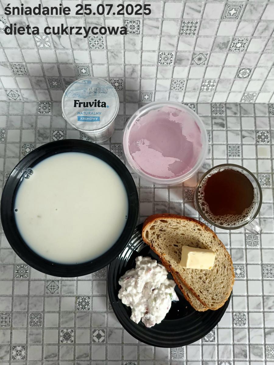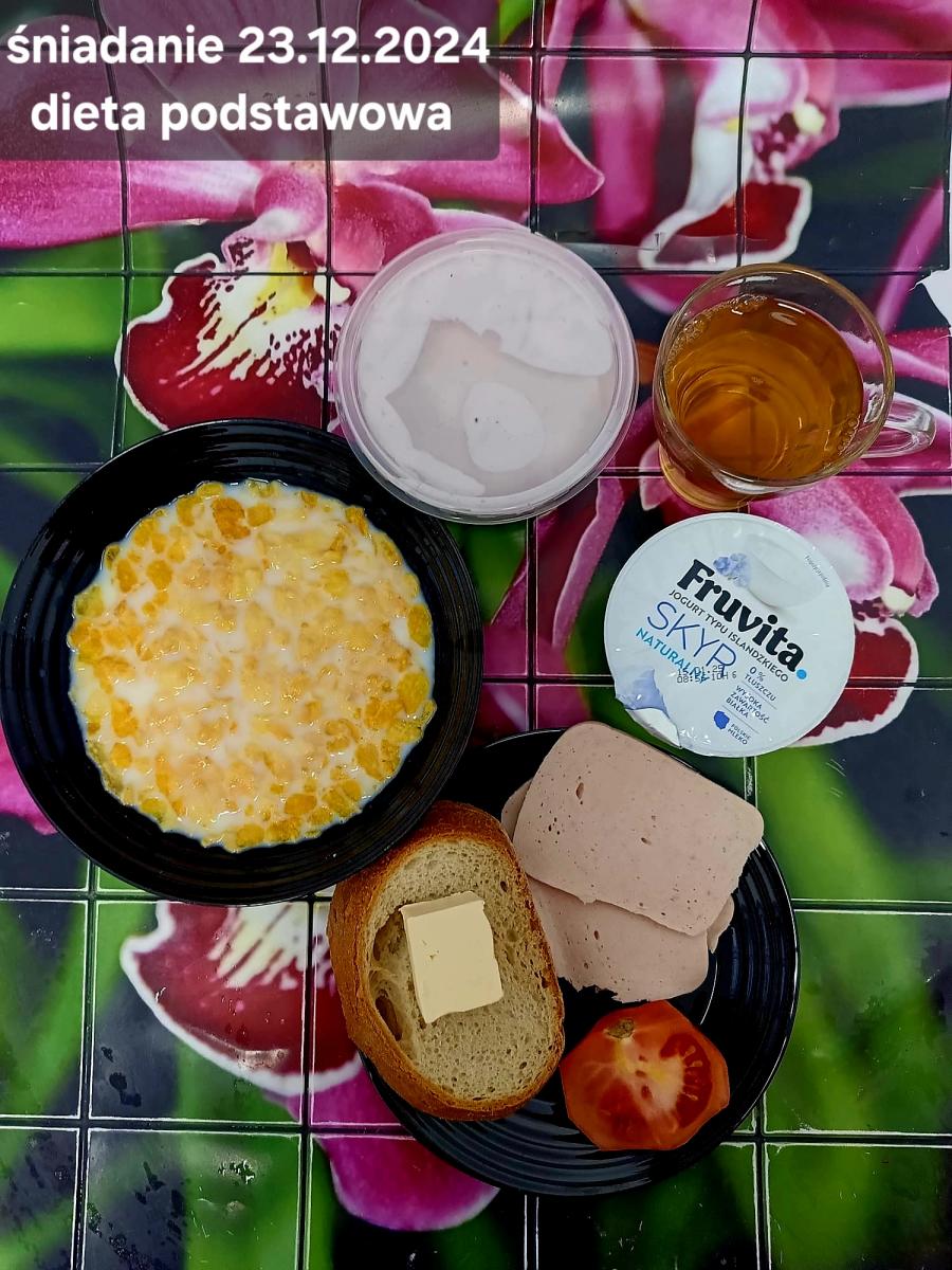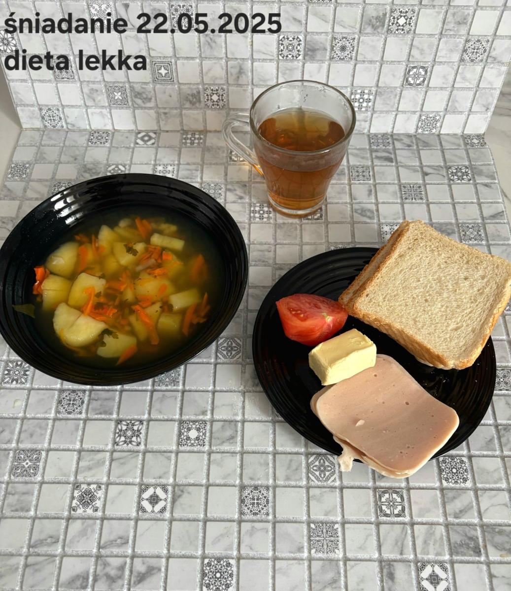L(W,T): Zamiast masła- MARGARYNA MIĘKKA (15g) C: ZUPA MLECZNA Z PŁATKAMI OWSIANYMI(1) (50g) CHLEB ŻYTNI RAZOWY(1)- 150g Herbata bez cukru W: Dodatkowo SZYNKA DROBIOWA(1,6,9,10)- |