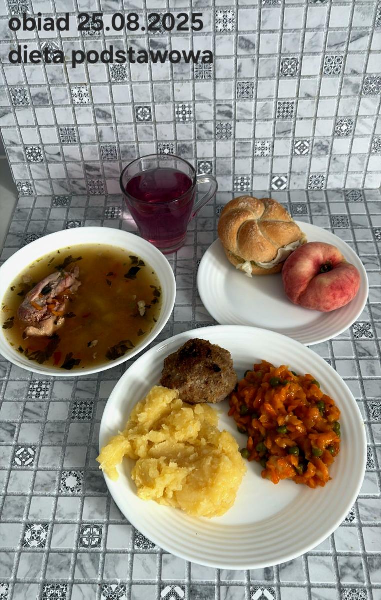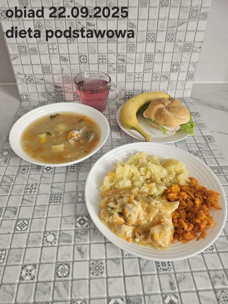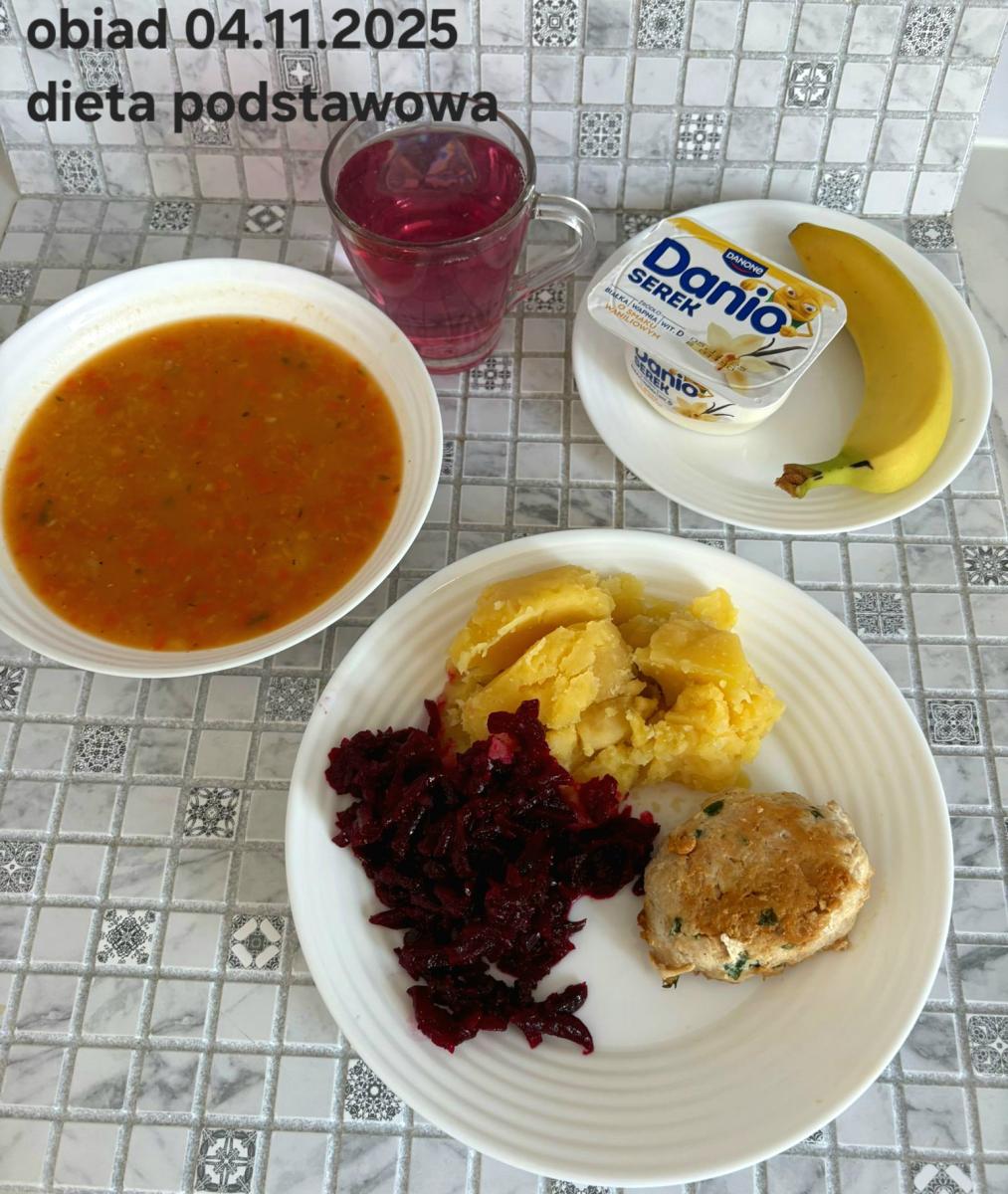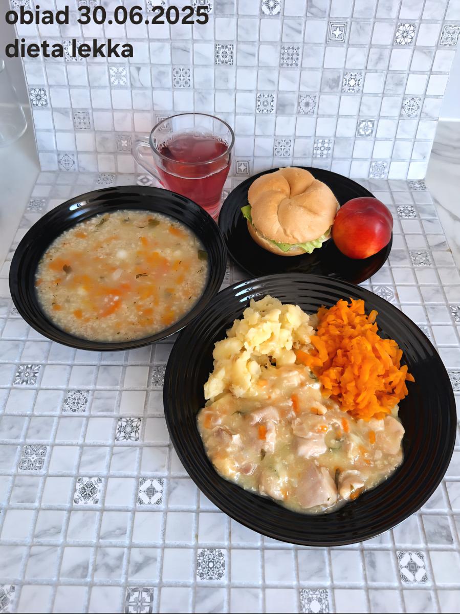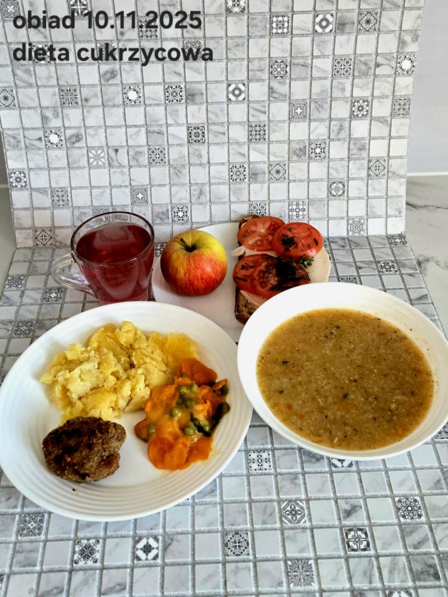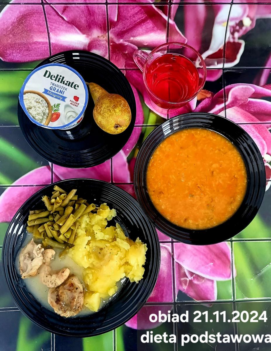 Z: dodatkowo sos: bulion warzywny (9)- 50ml, mąka kukurydziana- 8g, olej rzepakowy- 5g, marchew- 30g) B, Z, Z(PD): Ziemniaki w postaci PUREE z dodatkiem oleju rzepakowego (5g) L, L(W,T): Zamiast zupy z soczewicy krem z dyni: dynia- 100g, ziemniak- 90g, marchew- 30g, pietruszka- 20g, olej rzepakowy- 10g, bulion drobiowy(9)- 150ml ) Zamiast kotleta potrawka z kurczaka: udko z kurczaka bez skóry (100g) w jasnym sosie koperkowym (mleko 1,5% (7)- 50ml, mąka (1)- 8g, margaryna roślinna miękka- 5g , koperek- 2 łyżeczki (2 x 3g)) Ziemniaki w postaci PUREE z dodatkiem oleju rzepakowego (5g) C: KOMPOT BEZ DODATKU CUKRU, zamiast buraczków surówka z marchwi (150g)