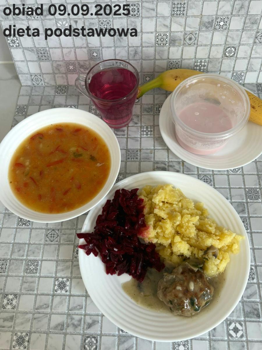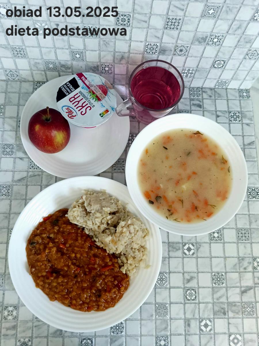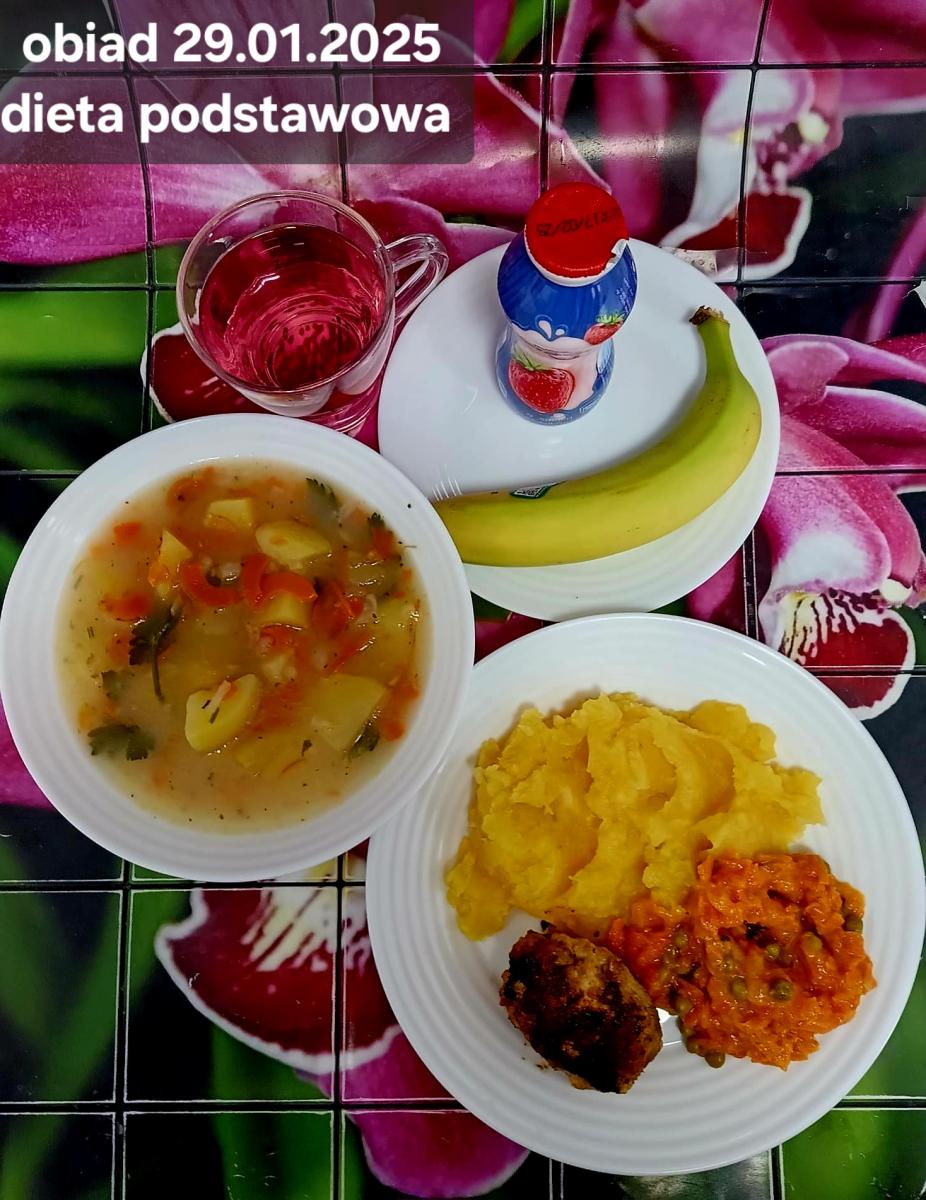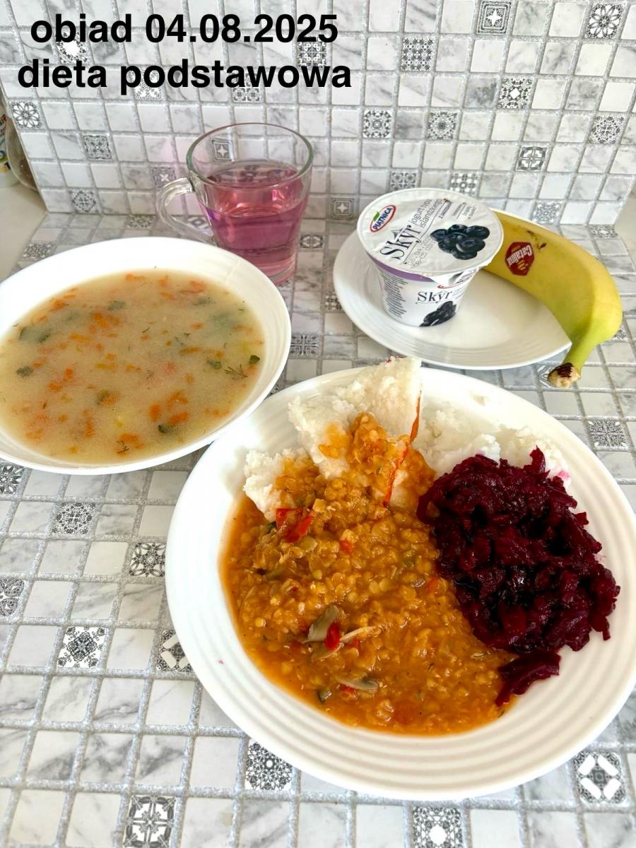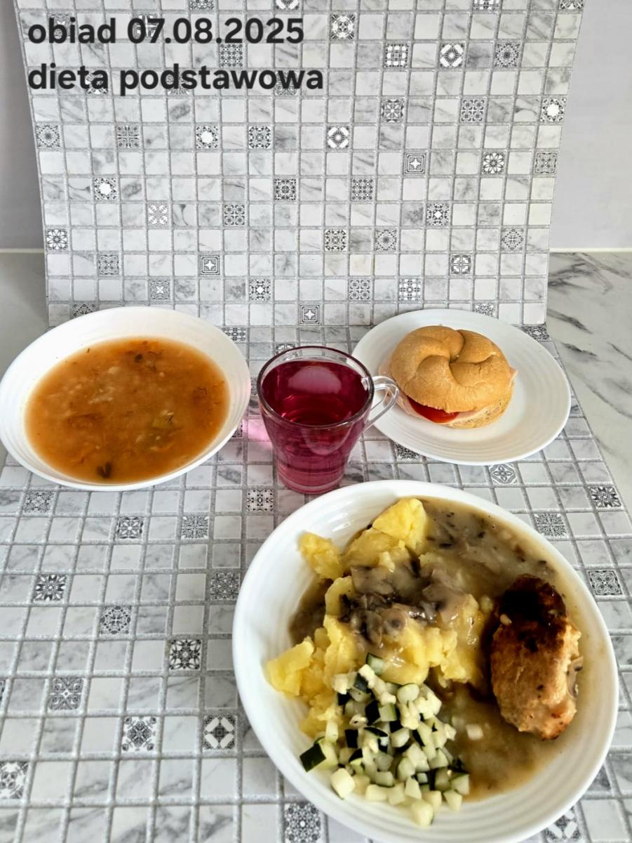 Z: dodatkowo sos: bulion warzywny (9)- 50ml, mąka kukurydziana- 8g, olej rzepakowy- 5g, marchew- 30g) B, Z, Z(PD): Ziemniaki w postaci PUREE z dodatkiem oleju rzepakowego (5g) L, L(W,T): Zamiast zupy z soczewicy krem z dyni: dynia- 100g, ziemniak- 90g, marchew- 30g, pietruszka- 20g, olej rzepakowy- 10g, bulion drobiowy(9)- 150ml ) Zamiast kotleta potrawka z kurczaka: udko z kurczaka bez skóry (100g) w jasnym sosie koperkowym (mleko 1,5% (7)- 50ml, mąka (1)- 8g, margaryna roślinna miękka- 5g , koperek- 2 łyżeczki (2 x 3g)) Ziemniaki w postaci PUREE z dodatkiem oleju rzepakowego (5g) C: KOMPOT BEZ DODATKU CUKRU, zamiast buraczków surówka z marchwi (150g)