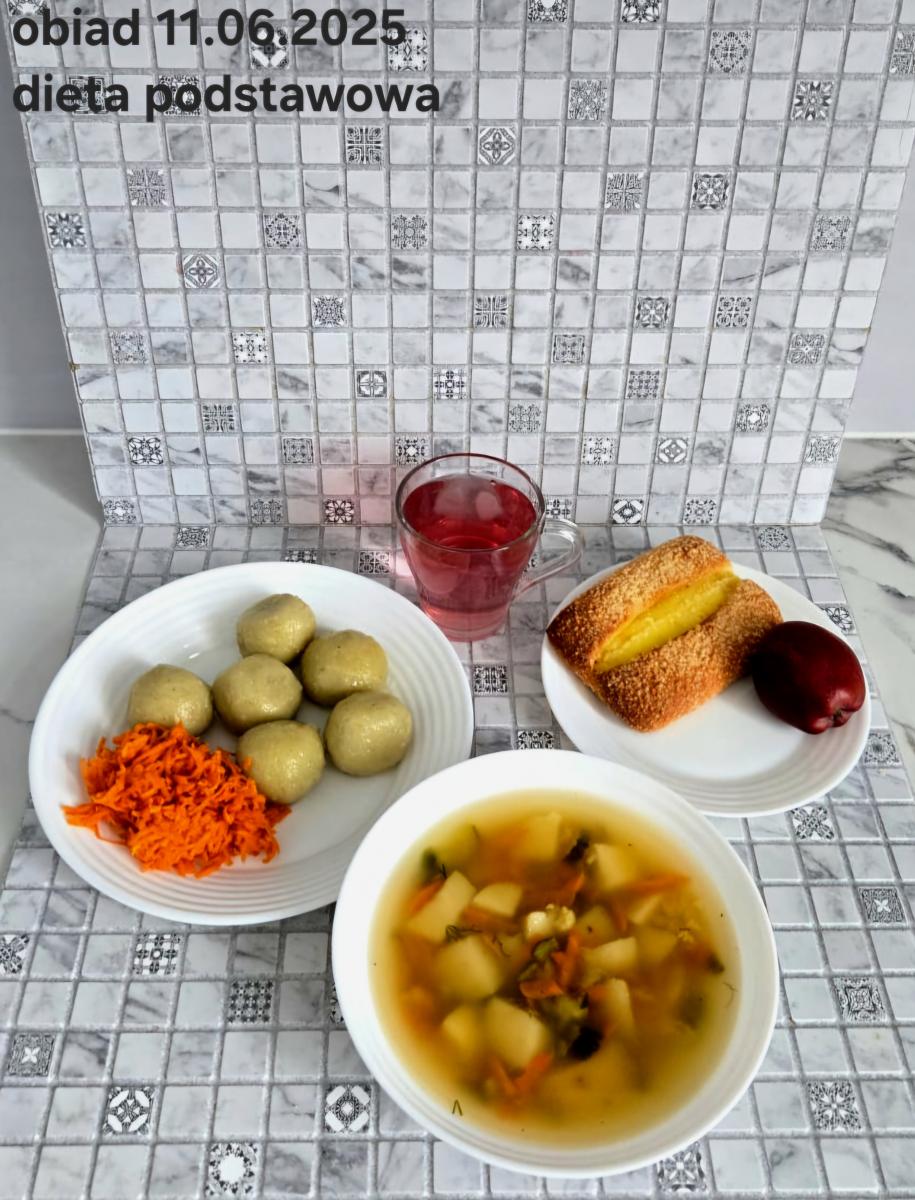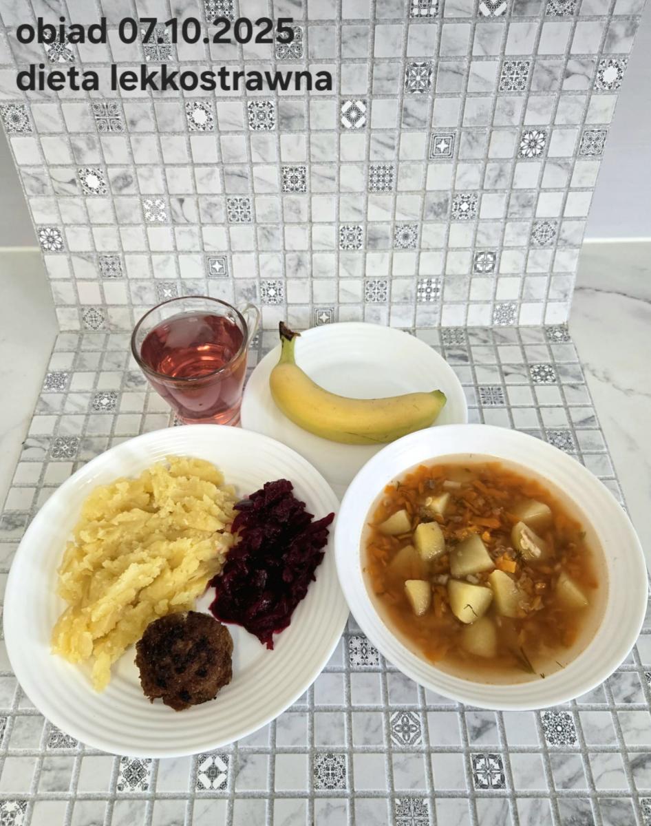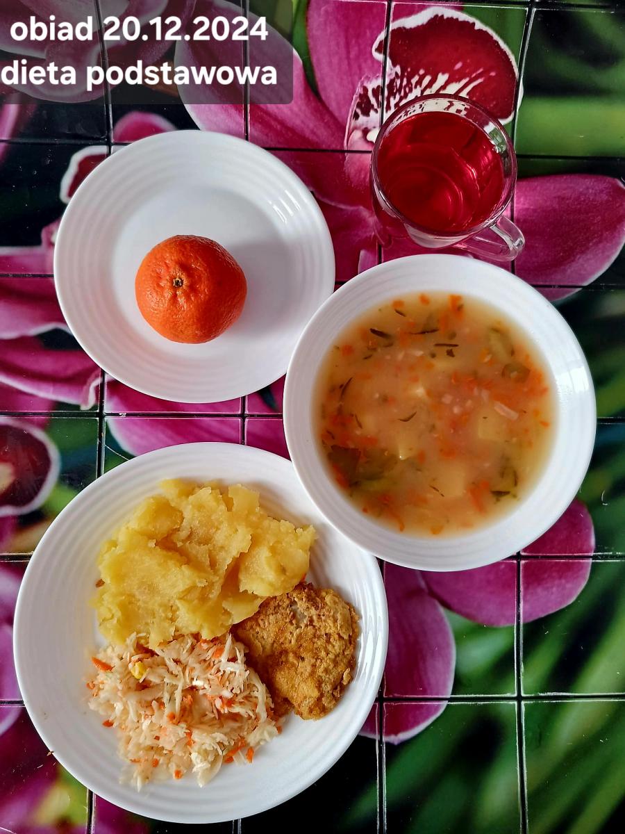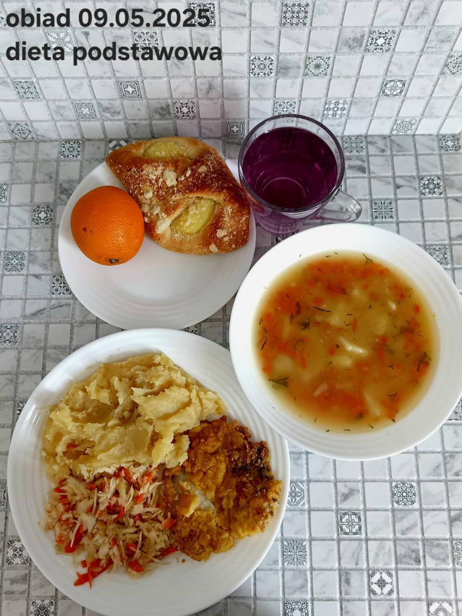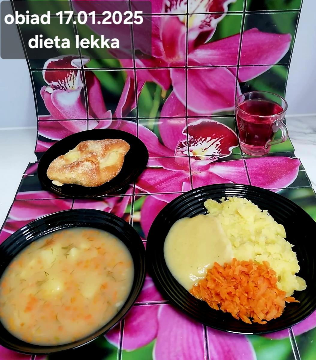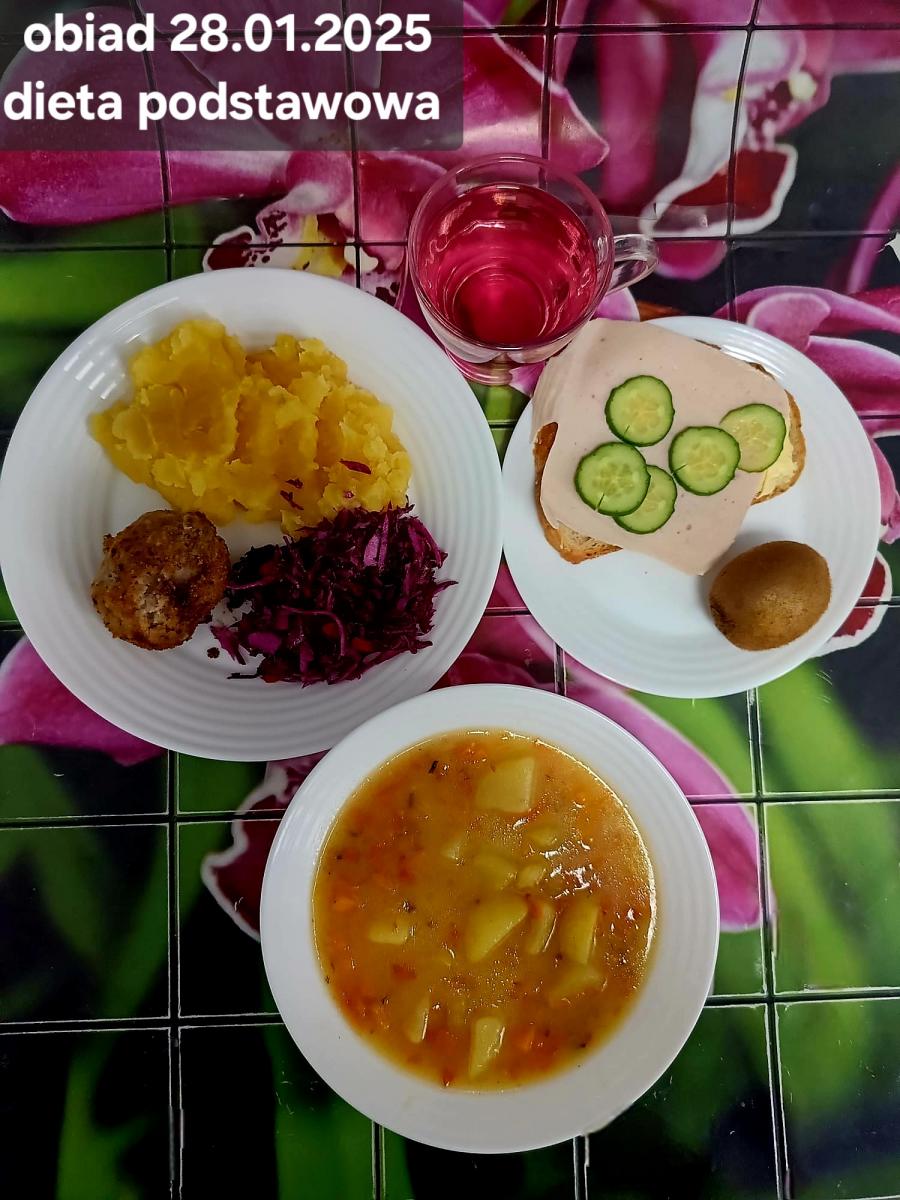 Z: dodatkowo sos: bulion warzywny (9)- 50ml, mąka kukurydziana- 8g, olej rzepakowy- 5g, marchew- 30g) B, Z, Z(PD): Ziemniaki w postaci PUREE z dodatkiem oleju rzepakowego (5g) L, L(W,T): Zamiast zupy z soczewicy krem z dyni: dynia- 100g, ziemniak- 90g, marchew- 30g, pietruszka- 20g, olej rzepakowy- 10g, bulion drobiowy(9)- 150ml ) Zamiast kotleta potrawka z kurczaka: udko z kurczaka bez skóry (100g) w jasnym sosie koperkowym (mleko 1,5% (7)- 50ml, mąka (1)- 8g, margaryna roślinna miękka- 5g , koperek- 2 łyżeczki (2 x 3g)) Ziemniaki w postaci PUREE z dodatkiem oleju rzepakowego (5g) C: KOMPOT BEZ DODATKU CUKRU, zamiast buraczków surówka z marchwi (150g)