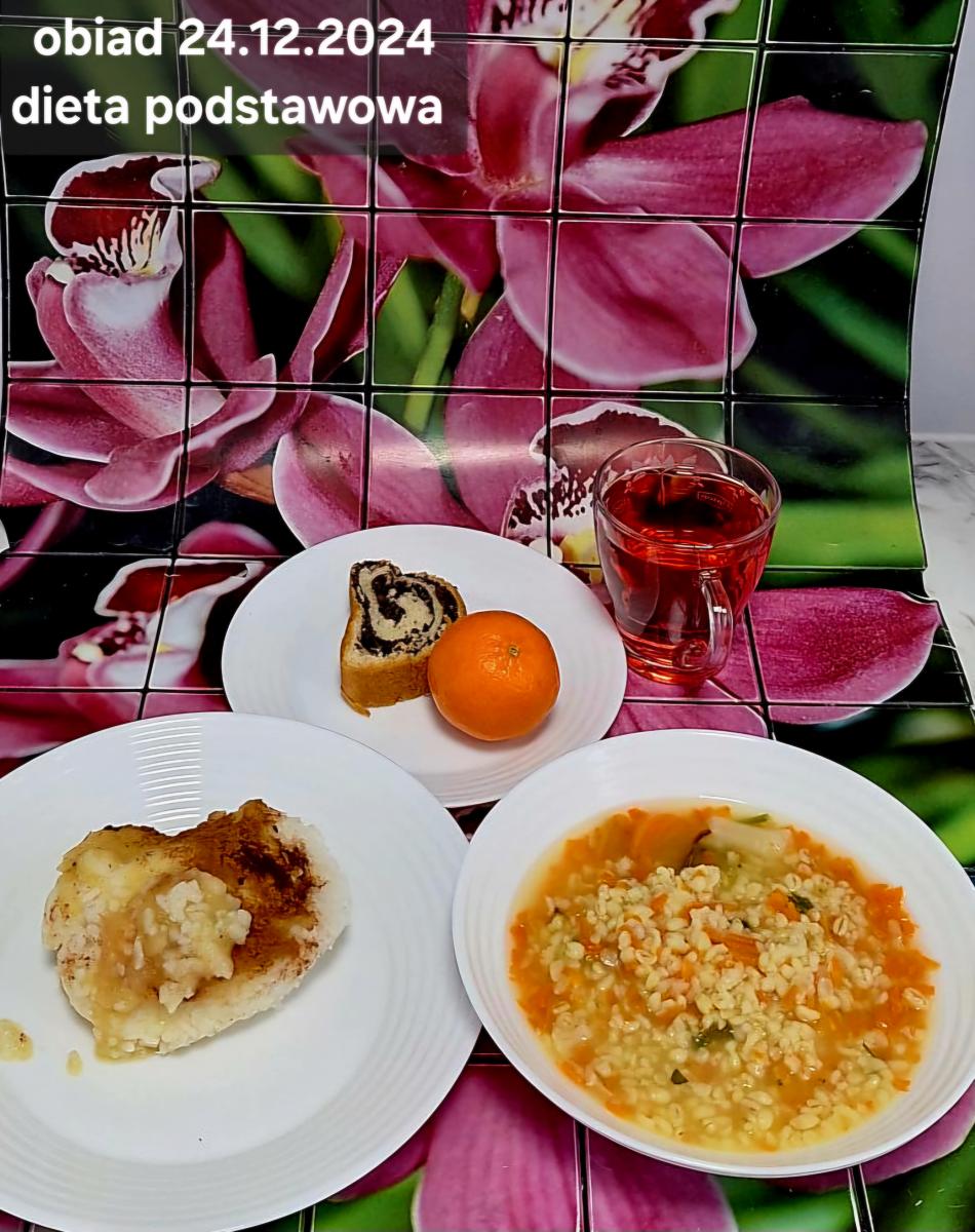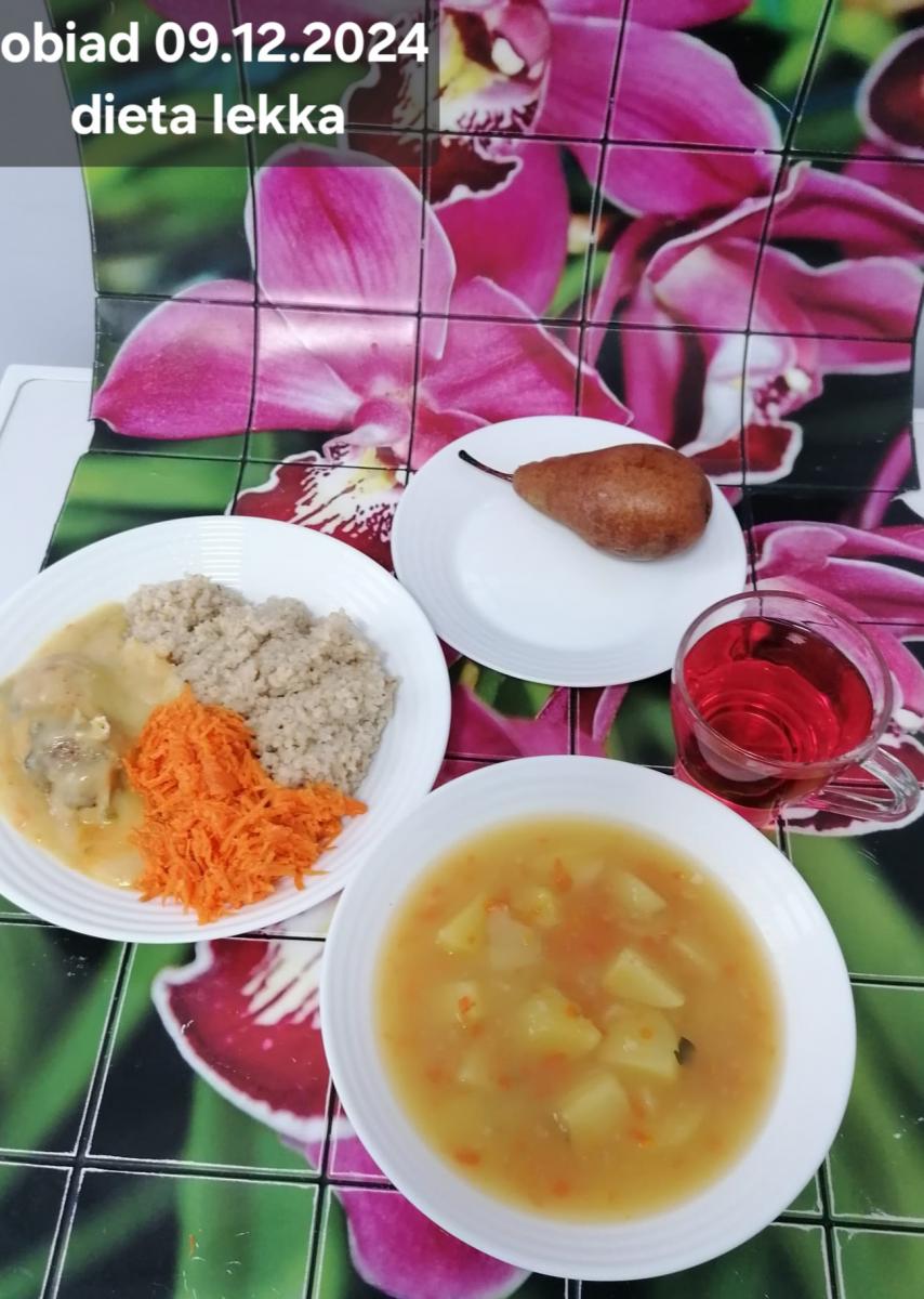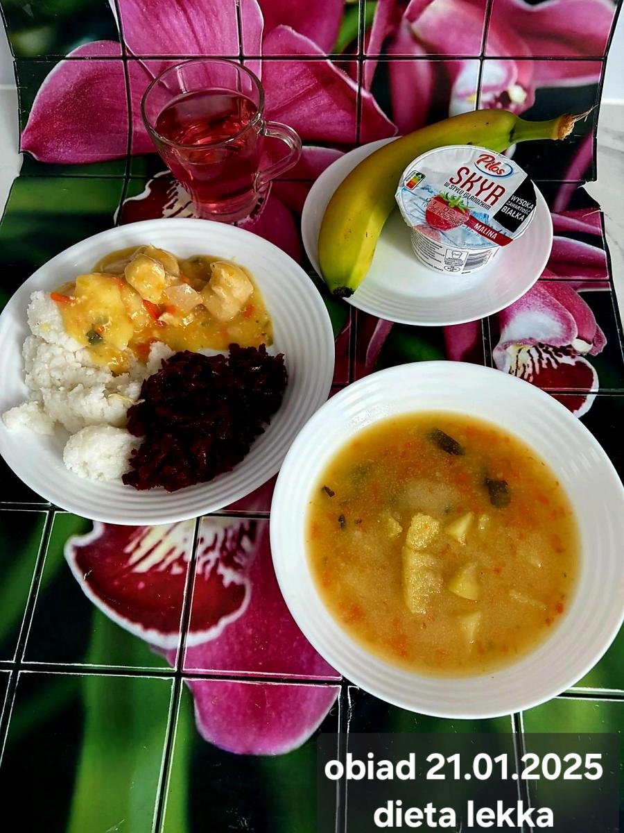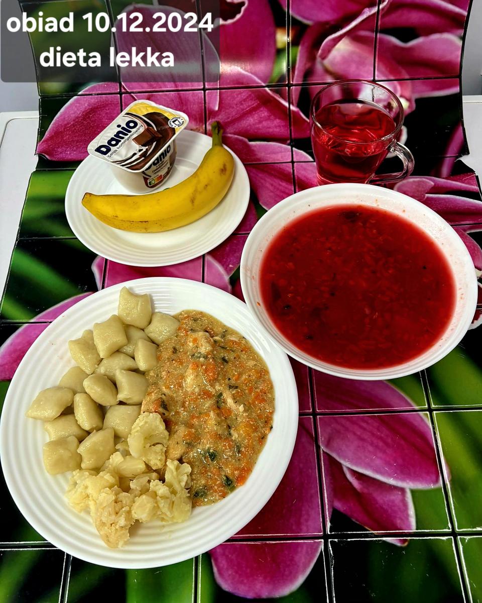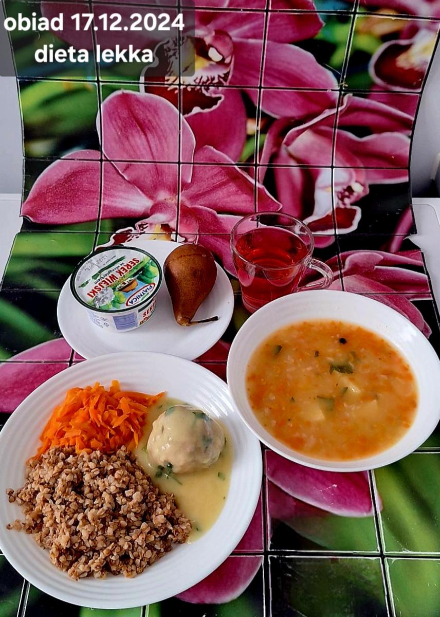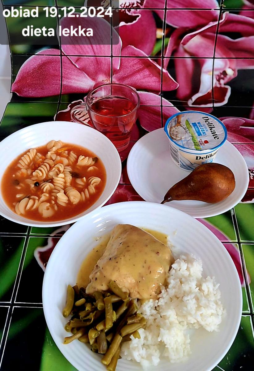 B,ZOL (cały), DZ: Zamiast kaszy- KOPYTKA(ziemniaki, skrobia ziemniaczana, mąka pszenna(1), jaja(3)) (250g), schab podany w formie gulaszu B: barszcz bez śmietany, sos na napoju sojowym (6) (zamiast śmietanki) L, L (W,T) zupa bez dodatku śmietany zamiast kaszy –KOPYTKA(1,3) (250g) Zamiast schabu indyk w wersji lekkostrawnej (filet z indyka- 100g, olej rzepakowy- 10g, papryka- 20g, marchew- pół średniej (22g), koncentrat pomidorowy- łyżeczka (12g), bulion warzywny(9)- 50ml ) L, L(W,T), Z, Z(PD): zamiast surówki brokuły (145g) z dodatkiem oleju rzepakowego (5g) C: Kompot bez dodatku cukru, Barszcz z dodatkiem mąki pełnoziarnistej (1) W: Zamiast surówki brokuły (145g) z dodatkiem oleju rzepakowego (5g) |