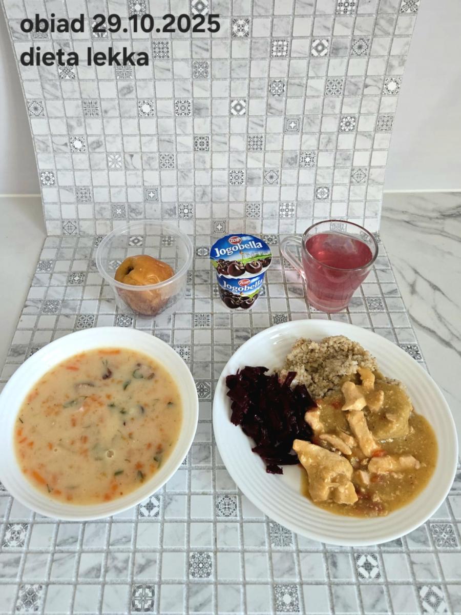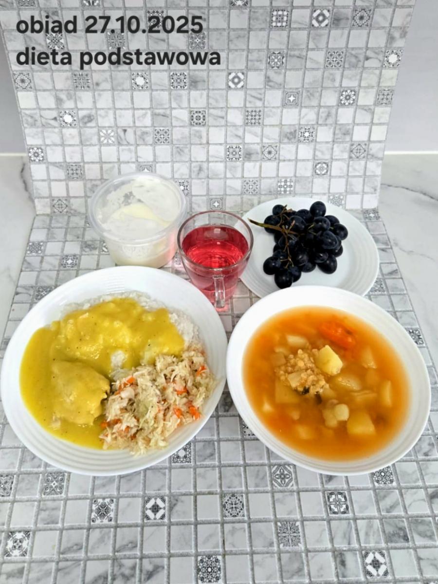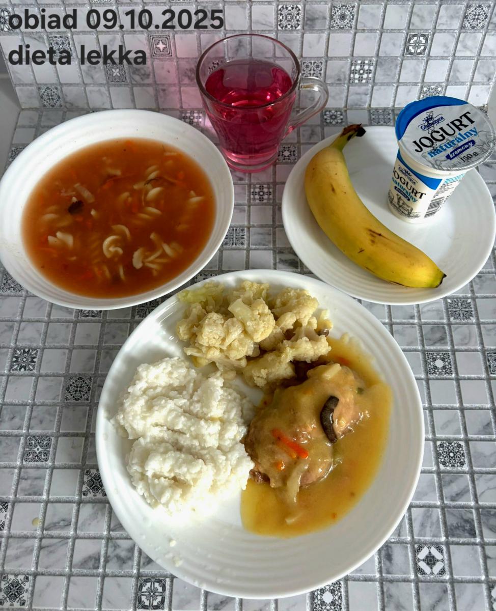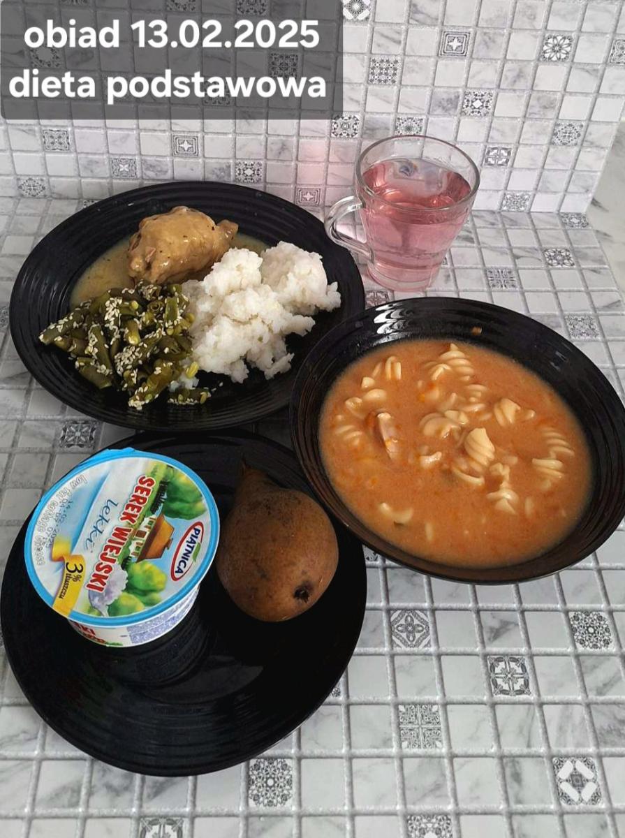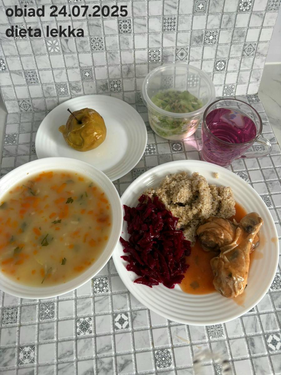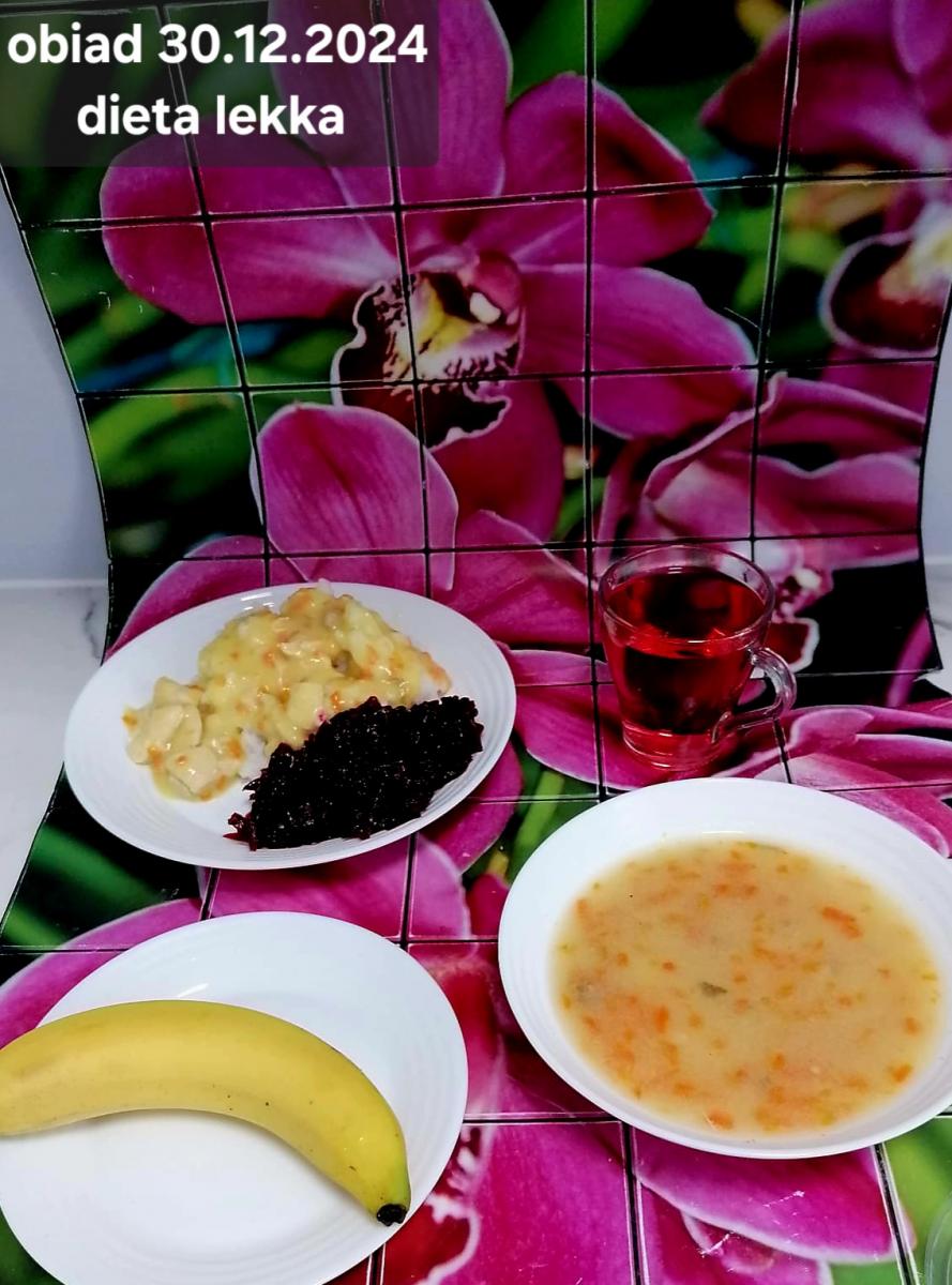B,ZOL (cały), DZ: Zamiast kaszy- KOPYTKA(ziemniaki, skrobia ziemniaczana, mąka pszenna(1), jaja(3)) (250g), schab podany w formie gulaszu B: barszcz bez śmietany, sos na napoju sojowym (6) (zamiast śmietanki) L, L (W,T) zupa bez dodatku śmietany zamiast kaszy –KOPYTKA(1,3) (250g) Zamiast schabu indyk w wersji lekkostrawnej (filet z indyka- 100g, olej rzepakowy- 10g, papryka- 20g, marchew- pół średniej (22g), koncentrat pomidorowy- łyżeczka (12g), bulion warzywny(9)- 50ml ) L, L(W,T), Z, Z(PD): zamiast surówki brokuły (145g) z dodatkiem oleju rzepakowego (5g) C: Kompot bez dodatku cukru, Barszcz z dodatkiem mąki pełnoziarnistej (1) W: Zamiast surówki brokuły (145g) z dodatkiem oleju rzepakowego (5g) |