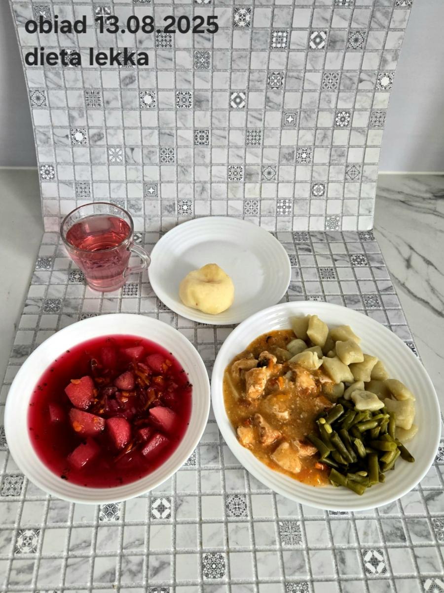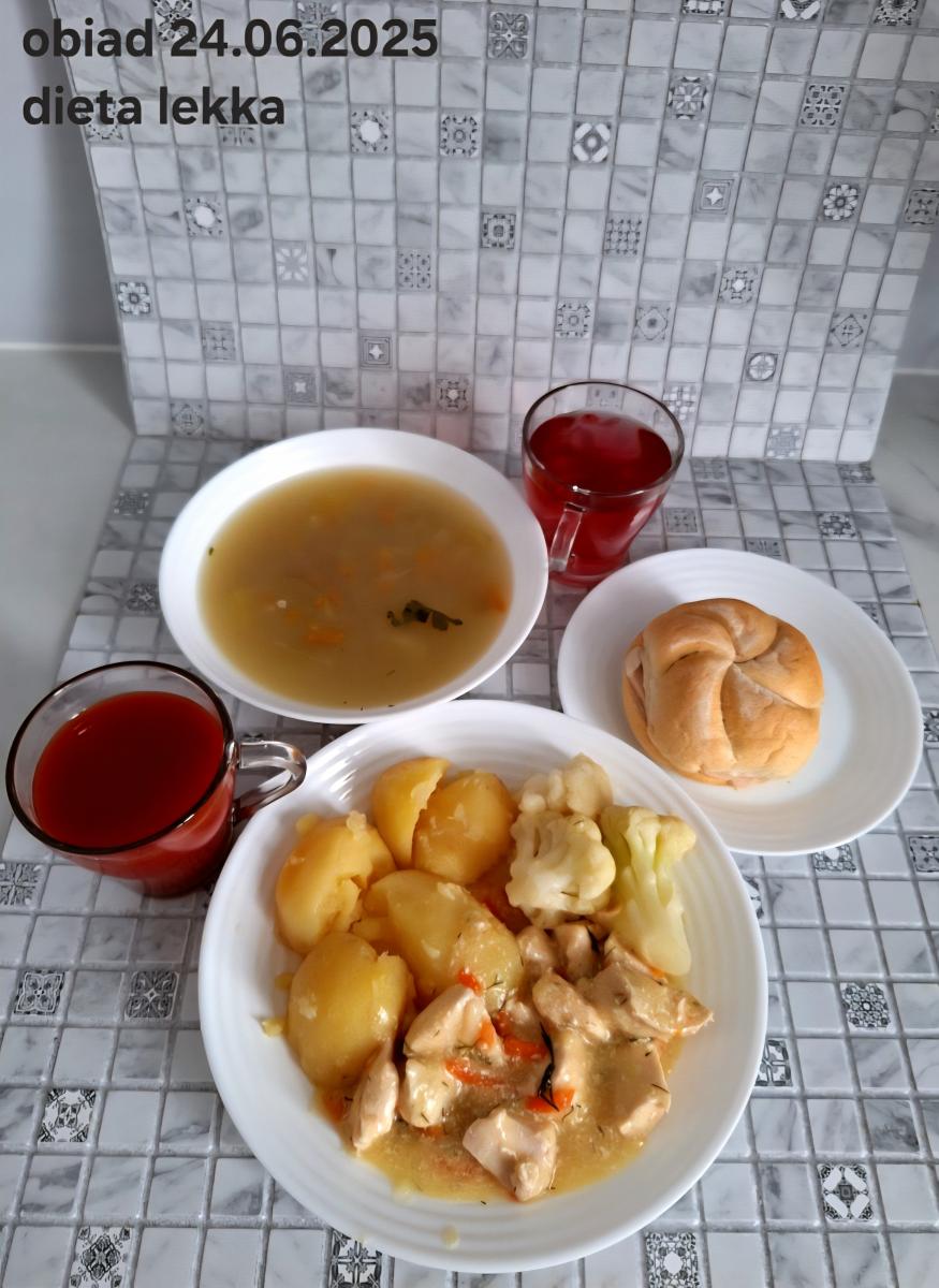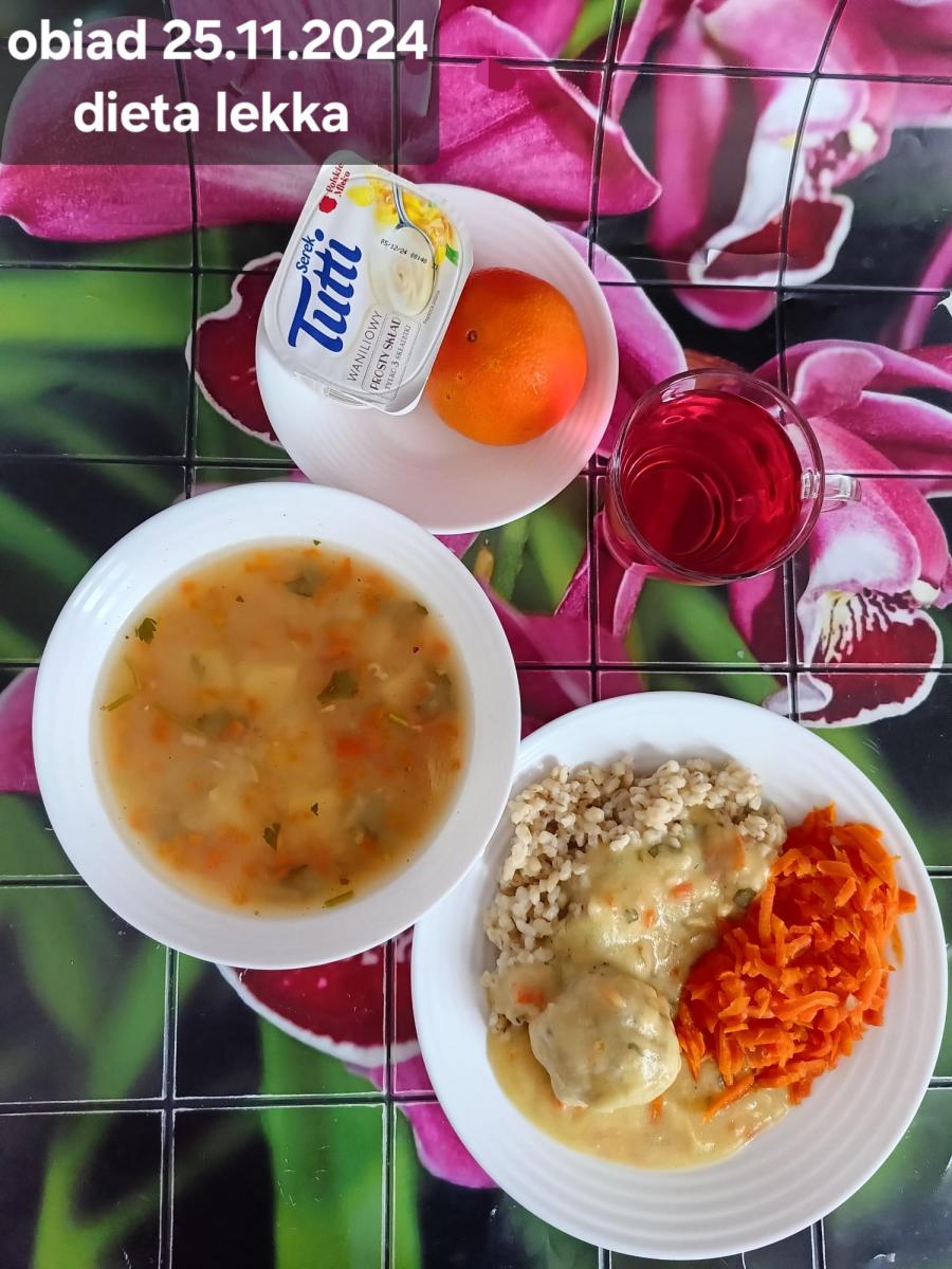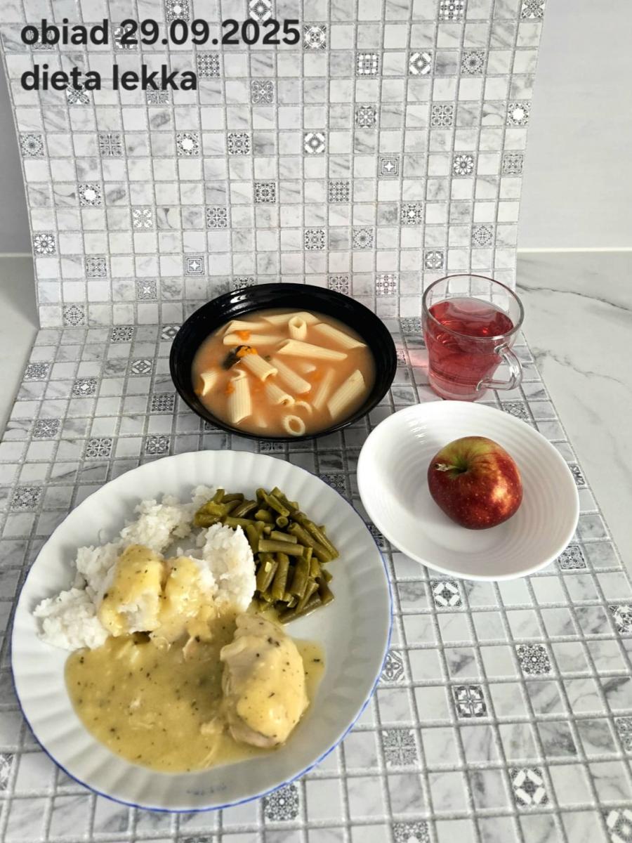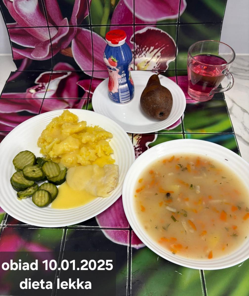 B,ZOL (cały), DZ: Zamiast kaszy- KOPYTKA(ziemniaki, skrobia ziemniaczana, mąka pszenna(1), jaja(3)) (250g), schab podany w formie gulaszu B: barszcz bez śmietany, sos na napoju sojowym (6) (zamiast śmietanki) L, L (W,T) zupa bez dodatku śmietany zamiast kaszy –KOPYTKA(1,3) (250g) Zamiast schabu indyk w wersji lekkostrawnej (filet z indyka- 100g, olej rzepakowy- 10g, papryka- 20g, marchew- pół średniej (22g), koncentrat pomidorowy- łyżeczka (12g), bulion warzywny(9)- 50ml ) L, L(W,T), Z, Z(PD): zamiast surówki brokuły (145g) z dodatkiem oleju rzepakowego (5g) C: Kompot bez dodatku cukru, Barszcz z dodatkiem mąki pełnoziarnistej (1) W: Zamiast surówki brokuły (145g) z dodatkiem oleju rzepakowego (5g) |