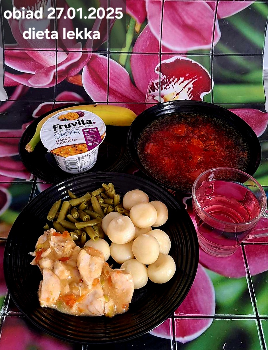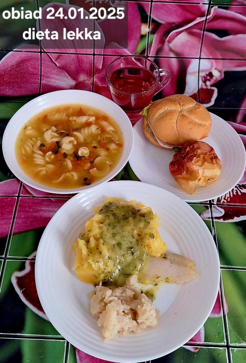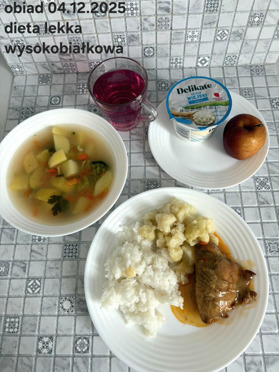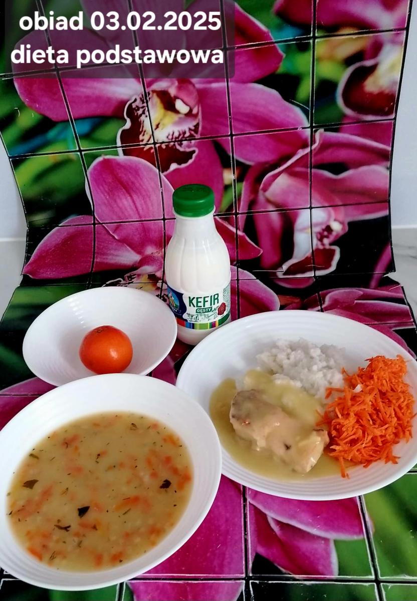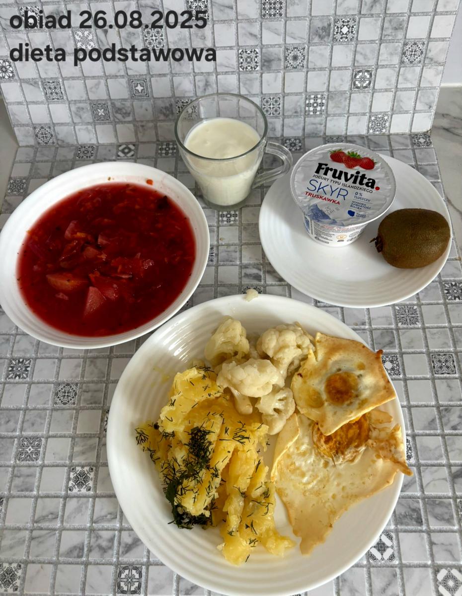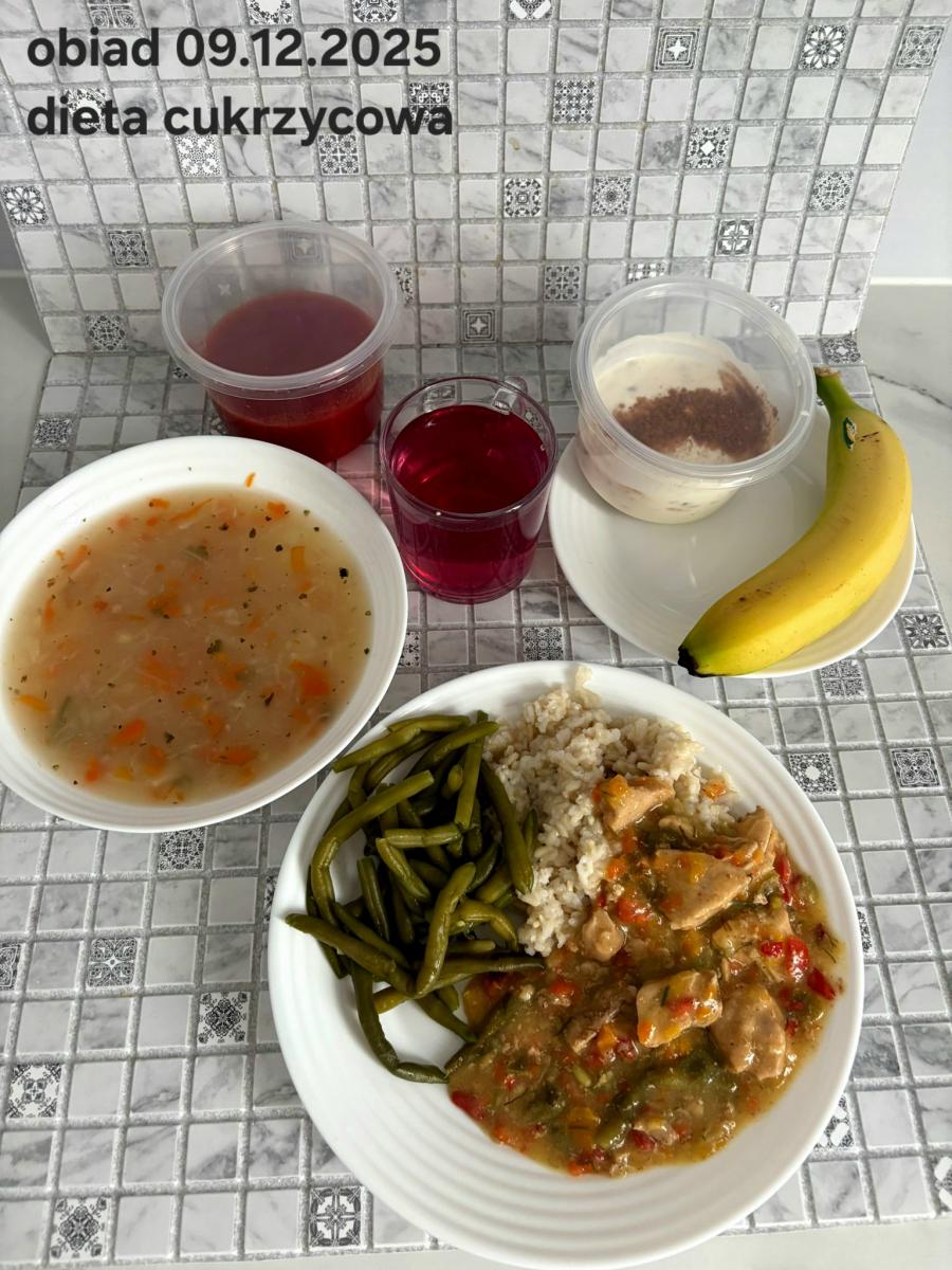B,ZOL (cały), DZ: Zamiast kaszy- KOPYTKA(ziemniaki, skrobia ziemniaczana, mąka pszenna(1), jaja(3)) (250g), schab podany w formie gulaszu B: barszcz bez śmietany, sos na napoju sojowym (6) (zamiast śmietanki) L, L (W,T) zupa bez dodatku śmietany zamiast kaszy –KOPYTKA(1,3) (250g) Zamiast schabu indyk w wersji lekkostrawnej (filet z indyka- 100g, olej rzepakowy- 10g, papryka- 20g, marchew- pół średniej (22g), koncentrat pomidorowy- łyżeczka (12g), bulion warzywny(9)- 50ml ) L, L(W,T), Z, Z(PD): zamiast surówki brokuły (145g) z dodatkiem oleju rzepakowego (5g) C: Kompot bez dodatku cukru, Barszcz z dodatkiem mąki pełnoziarnistej (1) W: Zamiast surówki brokuły (145g) z dodatkiem oleju rzepakowego (5g) |