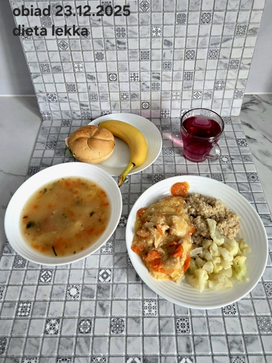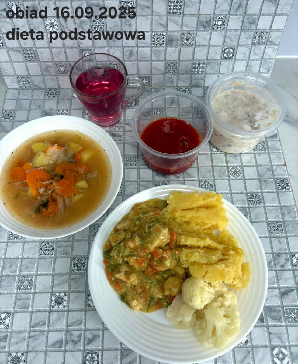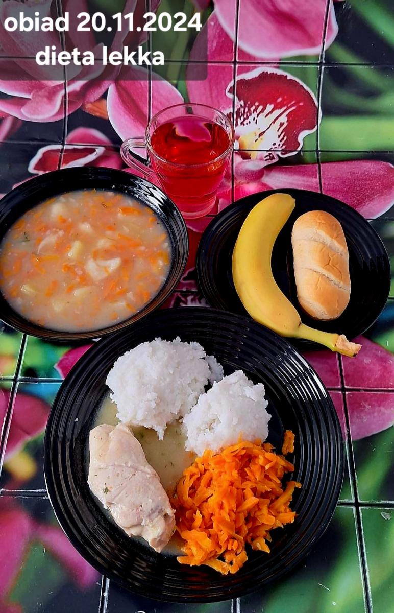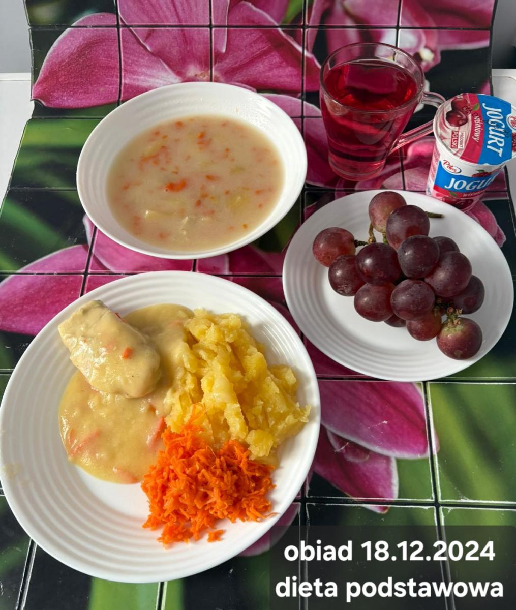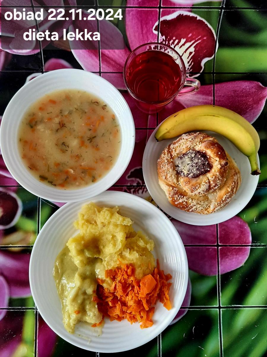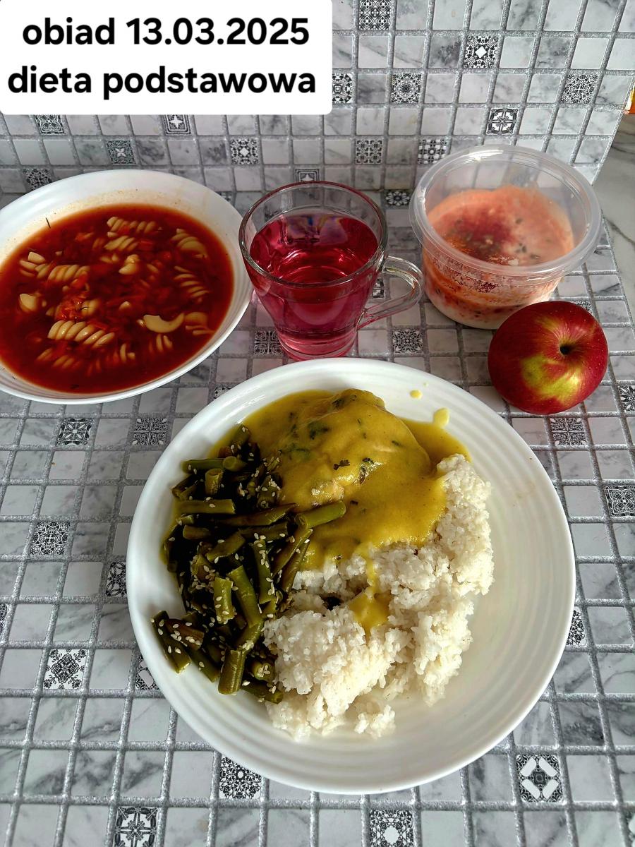 B,ZOL (cały), DZ: Zamiast kaszy- KOPYTKA(ziemniaki, skrobia ziemniaczana, mąka pszenna(1), jaja(3)) (250g), schab podany w formie gulaszu B: barszcz bez śmietany, sos na napoju sojowym (6) (zamiast śmietanki) L, L (W,T) zupa bez dodatku śmietany zamiast kaszy –KOPYTKA(1,3) (250g) Zamiast schabu indyk w wersji lekkostrawnej (filet z indyka- 100g, olej rzepakowy- 10g, papryka- 20g, marchew- pół średniej (22g), koncentrat pomidorowy- łyżeczka (12g), bulion warzywny(9)- 50ml ) L, L(W,T), Z, Z(PD): zamiast surówki brokuły (145g) z dodatkiem oleju rzepakowego (5g) C: Kompot bez dodatku cukru, Barszcz z dodatkiem mąki pełnoziarnistej (1) W: Zamiast surówki brokuły (145g) z dodatkiem oleju rzepakowego (5g) |