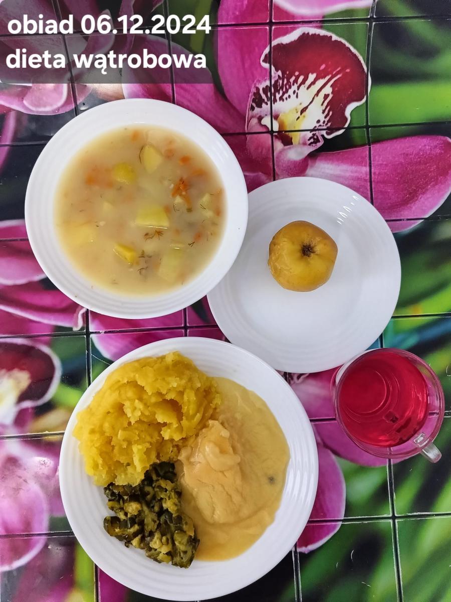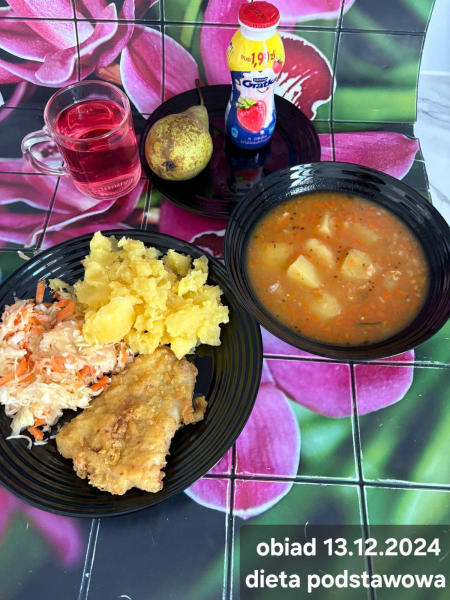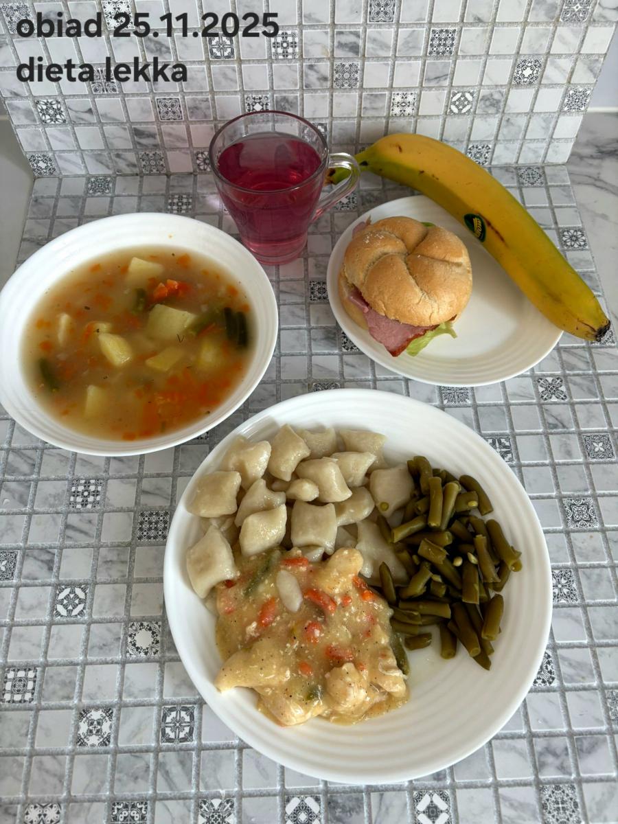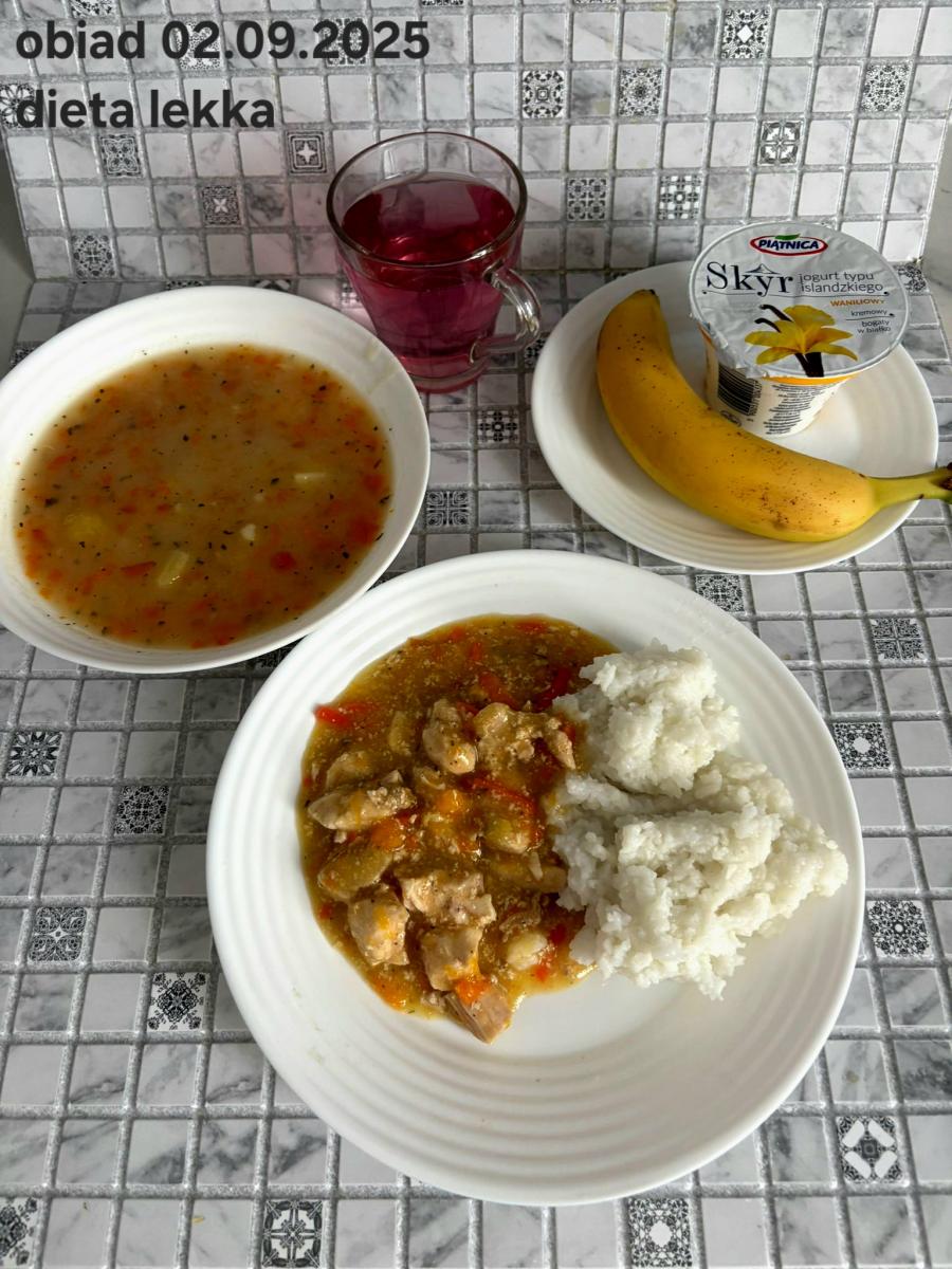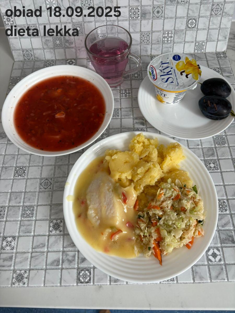 B,ZOL (cały), DZ: Zamiast kaszy- KOPYTKA(ziemniaki, skrobia ziemniaczana, mąka pszenna(1), jaja(3)) (250g), schab podany w formie gulaszu B: barszcz bez śmietany, sos na napoju sojowym (6) (zamiast śmietanki) L, L (W,T) zupa bez dodatku śmietany zamiast kaszy –KOPYTKA(1,3) (250g) Zamiast schabu indyk w wersji lekkostrawnej (filet z indyka- 100g, olej rzepakowy- 10g, papryka- 20g, marchew- pół średniej (22g), koncentrat pomidorowy- łyżeczka (12g), bulion warzywny(9)- 50ml ) L, L(W,T), Z, Z(PD): zamiast surówki brokuły (145g) z dodatkiem oleju rzepakowego (5g) C: Kompot bez dodatku cukru, Barszcz z dodatkiem mąki pełnoziarnistej (1) W: Zamiast surówki brokuły (145g) z dodatkiem oleju rzepakowego (5g) |