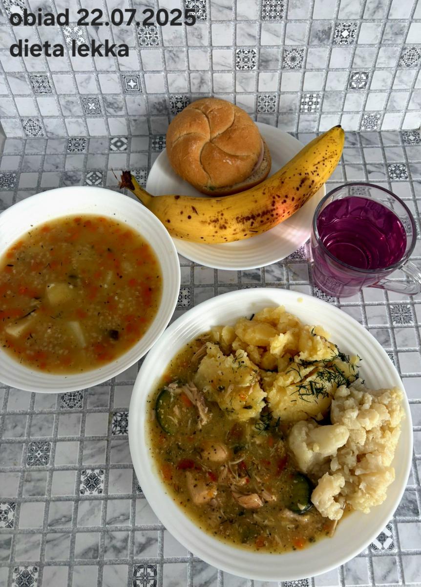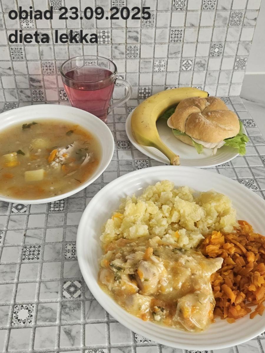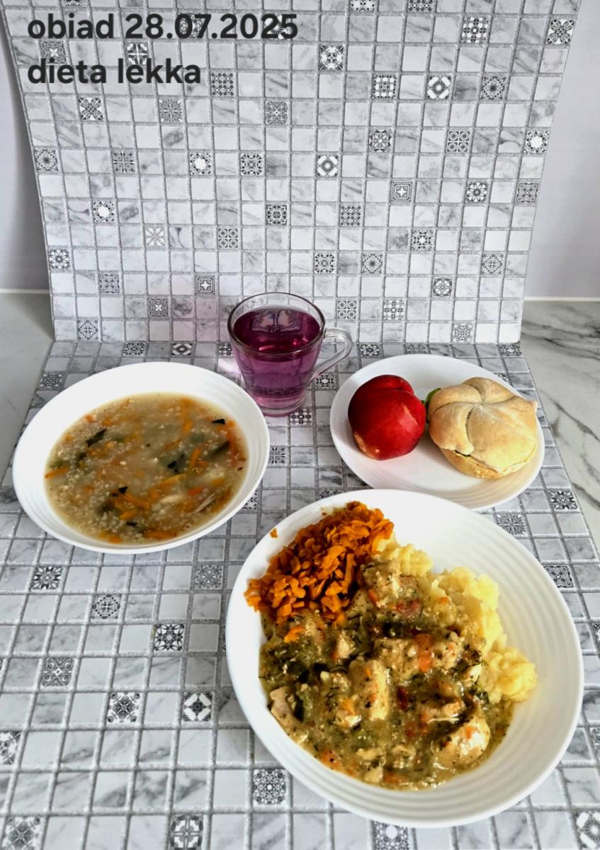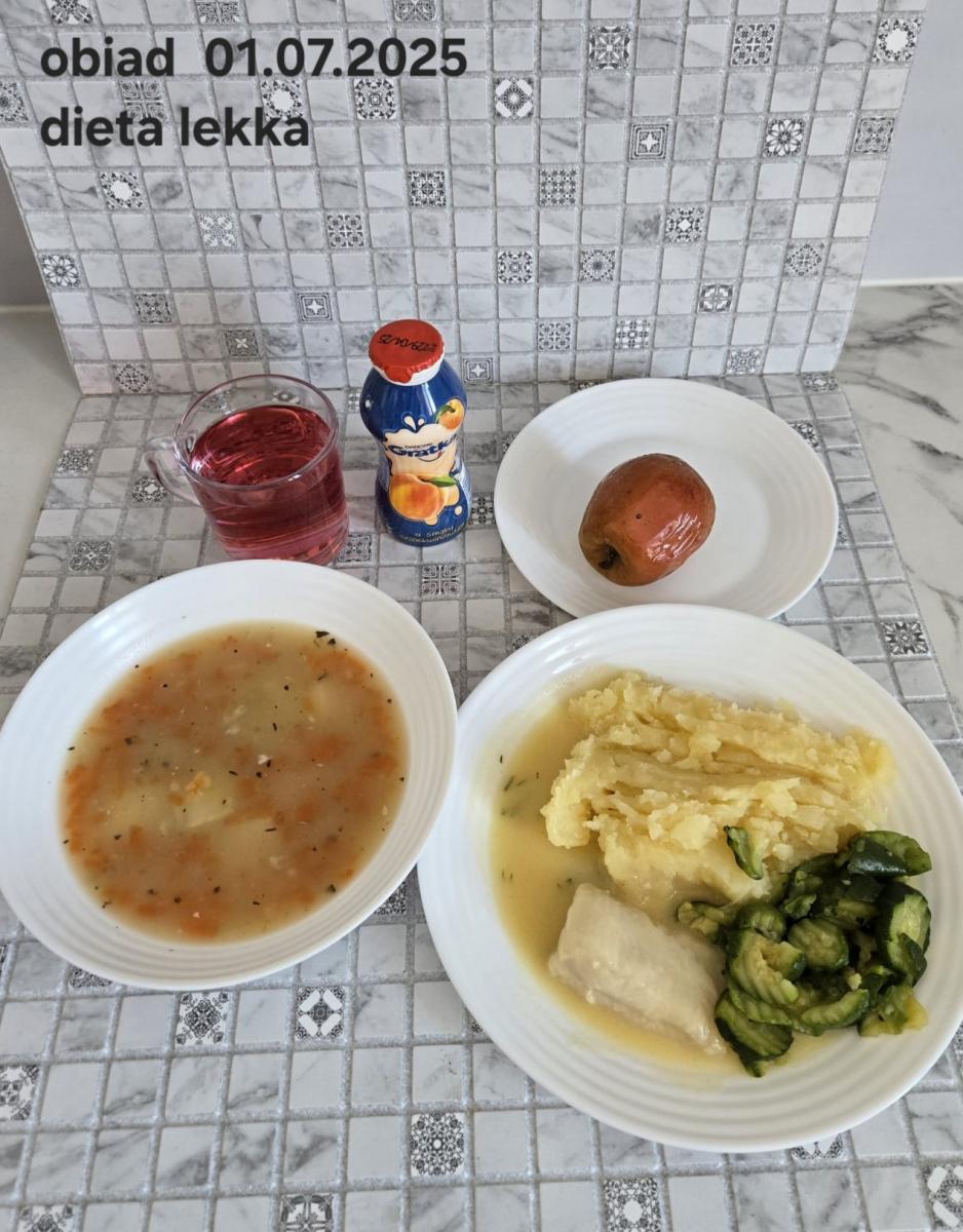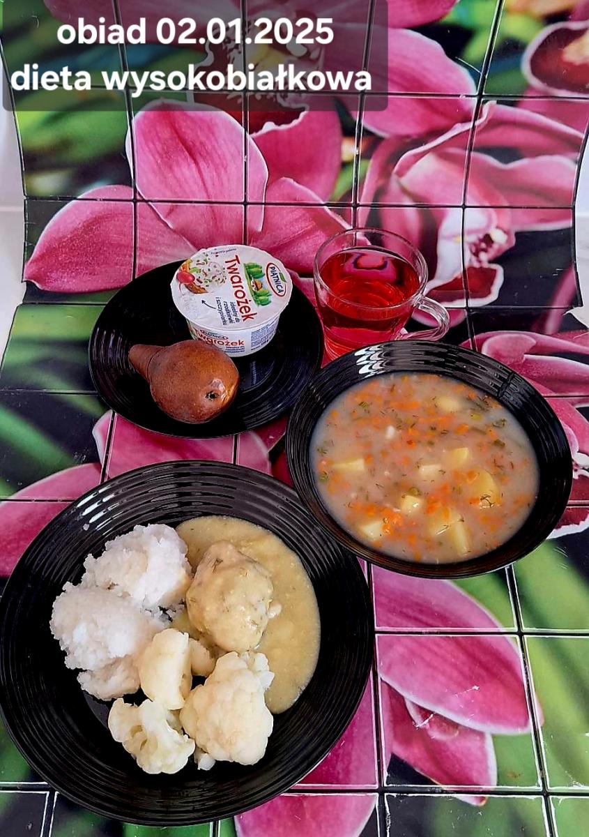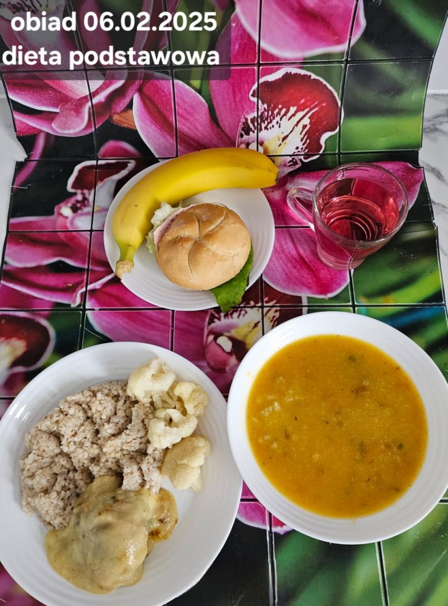 B,ZOL (cały), DZ: Zamiast kaszy- KOPYTKA(ziemniaki, skrobia ziemniaczana, mąka pszenna(1), jaja(3)) (250g), schab podany w formie gulaszu B: barszcz bez śmietany, sos na napoju sojowym (6) (zamiast śmietanki) L, L (W,T) zupa bez dodatku śmietany zamiast kaszy –KOPYTKA(1,3) (250g) Zamiast schabu indyk w wersji lekkostrawnej (filet z indyka- 100g, olej rzepakowy- 10g, papryka- 20g, marchew- pół średniej (22g), koncentrat pomidorowy- łyżeczka (12g), bulion warzywny(9)- 50ml ) L, L(W,T), Z, Z(PD): zamiast surówki brokuły (145g) z dodatkiem oleju rzepakowego (5g) C: Kompot bez dodatku cukru, Barszcz z dodatkiem mąki pełnoziarnistej (1) W: Zamiast surówki brokuły (145g) z dodatkiem oleju rzepakowego (5g) |