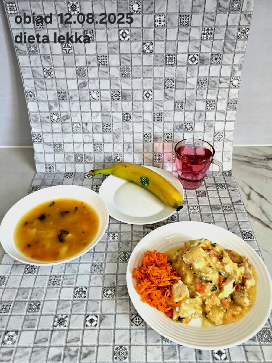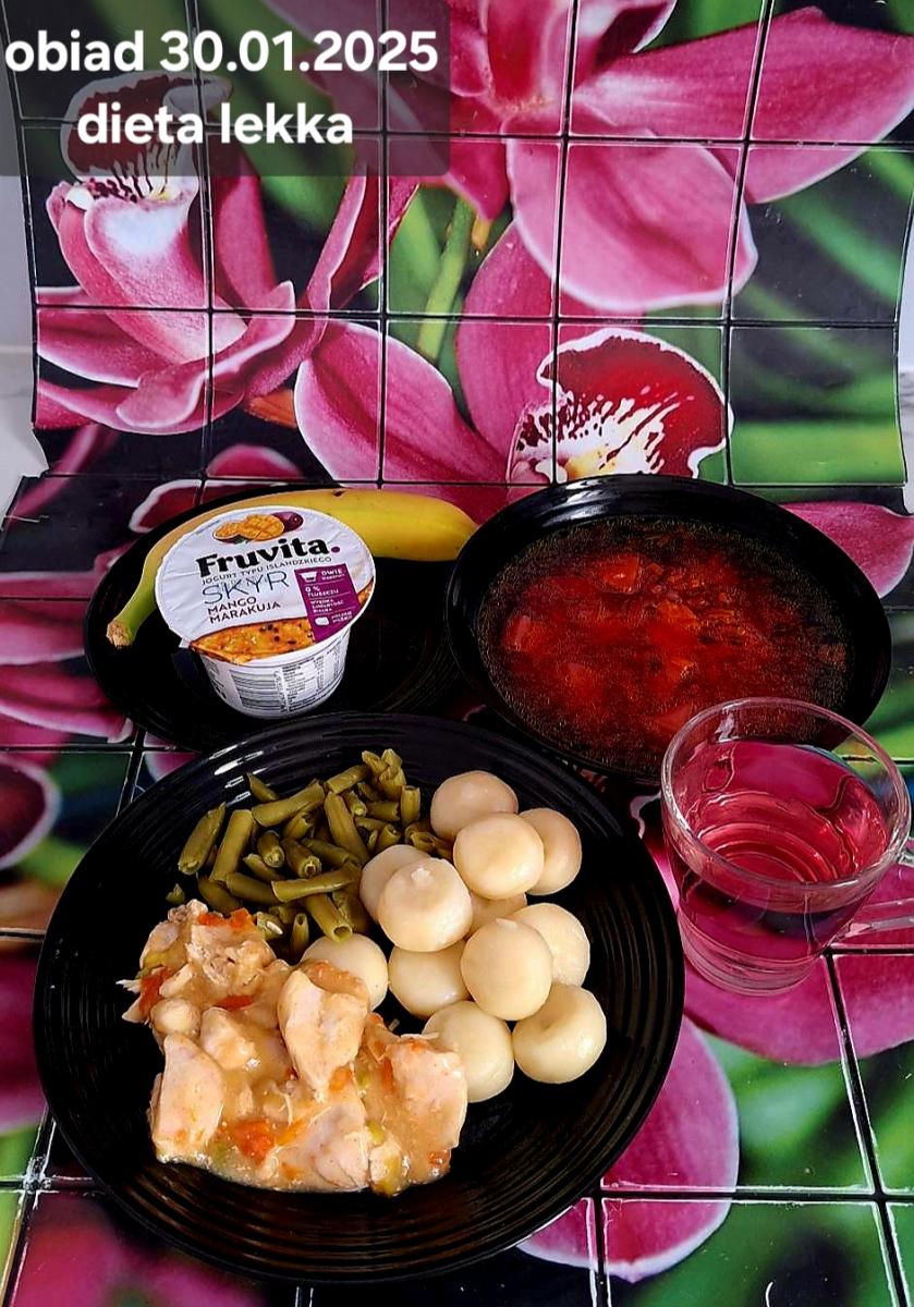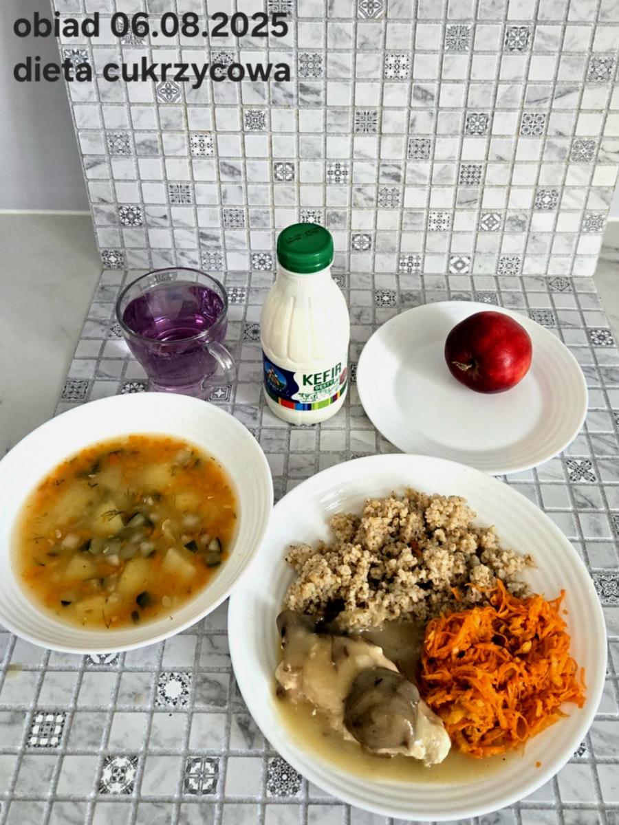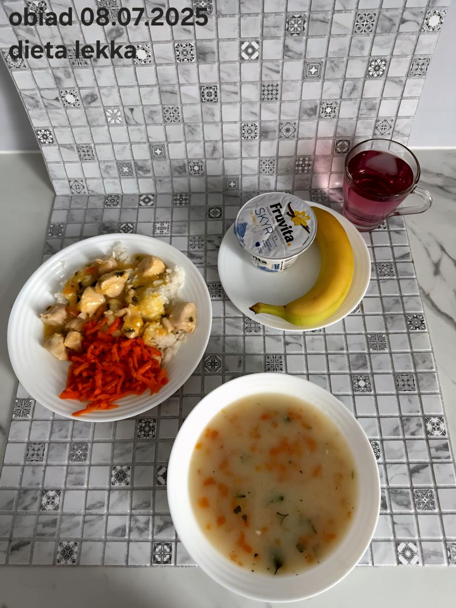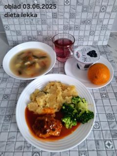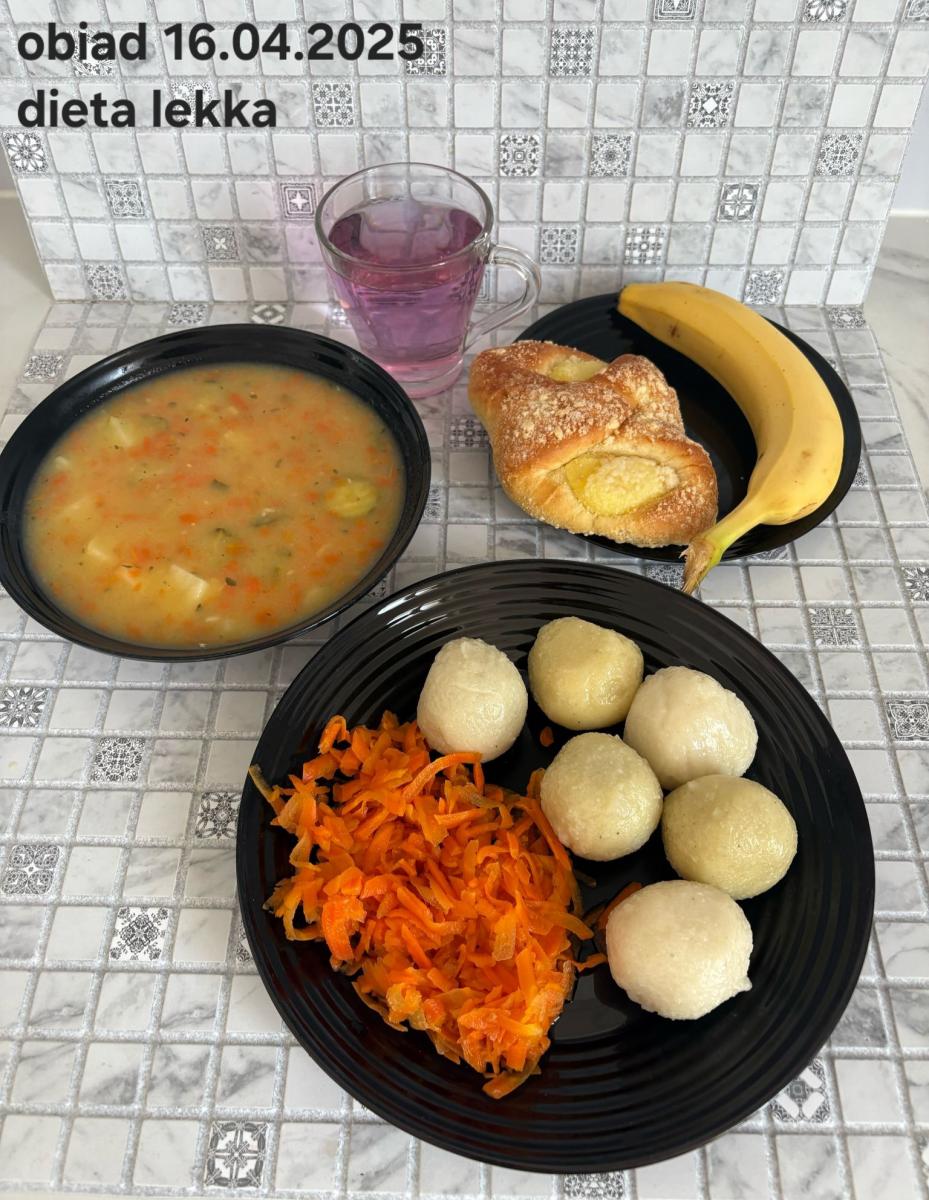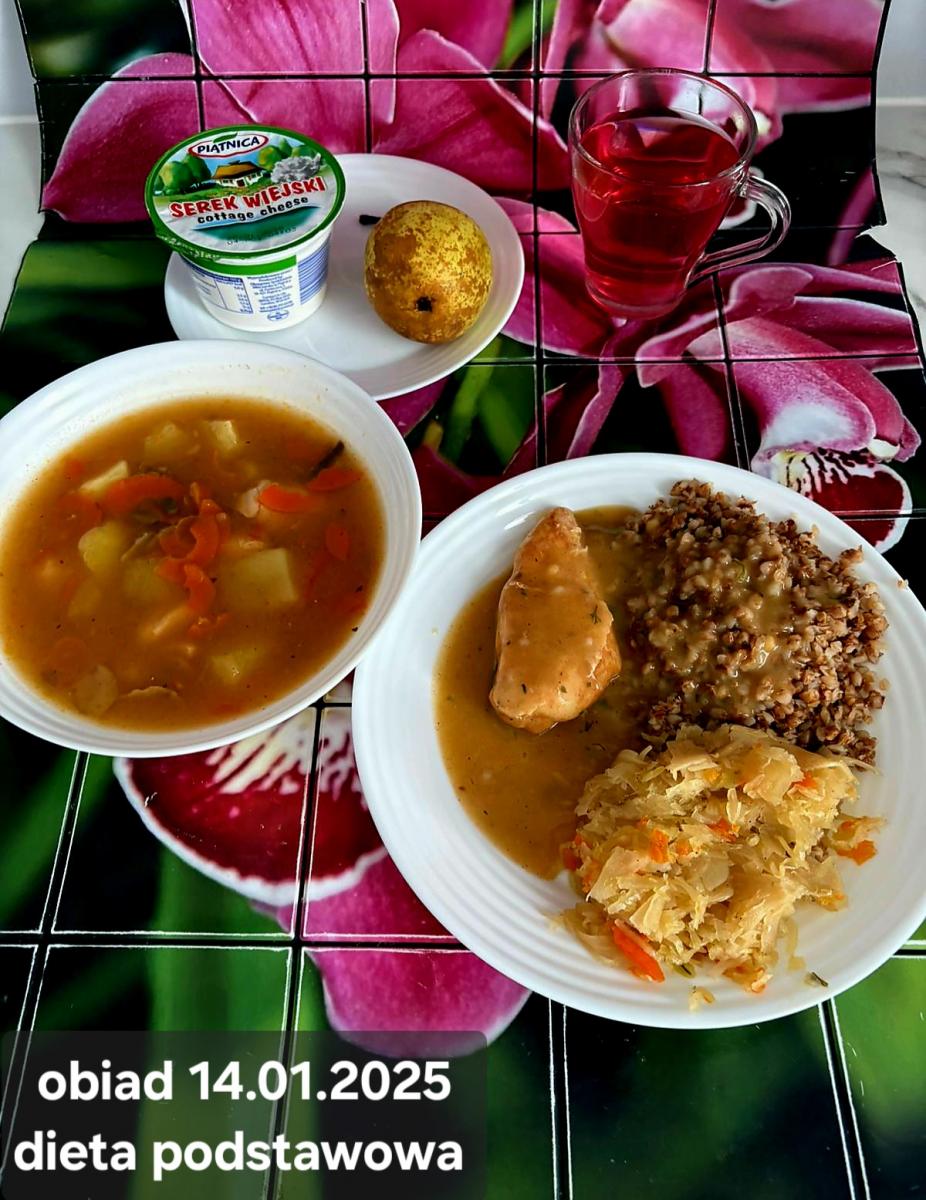 B,ZOL (cały), DZ: Zamiast kaszy- KOPYTKA(ziemniaki, skrobia ziemniaczana, mąka pszenna(1), jaja(3)) (250g), schab podany w formie gulaszu B: barszcz bez śmietany, sos na napoju sojowym (6) (zamiast śmietanki) L, L (W,T) zupa bez dodatku śmietany zamiast kaszy –KOPYTKA(1,3) (250g) Zamiast schabu indyk w wersji lekkostrawnej (filet z indyka- 100g, olej rzepakowy- 10g, papryka- 20g, marchew- pół średniej (22g), koncentrat pomidorowy- łyżeczka (12g), bulion warzywny(9)- 50ml ) L, L(W,T), Z, Z(PD): zamiast surówki brokuły (145g) z dodatkiem oleju rzepakowego (5g) C: Kompot bez dodatku cukru, Barszcz z dodatkiem mąki pełnoziarnistej (1) W: Zamiast surówki brokuły (145g) z dodatkiem oleju rzepakowego (5g) |