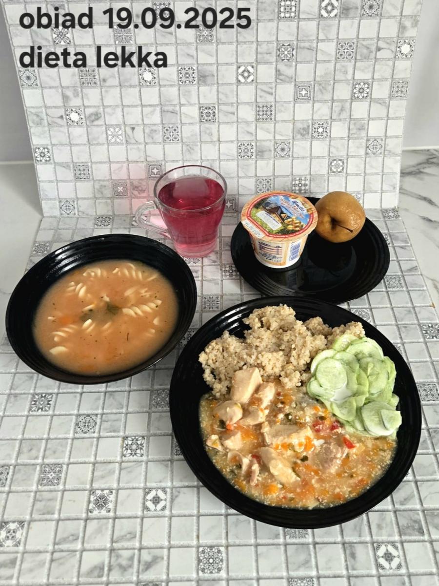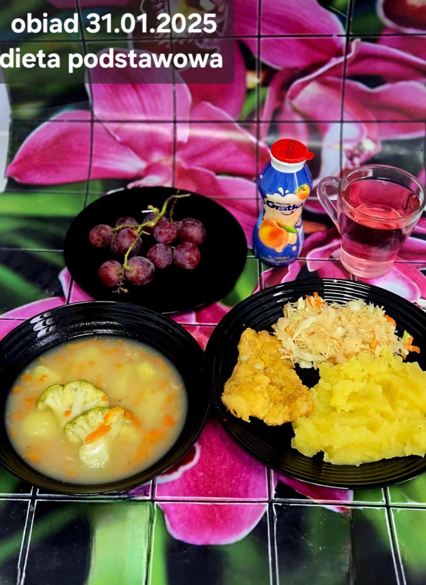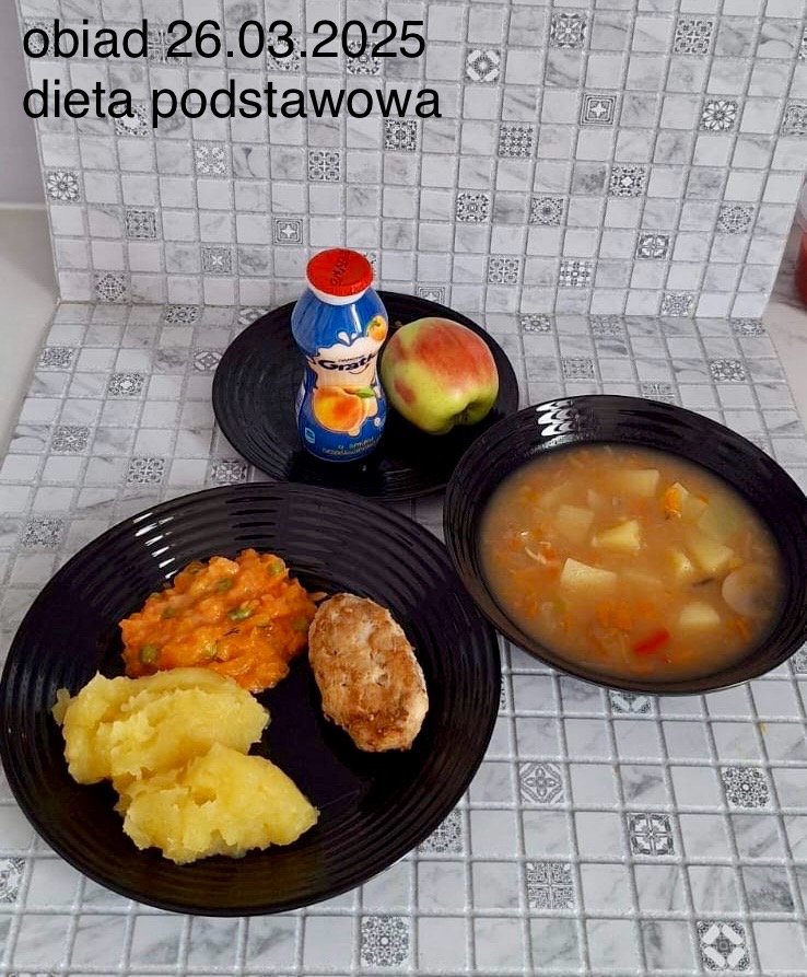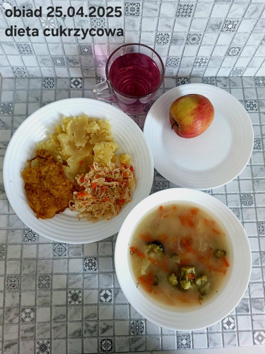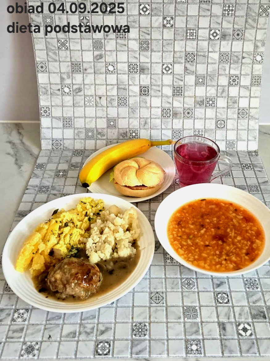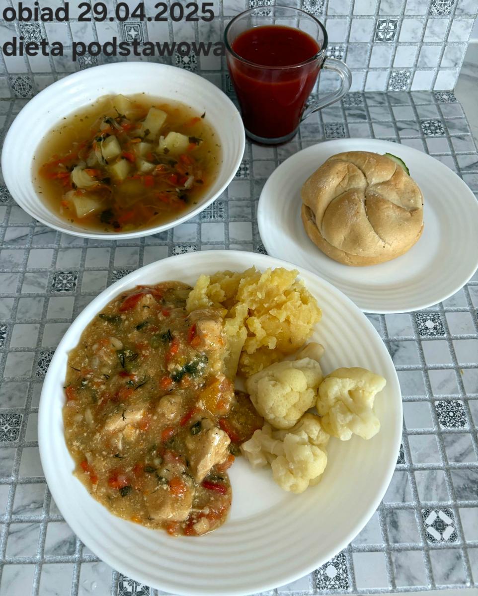 B,ZOL (cały), DZ: Zamiast kaszy- KOPYTKA(ziemniaki, skrobia ziemniaczana, mąka pszenna(1), jaja(3)) (250g), schab podany w formie gulaszu B: barszcz bez śmietany, sos na napoju sojowym (6) (zamiast śmietanki) L, L (W,T) zupa bez dodatku śmietany zamiast kaszy –KOPYTKA(1,3) (250g) Zamiast schabu indyk w wersji lekkostrawnej (filet z indyka- 100g, olej rzepakowy- 10g, papryka- 20g, marchew- pół średniej (22g), koncentrat pomidorowy- łyżeczka (12g), bulion warzywny(9)- 50ml ) L, L(W,T), Z, Z(PD): zamiast surówki brokuły (145g) z dodatkiem oleju rzepakowego (5g) C: Kompot bez dodatku cukru, Barszcz z dodatkiem mąki pełnoziarnistej (1) W: Zamiast surówki brokuły (145g) z dodatkiem oleju rzepakowego (5g) |