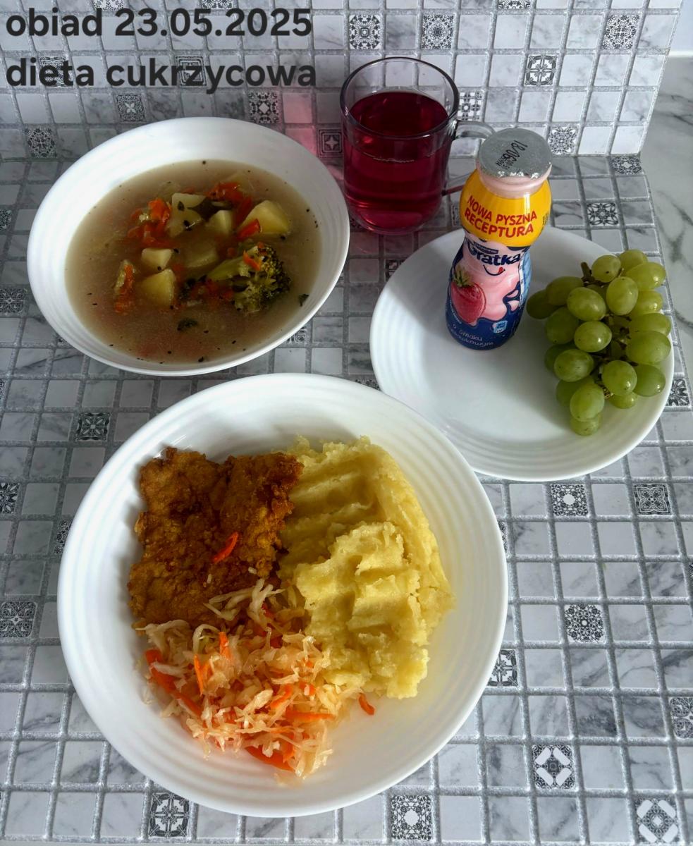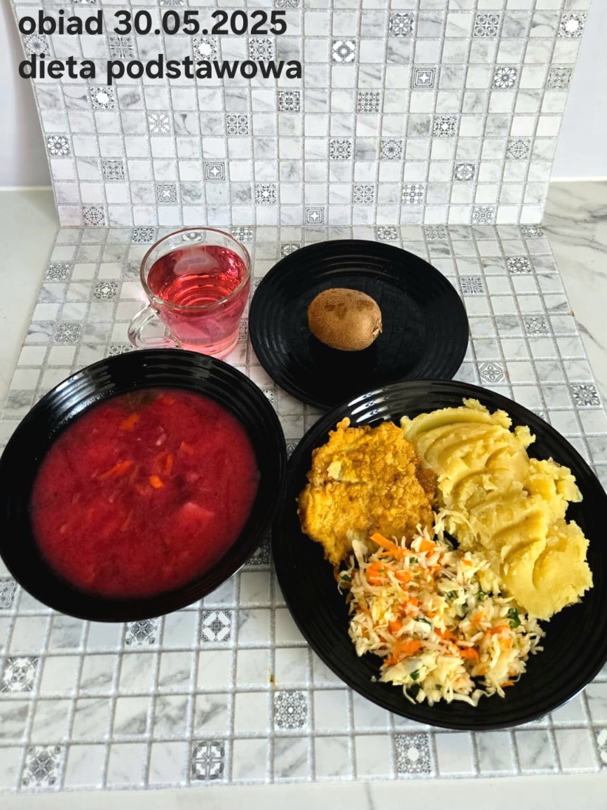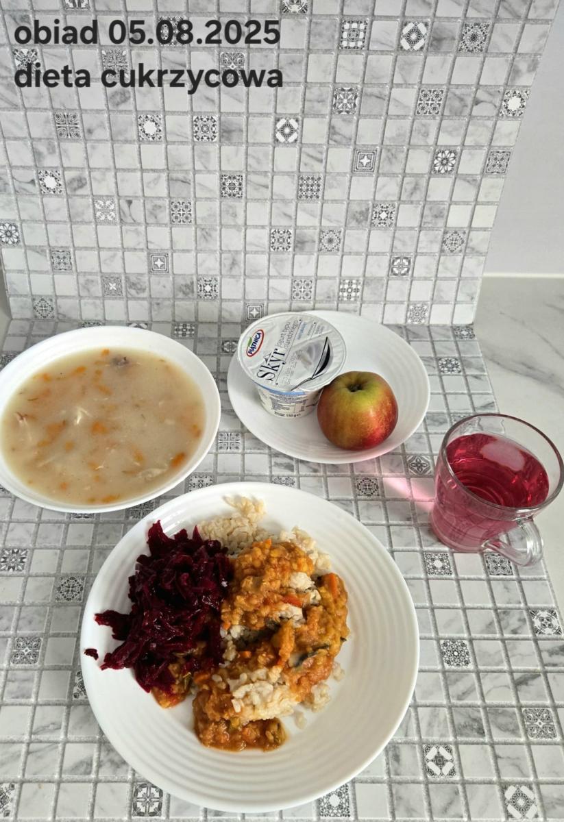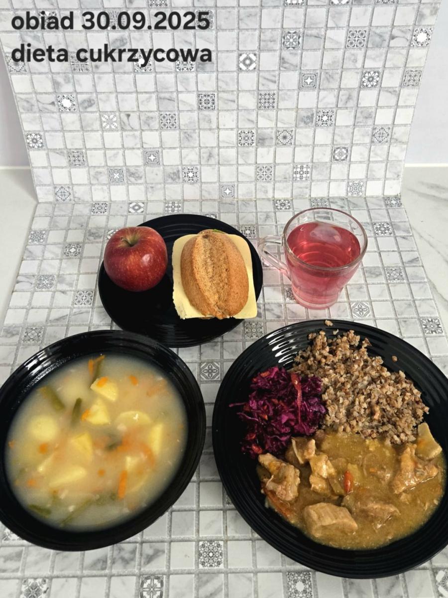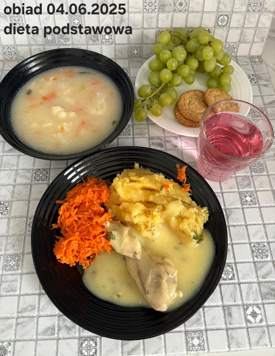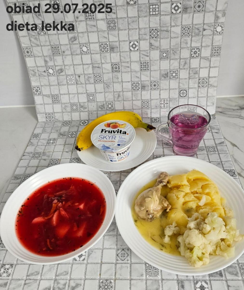 B,ZOL (cały), DZ: Zamiast kaszy- KOPYTKA(ziemniaki, skrobia ziemniaczana, mąka pszenna(1), jaja(3)) (250g), schab podany w formie gulaszu B: barszcz bez śmietany, sos na napoju sojowym (6) (zamiast śmietanki) L, L (W,T) zupa bez dodatku śmietany zamiast kaszy –KOPYTKA(1,3) (250g) Zamiast schabu indyk w wersji lekkostrawnej (filet z indyka- 100g, olej rzepakowy- 10g, papryka- 20g, marchew- pół średniej (22g), koncentrat pomidorowy- łyżeczka (12g), bulion warzywny(9)- 50ml ) L, L(W,T), Z, Z(PD): zamiast surówki brokuły (145g) z dodatkiem oleju rzepakowego (5g) C: Kompot bez dodatku cukru, Barszcz z dodatkiem mąki pełnoziarnistej (1) W: Zamiast surówki brokuły (145g) z dodatkiem oleju rzepakowego (5g) |